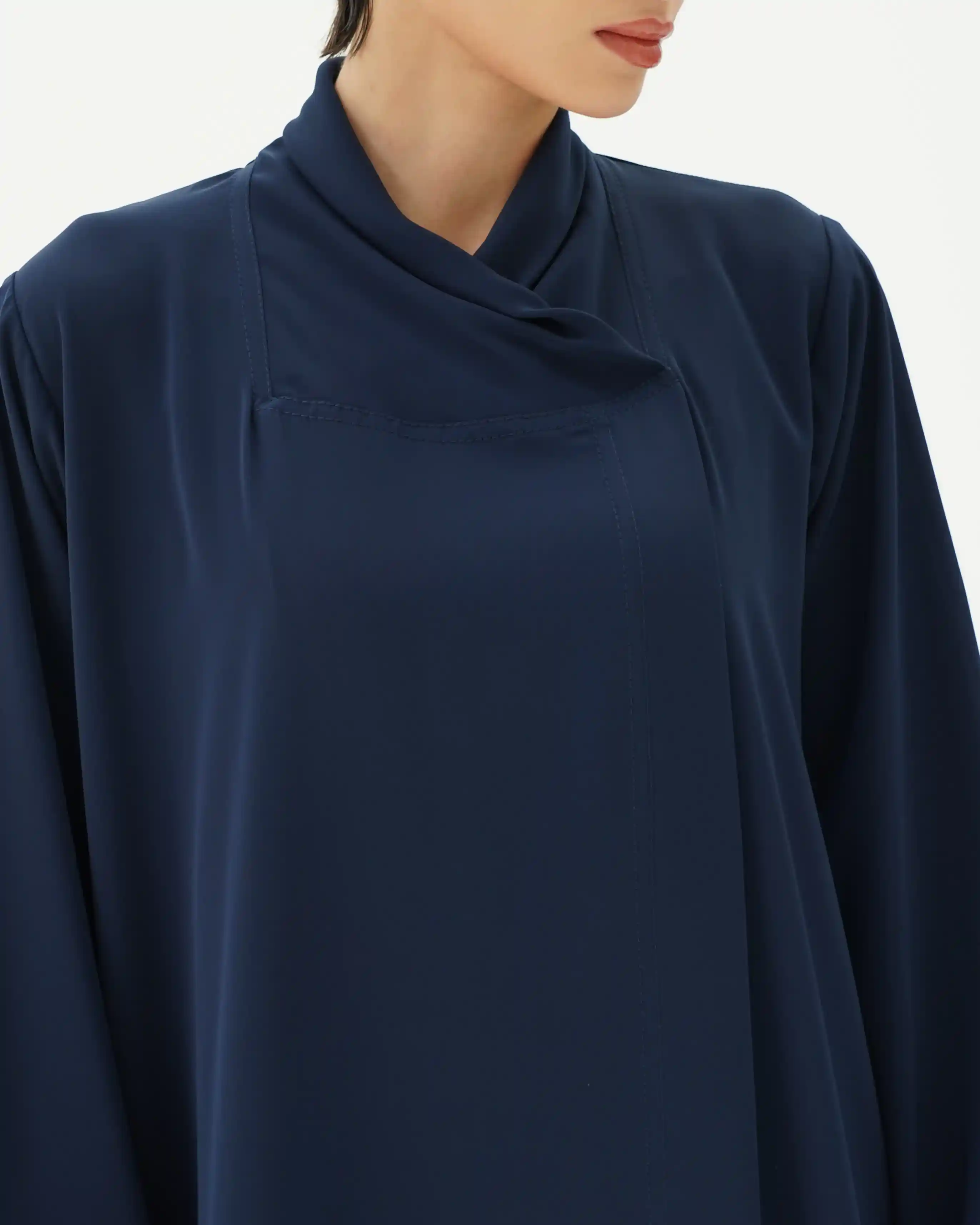 • ياقة هاي نيك متقاطعة تنسدل بسلاسة حول الرقبة بتصميم معماري أنيق.