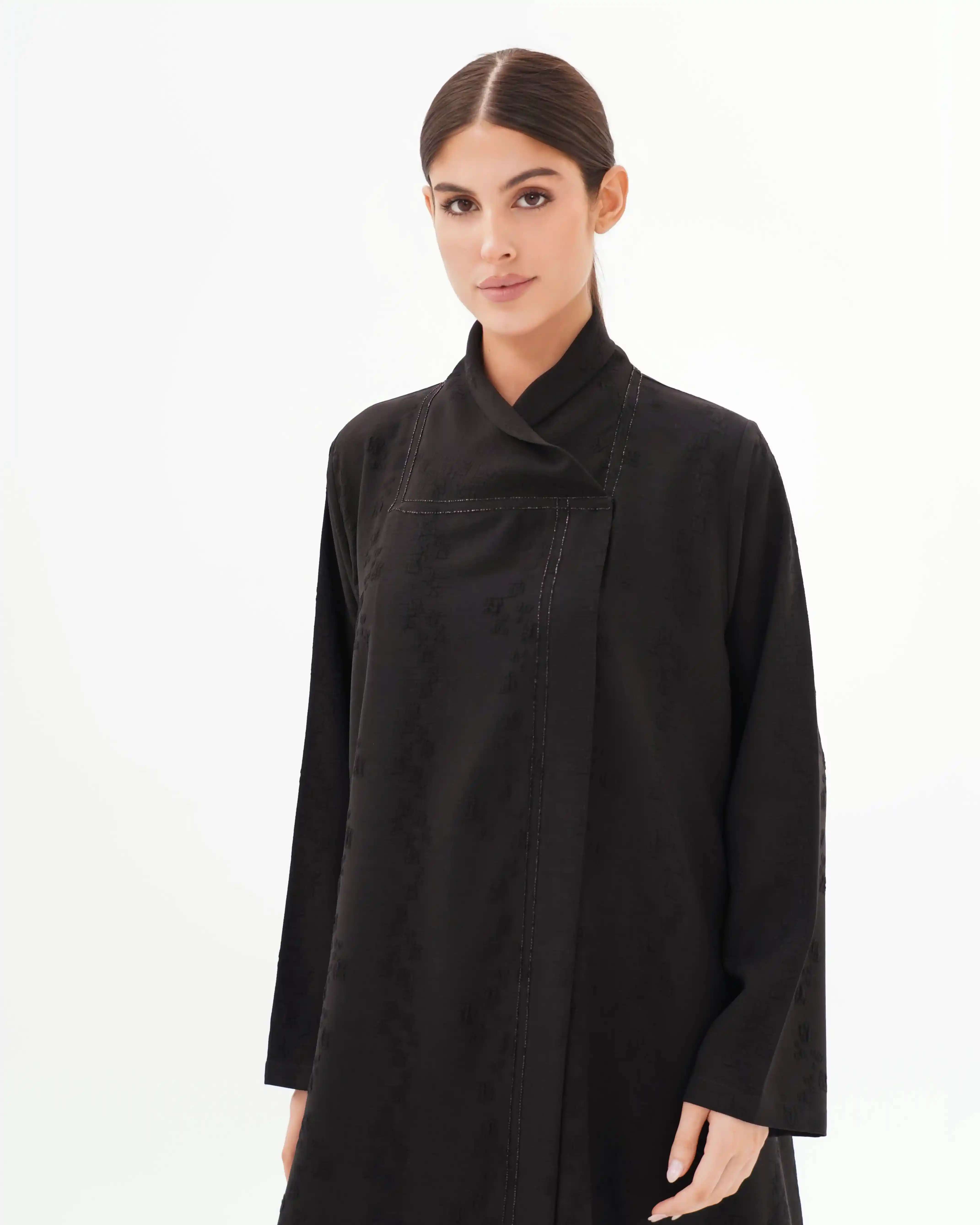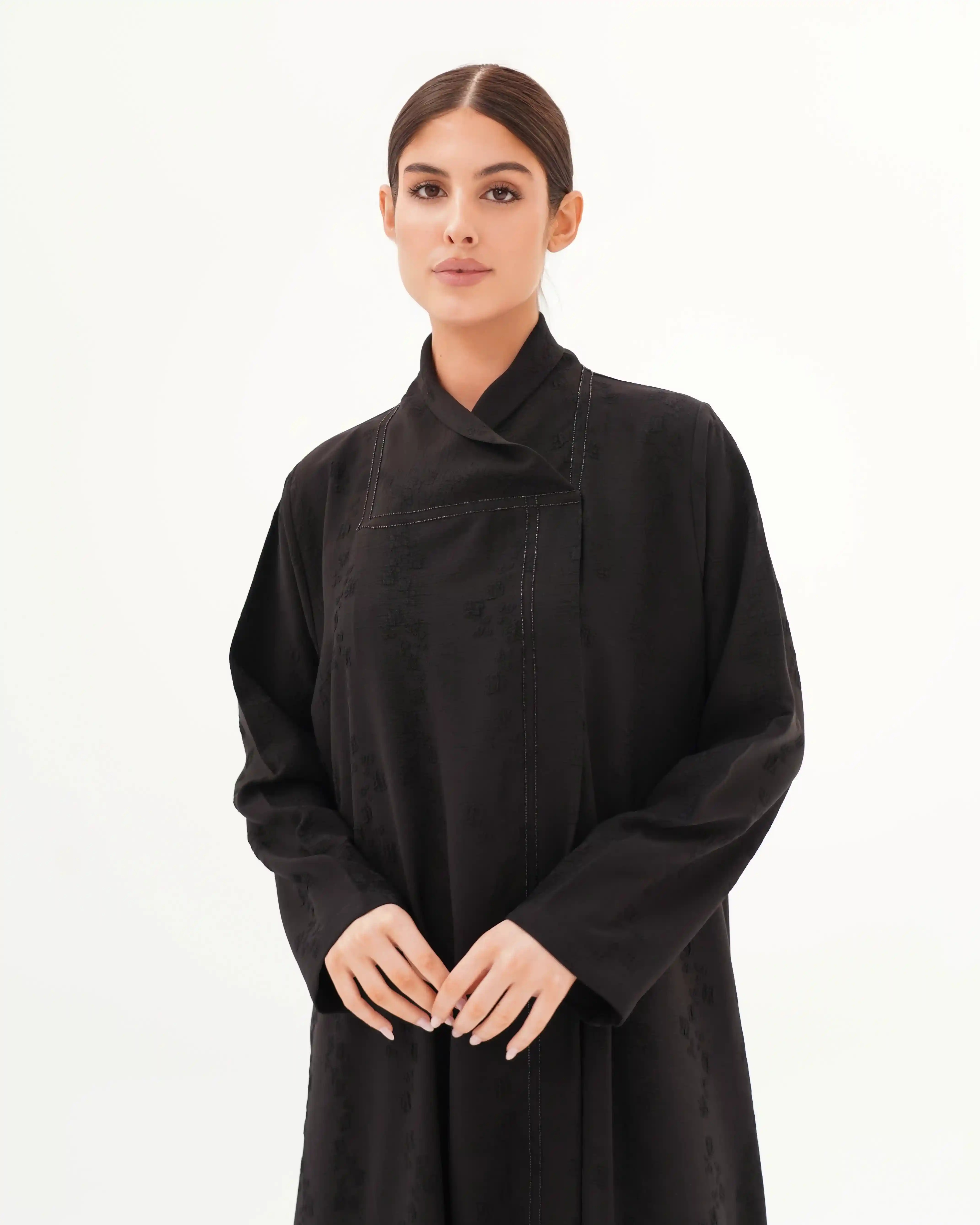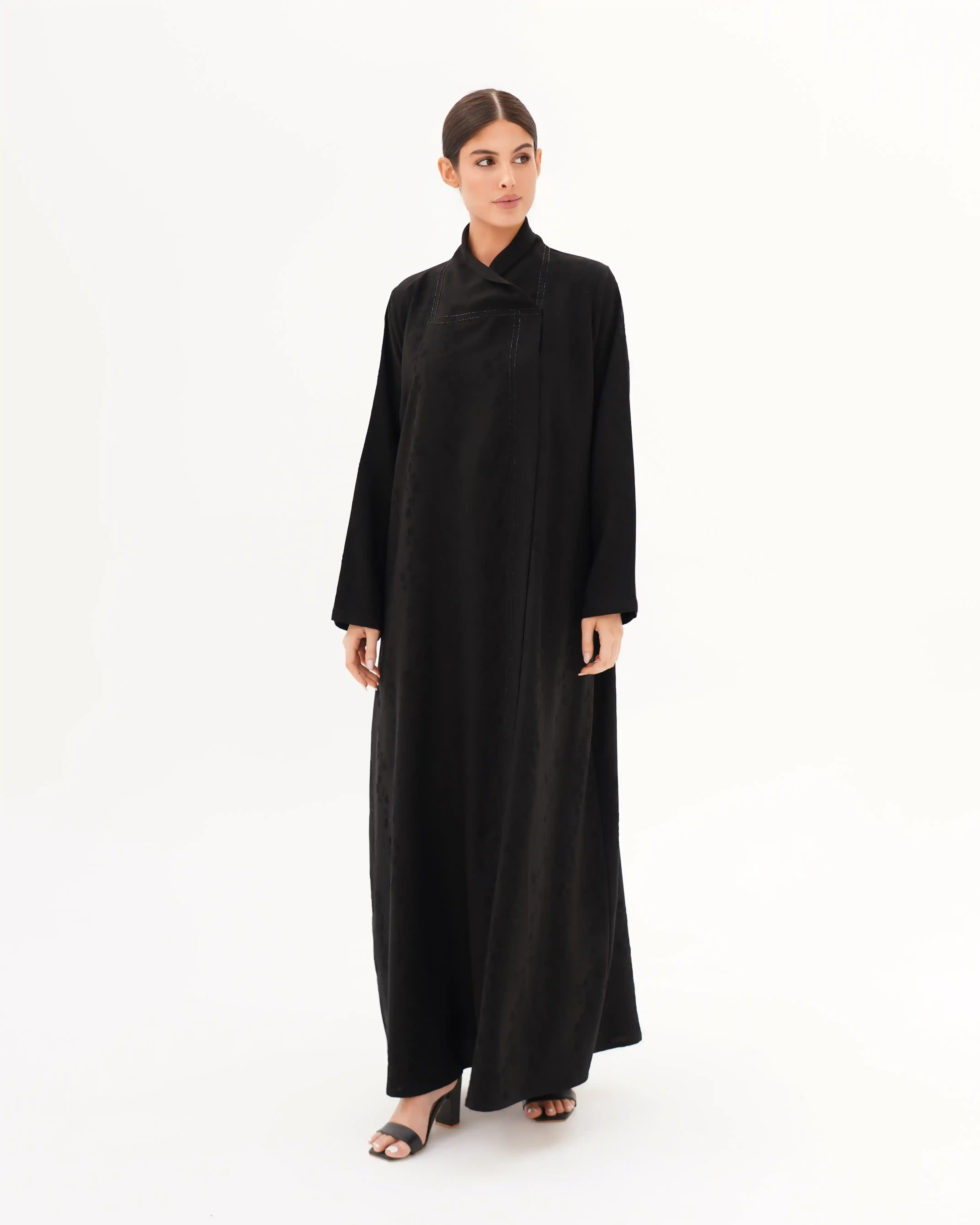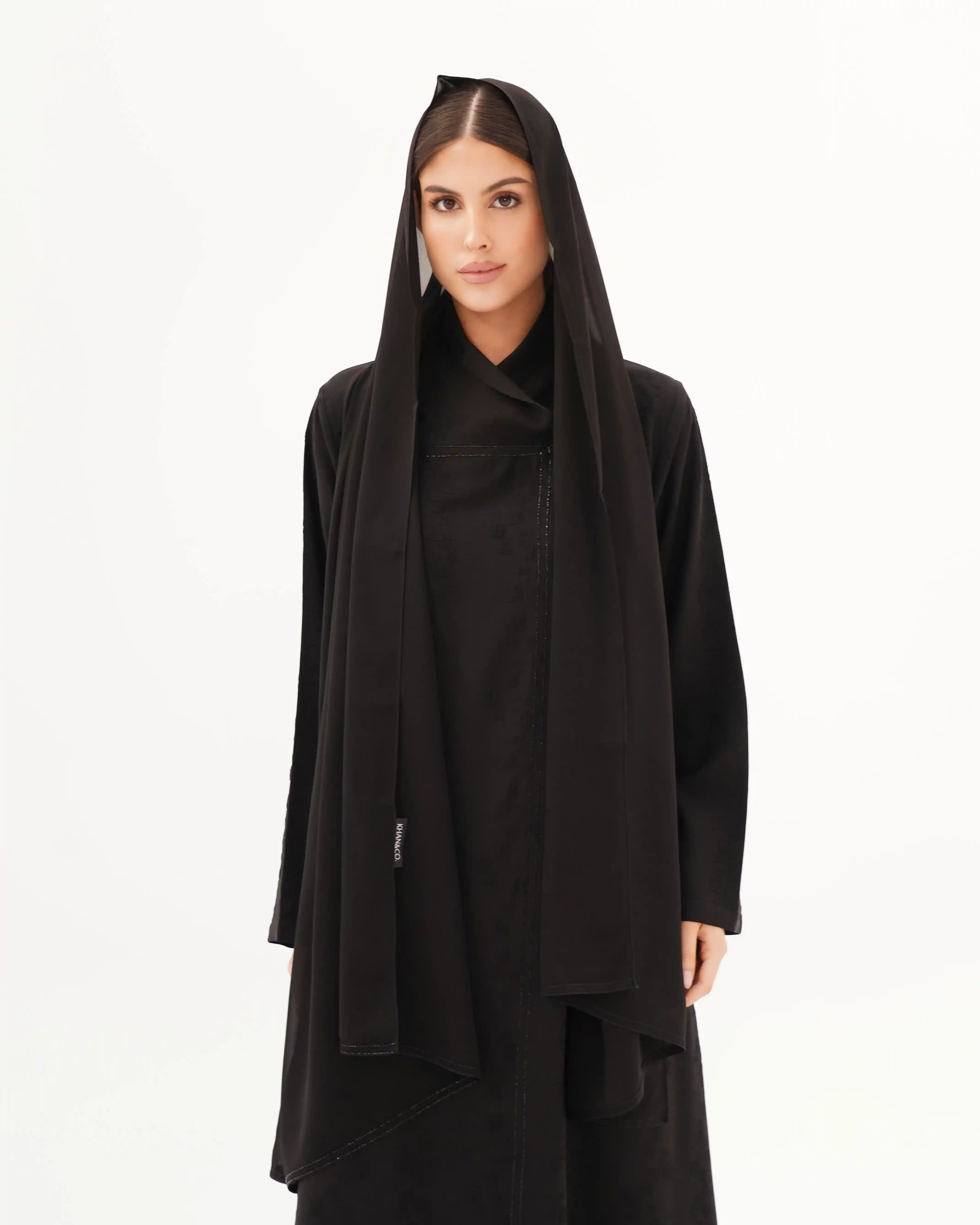 عباية بقصّة مستقيمة وانسيابية ناعمة، مصنوعة من قماش سوفت فوكورو الأسود بتدلي أنيق. تتميّز بياقة هاي نيك متقاطعة تنسدل بخفة حول الرقبة، مع خطوط دقيقة من الخرز الأسود اللامع تمتد من خلف شريط الرقبة حتى ذيل العباية. الأكمام بتصميم نظيف دون خرز، والطرحة من نفس القماش مع خرز رفيع على الأطراف، بتناغم هادئ يعكس أسلوب .KHAN&CO المعماري المختزل.