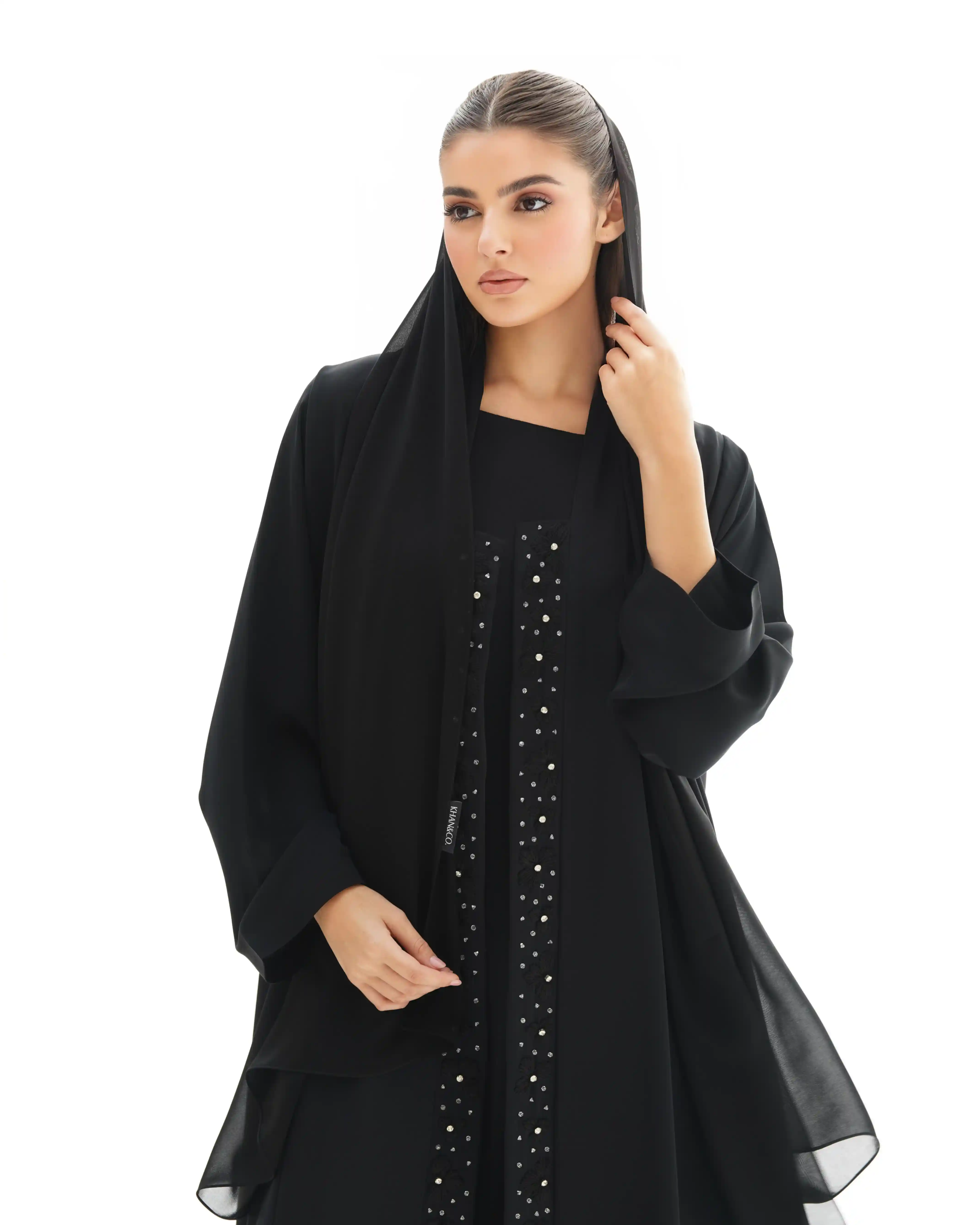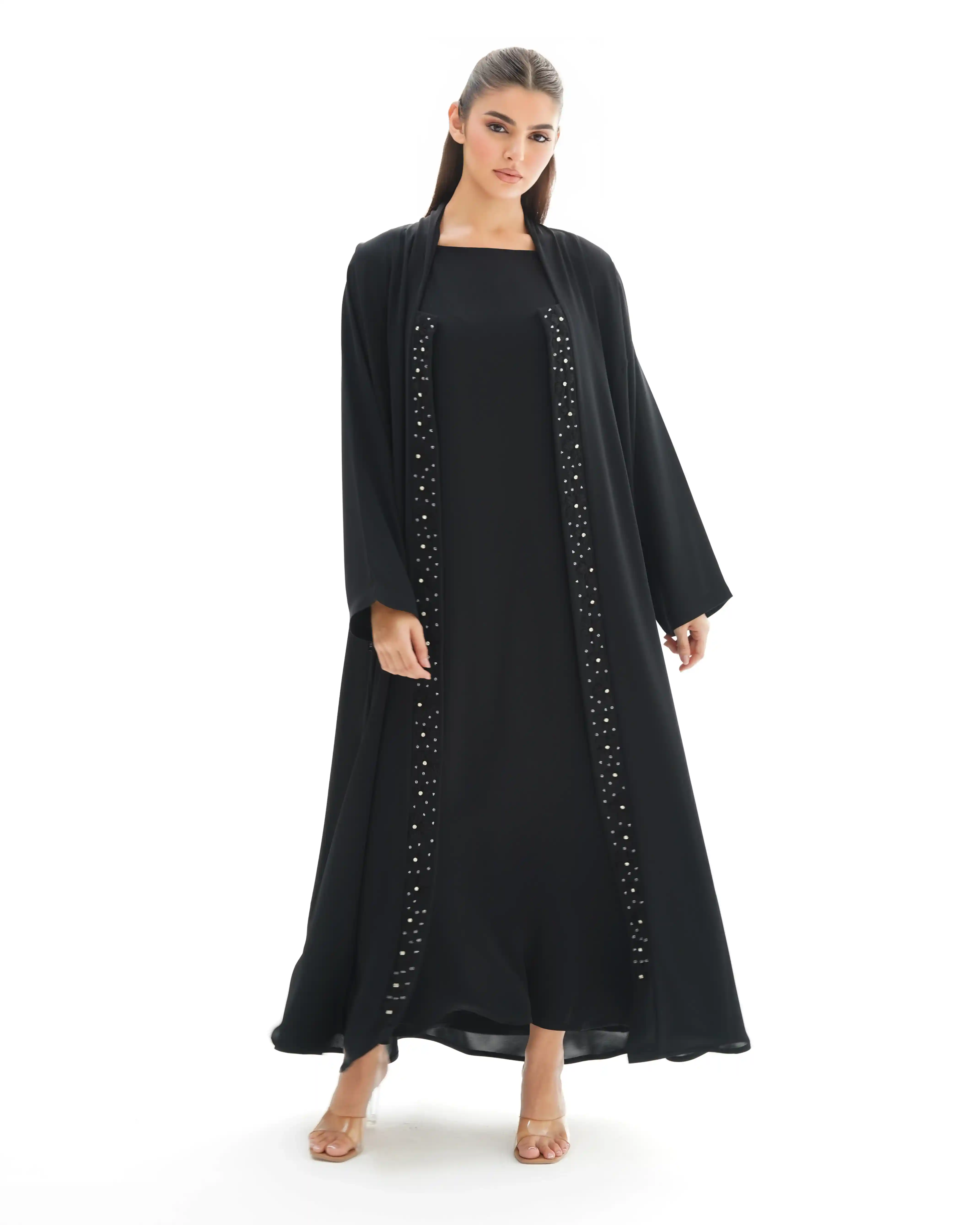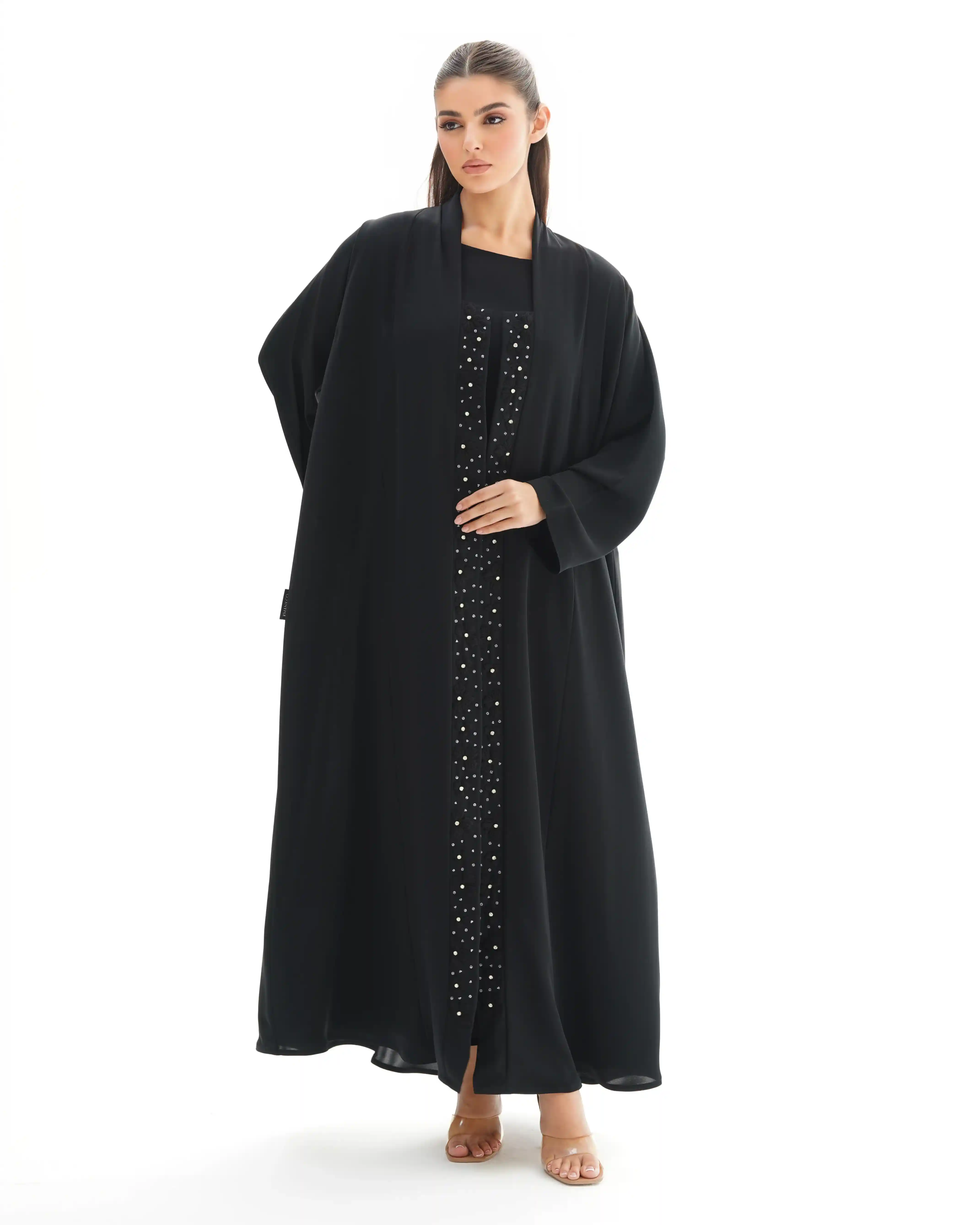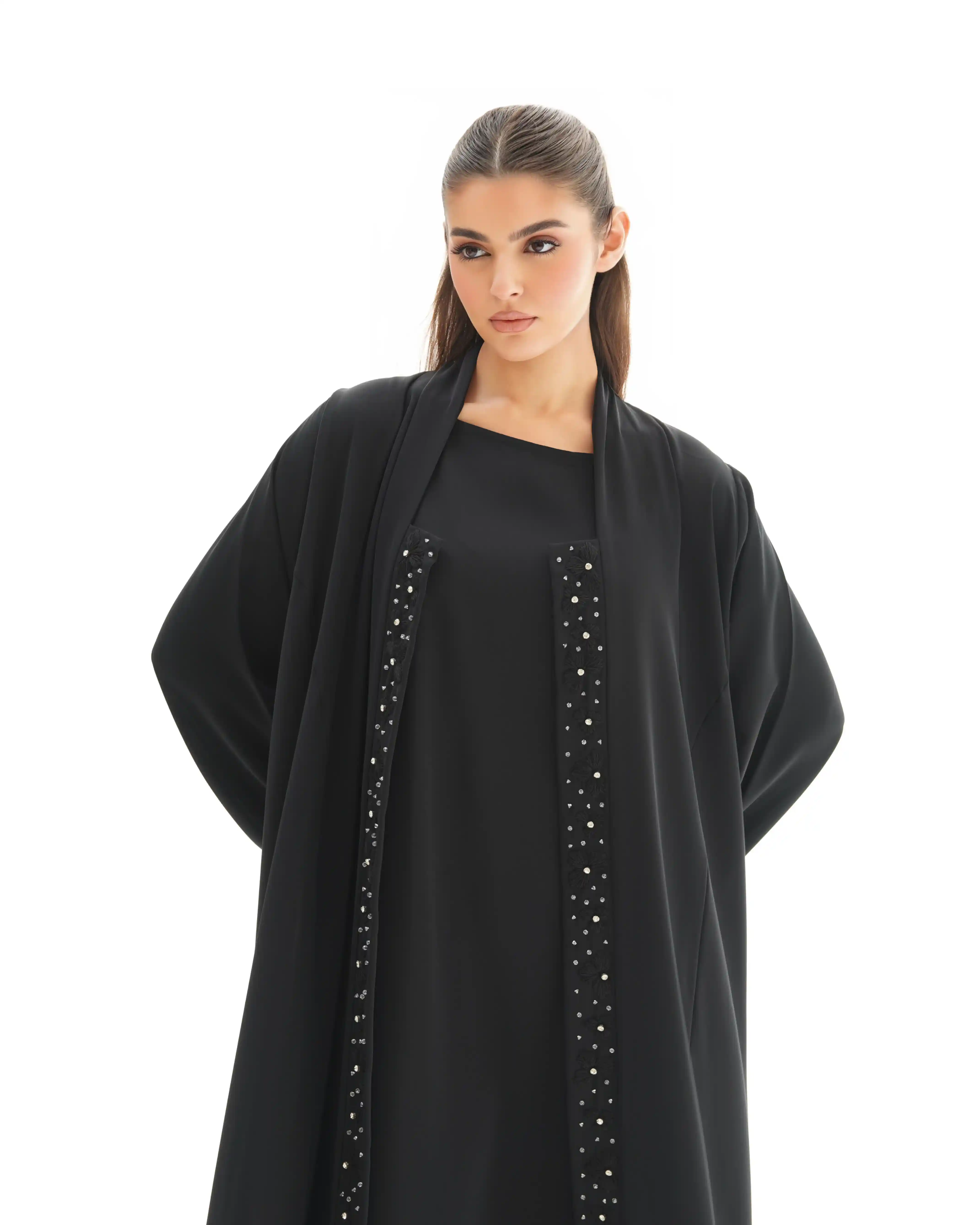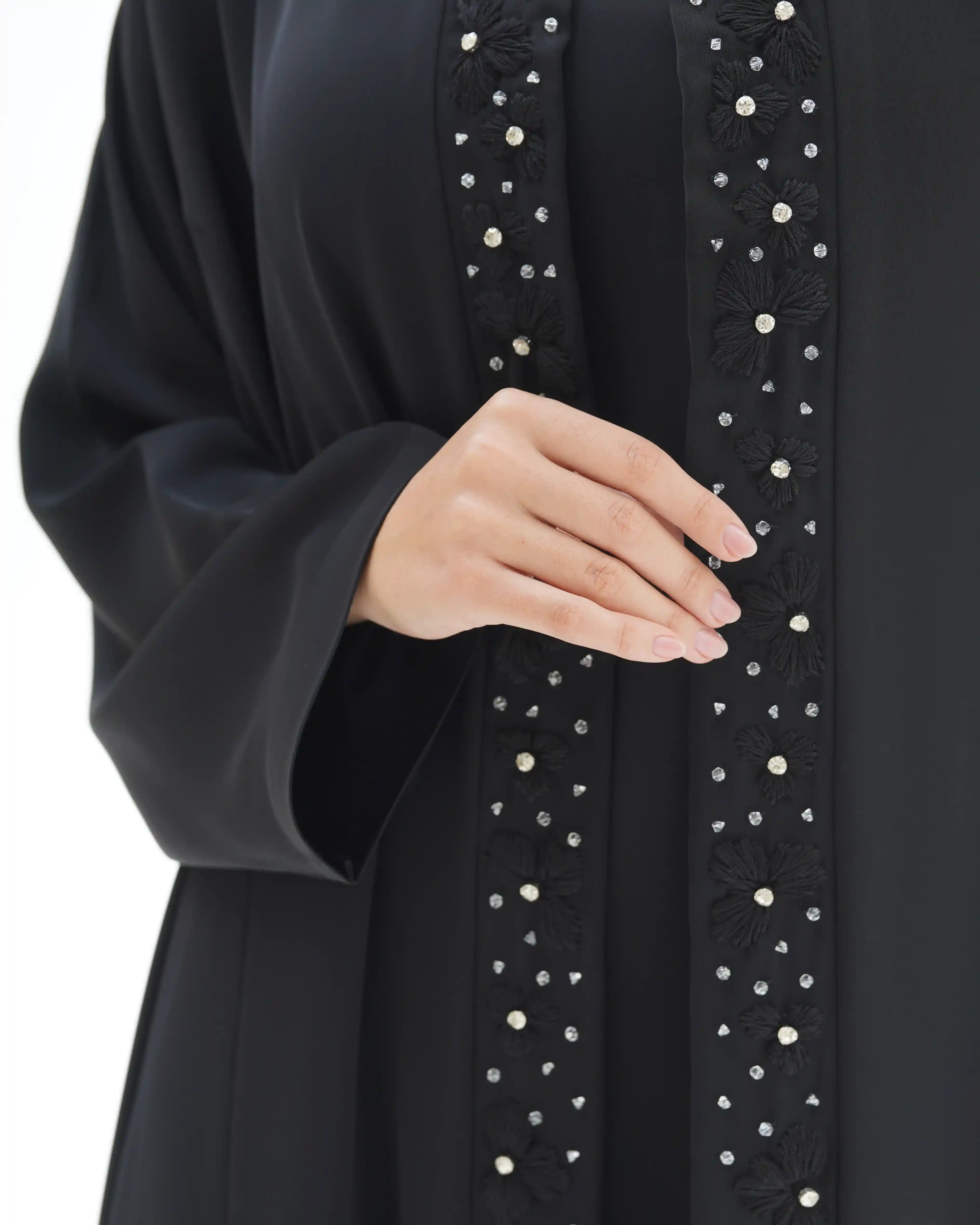 صنعت هذه العباية بهدوء وفخامة، ينساب قماش البريميوم كريب الناعم. تزدان بشريط طويل من الورود المطرزة بعناية ومنسوجة بخيوط حرير فاخر. وكل زهرة تم نسجها بخيوط حريرية رفيعة بدقة عالية تحتضن في قلبها خرزة فضية تضفي بريقاً محسوبًا, والخط العمودي مطرز ينساب على طول العباية.