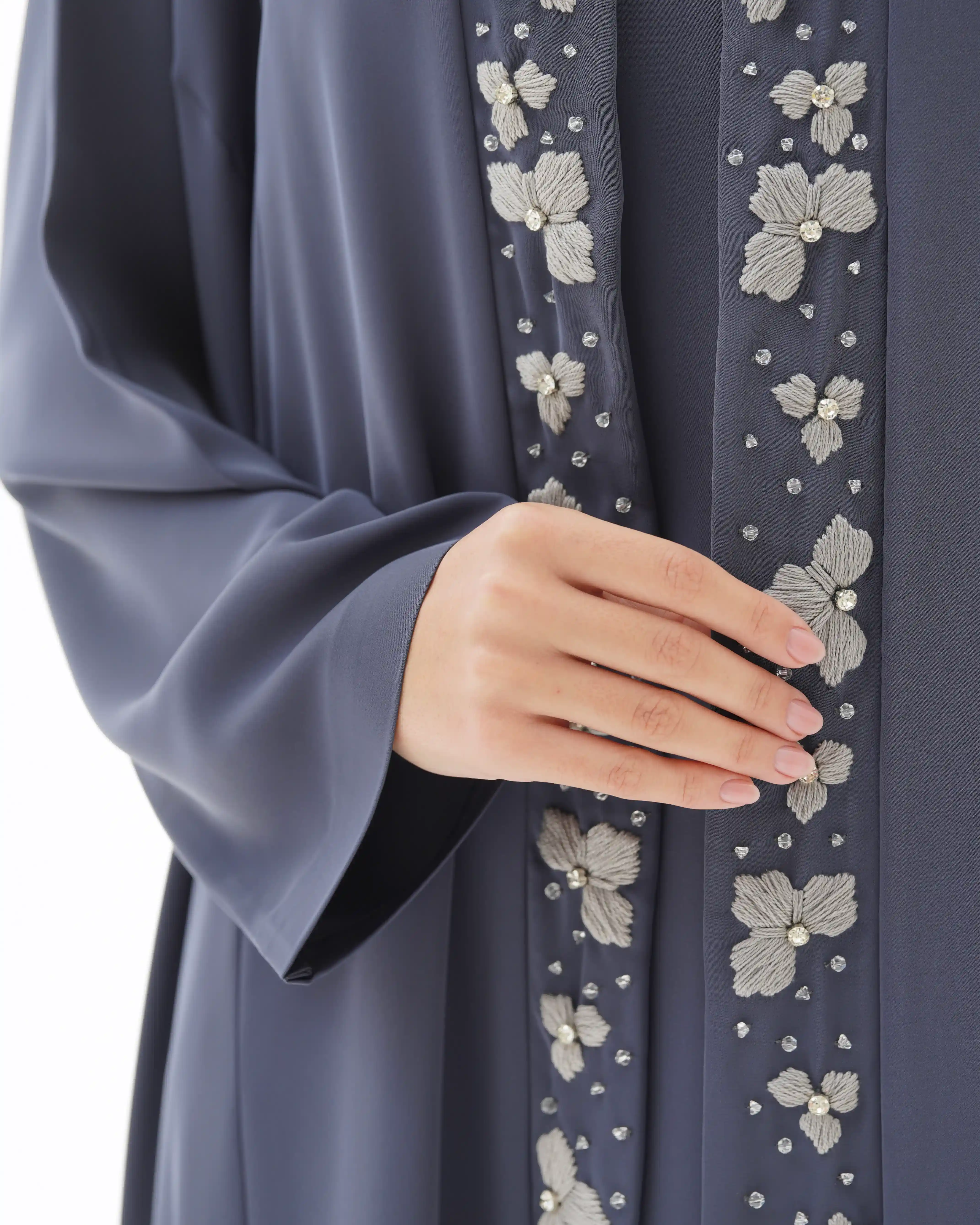 • تطريز يدوي أنيق بزهور حريرية بلون رمادي، مزدانة بخرز فضي لامع ينساب عمودياً.