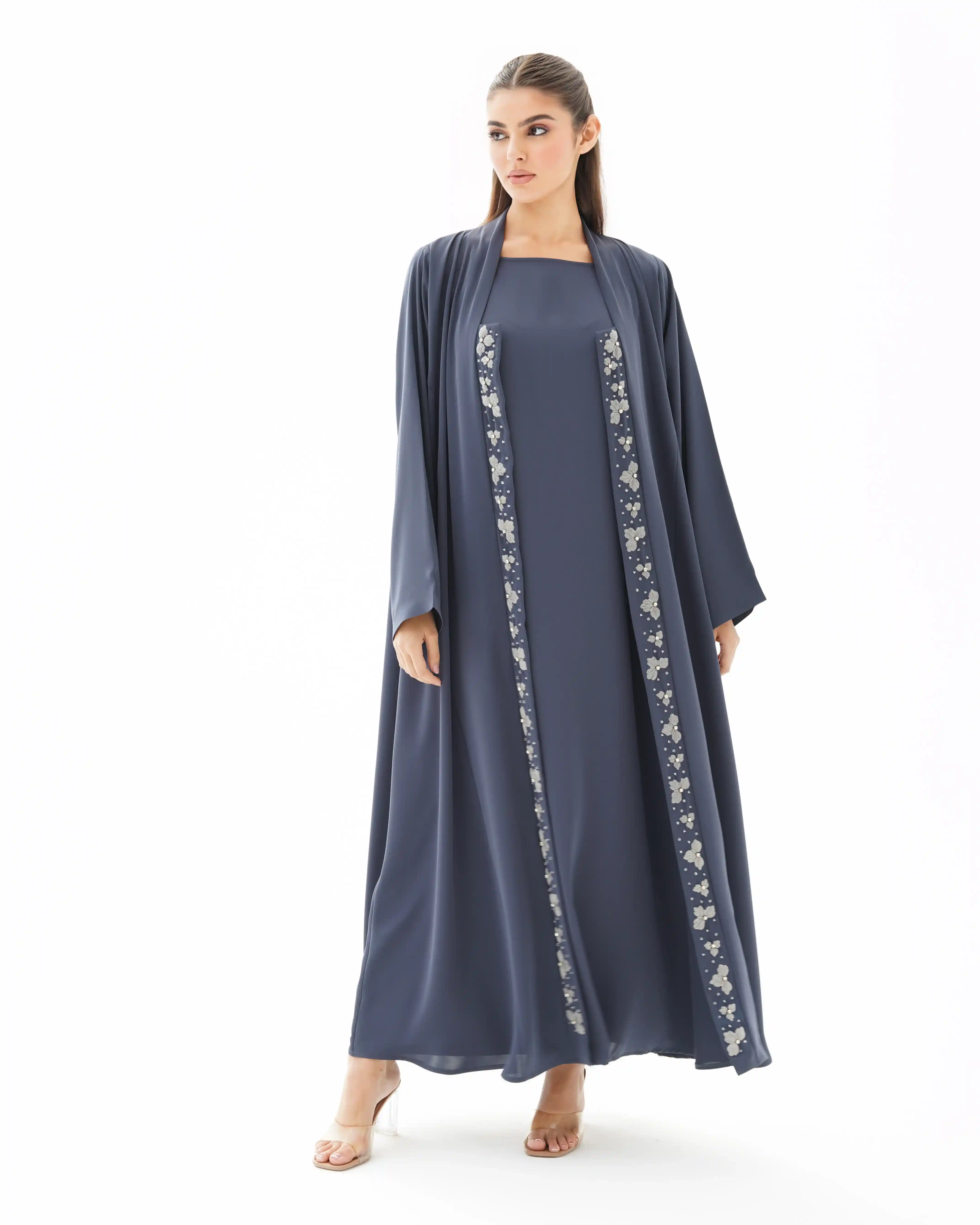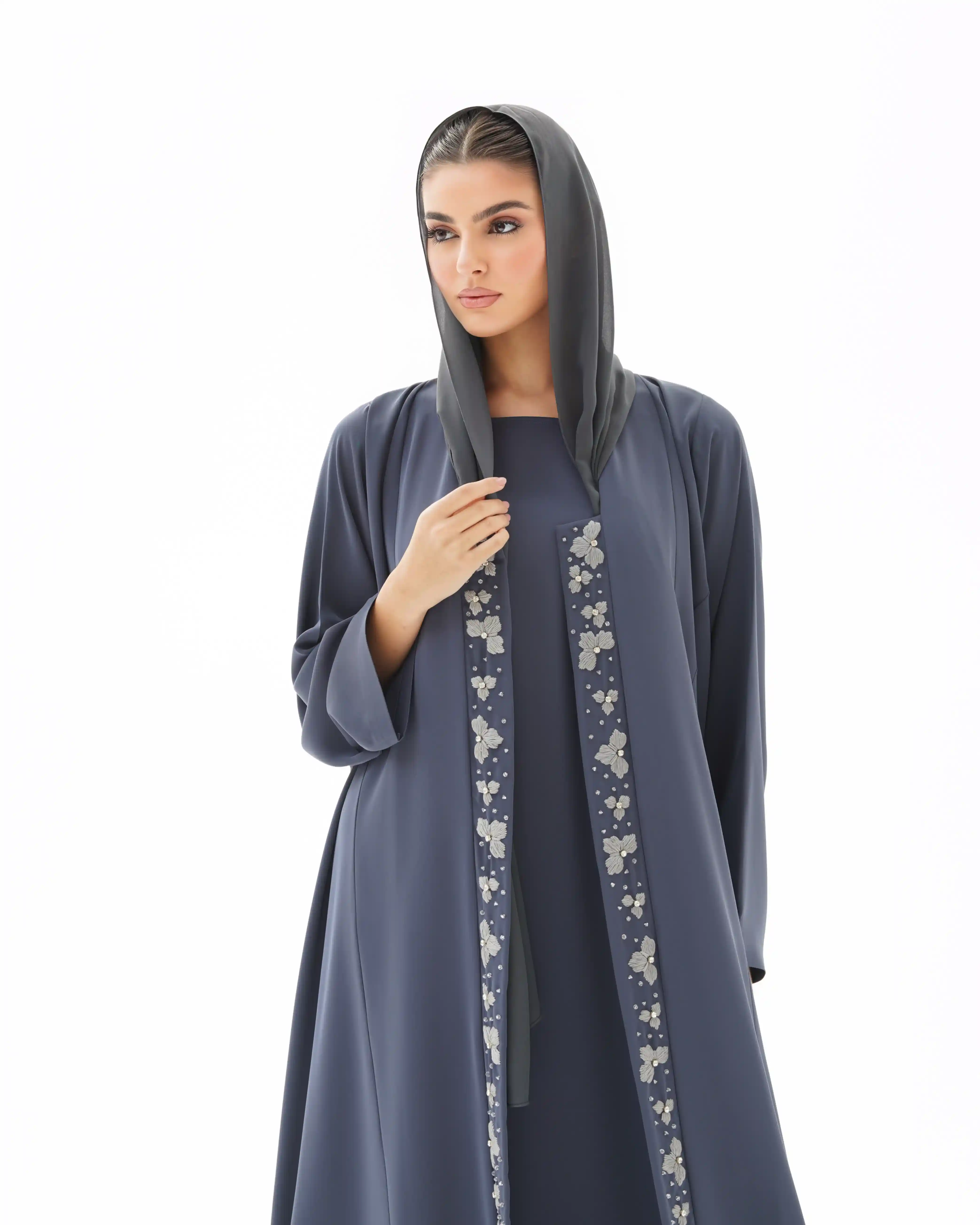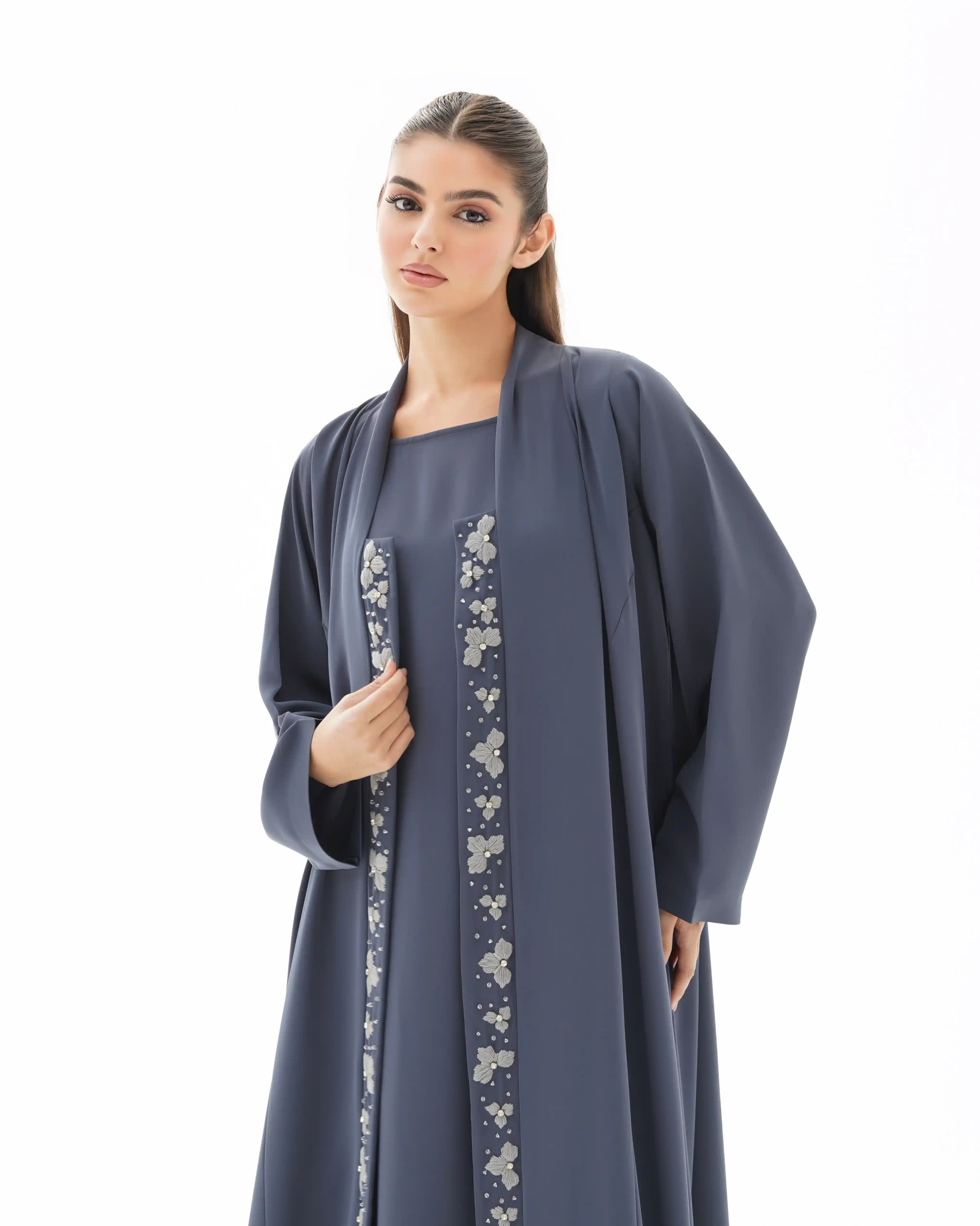 صنعت هذه العباية بهدوء وفخامة، ينساب قماش  البريميوم كريب الناعم. تزدان بشريط طويل من الورود المطرزة بعناية ومنسوجة بخيوط حرير فاخر. وكل زهرة تم نسجها بخيوط حريرية رفيعة بدقة عالية تحتضن في قلبها خرزة فضية تضفي بريقاً محسوبًا, والخط العمودي مطرز ينساب على طول العباية.