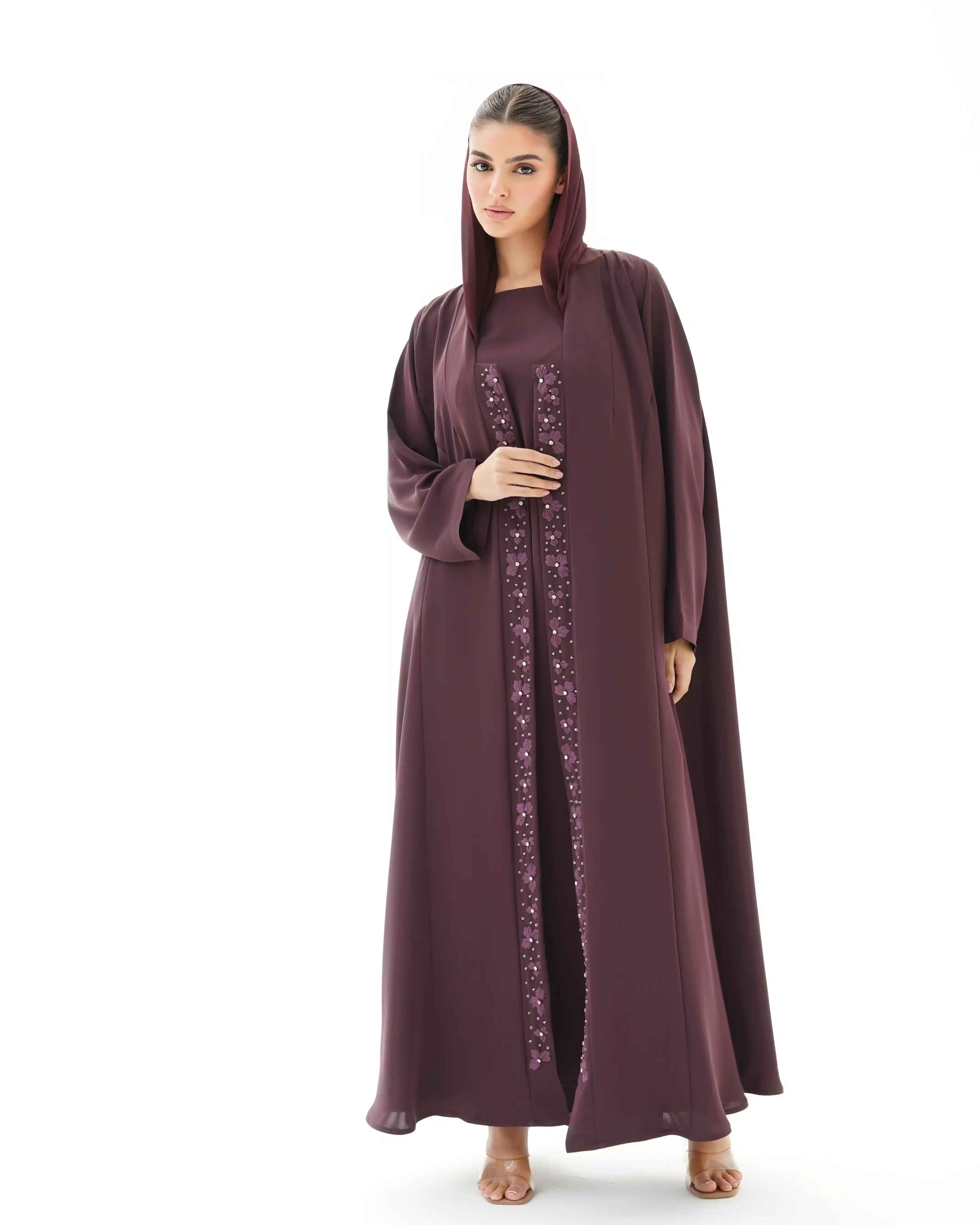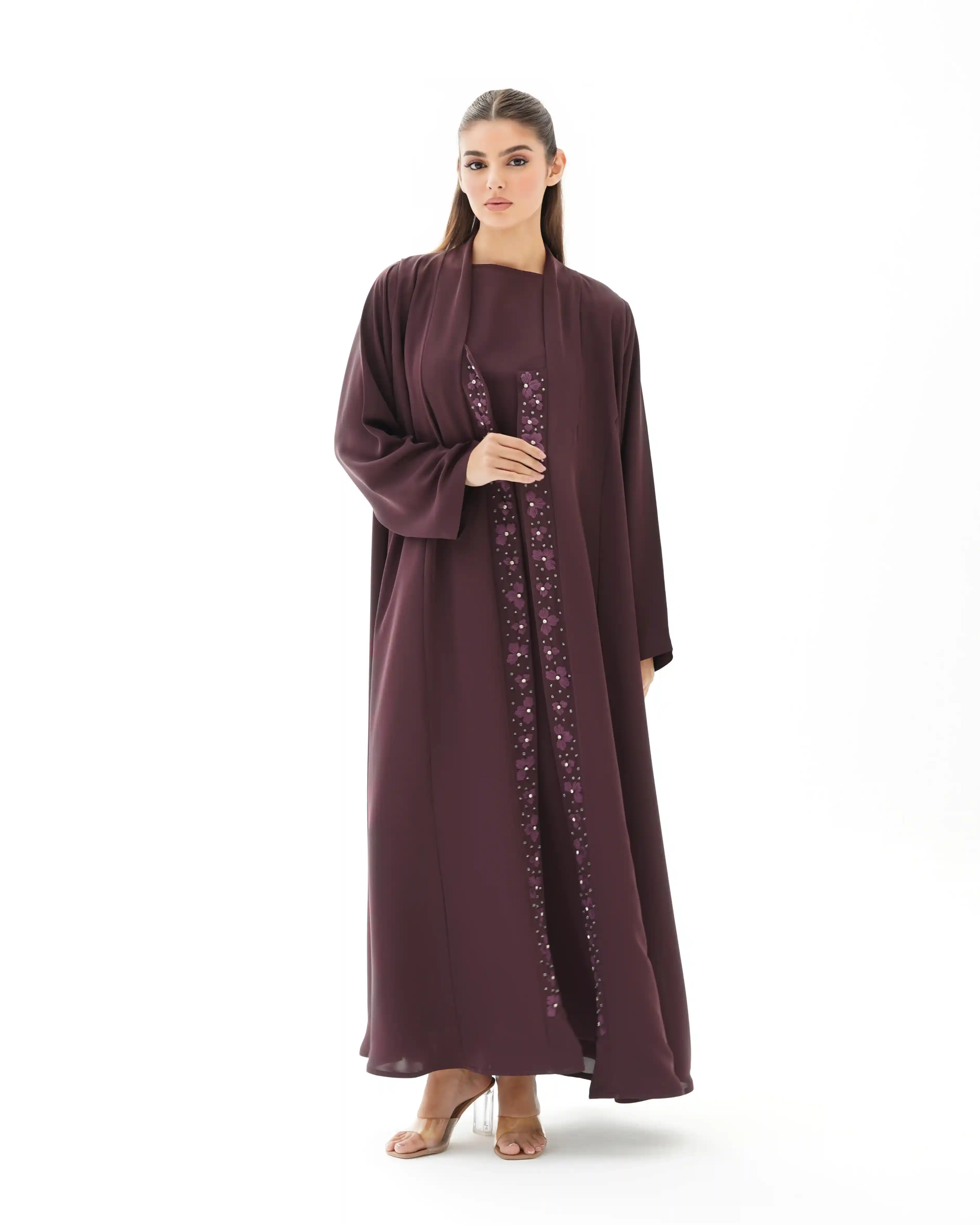 صنعت هذه العباية بهدوء وفخامة، ينساب قماش البريميوم كريب الناعم. تزدان بشريط طويل من الورود المطرزة بعناية ومنسوجة بخيوط حرير فاخر. وكل زهرة تم نسجها بخيوط حريرية رفيعة بدقة عالية تحتضن في قلبها خرزة فضية تضفي بريقاً محسوبًا, والخط العمودي مطرز ينساب على طول العباية.