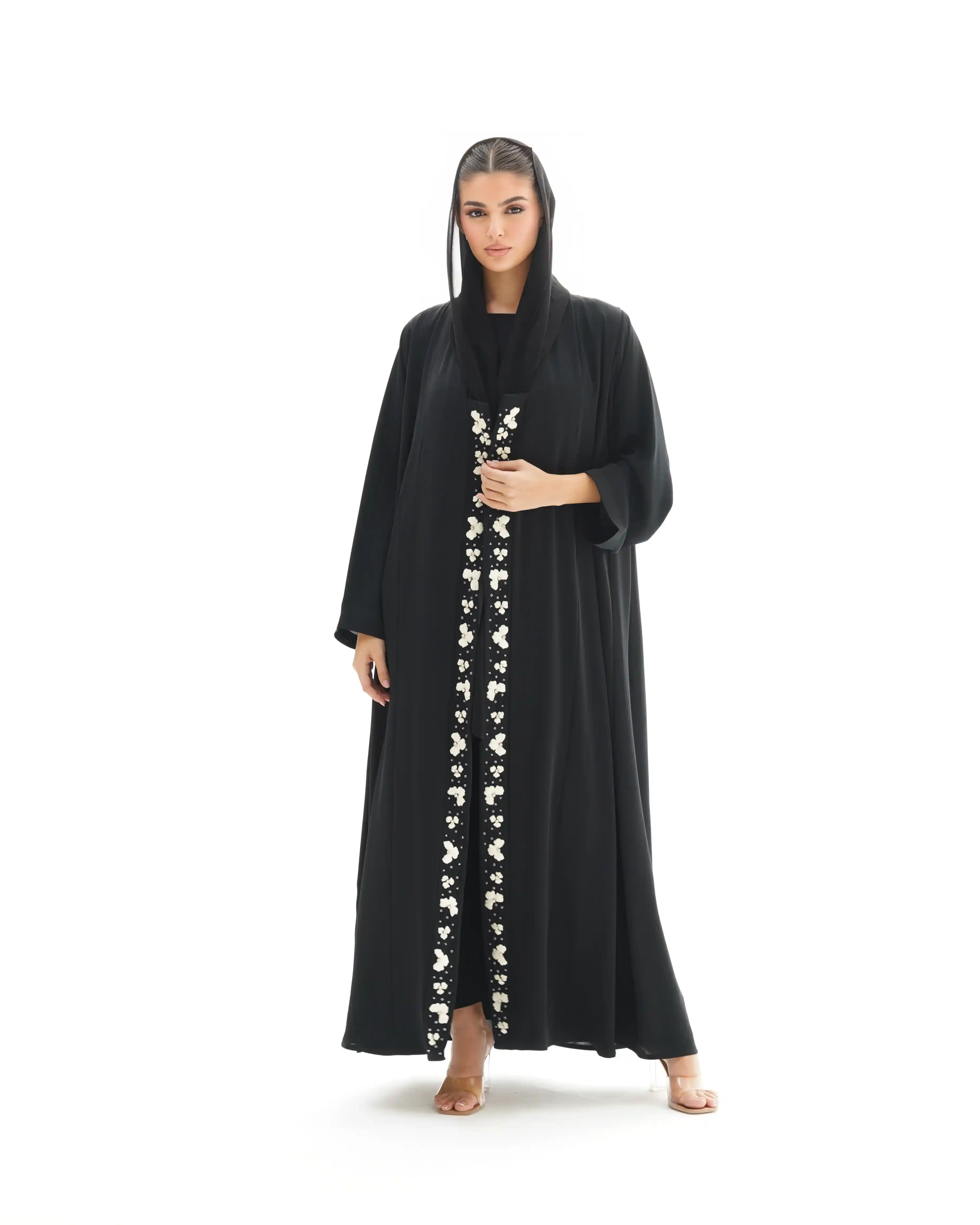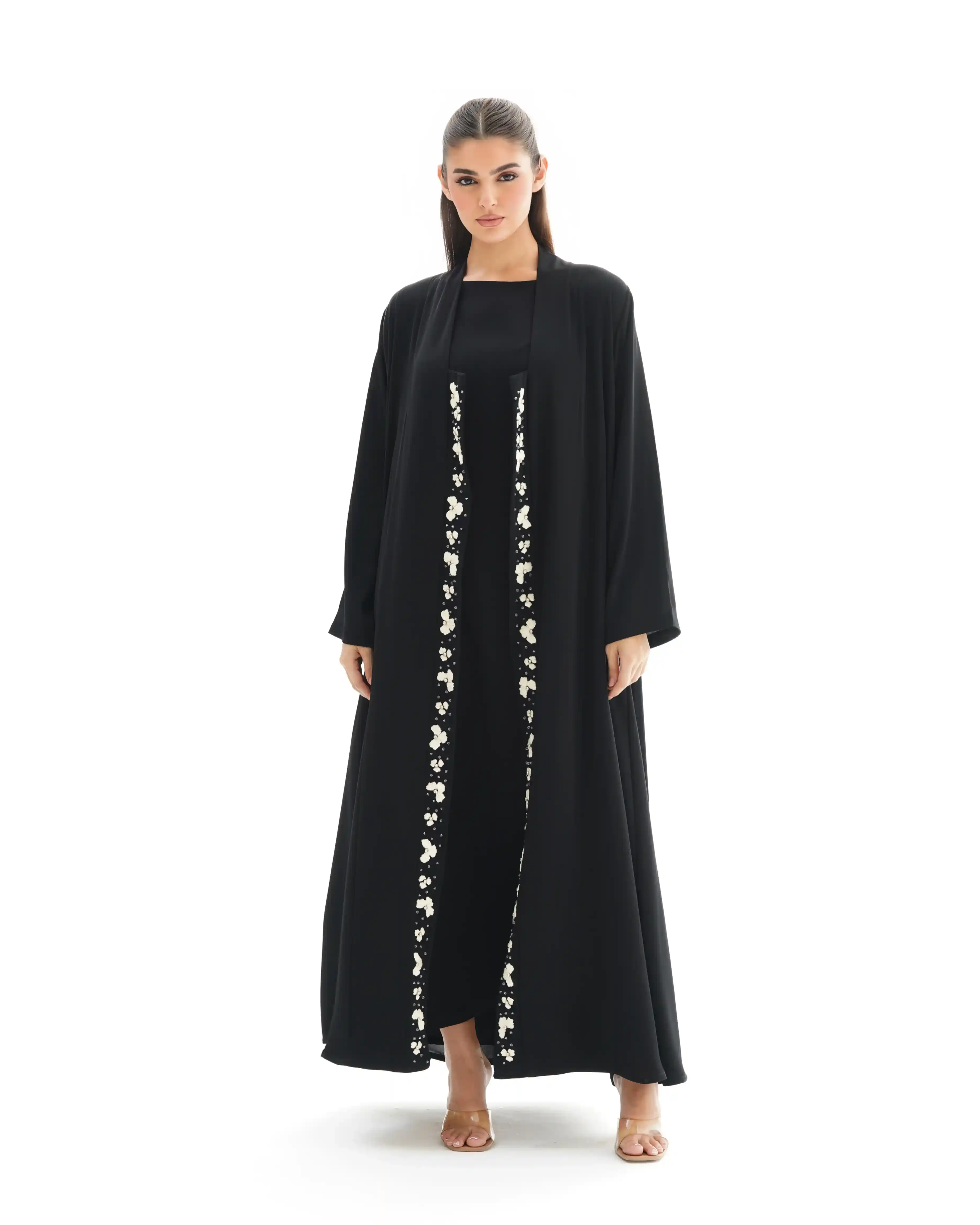 صنعت هذه العباية بهدوء وفخامة، ينساب قماش  البريميوم كريب الناعم. تزدان بشريط طويل من الورود المطرزة بعناية ومنسوجة بخيوط حرير فاخر. وكل زهرة تم نسجها بخيوط حريرية رفيعة بدقة عالية تحتضن في قلبها خرزة فضية تضفي بريقاً محسوبًا, والخط العمودي مطرز ينساب على طول العباية.