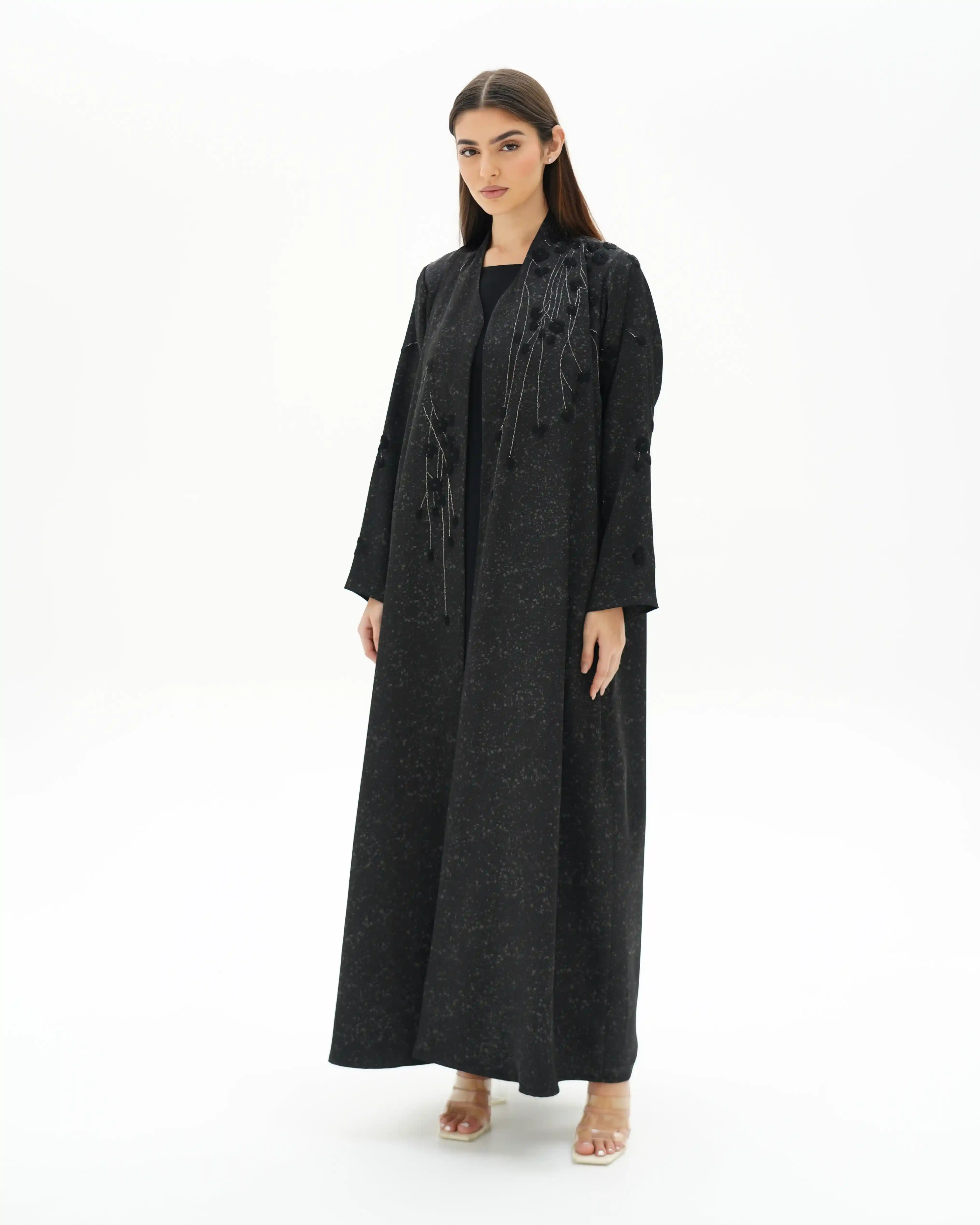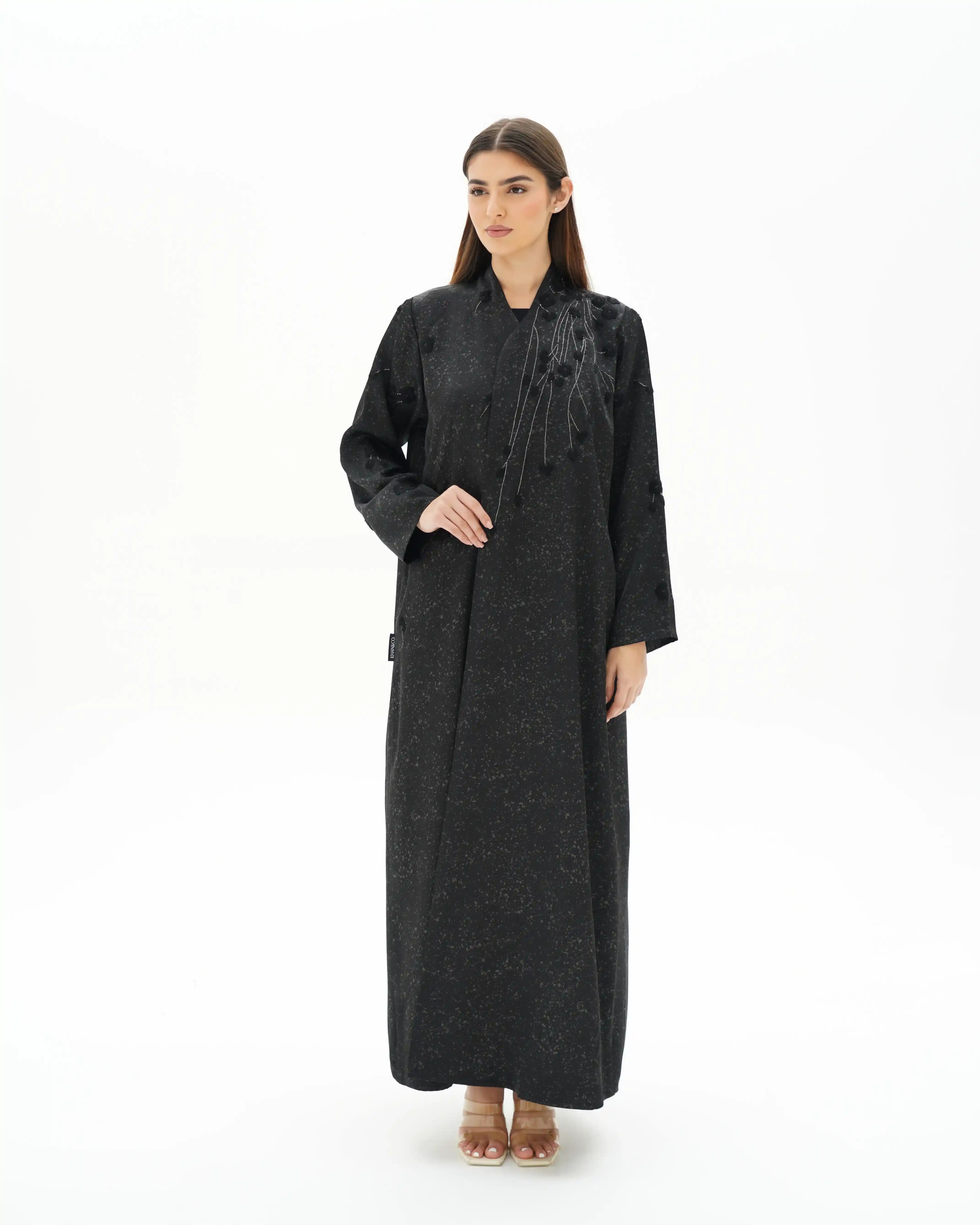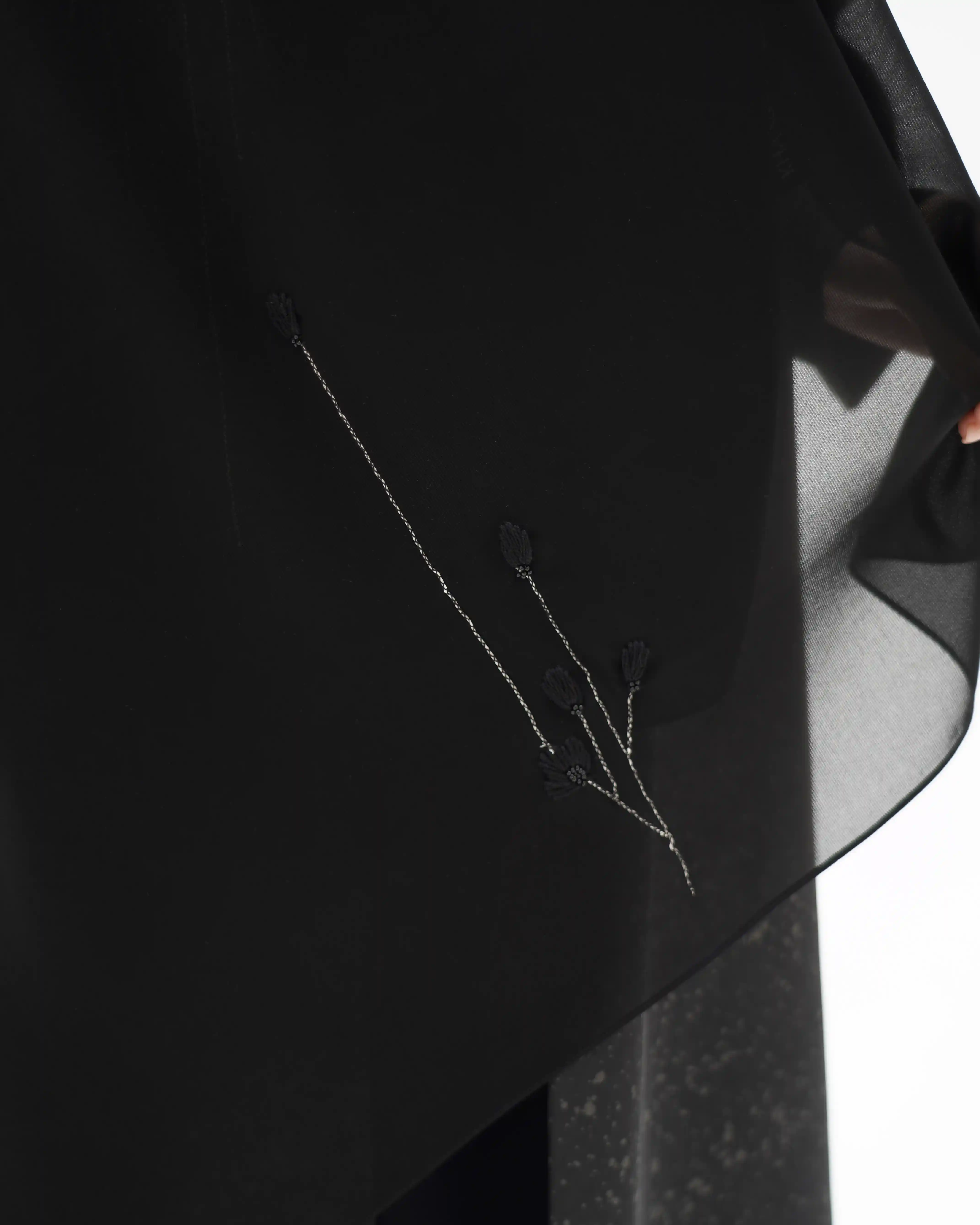 عباية تنبض بهدوء أسود راقٍ، بقصّة مستقيمة تنسدل بانسيابية متوازنة تعكس حضورًا واثقًا وبسيطًا في آنٍ واحد. من قماش مست فويل بملمس خفيف ولمعة ناعمة متناثرة تعكس الضوء بحس راقٍ. يتزين الصدر على الجانبين بتكوين زهري متشابك، حيث تتوزع الأزهار السوداء بترابط أنيق تمتد من الكتف حتى نهاية الصدر ومروراً بالياقة، وتتوسط كل زهرة خرزات سوداء دقيقة تمنح عمقًا ولمسة فاخرة. ترتبط الأزهار بأفرع من خيط أبيض ملتف بخيوط سوداء، مشكلاً مسارًا انسيابيًا يبرز التباين الراقي فوق الخلفية السوداء. تكتمل الإطلالة بطرحة سوداء مشتغلة بنفس التكوين الزهري في منتصف طرفيها، لتعكس تناغمًا متكاملًا.
