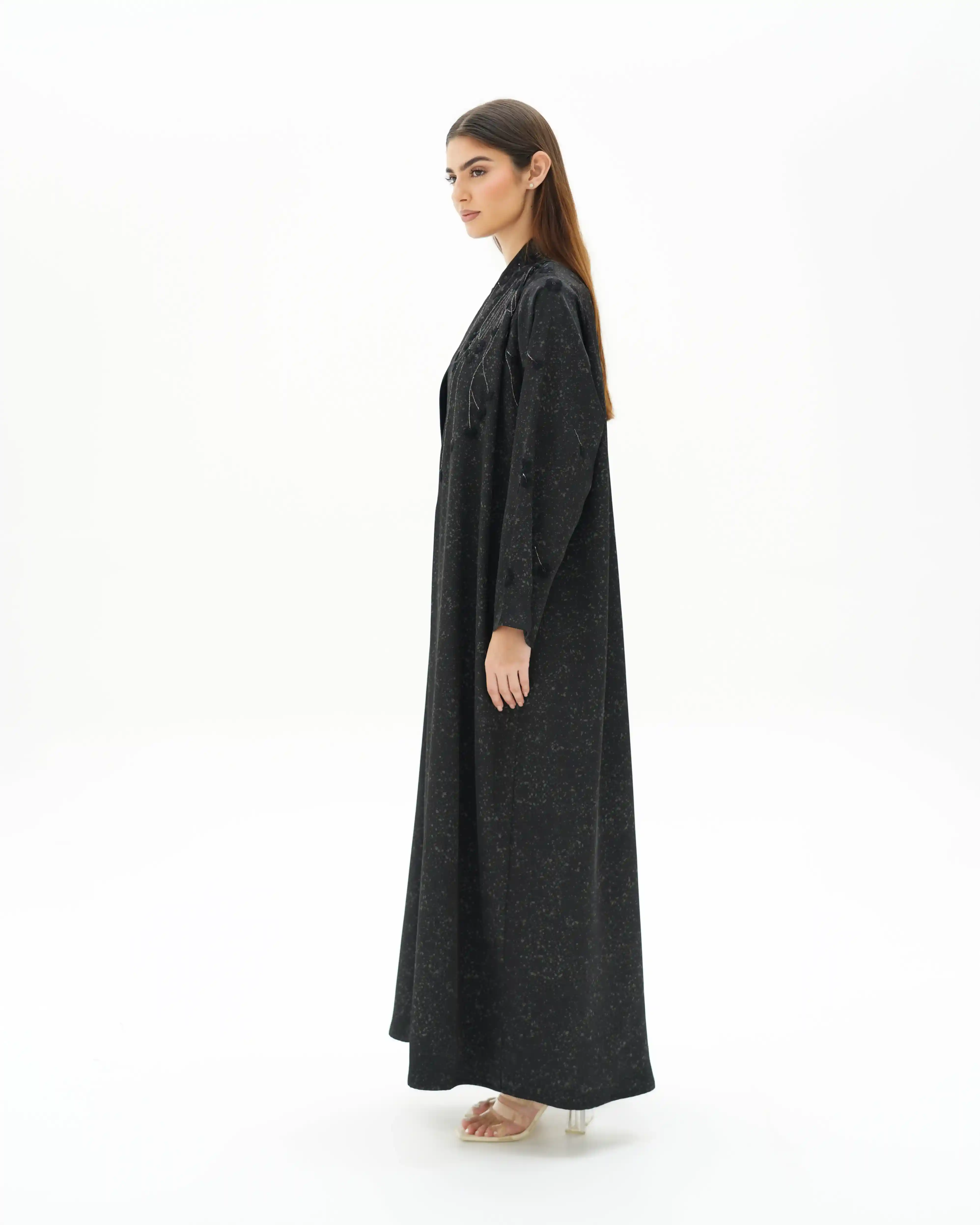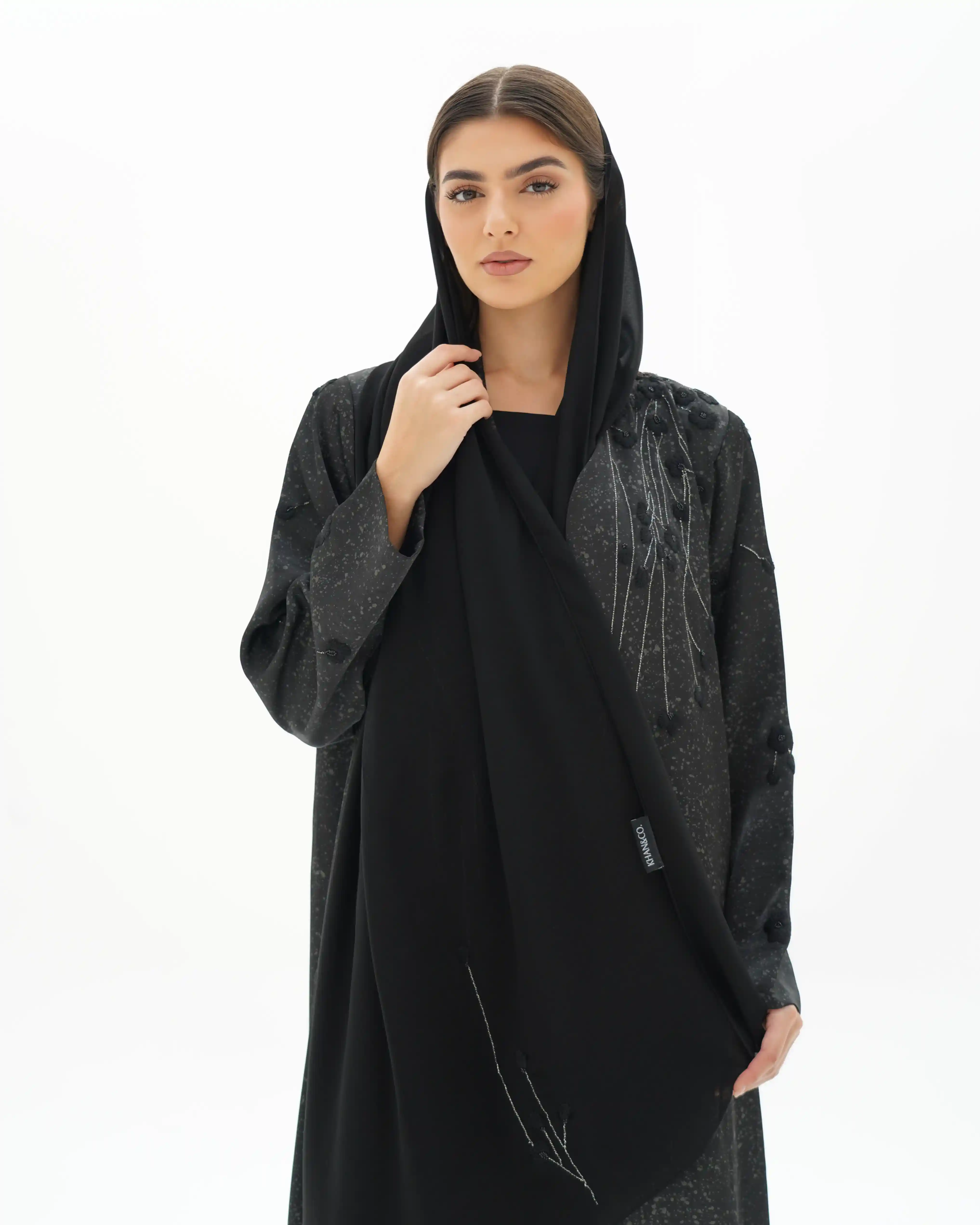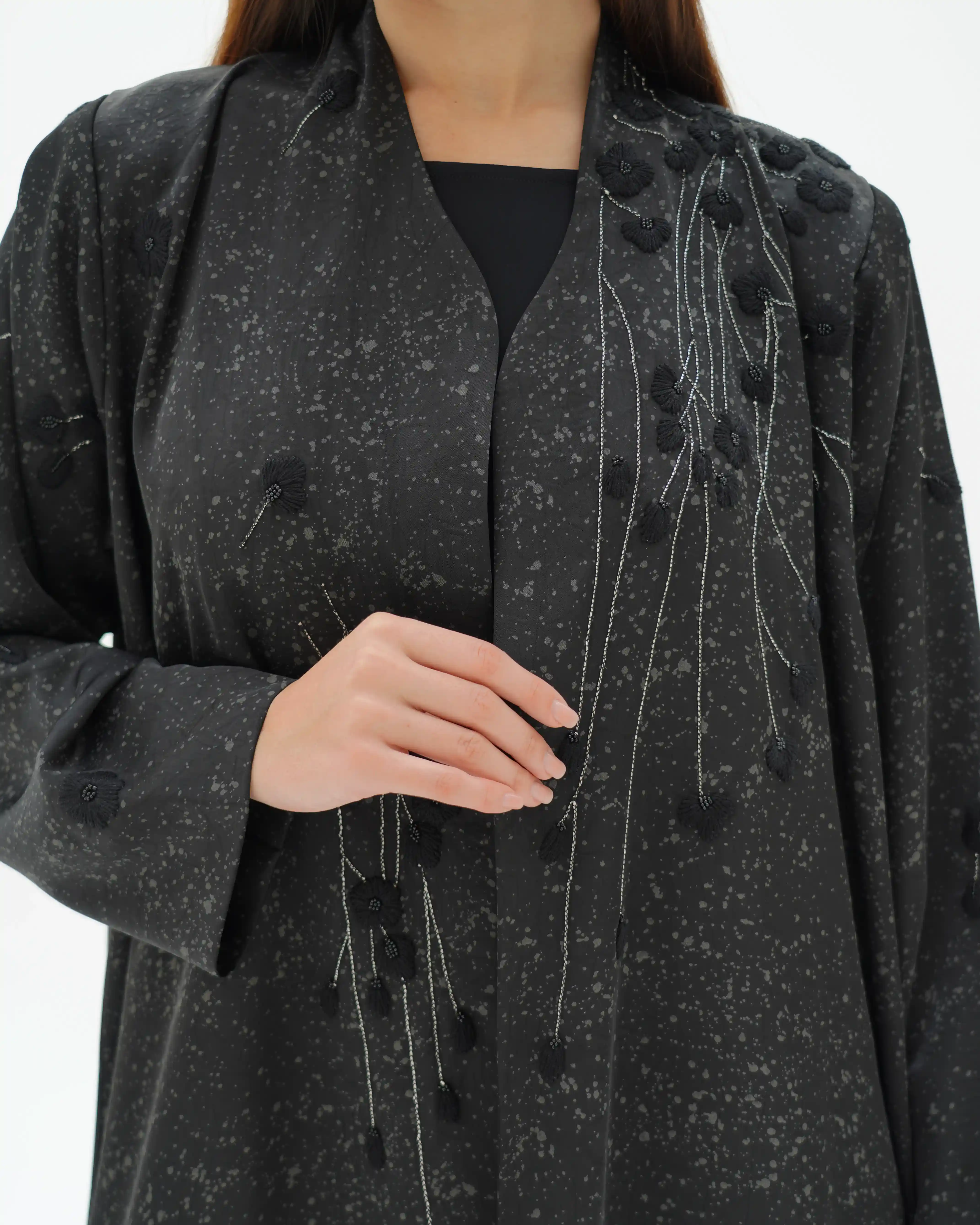 عباية تنبض بهدوء أسود راقٍ، بقصّة مستقيمة تنسدل بانسيابية متوازنة تعكس حضورًا واثقًا وبسيطًا في آنٍ واحد. من قماش مست فويل بملمس خفيف ولمعة ناعمة متناثرة تعكس الضوء بحس راقٍ. يتزين الصدر على الجانبين بتكوين زهري متشابك، حيث تتوزع الأزهار السوداء بترابط أنيق تمتد من الكتف حتى نهاية الصدر ومروراً بالياقة، وتتوسط كل زهرة خرزات سوداء دقيقة تمنح عمقًا ولمسة فاخرة. ترتبط الأزهار بأفرع من خيط أبيض ملتف بخيوط سوداء، مشكلاً مسارًا انسيابيًا يبرز التباين الراقي فوق الخلفية السوداء. تكتمل الإطلالة بطرحة سوداء مشتغلة بنفس التكوين الزهري في منتصف طرفيها، لتعكس تناغمًا متكاملًا.