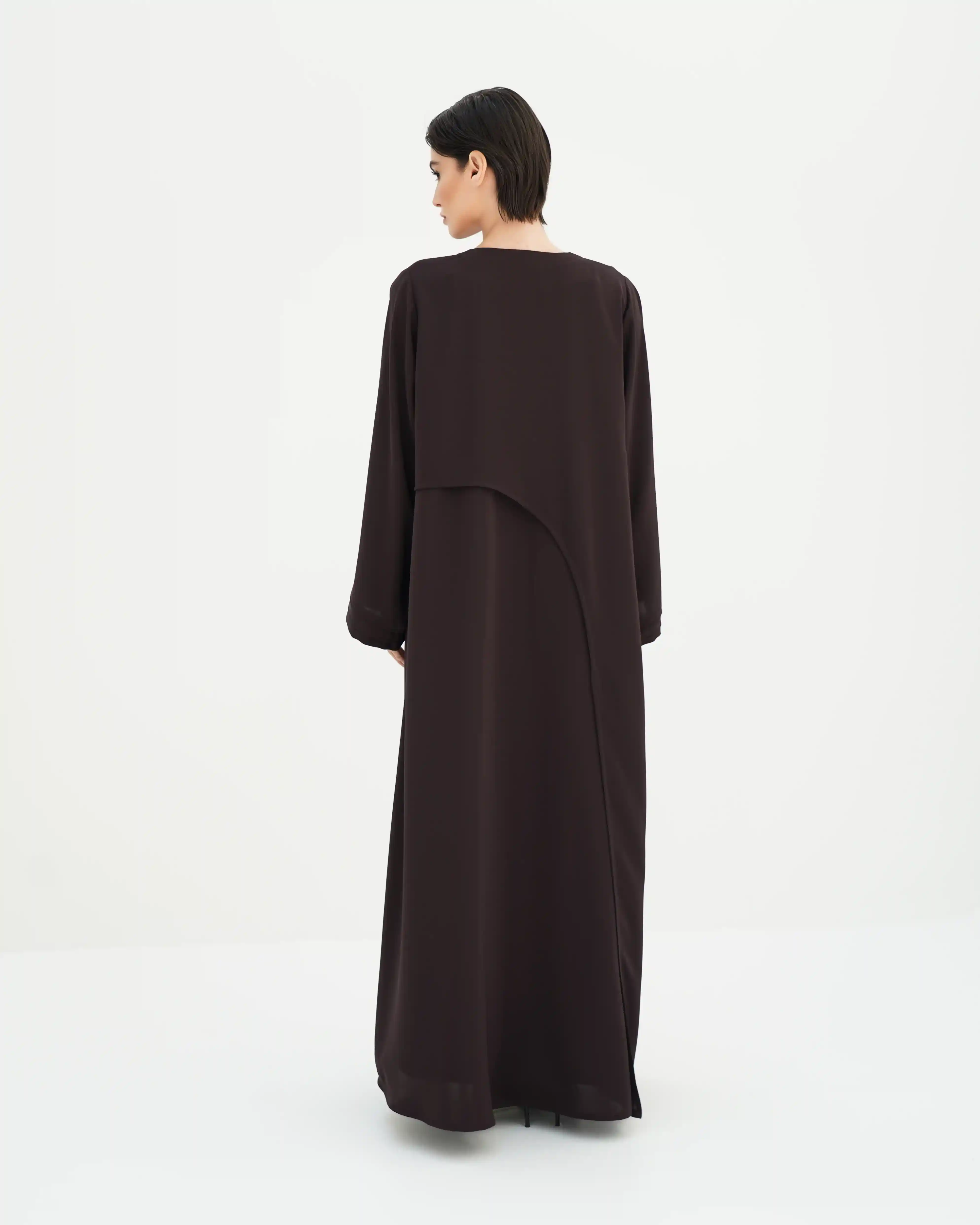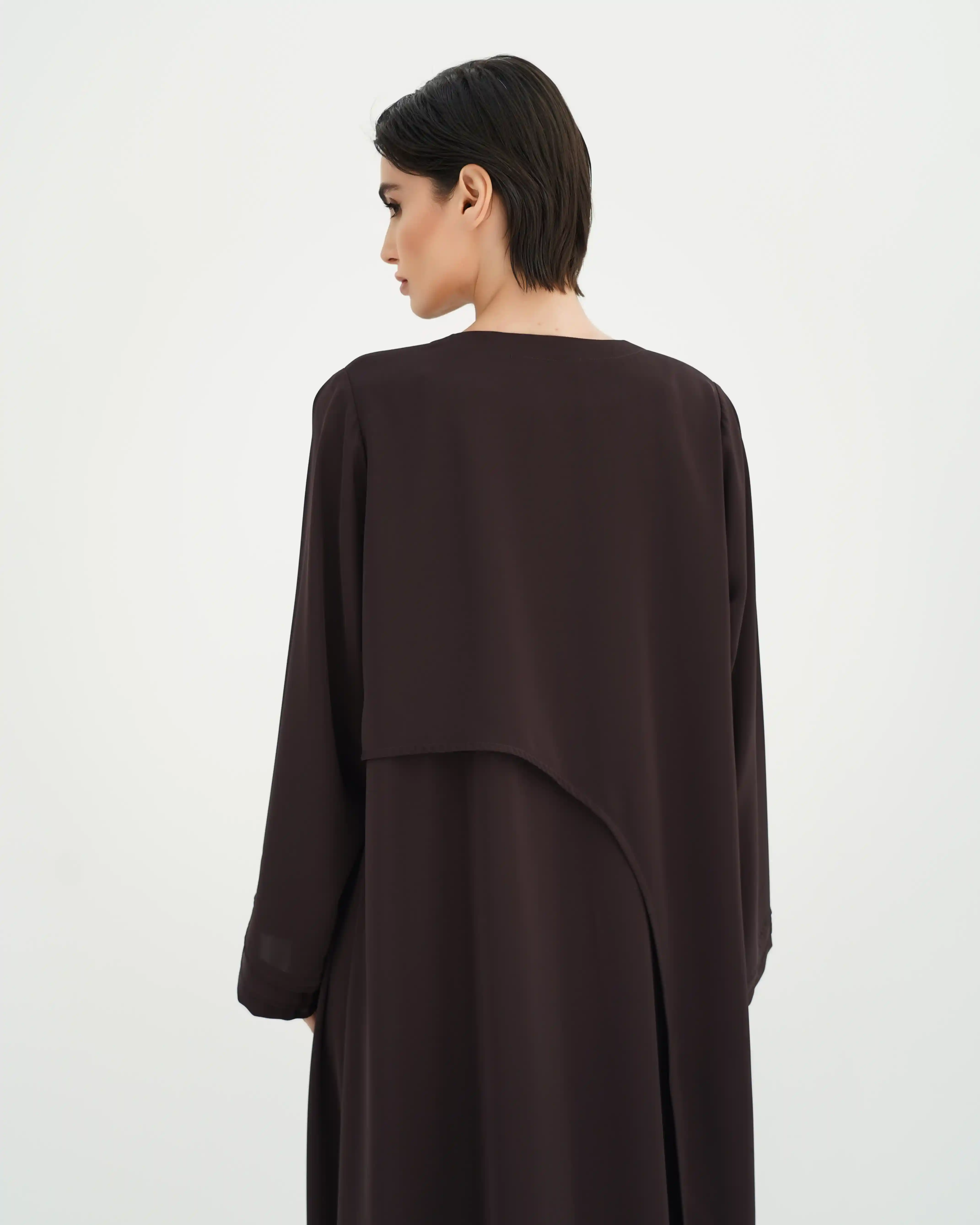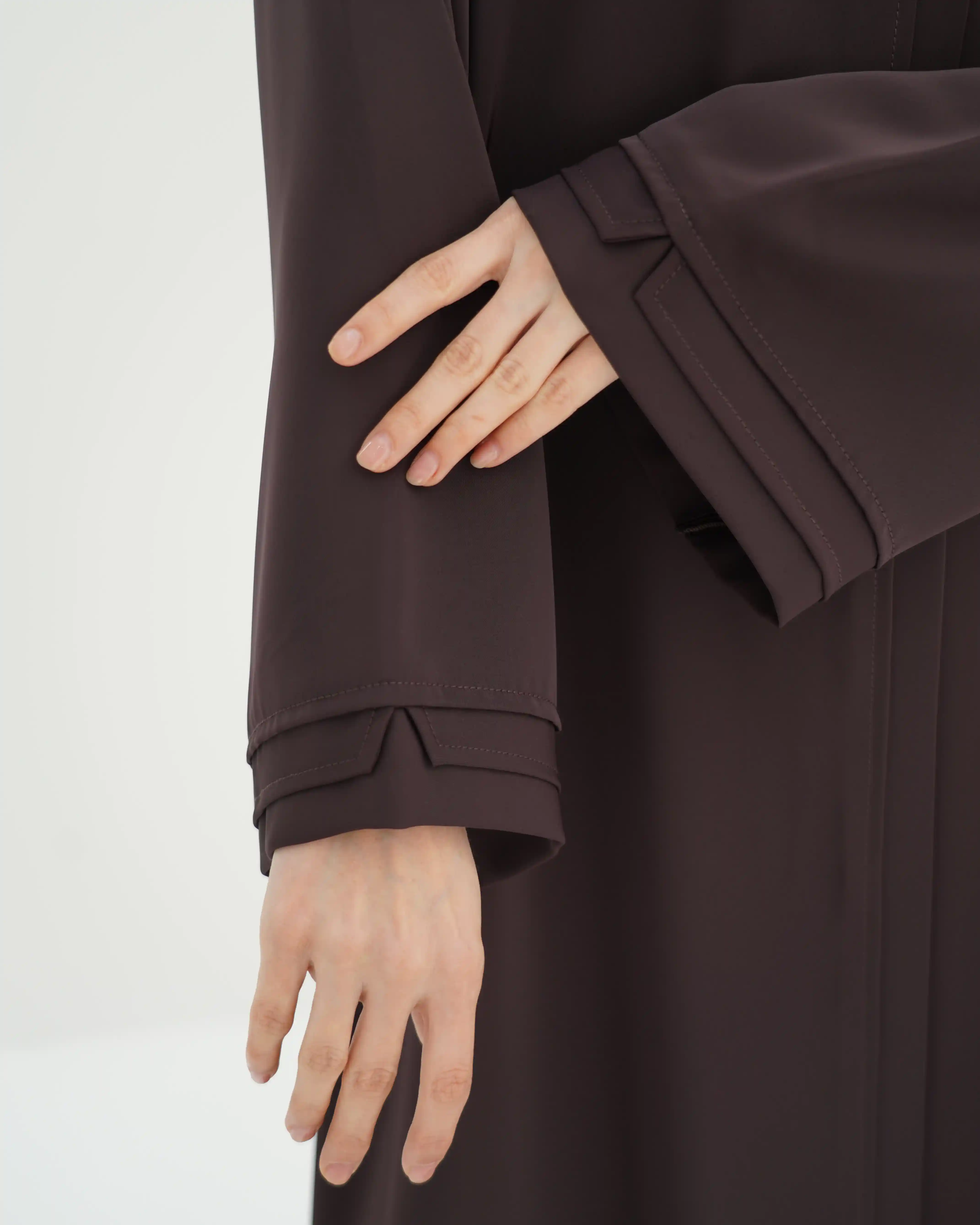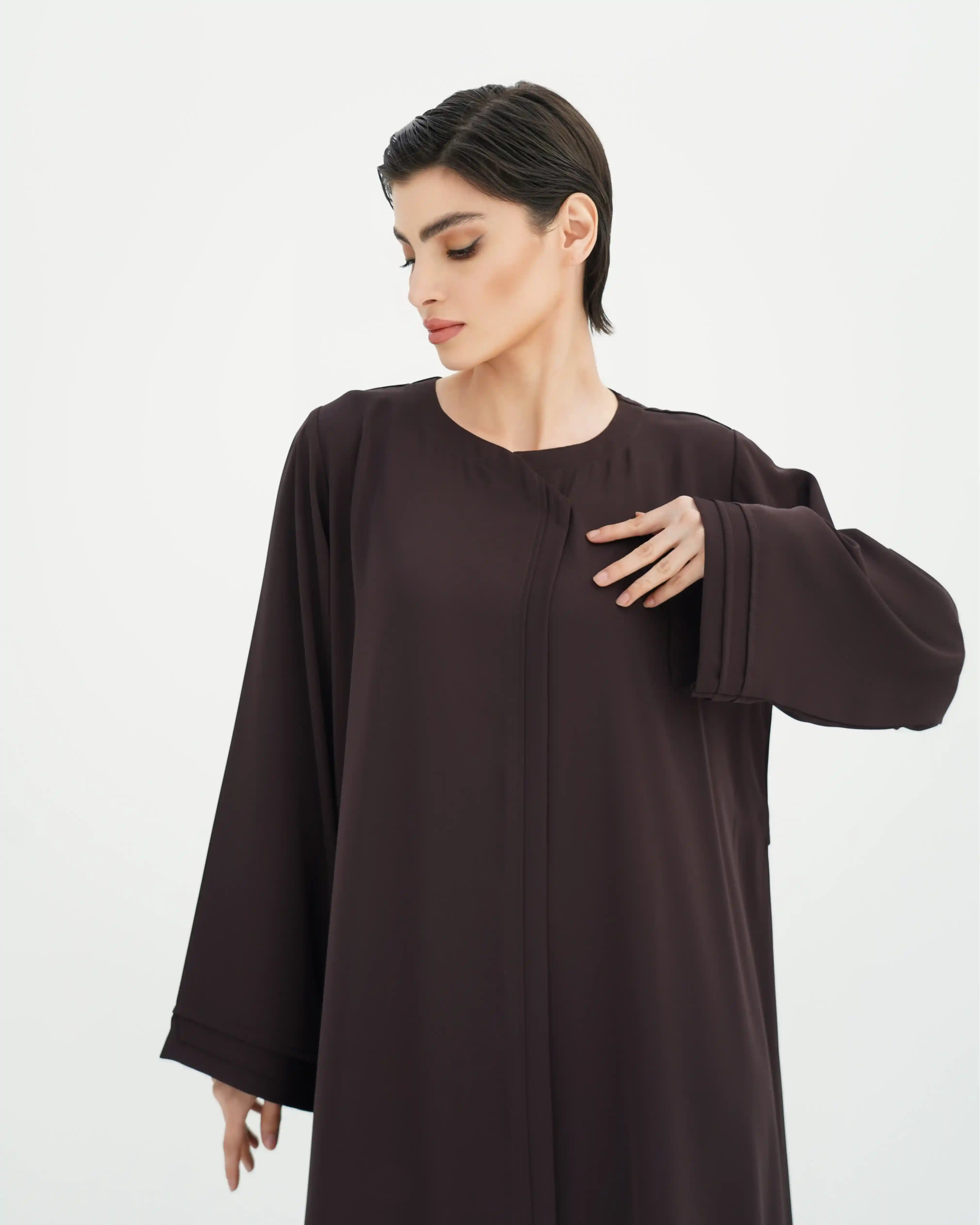 عباية تنبض بالهدوء والفخامة، من قماش البريميوم كريب بملمس ناعم وانسدال هادئ يعكس بساطة راقية وحضورًا متزنًا. تأتي بقصة مستقيمة مع إغلاق أمامي أنيق، ويبرز التصميم من خلال ثنيات مدروسة في منتصف العباية تمتد من خط الرقبة حتى الأسفل، مانحةً تدرجًا بصريًا ناعمًا يعزز انسيابية القماش دون مبالغة. يكتمل التصميم بتفصيل خلفي مبتكر، حيث يأتي الجزء العلوي من الظهر بقصة نصف قوس تنسدل بسلاسة نحو الأسفل، لتضيف بعدًا بصريًا أنيقًا يوازن بين الأمام والخلف. الأكمام مصممة بخط نظيف مع ثنيات متدرجة تضيف عمقًا هادئًا للتصميم، مع الحفاظ على راحة الحركة. تأتي العباية مع طرحة سادة متناسقة تكمل الإطلالة بأسلوب نقي.
