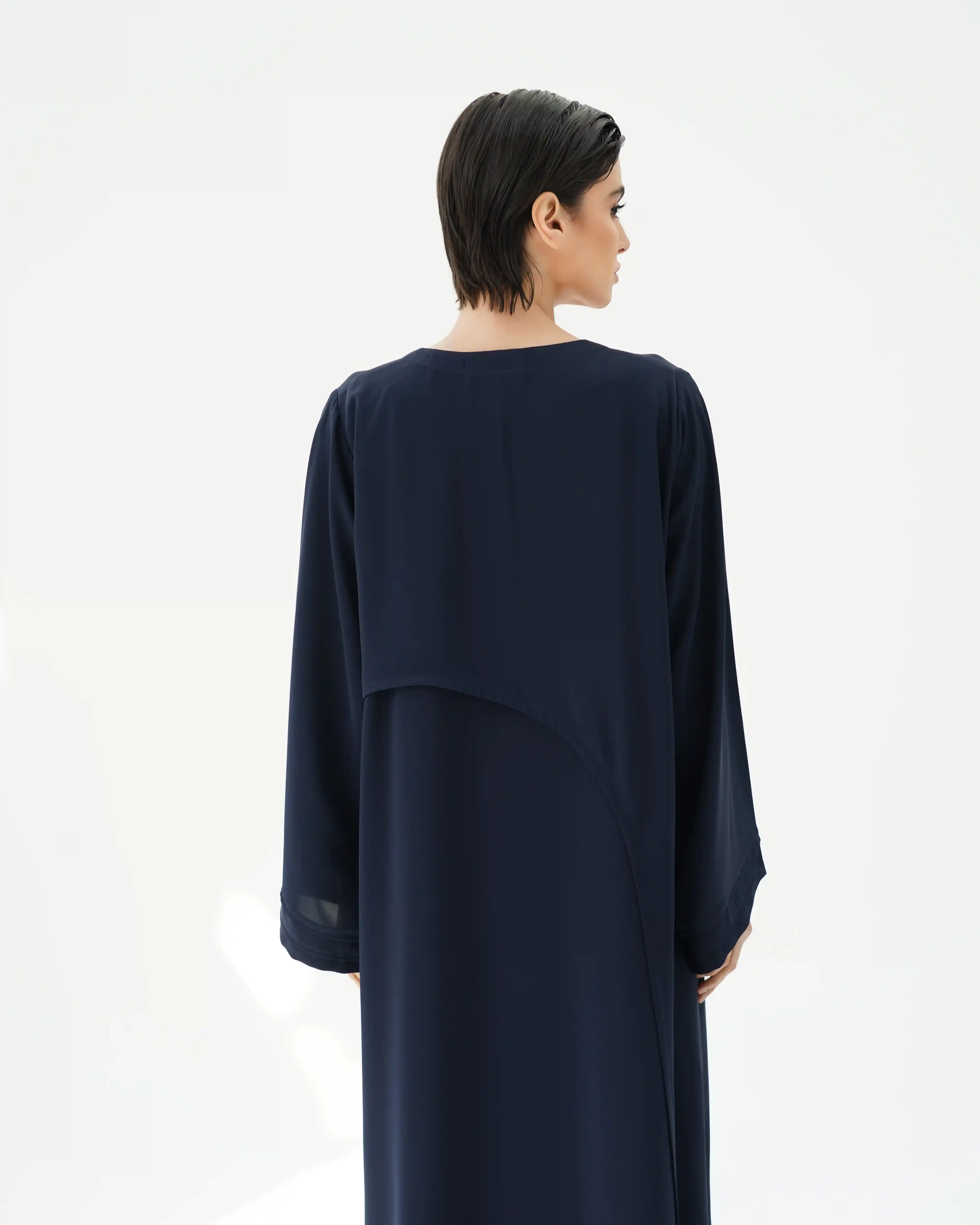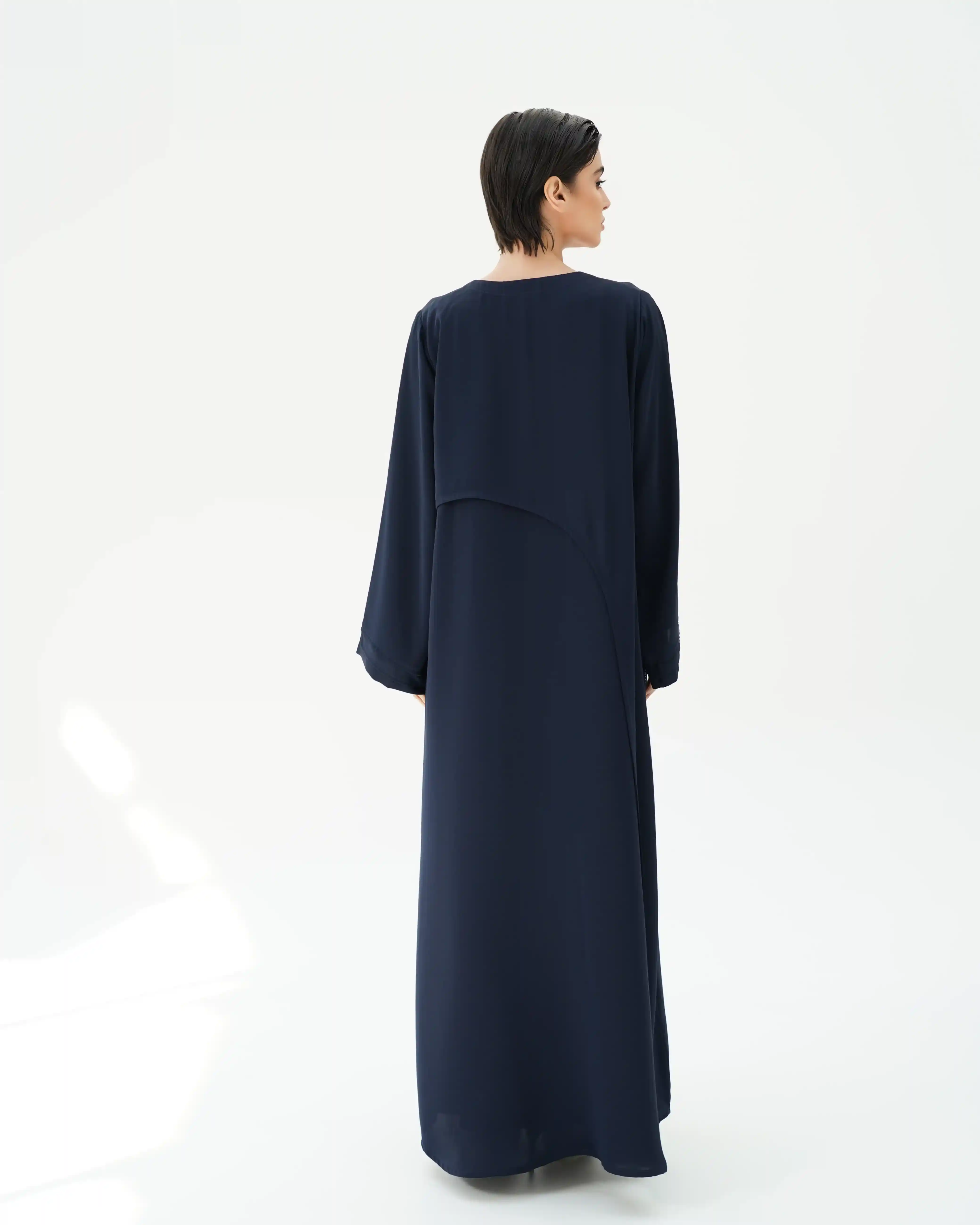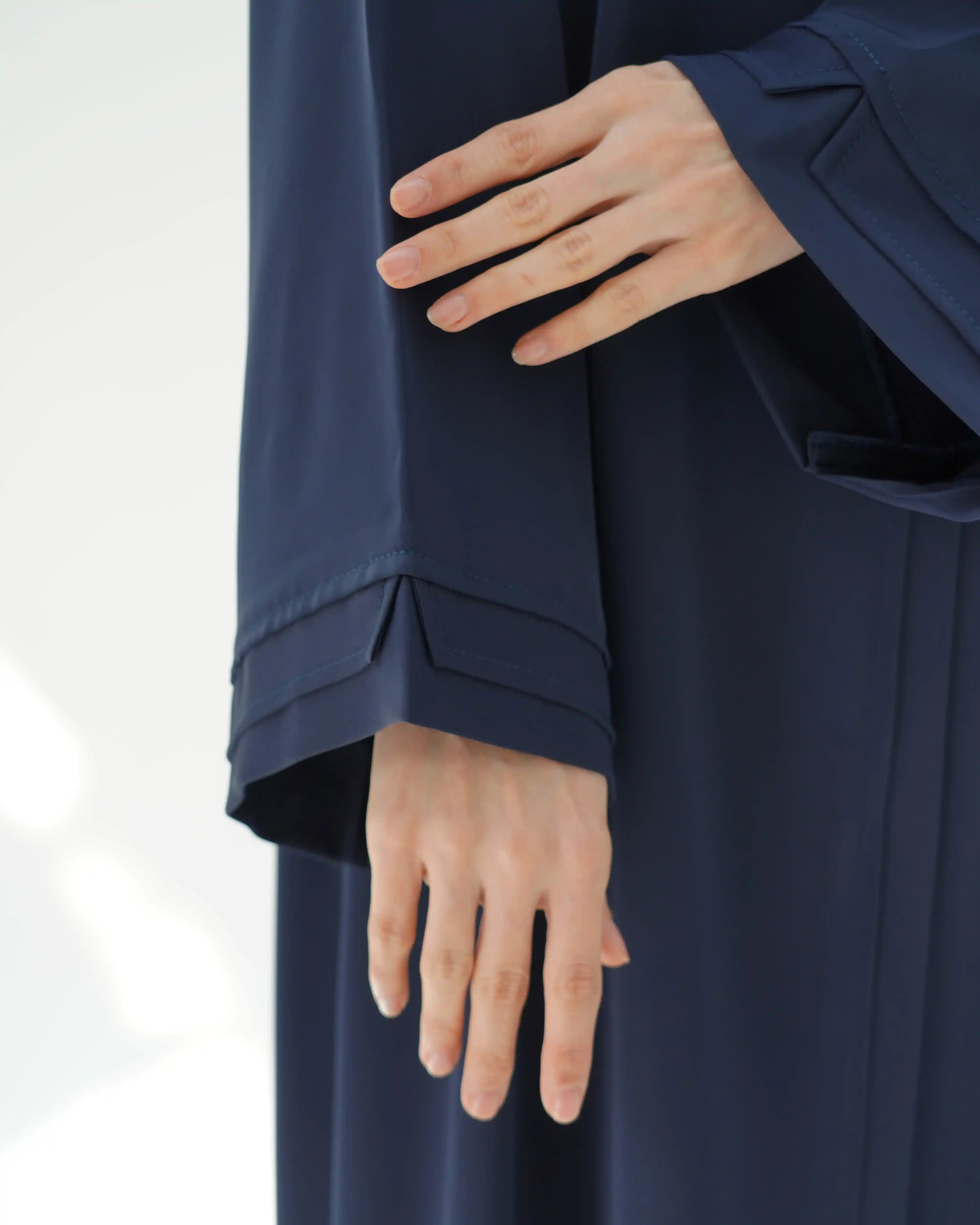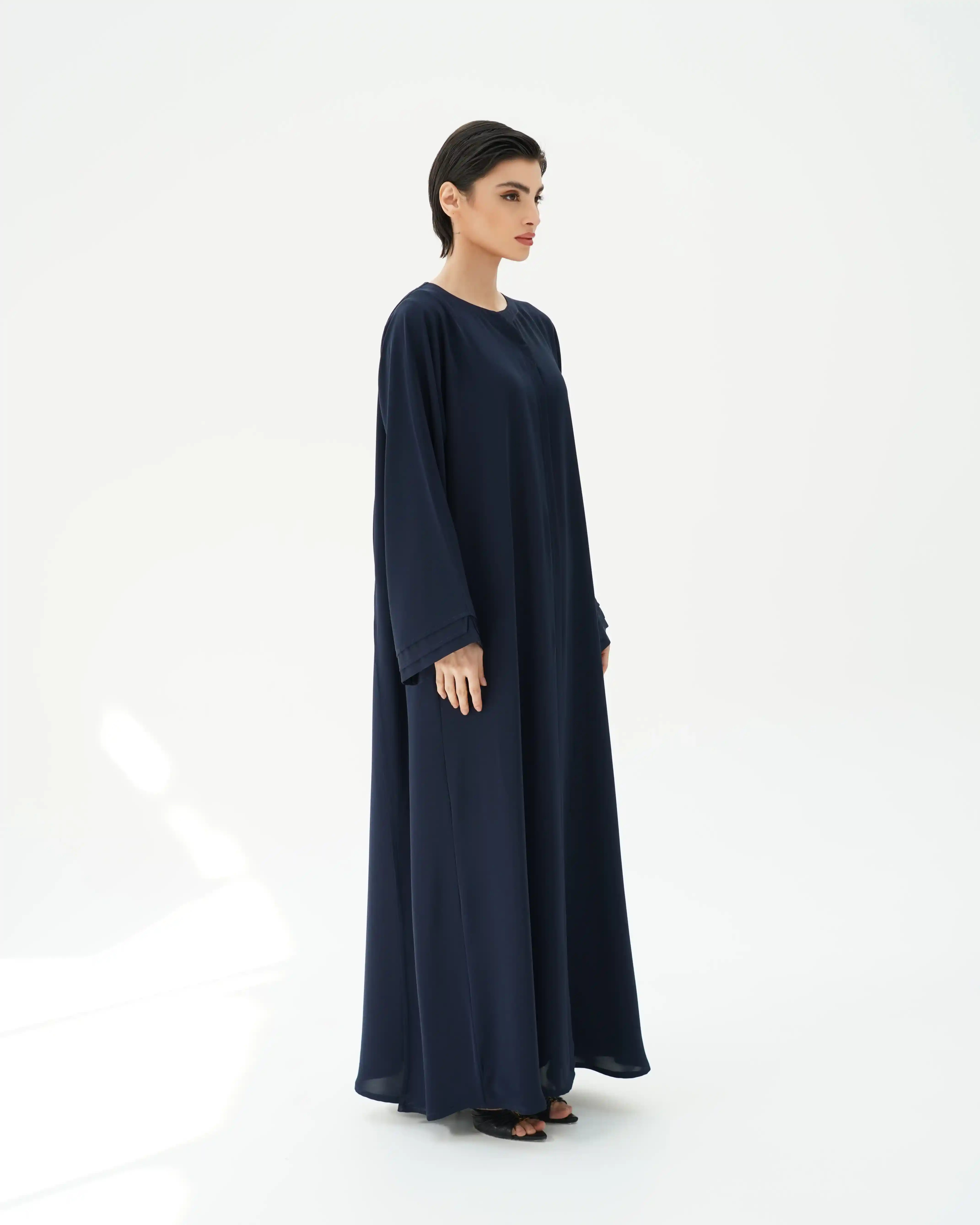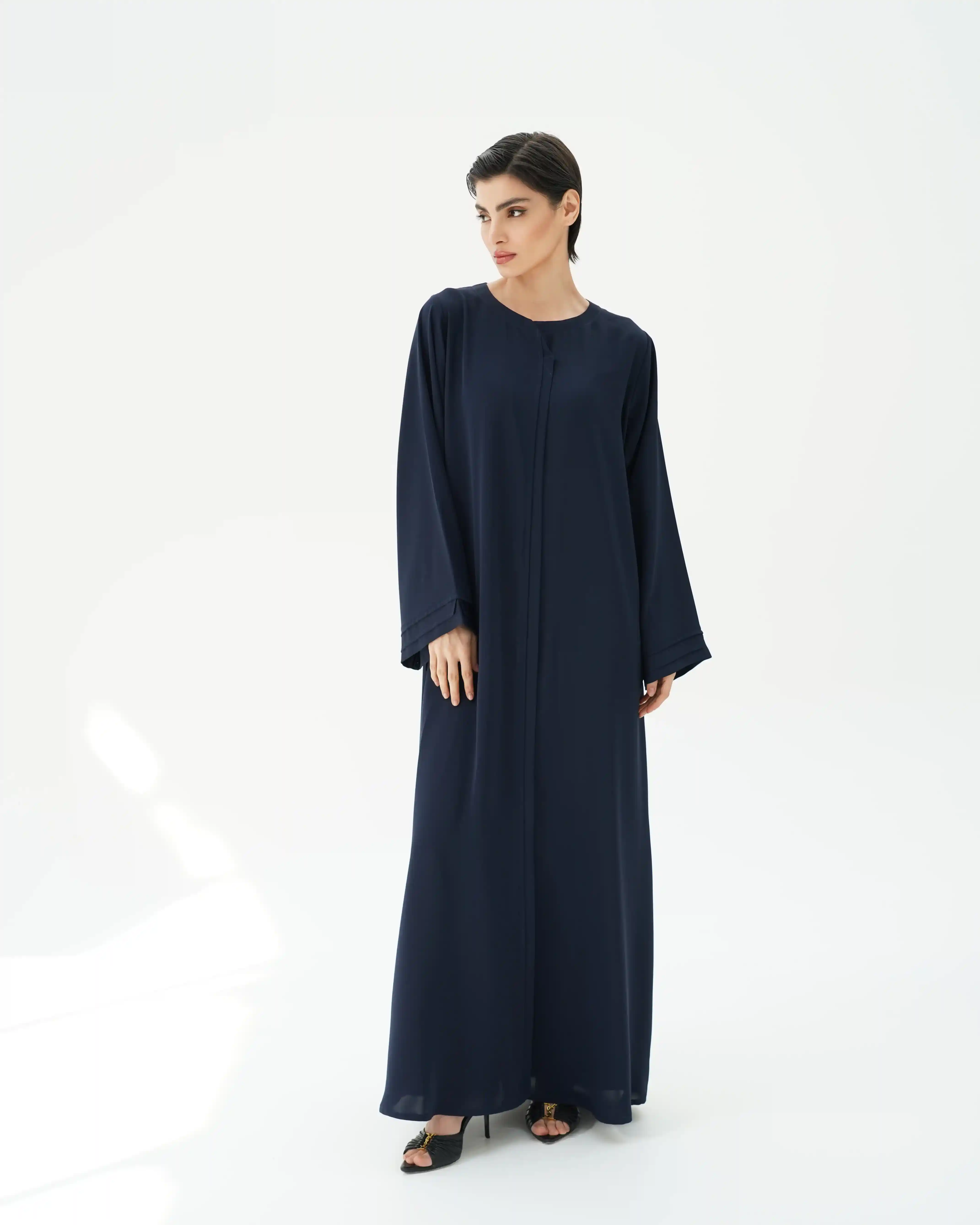 • ثنيات في منتصف العباية تمتد من الرقبة حتى أسفل التصميم لتشكّل تدرجًا بصريًا متوازنًا.