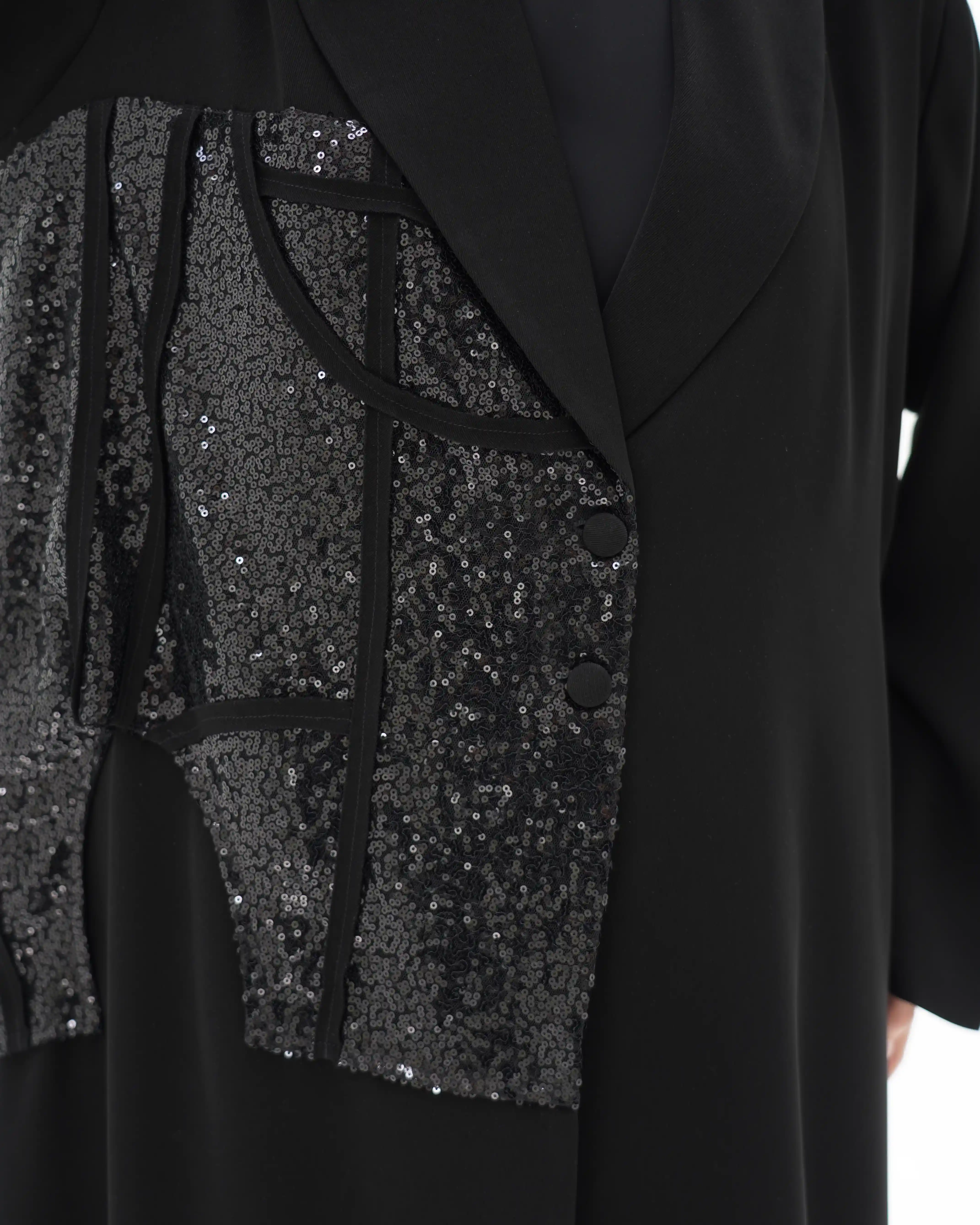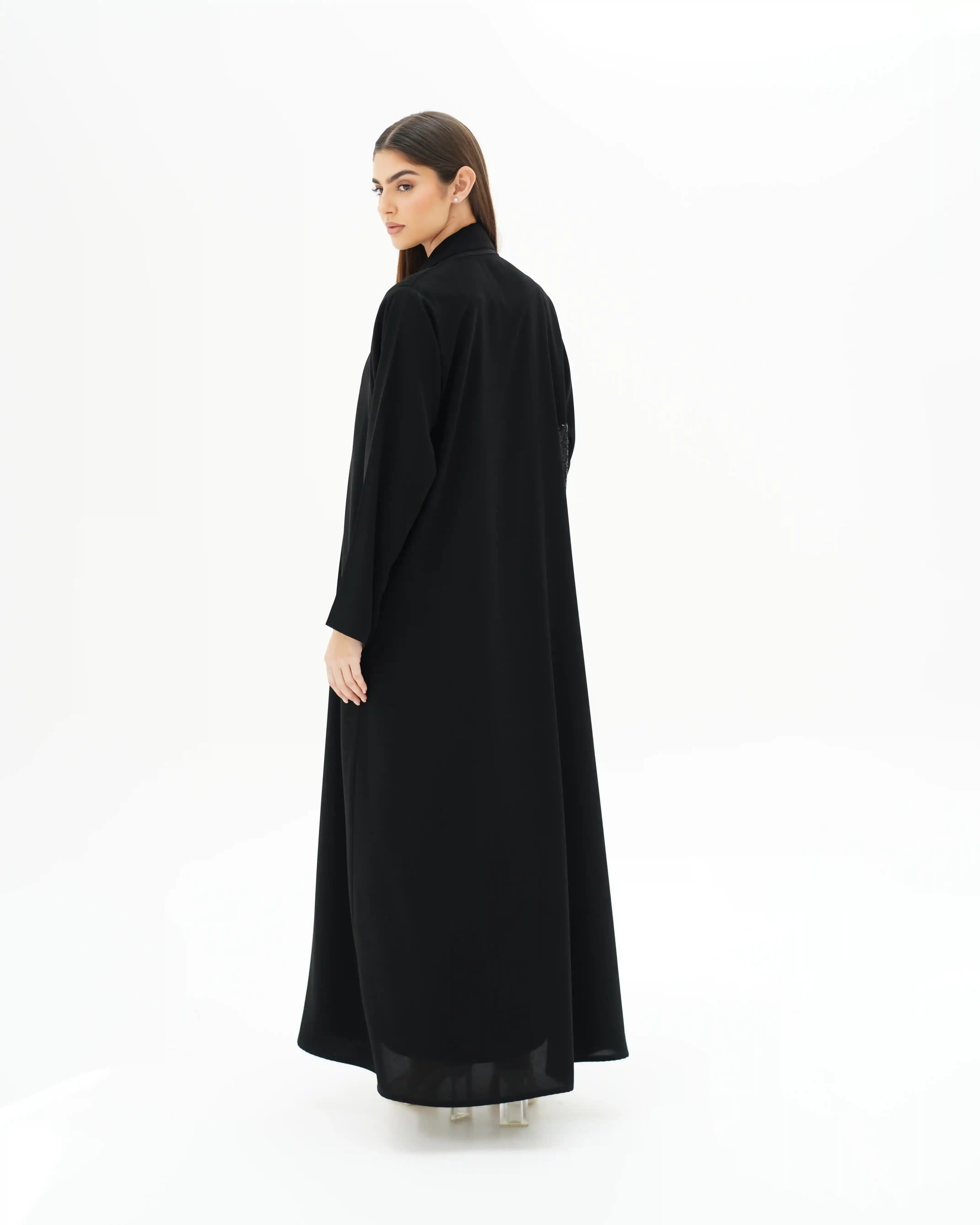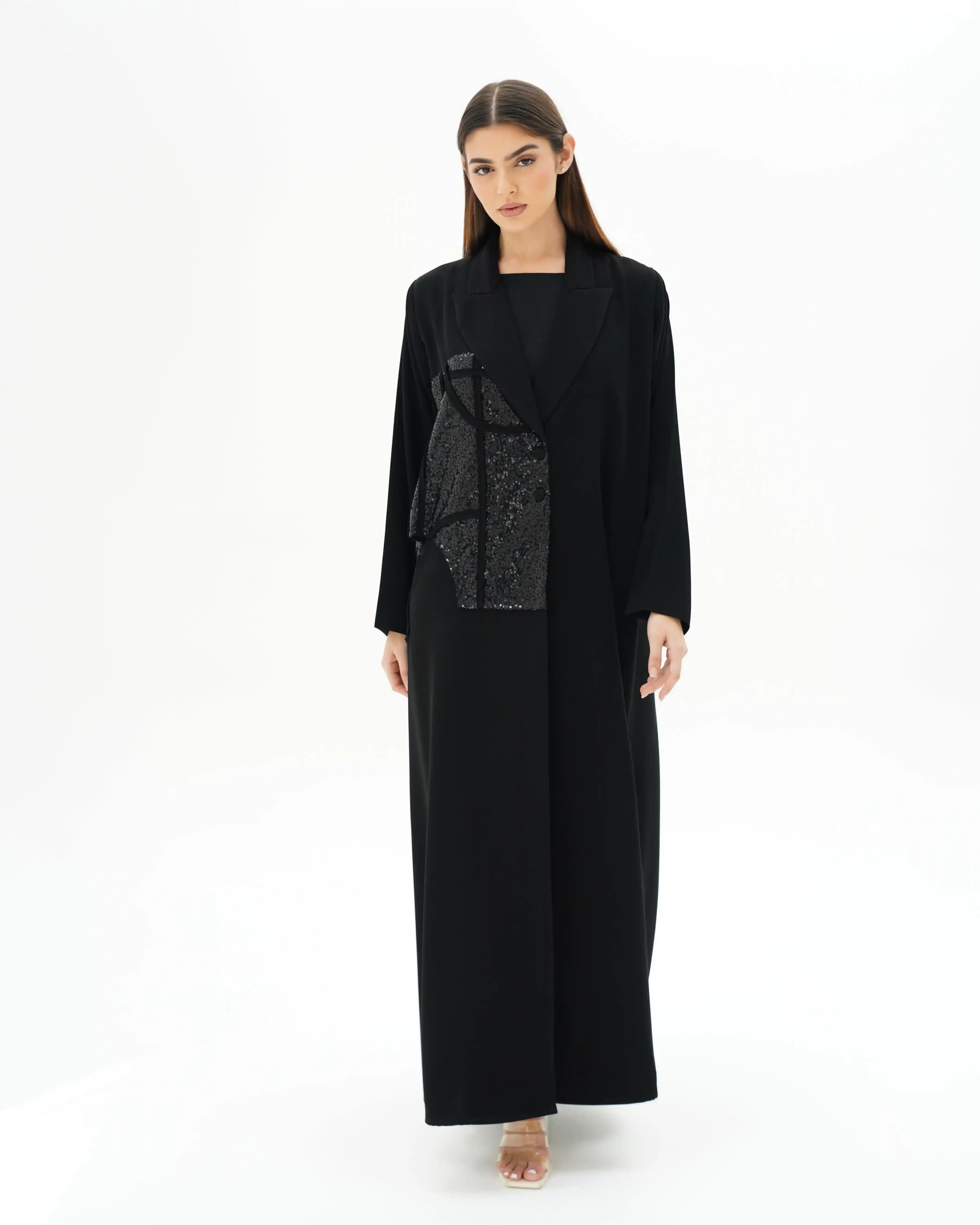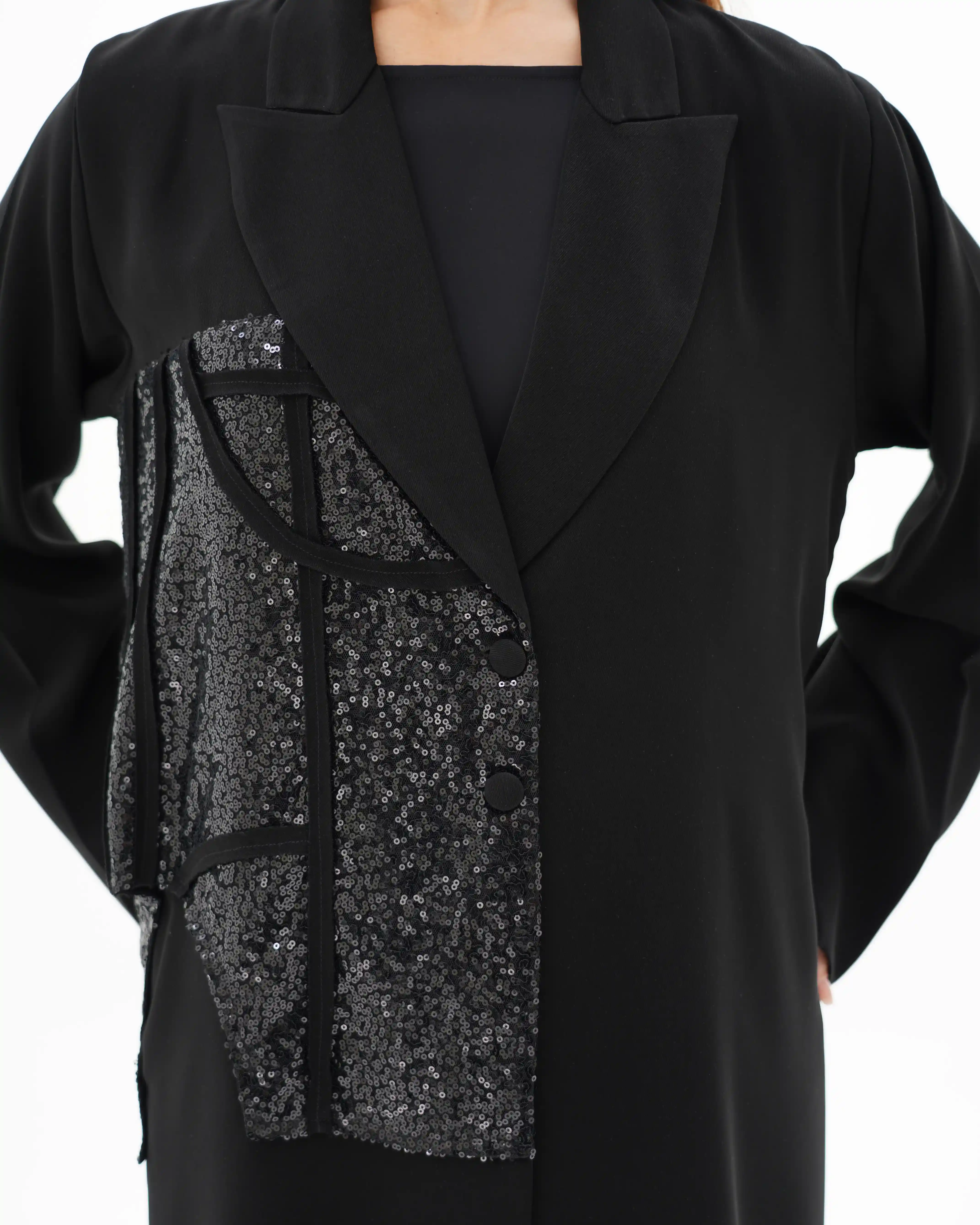 عباية بهدوء واثق وتفاصيل تفرض حضورها، بقصّة مستقيمة طويلة تنسدل بانسيابية متزنة من قماش سلكتف كريب بملمس ناعم وحركة هادئة. تأتي بياقة بليزر واضحة المعالم تمنح الإطلالة طابعًا راقيًا، بينما يبرز على الجانب الأيمن من الصدر اشتغال فني يجمع بين الشيفون الشفاف والسكوين الأسود اللامع بتكوين هندسي مدروس، يتحدد بخطوط فاصلة دقيقة تعزز التباين بين الخامات. يمتد الاشتغال بانسياب من مقدمة الصدر باتجاه الجنب الأيمن لينتهي بسلاسة عند مقدمة الظهر، ما يمنح التصميم بعدًا بصريًا مختلفًا من كل زاوية. الإغلاق أمامي مخفي بأزرار في منتصف العباية لإطلالة نظيفة ومتقنة، وتكتمل الإطلالة بطرحة سادة متناغمة تعكس فخامة هوية .KHAN&CO.