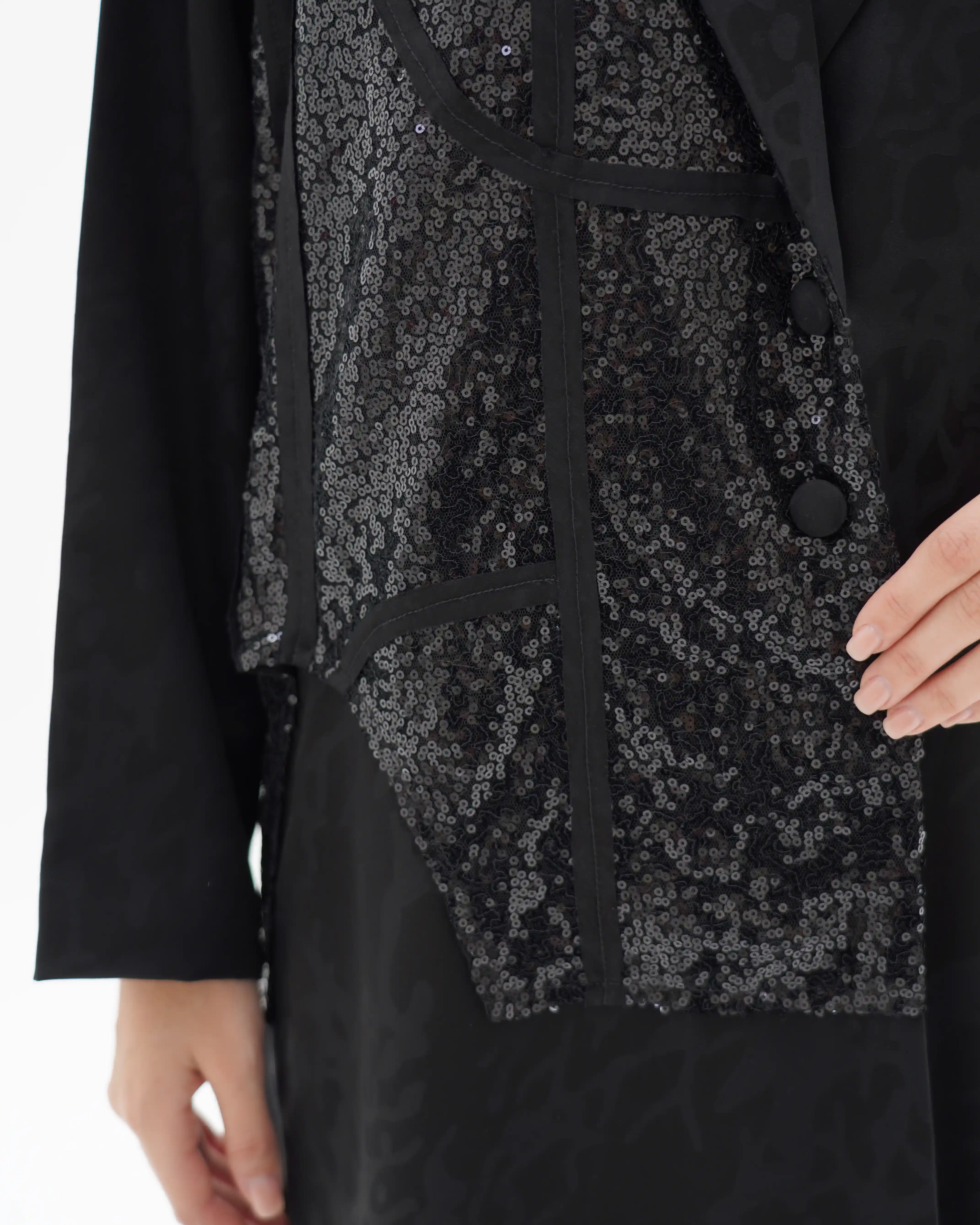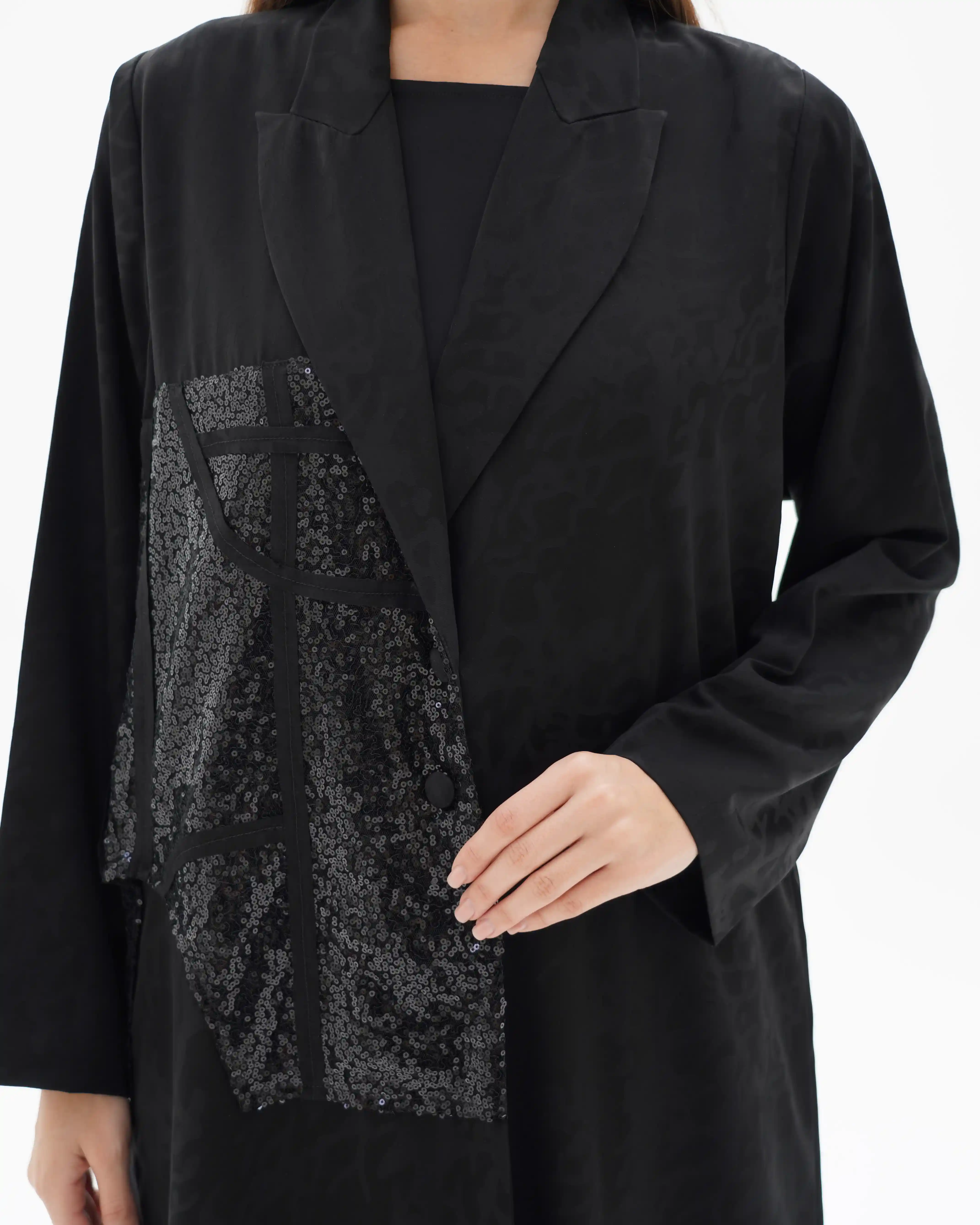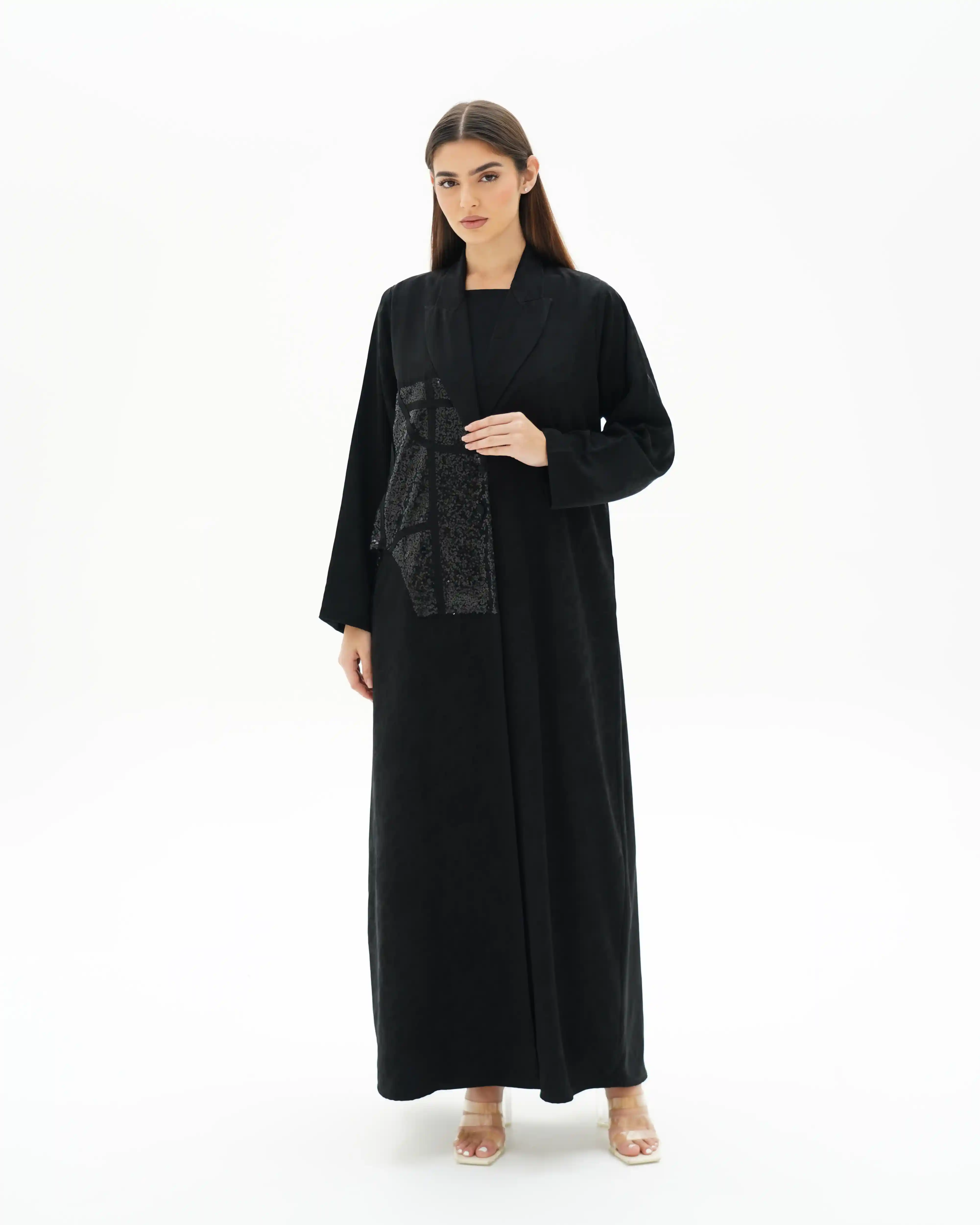 عباية بهدوء واثق وتفاصيل تفرض حضورها، بقصّة مستقيمة طويلة تنسدل بانسيابية متزنة من قماش ريتش جاكارد بملمس غني ونسيج بارز يمنح التصميم عمقًا بصريًا. تأتي بياقة بليزر واضحة المعالم تمنح الإطلالة طابعًا راقيًا، بينما يبرز على الجانب الأيمن من الصدر اشتغال فني يجمع بين الشيفون الشفاف والسكوين الأسود اللامع بتكوين هندسي مدروس، يتحدد بخطوط فاصلة دقيقة تعزز التباين بين الخامات. يمتد الاشتغال بانسياب من مقدمة الصدر باتجاه الجنب الأيمن لينتهي بسلاسة عند مقدمة الظهر، ما يمنح التصميم بعدًا بصريًا مختلفًا من كل زاوية. الإغلاق أمامي مخفي بأزرار في منتصف العباية لإطلالة نظيفة ومتقنة، وتكتمل الإطلالة بطرحة سادة متناغمة تعكس فخامة هوية .KHAN&CO.