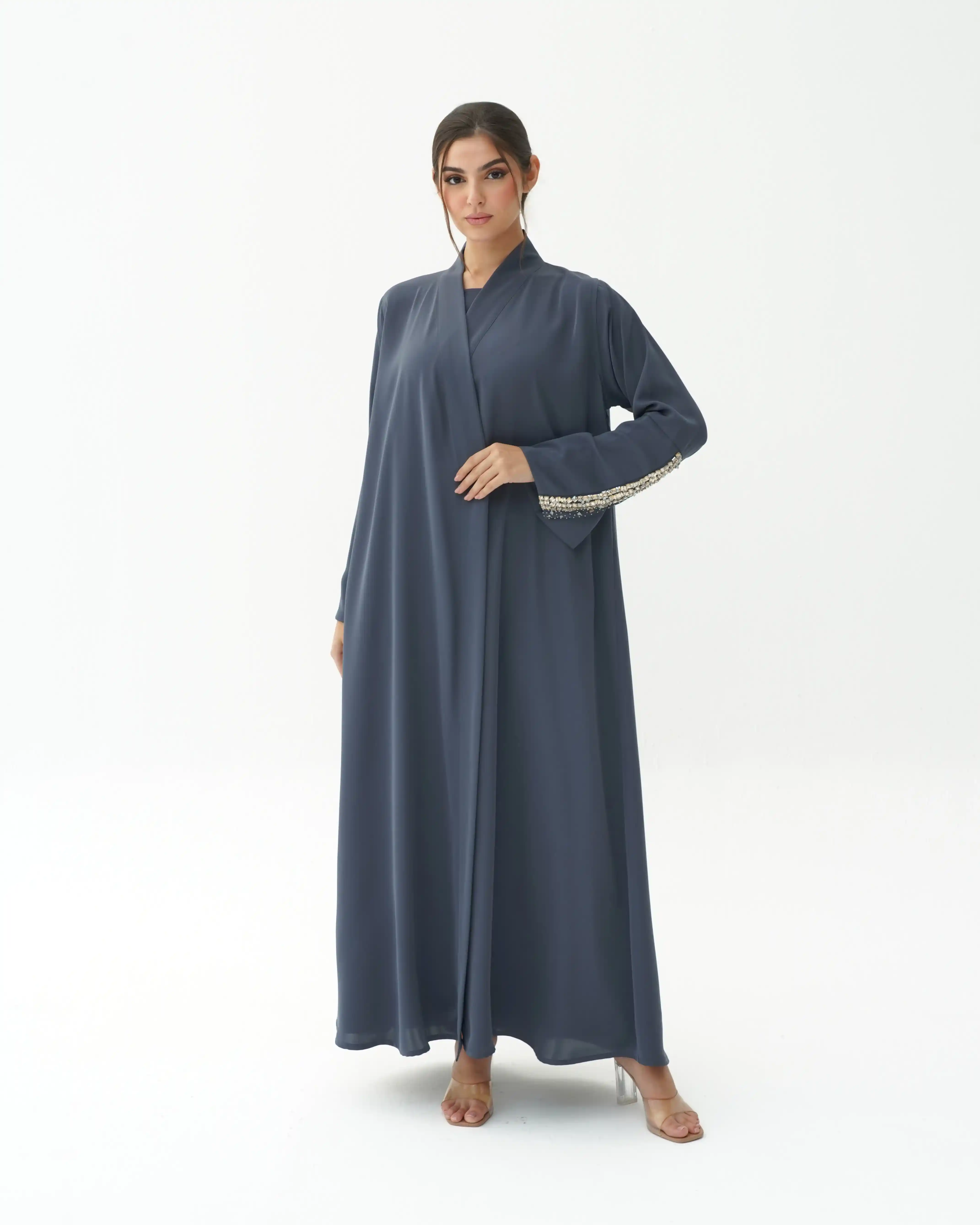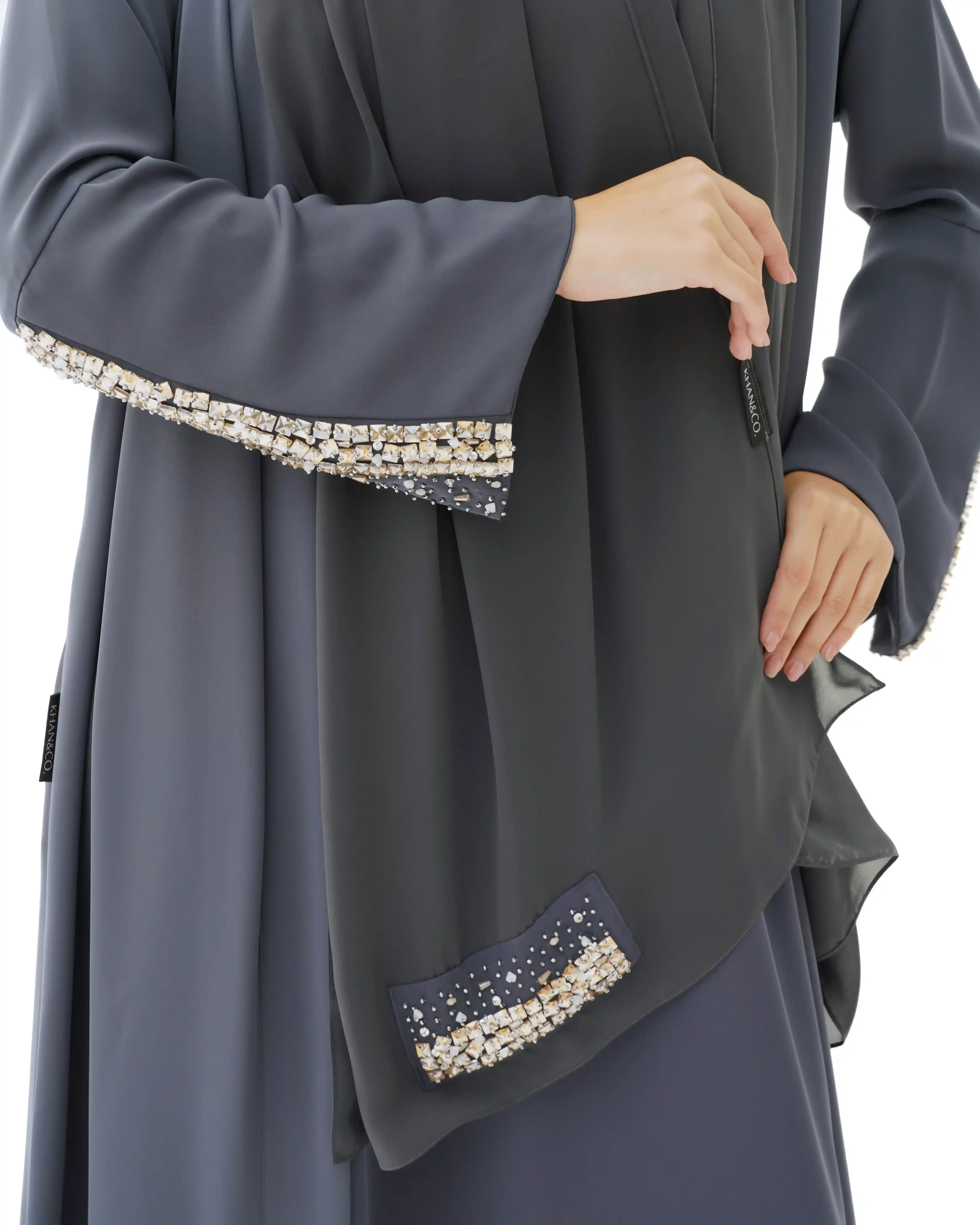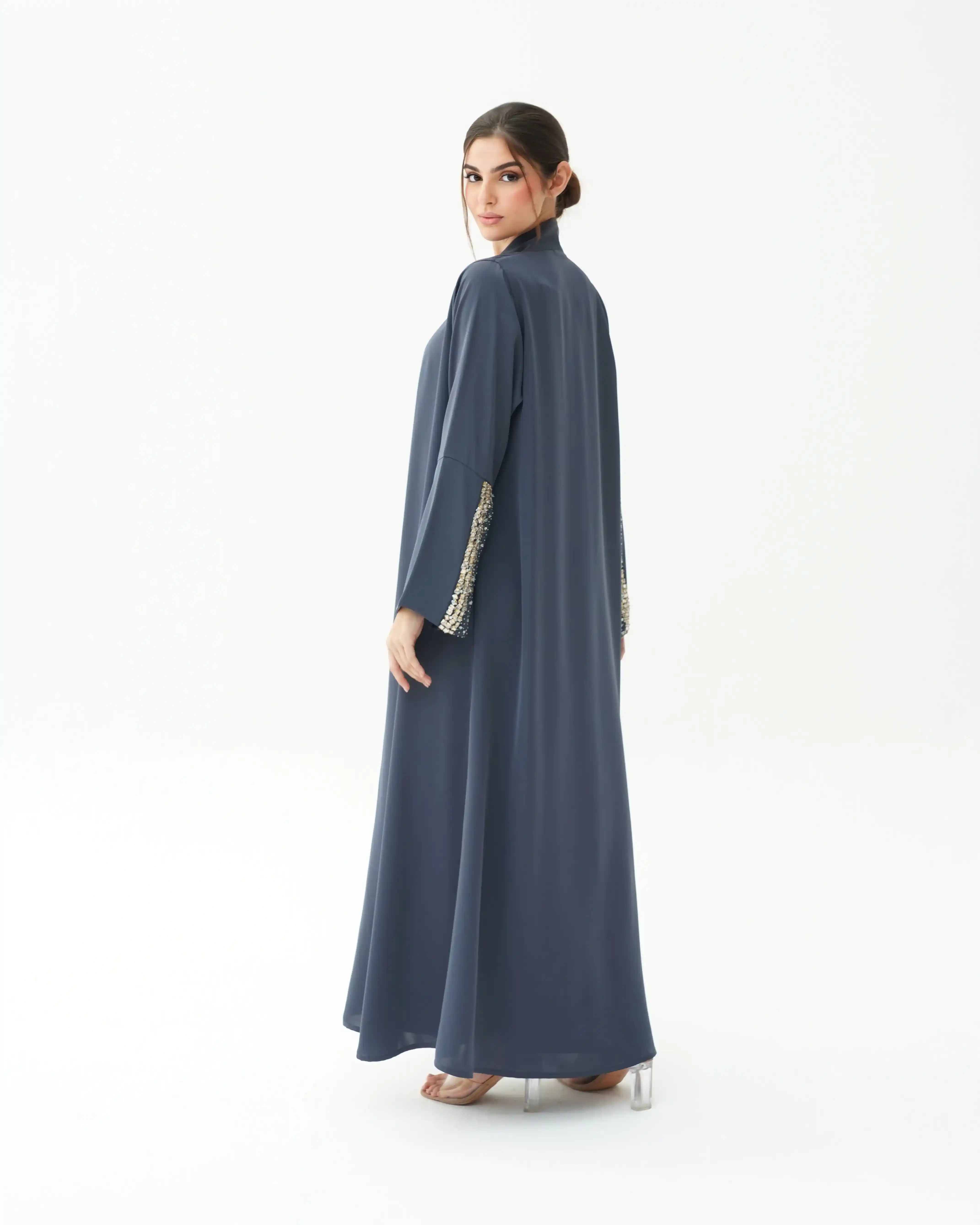 اطلالة انيقة بدون عناء لوجود قطعة فستان داخلي معها، فهذه العباية بالقصة اللف المبتكرة تأتي بنمط متداخل على شكل حرف x تلتف من خلف الرقبة بشريط ياقة الى اخر ذيل العباية وتزدان الاكمام بكريستال بلون الذهبي مشتغلة يدويا ومدموجدة مع خرز لتضفي لمسة اهتمامنا بالتفاصيل الدقيقة التي من خلالها اكتسبت العلامة شهرتها الواسعة في المملكة العربية السعودية كما تتميز العباية بقماش خفيف الوزن منسدل يضفي الانسيابية المطلوبة للتصميم. ويمكن ارتداؤها مفتوحة مع الفستان الداخلي او بطريقة اللف.