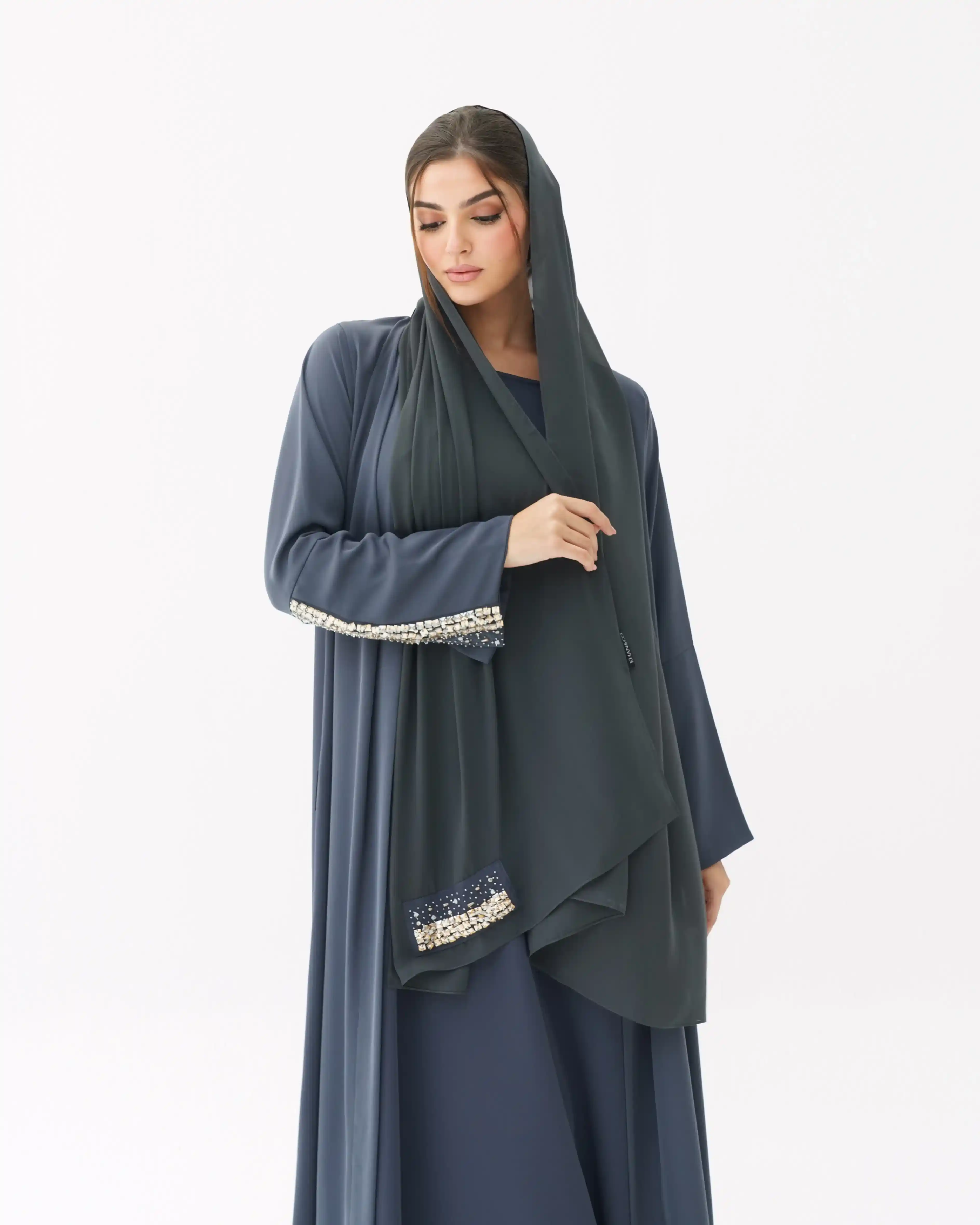 • طرحة مع العباية مطرزة بالكريستال والخزر بطرف الطرحة.
