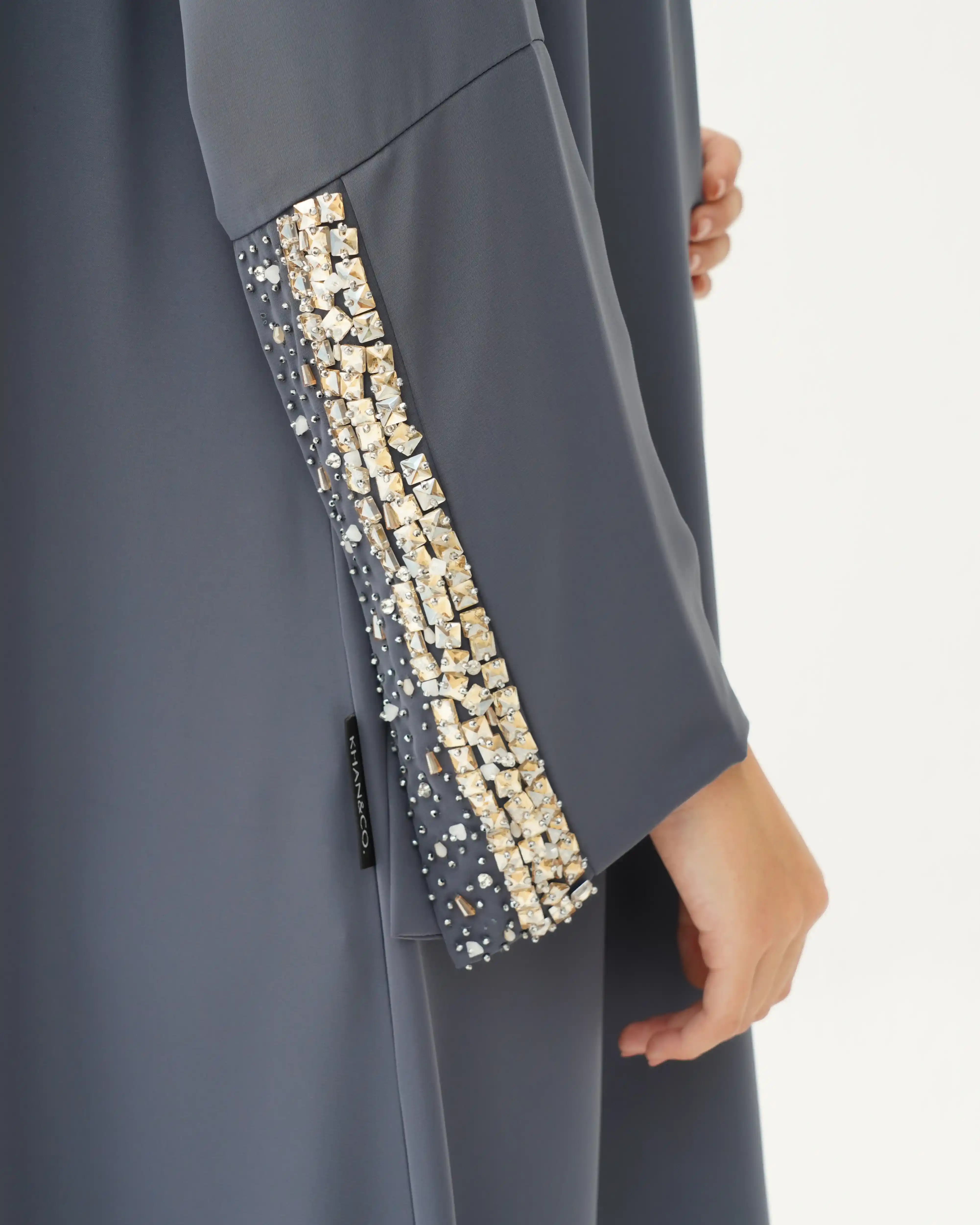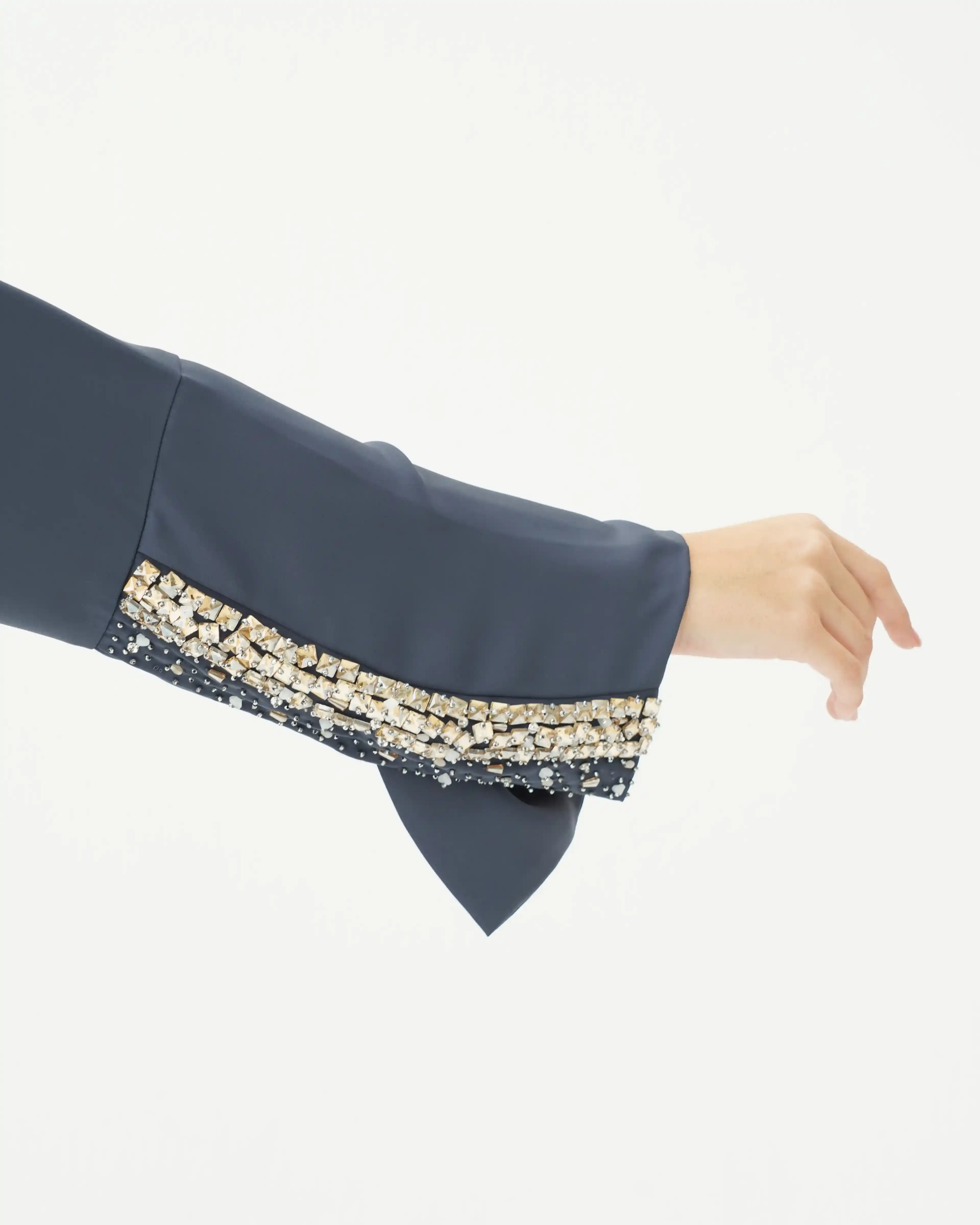 • تطريز بالكريستال بلون الذهبي مدموج بالخرز بشكل يبدأ مصفوف ويتناثر تدريجيا في طرف الكم.