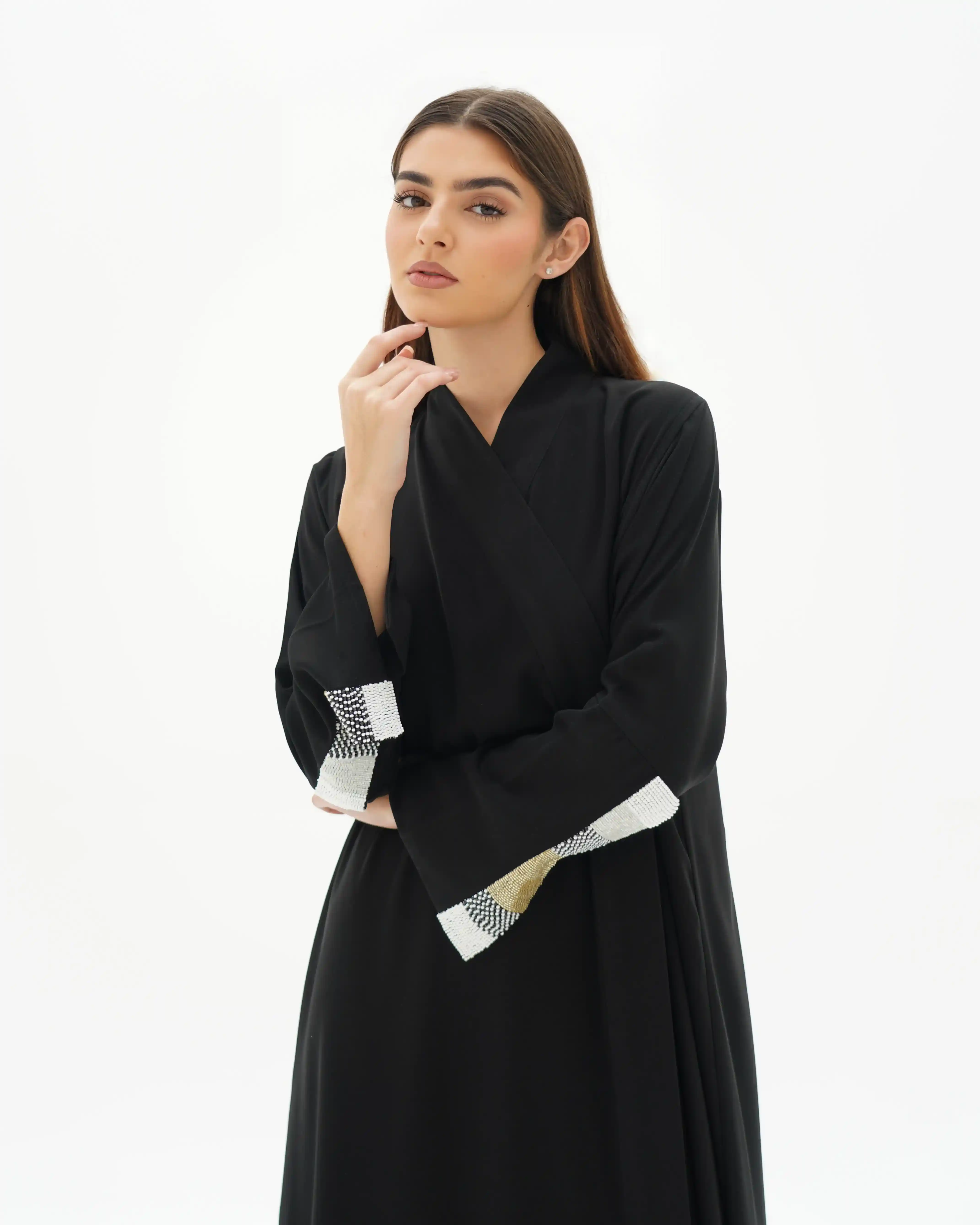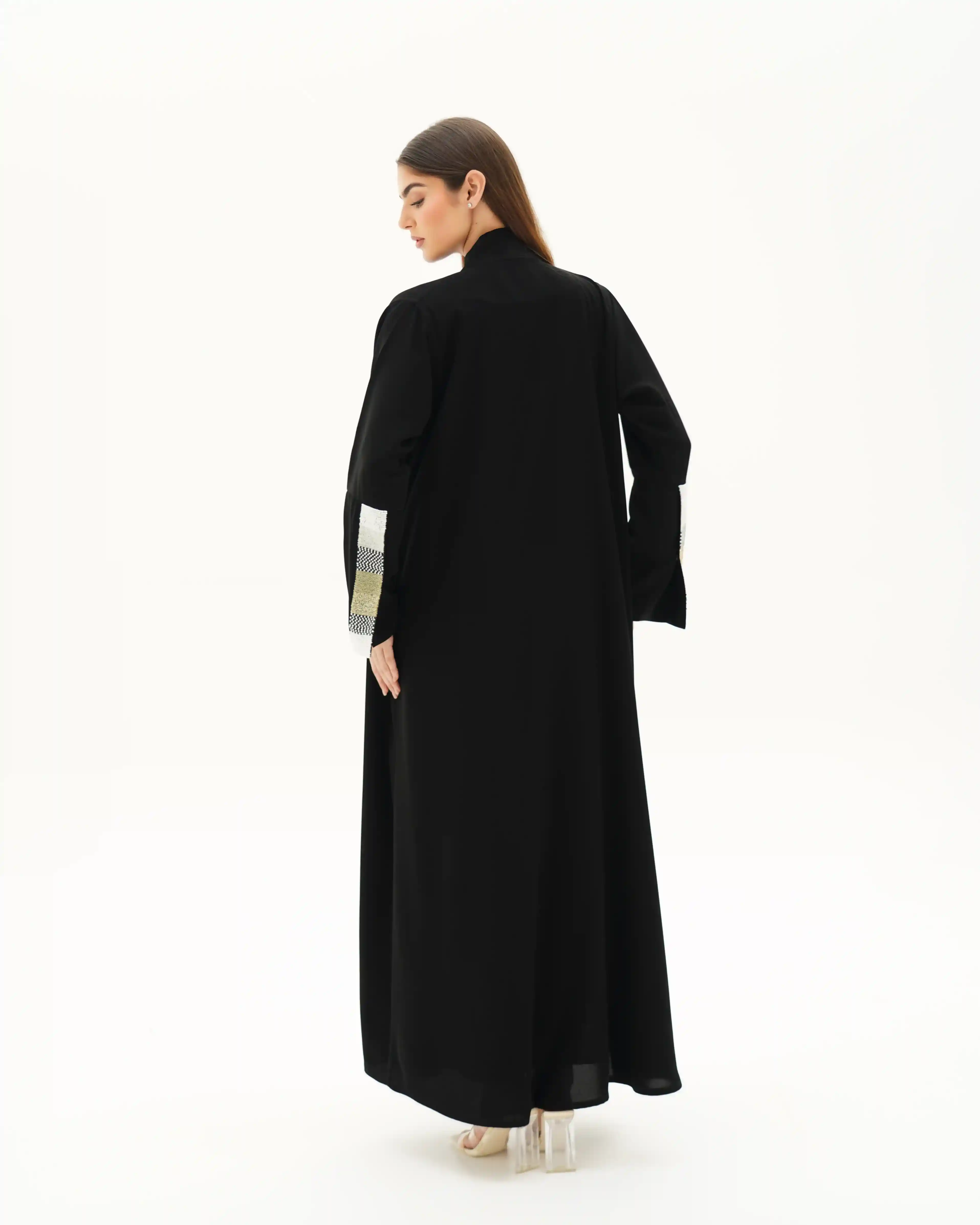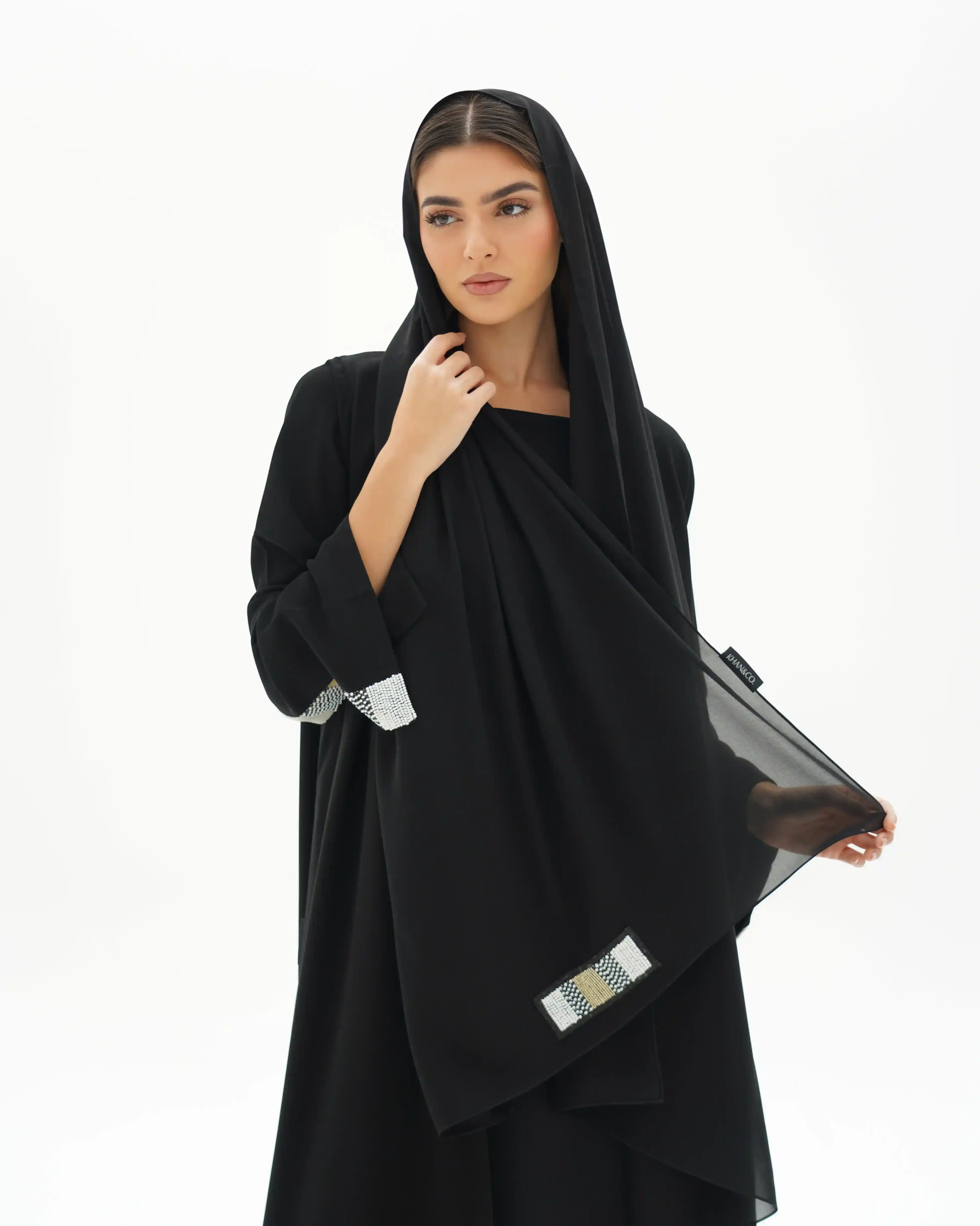 عباية بقصّة لف مبتكرة تنساب بنمط متداخل يلتف حول القوام بأسلوب كروازية أنيق، تبدأ من أعلى الياقة وتمتد بانسيابية حتى أسفل الذيل، مانحةً حضورًا راقيًا وحركة متوازنة. من قماش سلكتف كريب خفيف الوزن بانسدال ناعم. تتزين أطراف الأكمام باشتغال يدوي دقيق من السكوين بدرجات الأسود والذهبي والفضي، مدموج مع كريستال وخرز بتوزيع متقن يمنح بريقًا محسوبًا يعكس هوية .KHAN&CO في العناية بالتفاصيل. تكتمل الإطلالة بطرحة مشتغلة بنفس تناغم الأكمام لتوحّد المشهد بأسلوب متكامل.