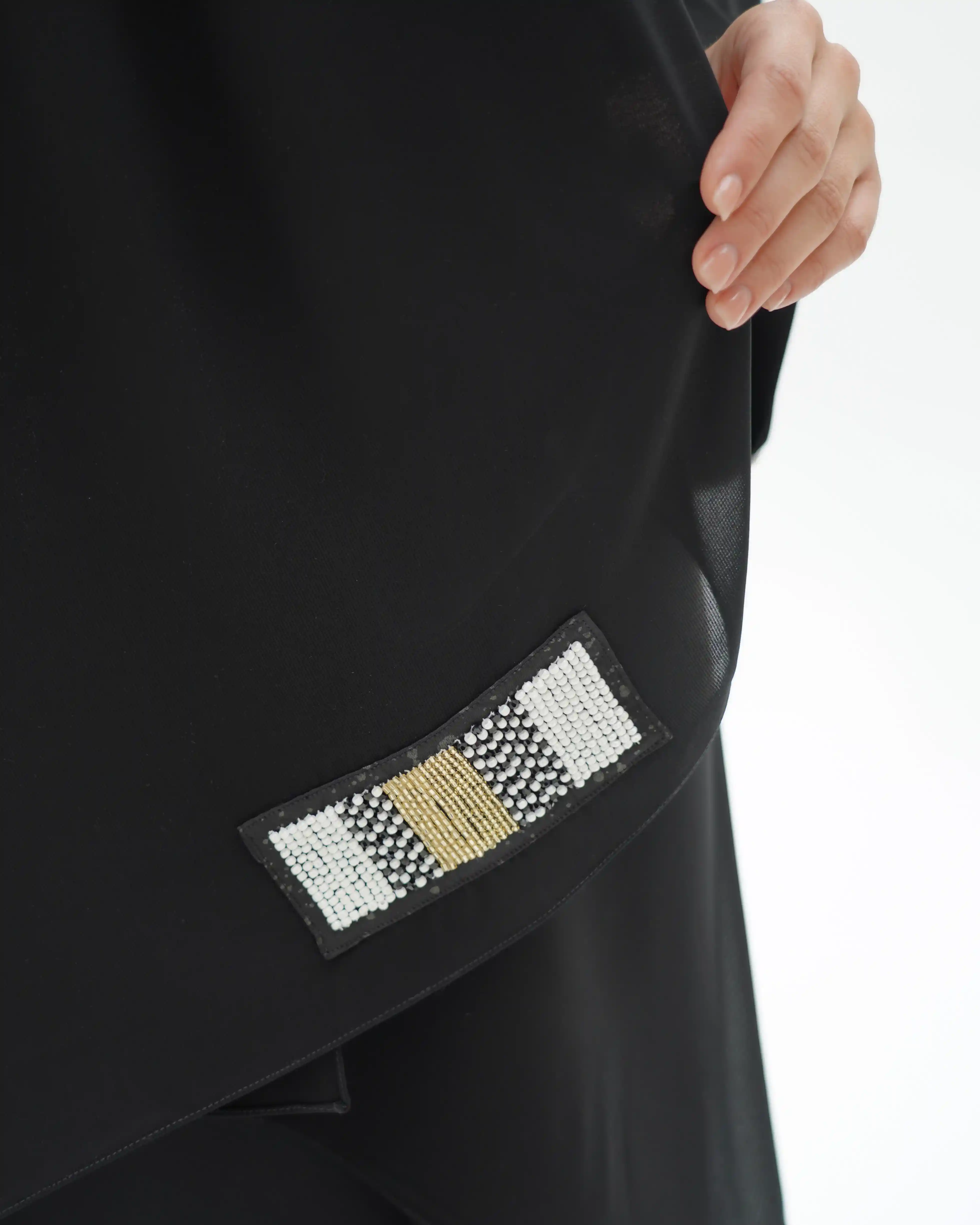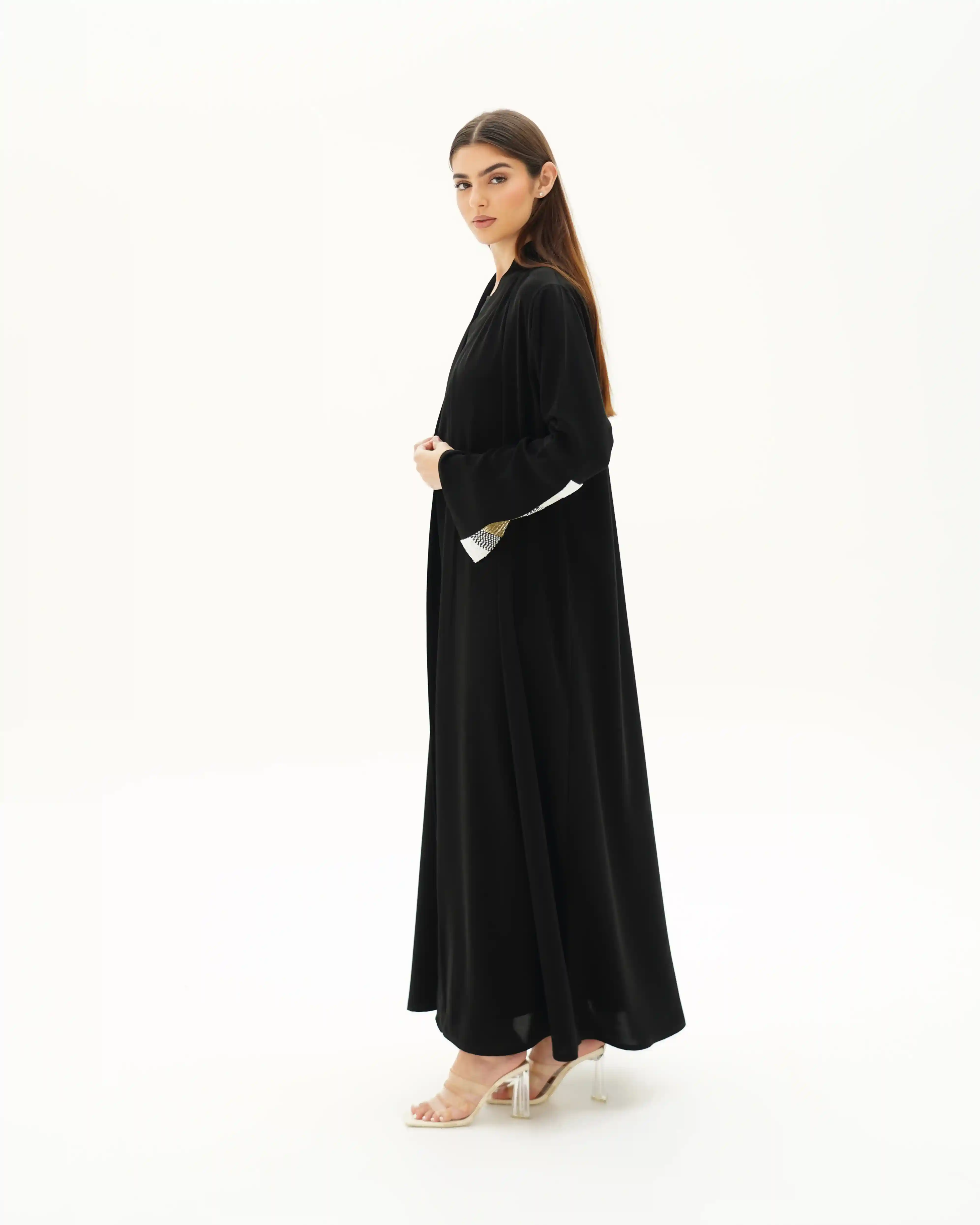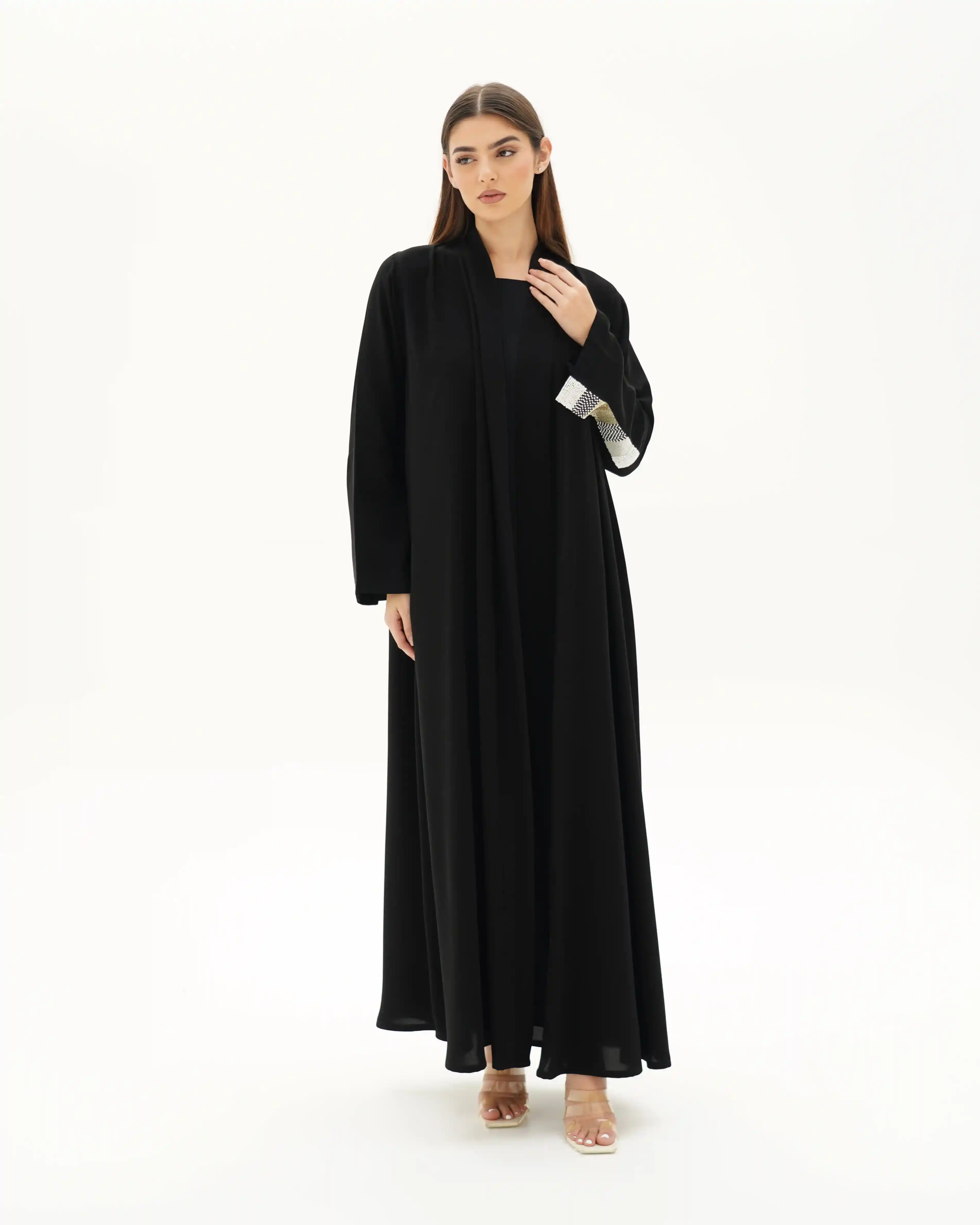 عباية بقصّة لف مبتكرة تنساب بنمط متداخل يلتف حول القوام بأسلوب كروازية أنيق، تبدأ من أعلى الياقة وتمتد بانسيابية حتى أسفل الذيل، مانحةً حضورًا راقيًا وحركة متوازنة. من قماش سلكتف كريب خفيف الوزن بانسدال ناعم. تتزين أطراف الأكمام باشتغال يدوي دقيق من السكوين بدرجات الأسود والذهبي والفضي، مدموج مع كريستال وخرز بتوزيع متقن يمنح بريقًا محسوبًا يعكس هوية .KHAN&CO في العناية بالتفاصيل. تكتمل الإطلالة بطرحة مشتغلة بنفس تناغم الأكمام لتوحّد المشهد بأسلوب متكامل.