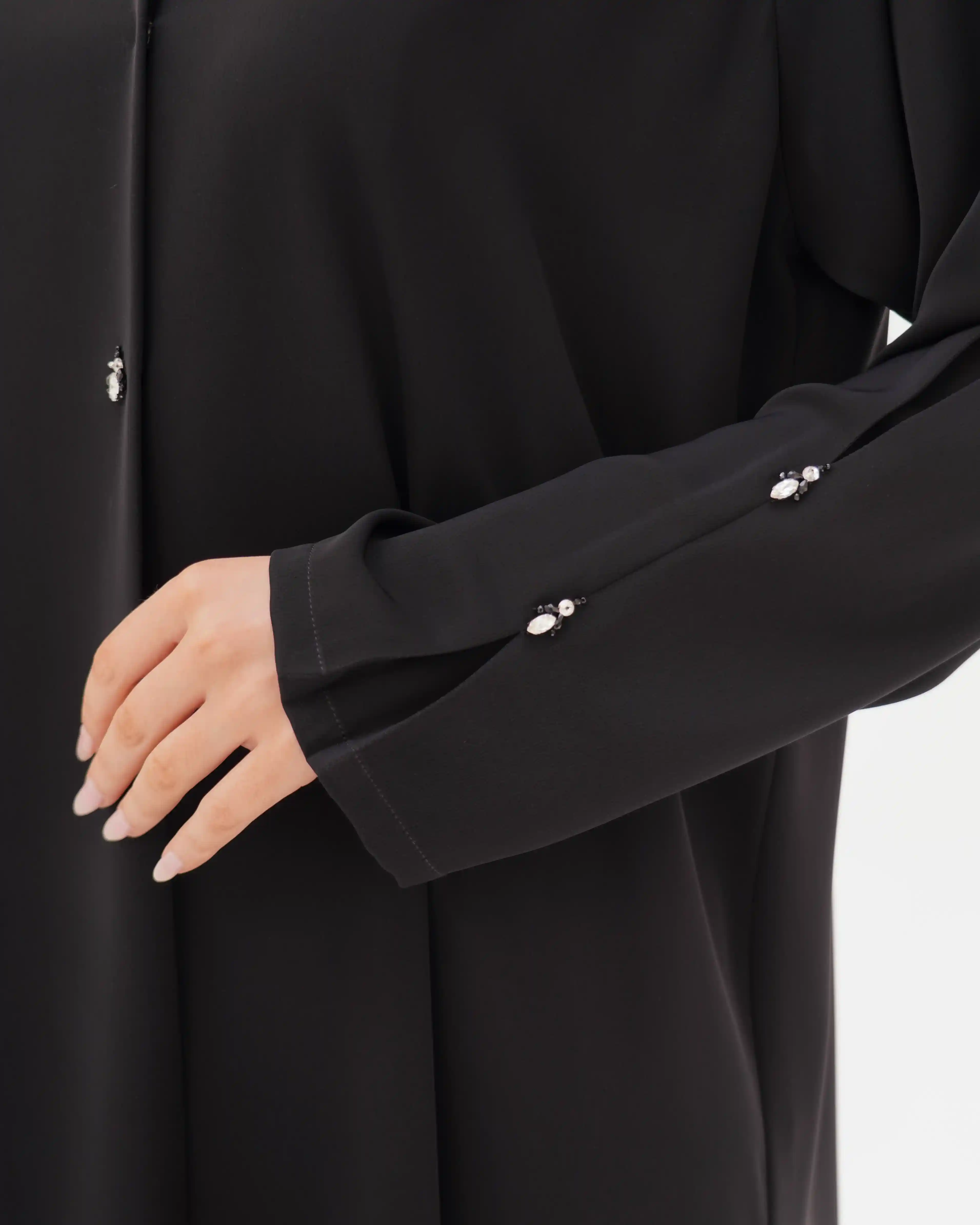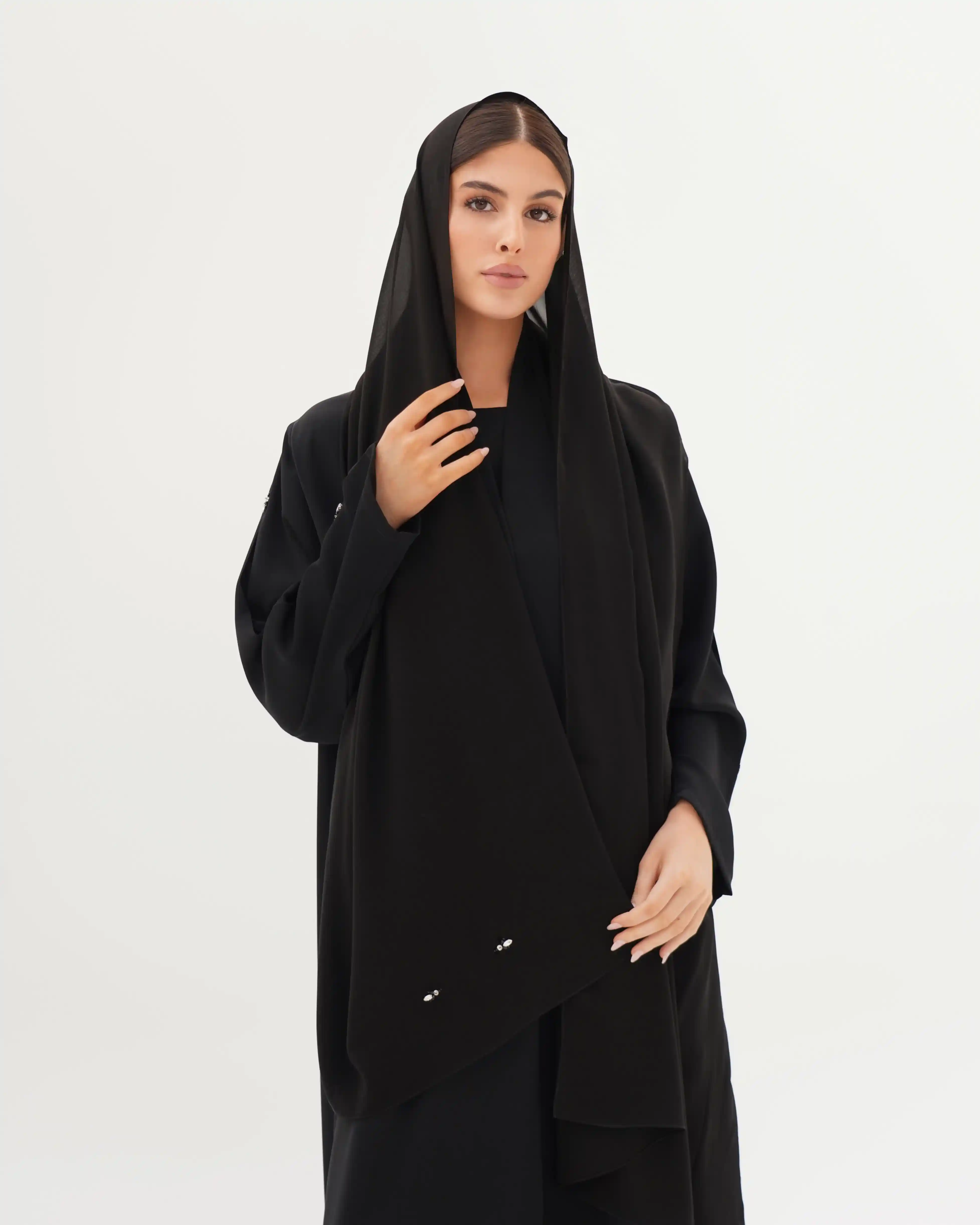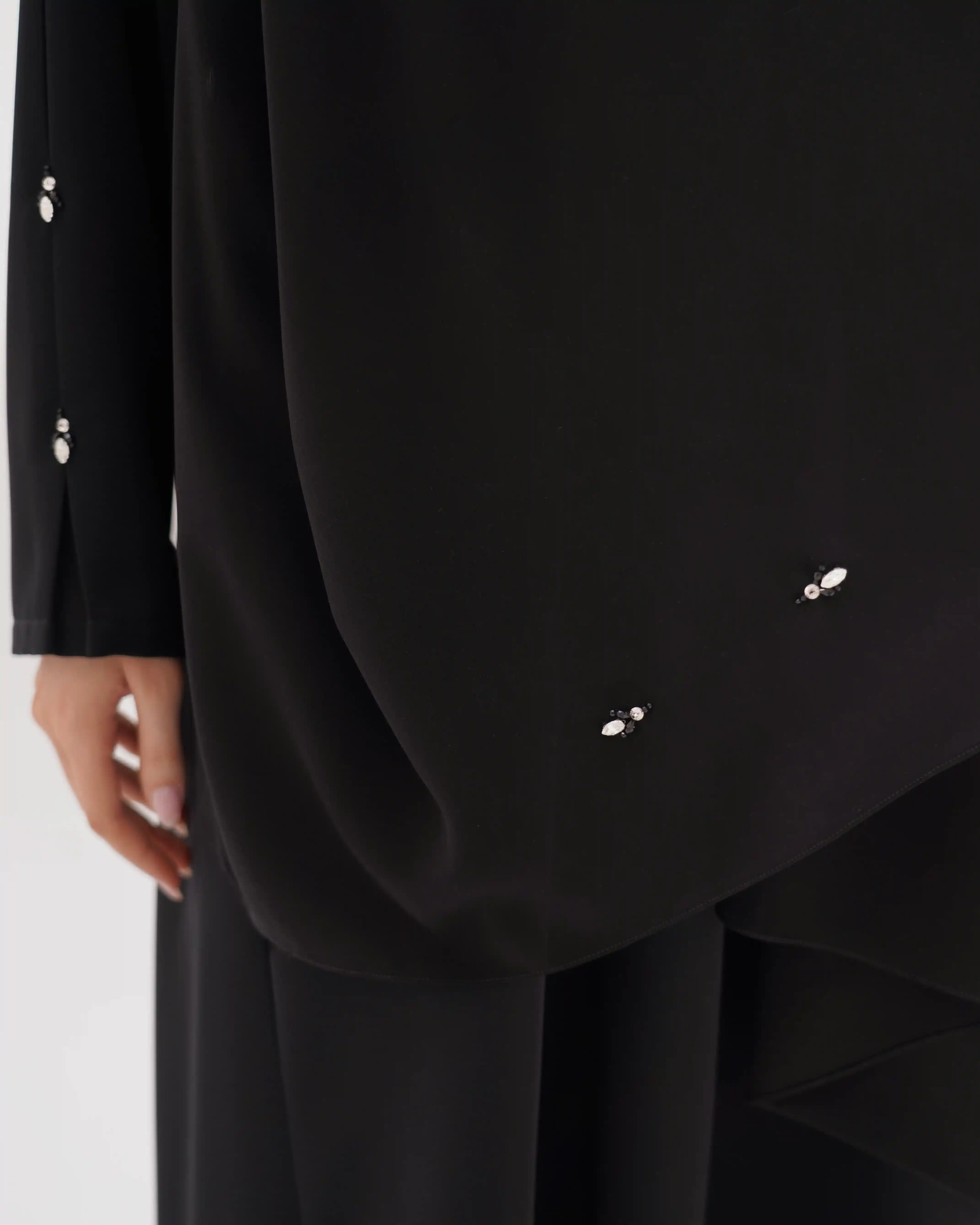 عباية تعكس الفخامة الهادئة بقصّة مستقيمة تنسدل بانسيابية نقية من الكتفين حتى الذيل، مع إغلاق مخفي يحافظ على صفاء الخطوط. صُنعت من قماش البريميوم كريب بملمس ناعم وانسدال خفيف، ومزيّنة بحبات حجر ماركيز مستوحاة من شكل النحلة، موزعة بتوازن مدروس على الأكمام ذات الثنية الناعمة في منتصف الكم، وعلى الصدر والطرحة, لتكتمل معها الإطلالة بتناغم وأناقة هادئة.