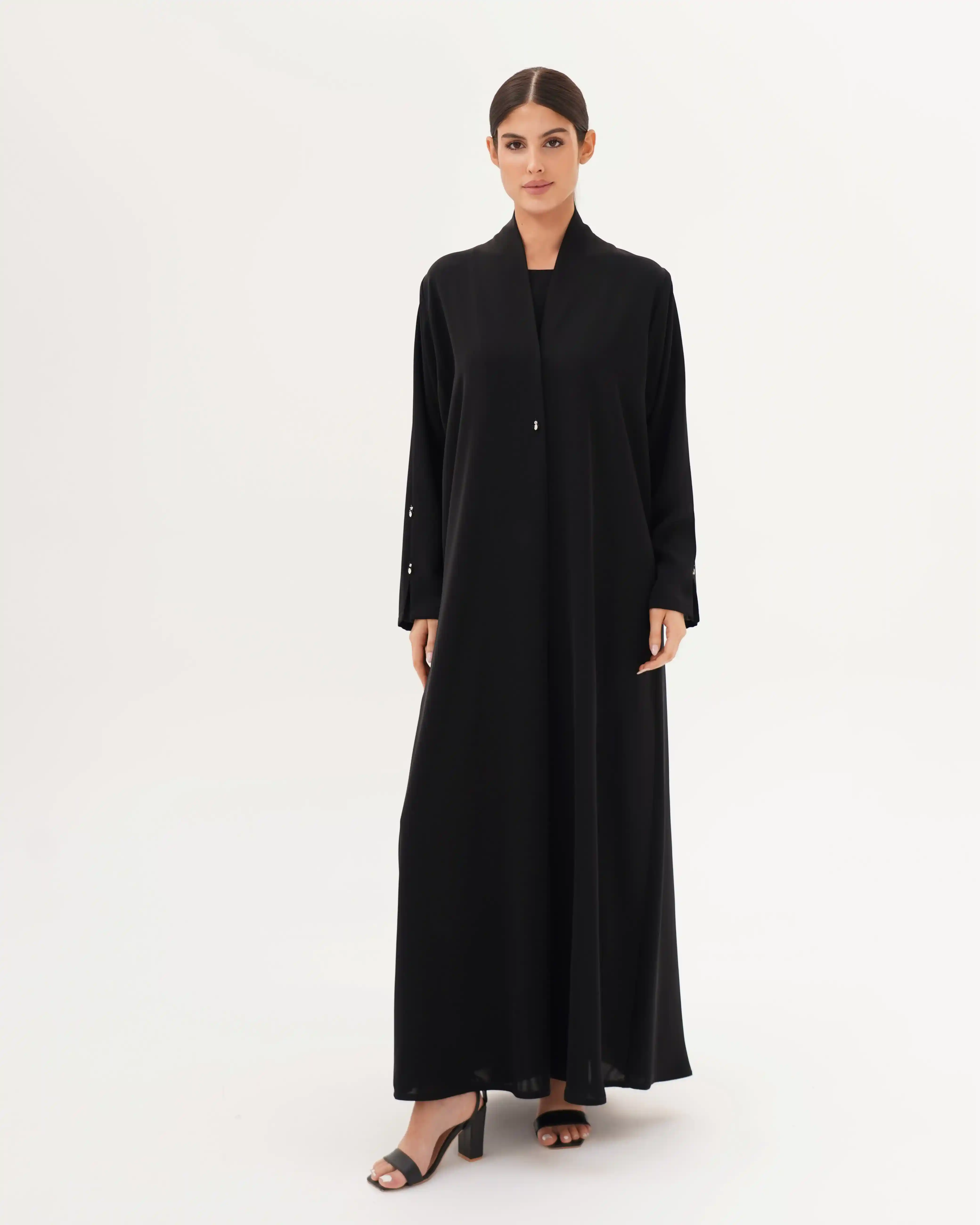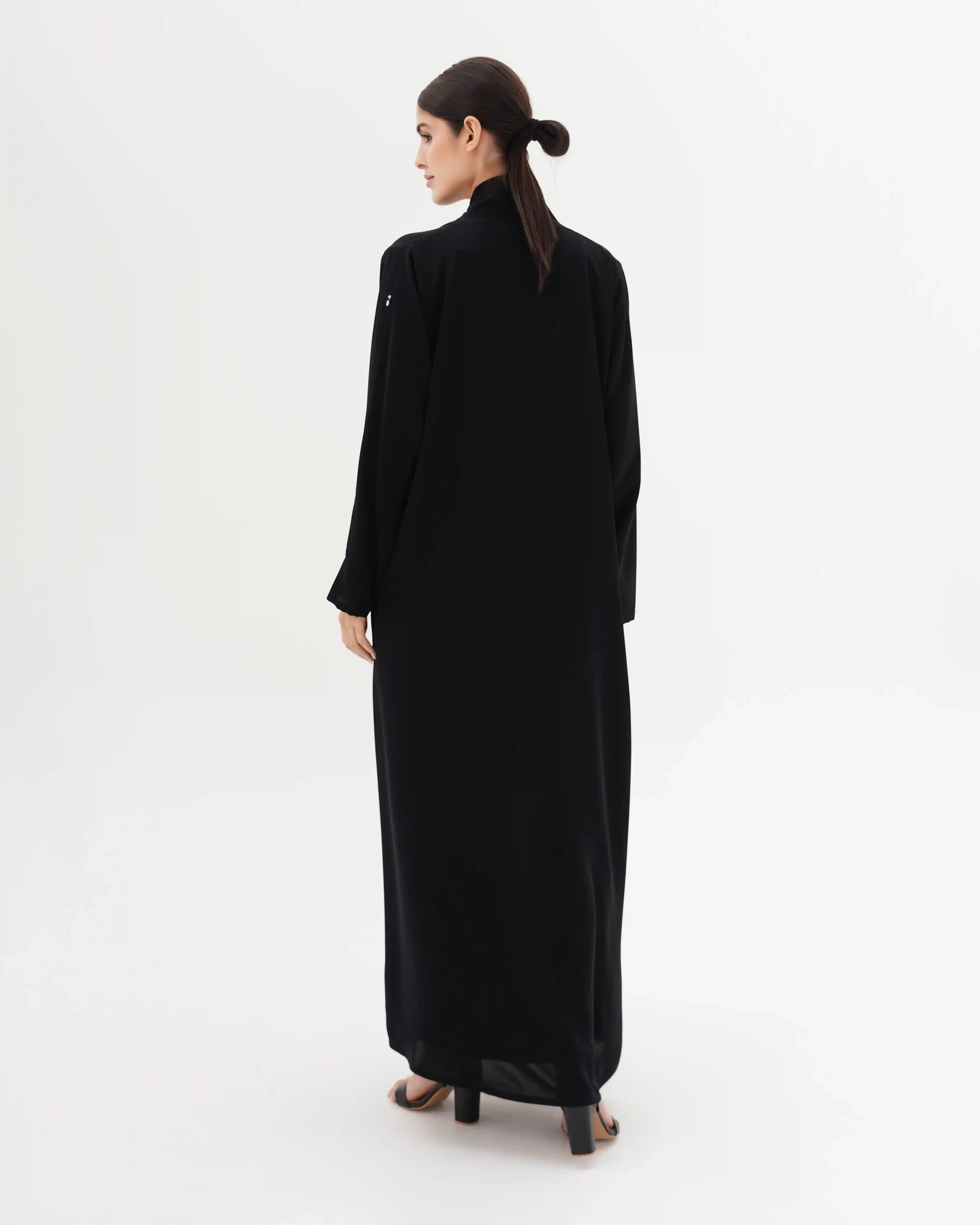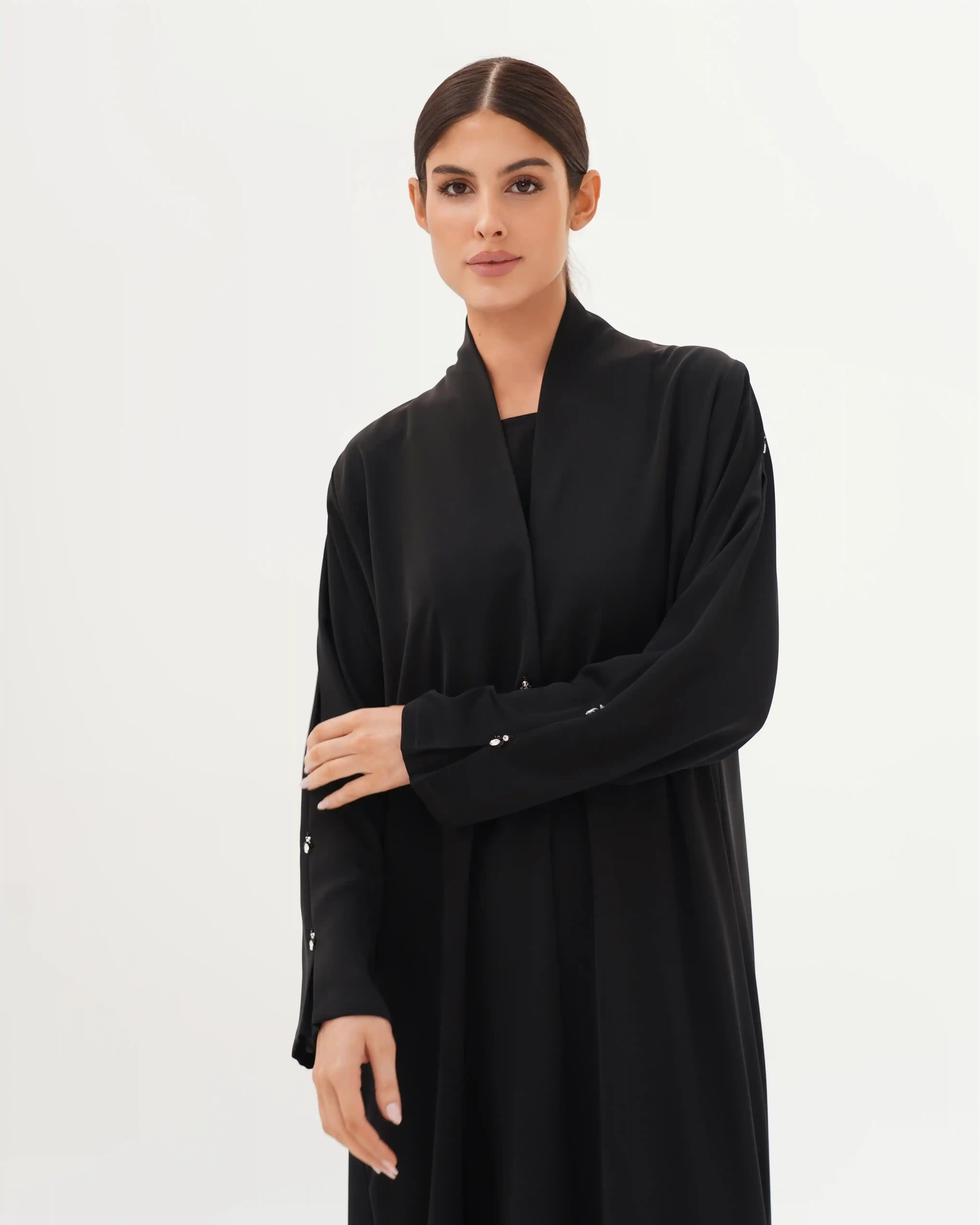 عباية تعكس الفخامة الهادئة بقصّة مستقيمة تنسدل بانسيابية نقية من الكتفين حتى الذيل، مع إغلاق مخفي يحافظ على صفاء الخطوط. صُنعت من قماش البريميوم كريب بملمس ناعم وانسدال خفيف، ومزيّنة بحبات حجر ماركيز مستوحاة من شكل النحلة، موزعة بتوازن مدروس على الأكمام ذات الثنية الناعمة في منتصف الكم، وعلى الصدر والطرحة, لتكتمل معها الإطلالة بتناغم وأناقة هادئة.