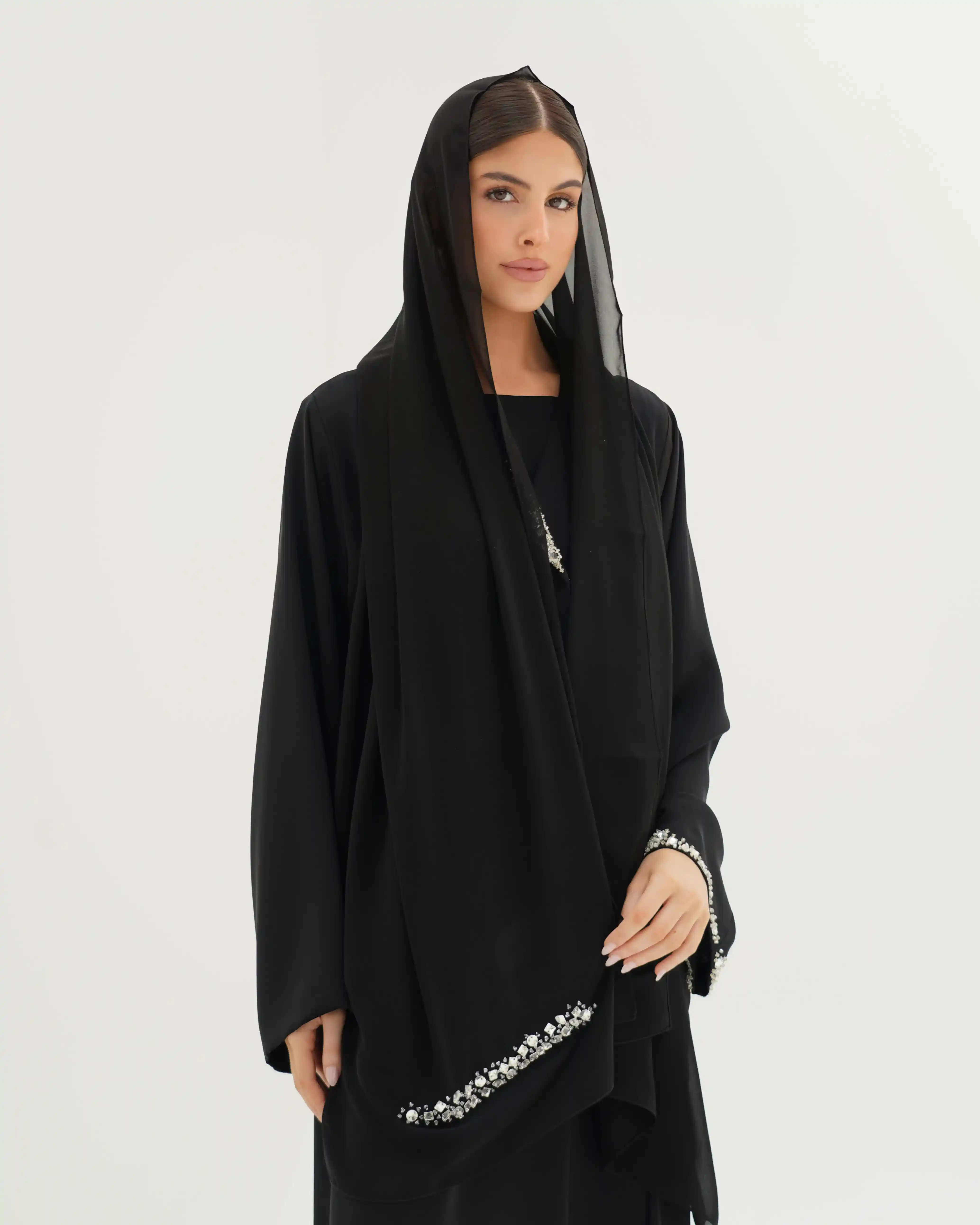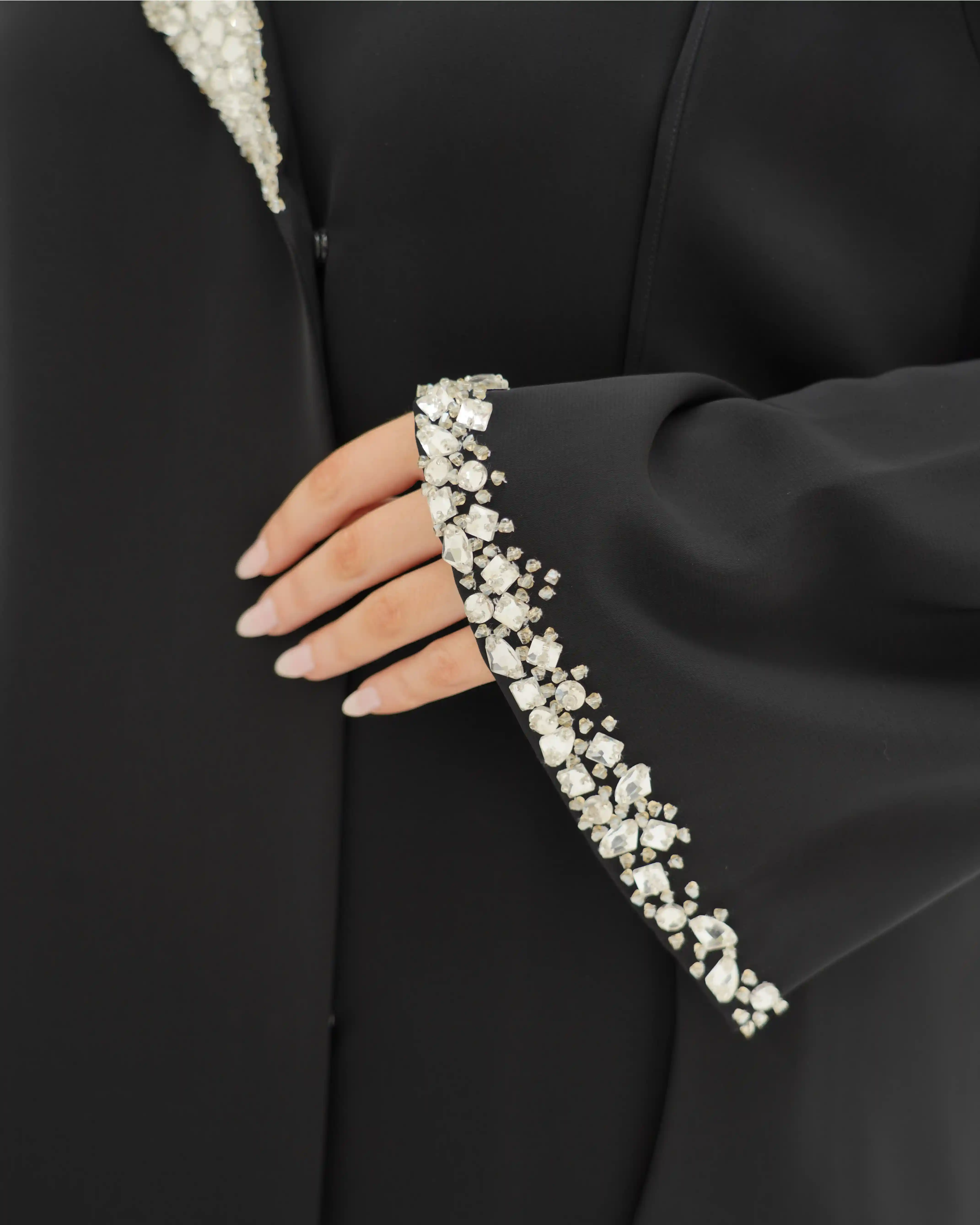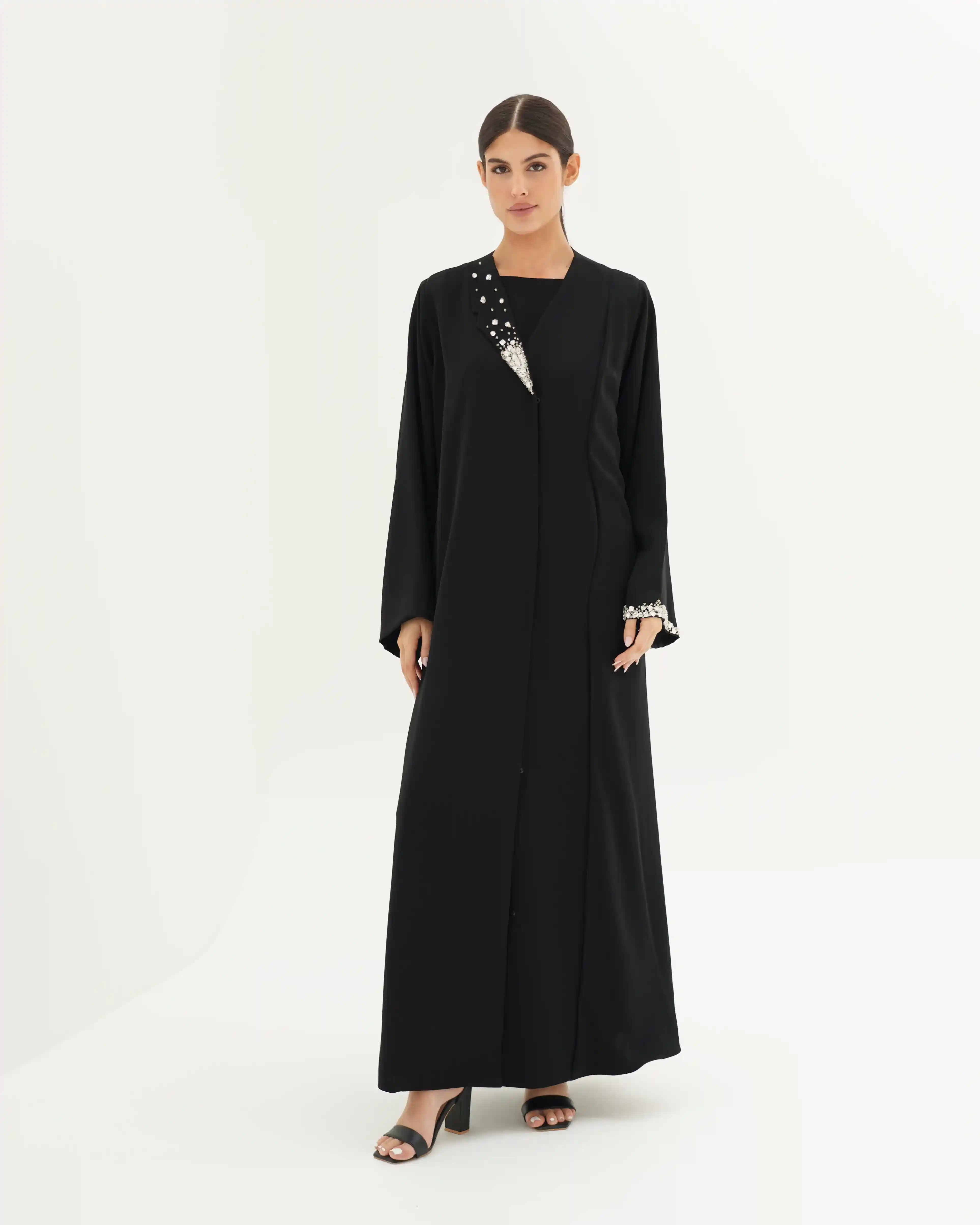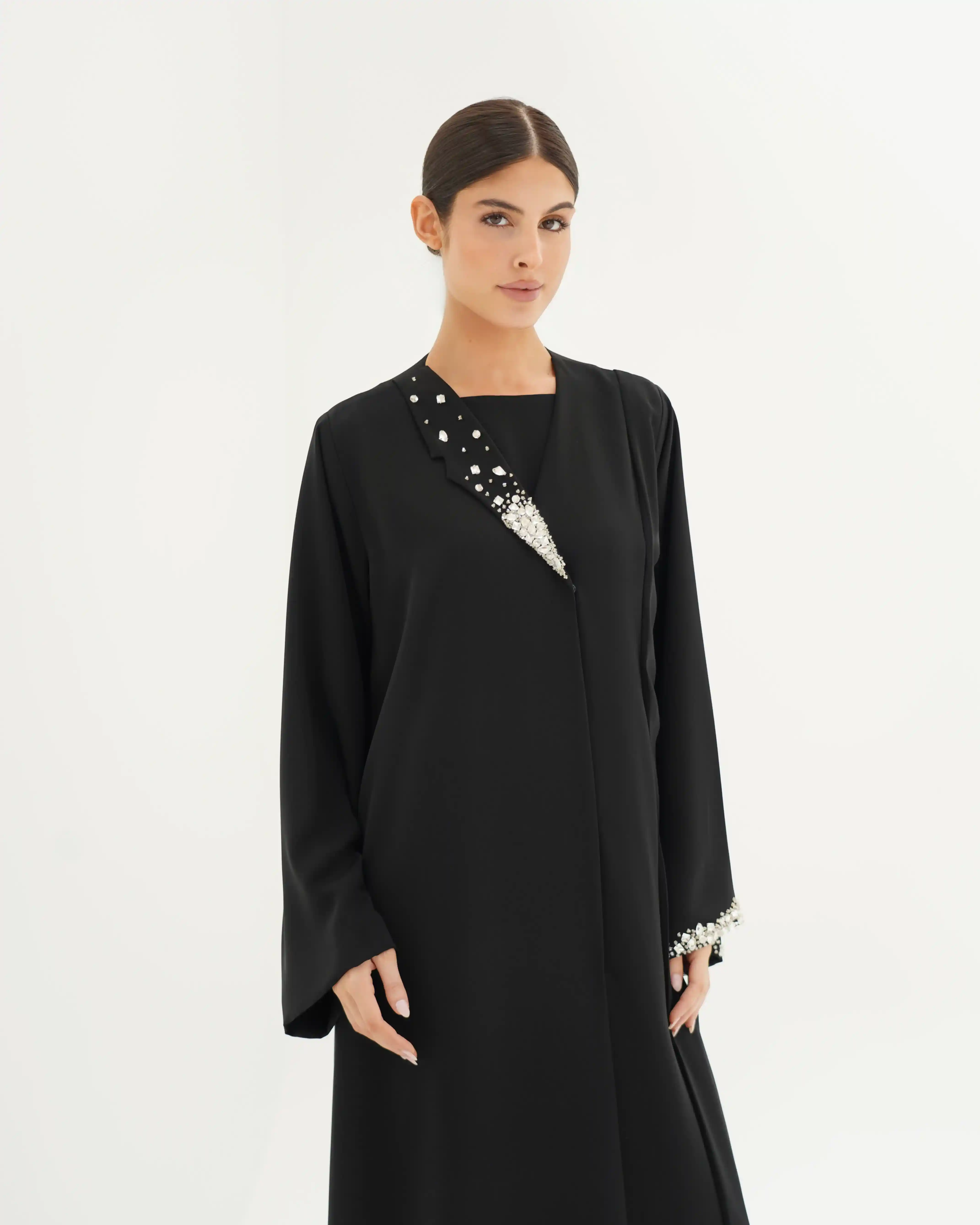 عباية تُجسّد قوة الحضور وأناقة الخط الواحد، بتصميم يرتكز على قصّة مستقيمة تنسدل بانسيابية هادئة من قماش البريميوم كريب بملمس ناعم وانسدال خفيف وهدوء بصري راقٍ, تأتي بياقة بليزر بطرف واحد تمنح القطعة طابعًا معماريًا راقيًا، بينما يبرز الاشتغال اليدوي بالخرز والكريستال كتوقيع فني متوازن على الصدر، وعلى طرف اللياقة، وفي نهاية الكم الأيسر، دون إخلال بنقاء التصميم.
