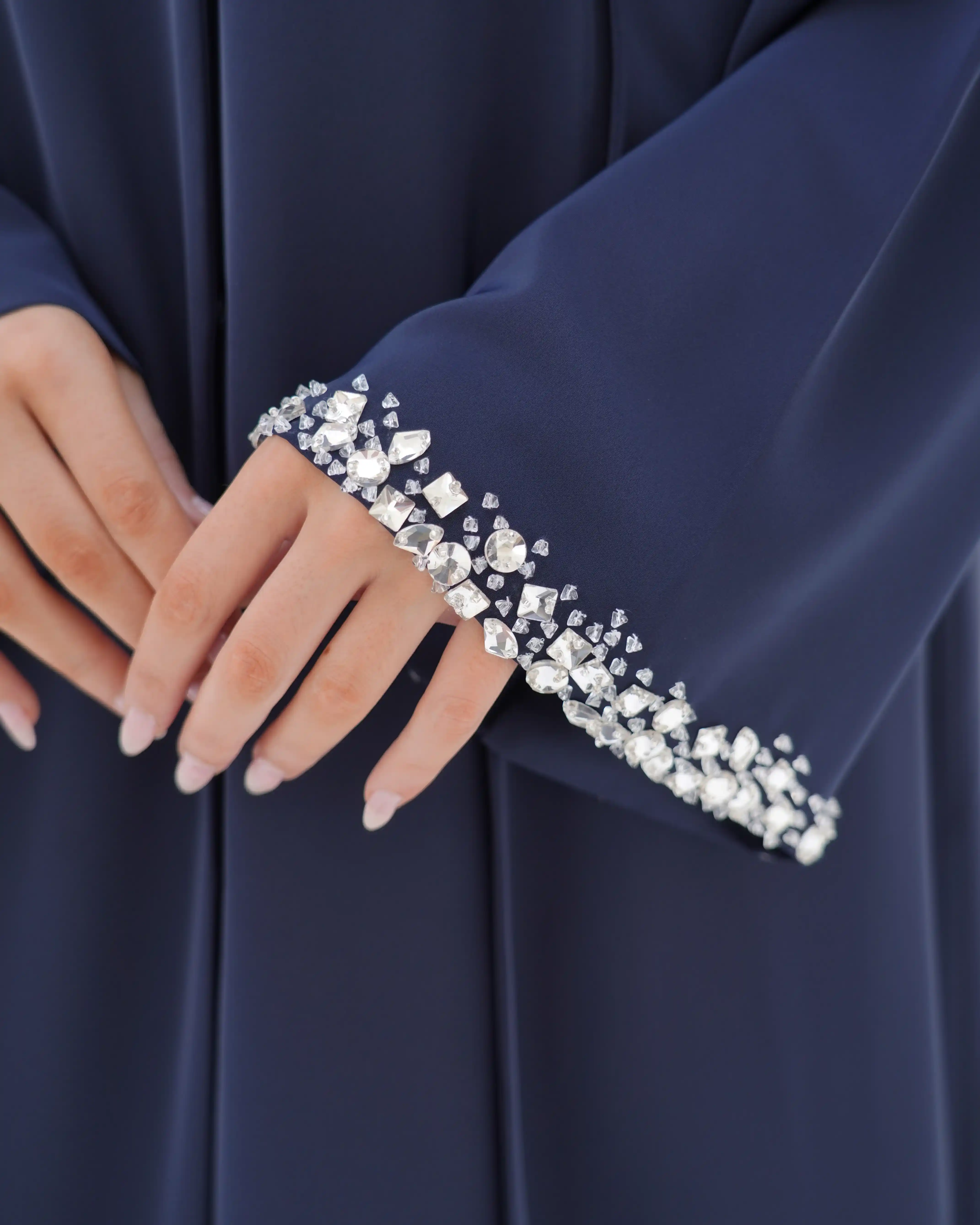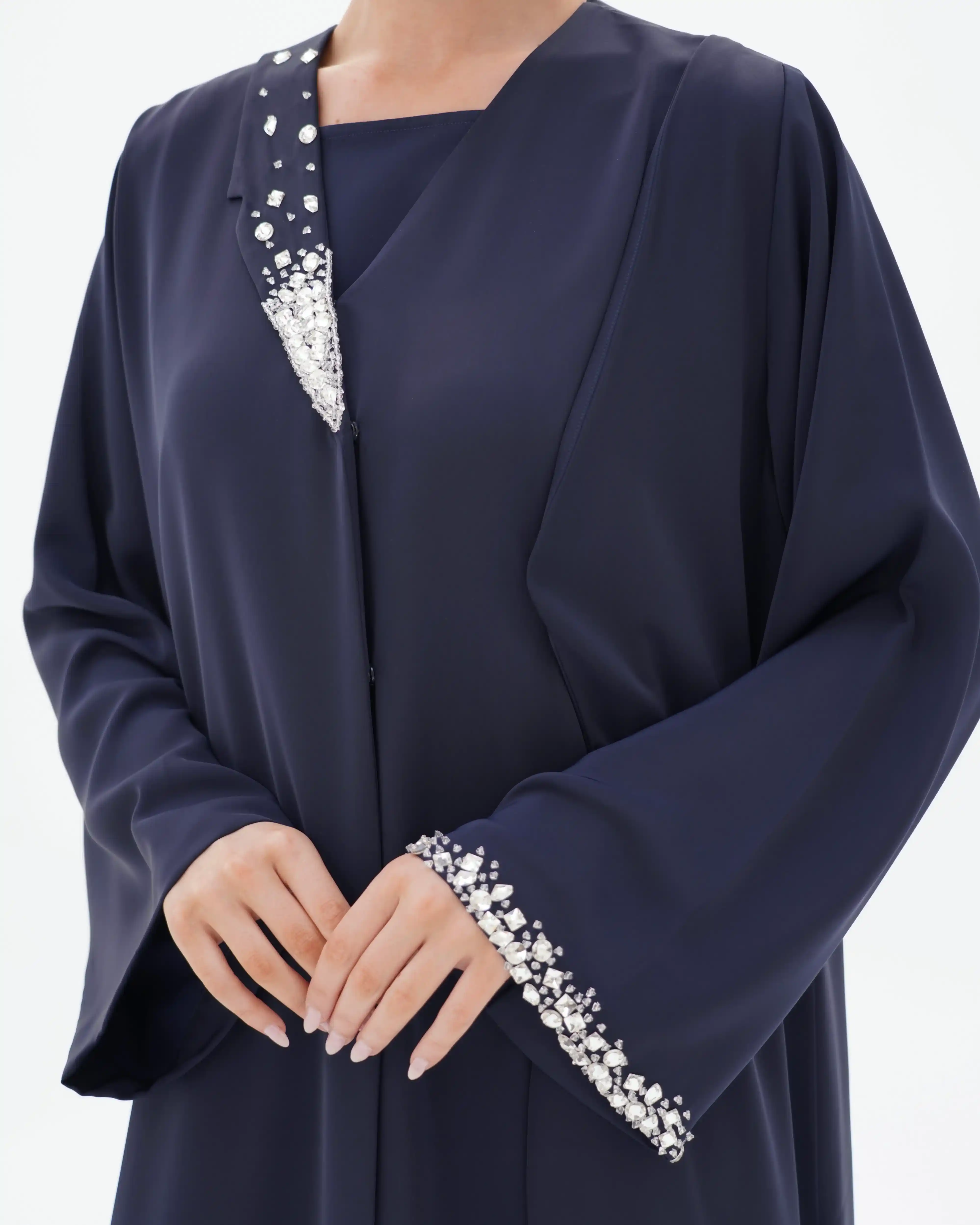 عباية تُجسّد قوة الحضور وأناقة الخط الواحد، بتصميم يرتكز على قصّة مستقيمة تنسدل بانسيابية هادئة من قماش البريميوم كريب بملمس ناعم وانسدال خفيف وهدوء بصري راقٍ, تأتي بياقة بليزر بطرف واحد تمنح القطعة طابعًا معماريًا راقيًا، بينما يبرز الاشتغال اليدوي بالخرز والكريستال كتوقيع فني متوازن على الصدر، وعلى طرف اللياقة، وفي نهاية الكم الأيسر، دون إخلال بنقاء التصميم.