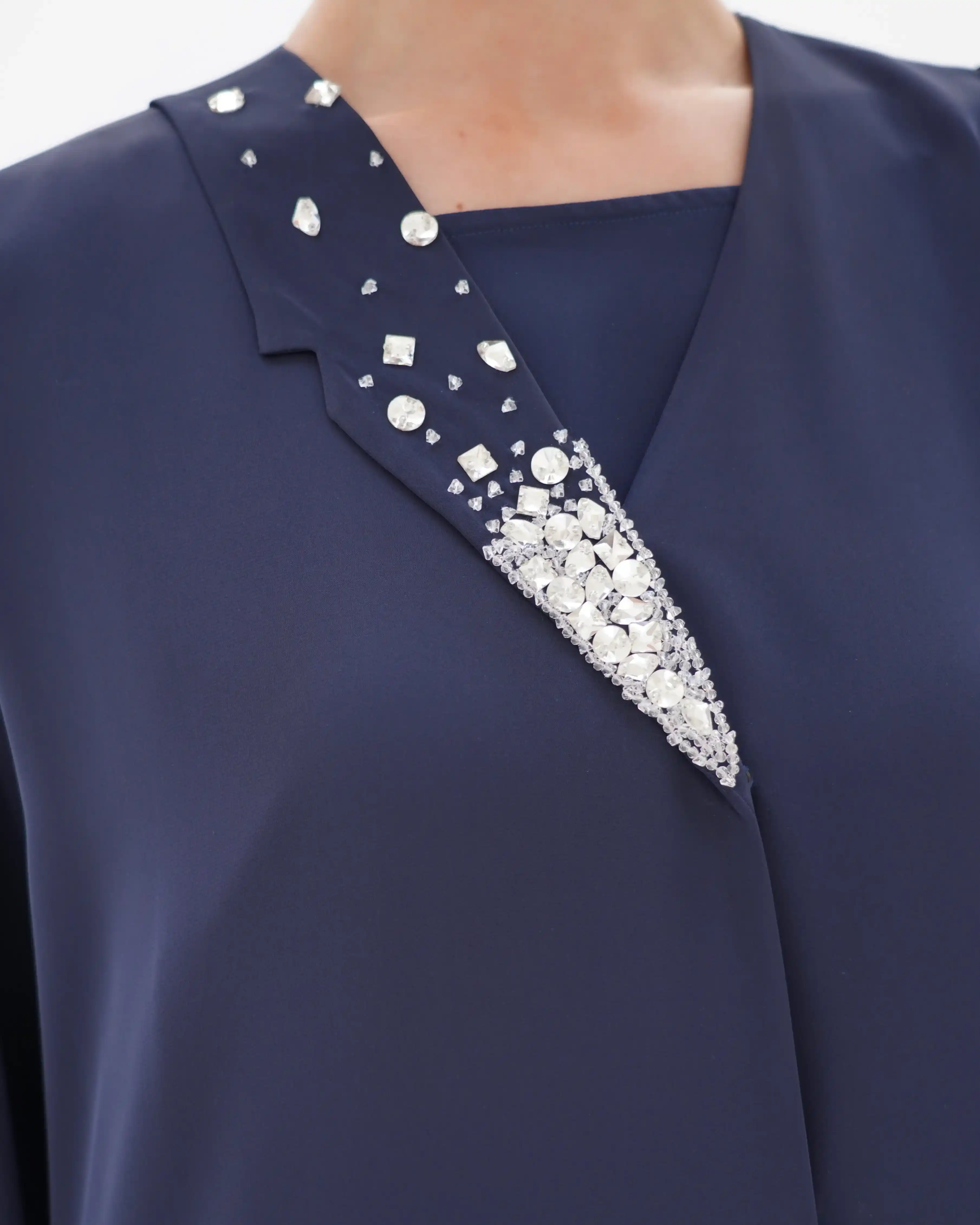 قماش البريميوم كريب بقصّة بليزر مشتغلة يدويًا بالخرز والكريستال