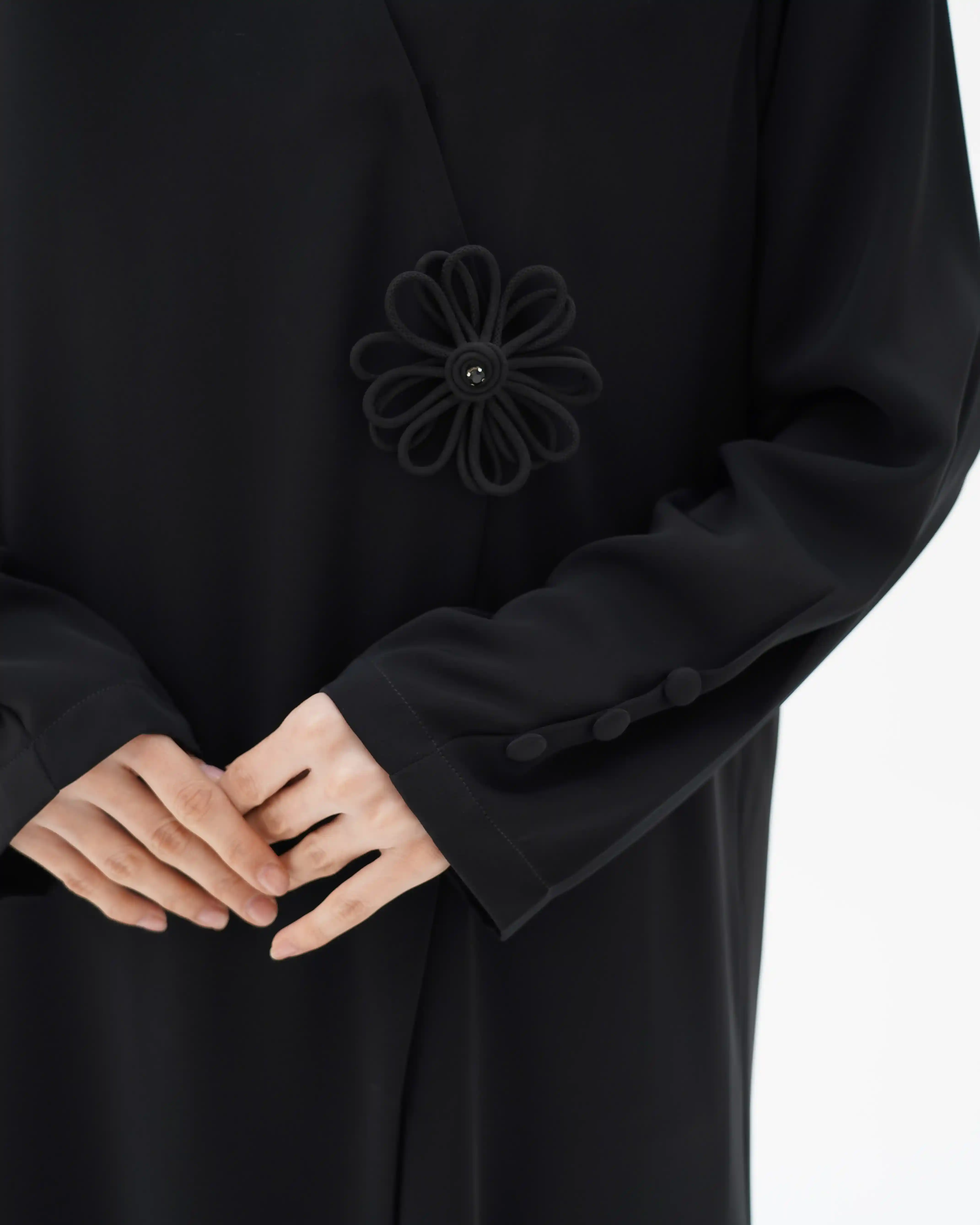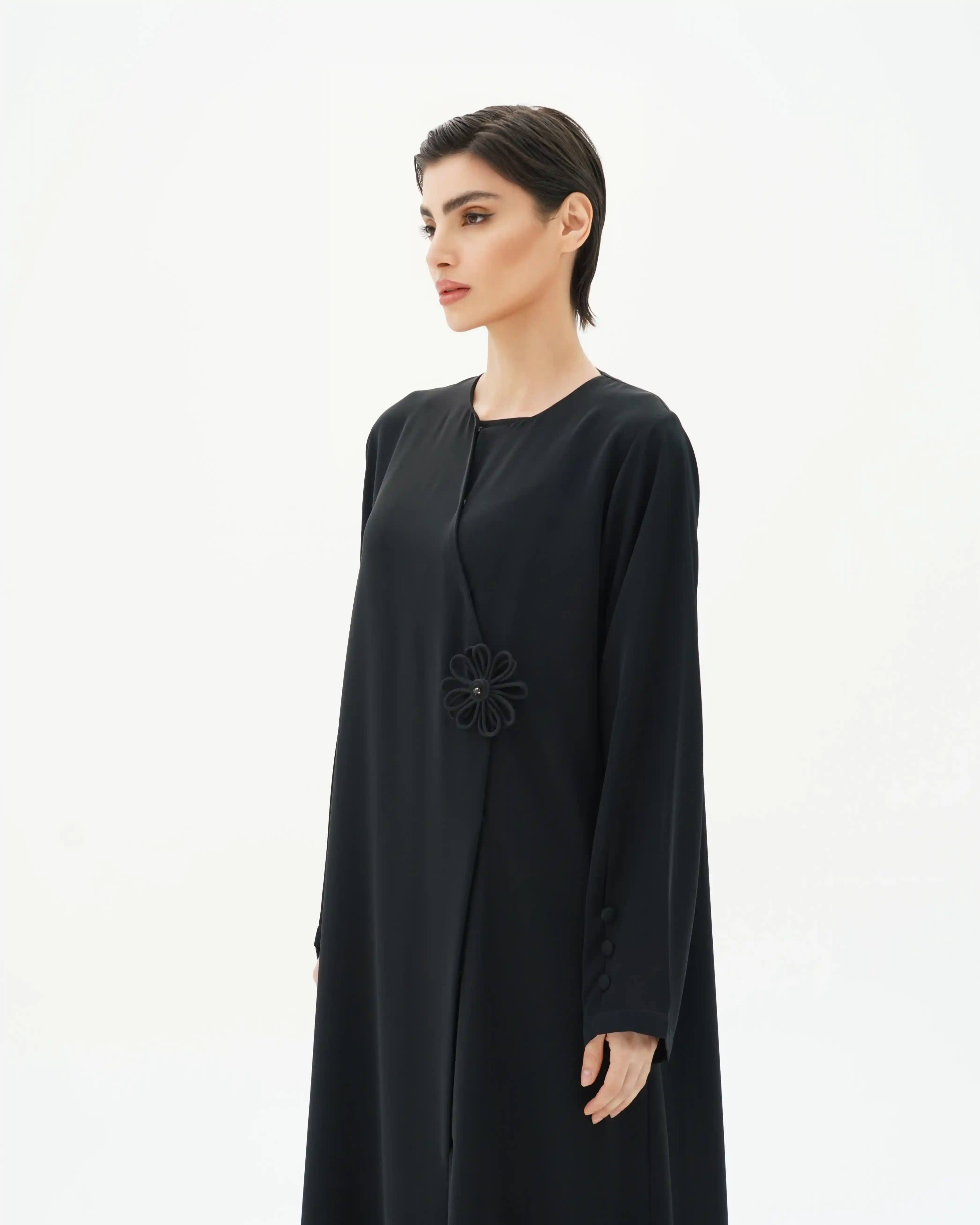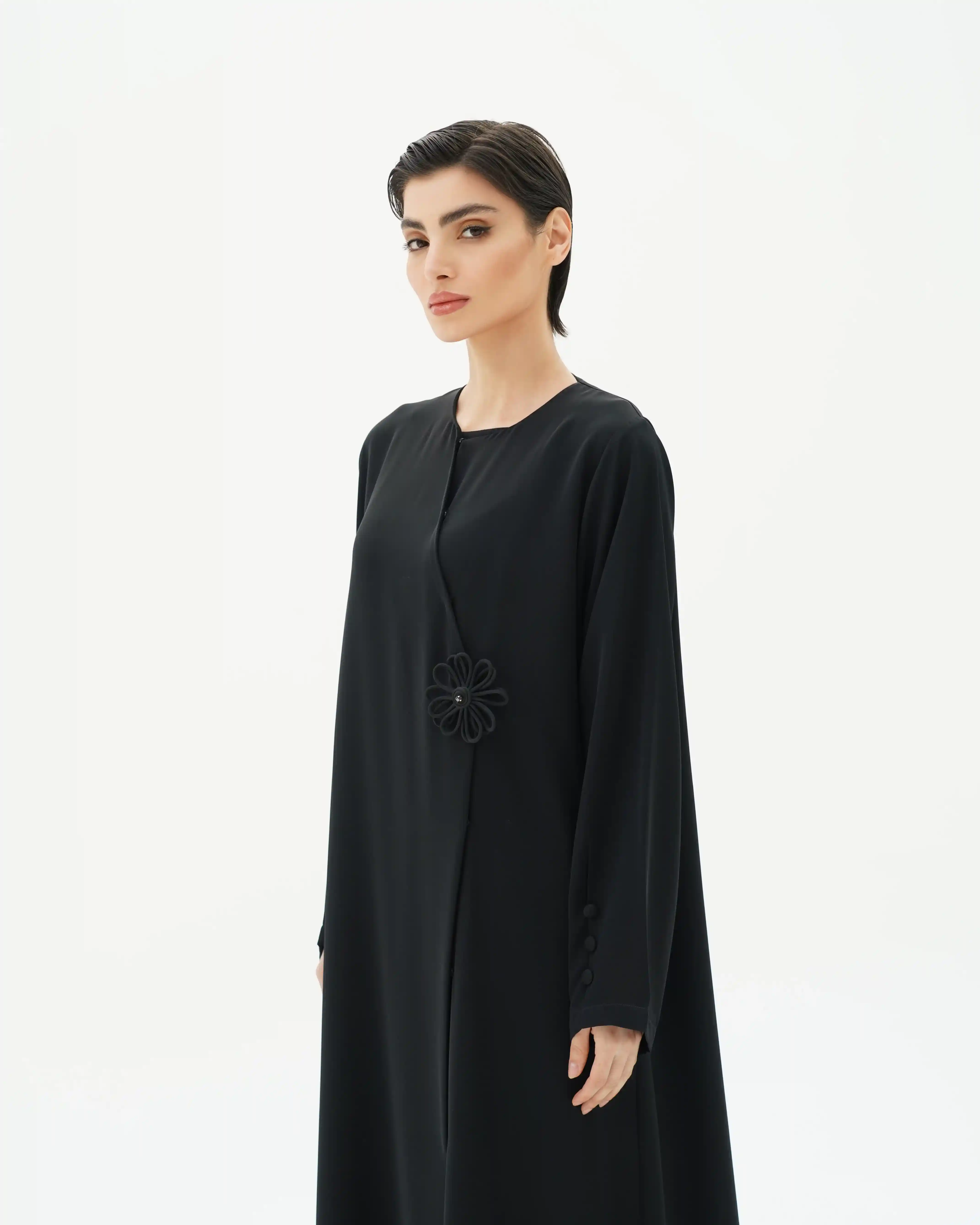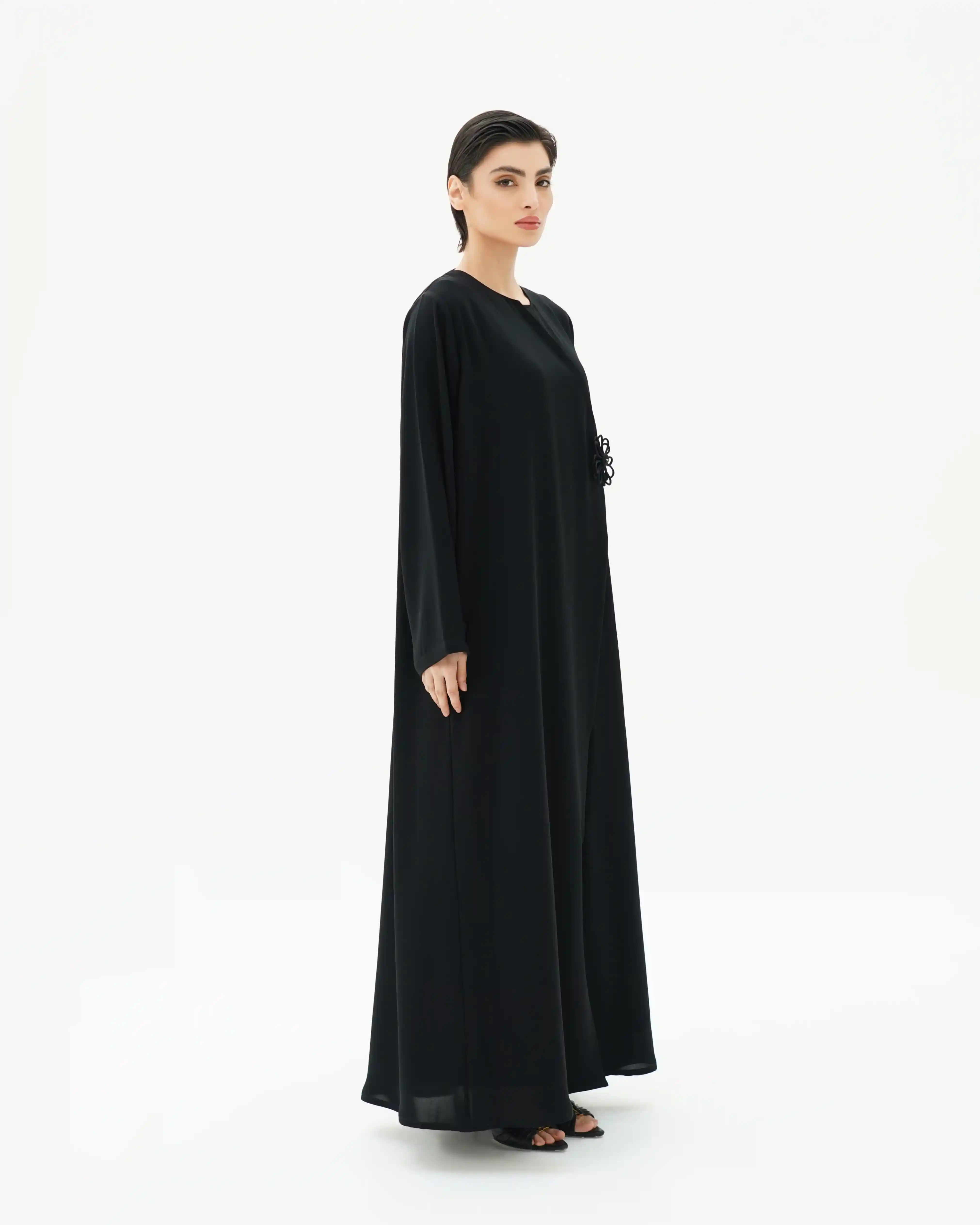• عنصر ملتف في منتصف العباية على هيئة وردة ناعمة في. متوسطة بخرزة بنفس لون العباية بتناغم بصري هادئ.