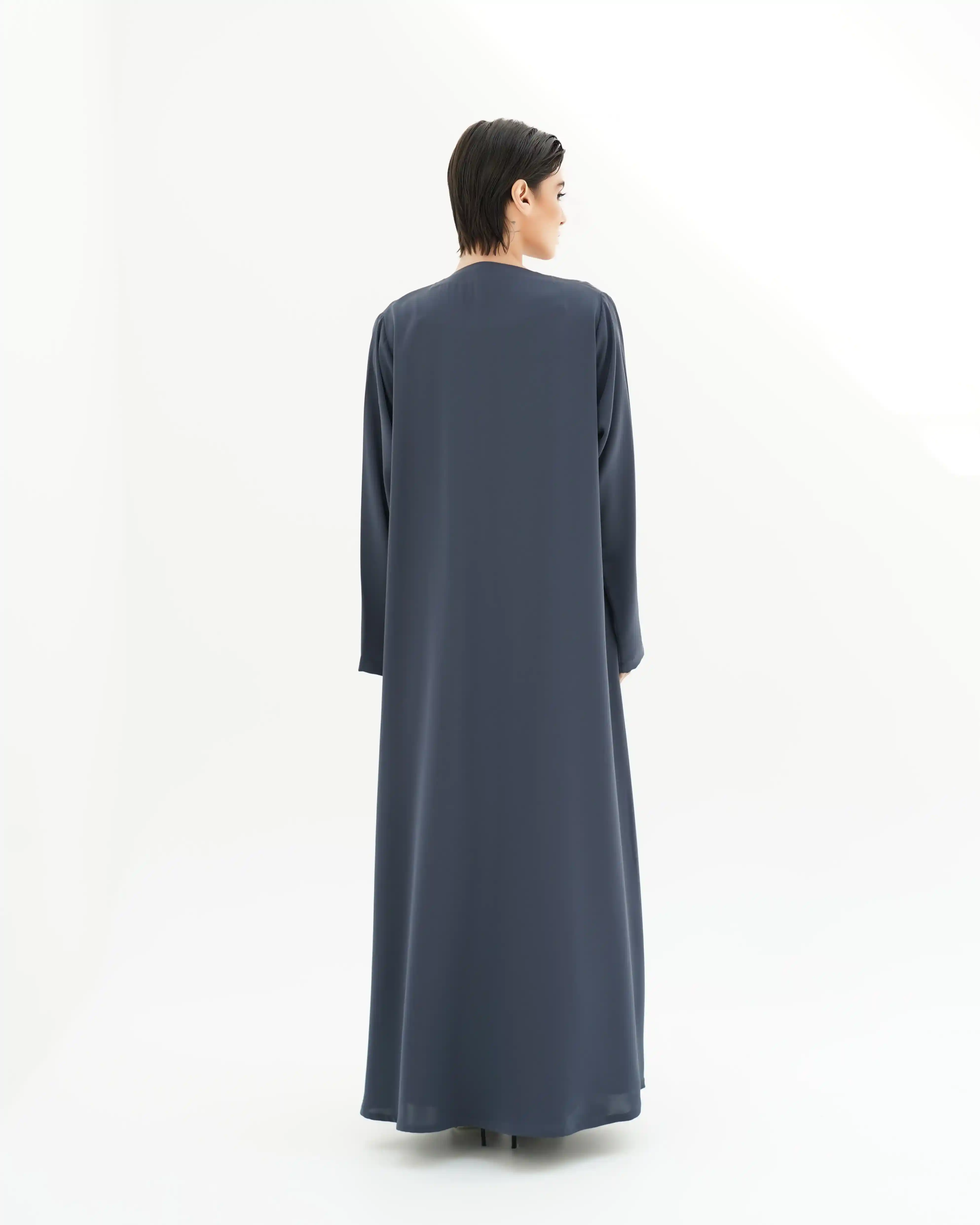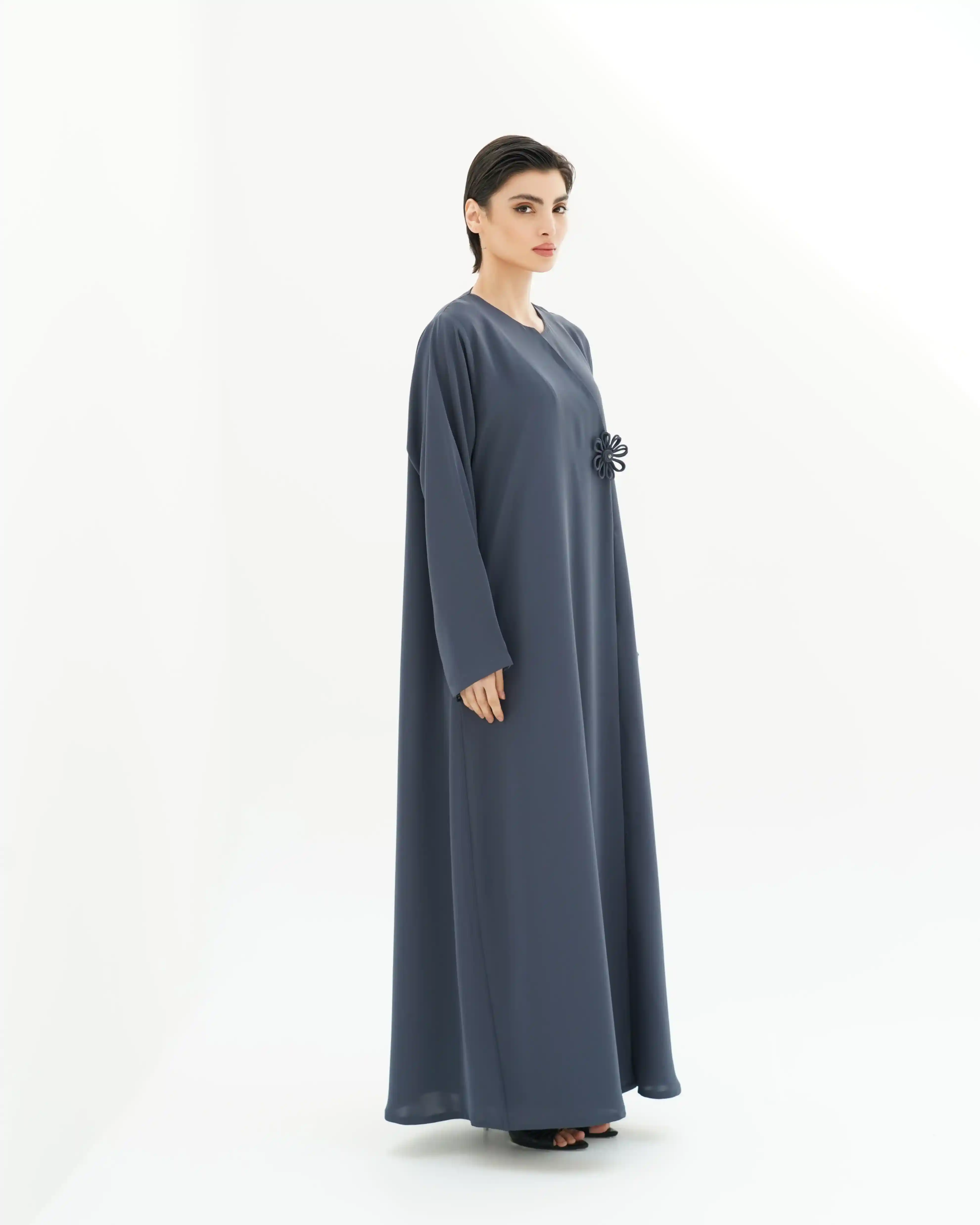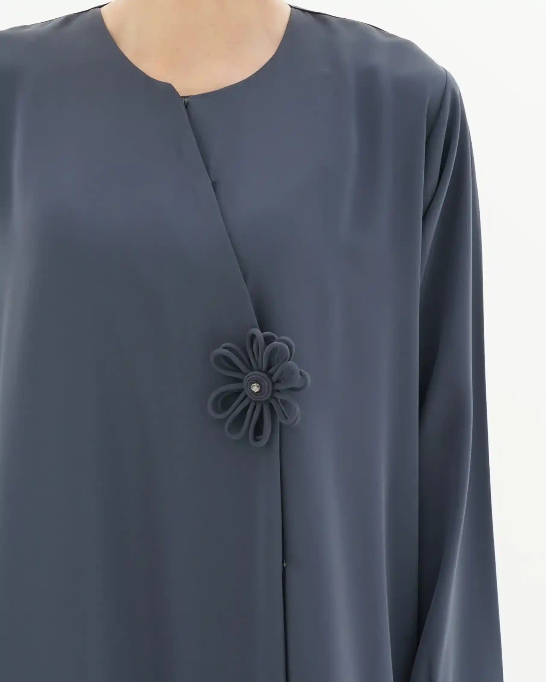 عباية تنبض بالهدوء والفخامة، من قماش البريميوم كريب بانسدال ناعم وحركة متوازنة. تأتي بقصّة اوفرلاب وتنساب بشكل مائل تمنح حضورًا أنيقًا، مع طقطق كامل مخفي يوفّر إغلاقًا متقنًا وساترًا للعباية. يتوسّط التصميم عنصر ملتفّ على هيئة وردة ناعمة، مشغول بتقنية لفّ القماش بعناية دقيقة، تتوسطه خرزة بنفس لون العباية لتضيف لمسة جمالية متناغمة وهادئة. الأكمام بقصّة نظيفة مع ثنية خفيفة تنتهي بثلاثة أزرار دقيقة، فيما تكتمل الإطلالة بطرحة سادة من نفس اللون، تنسدل بانسيابية وتعبّر عن هوية .KHAN&CO الراقية بأسلوب مختزل وواثق.