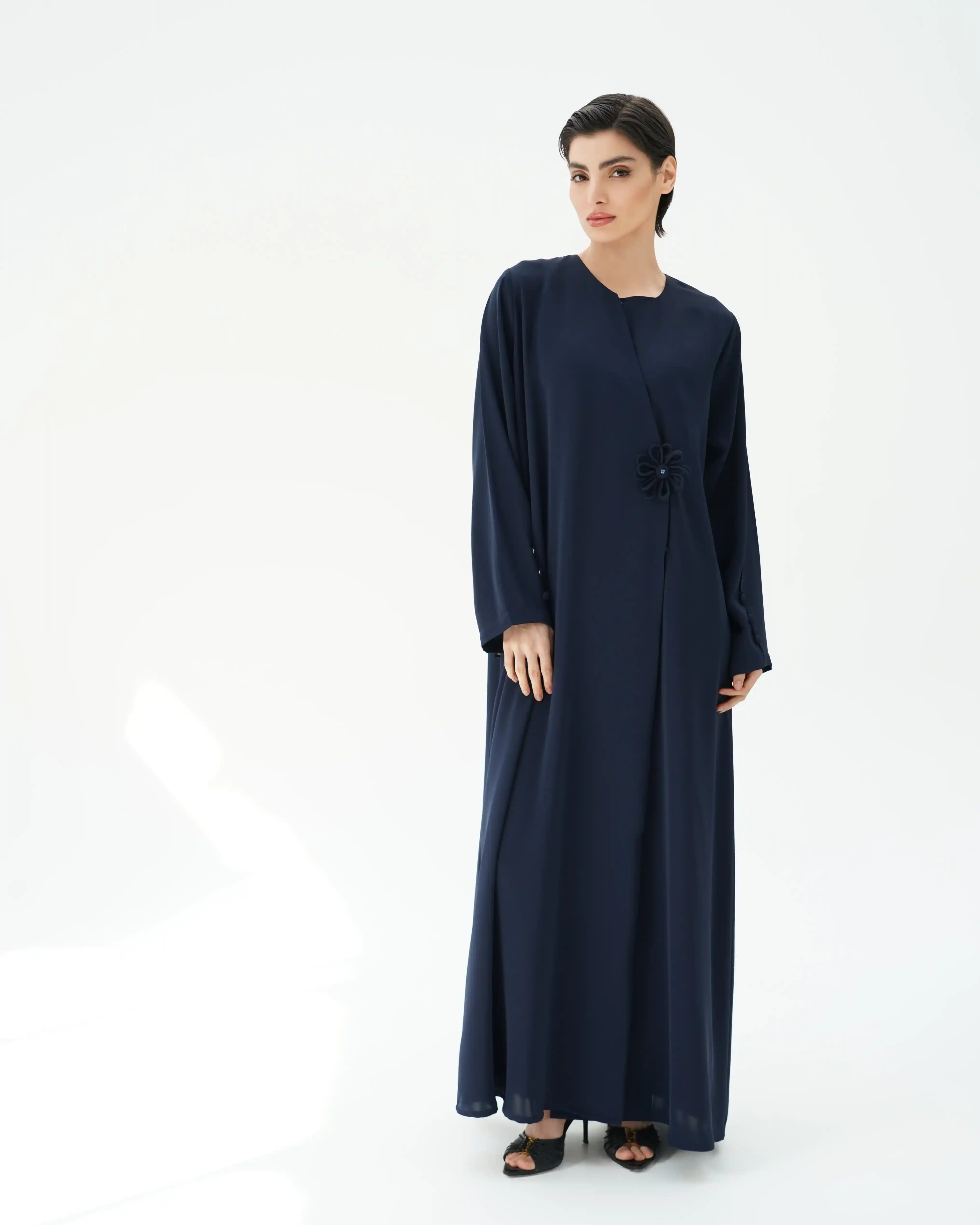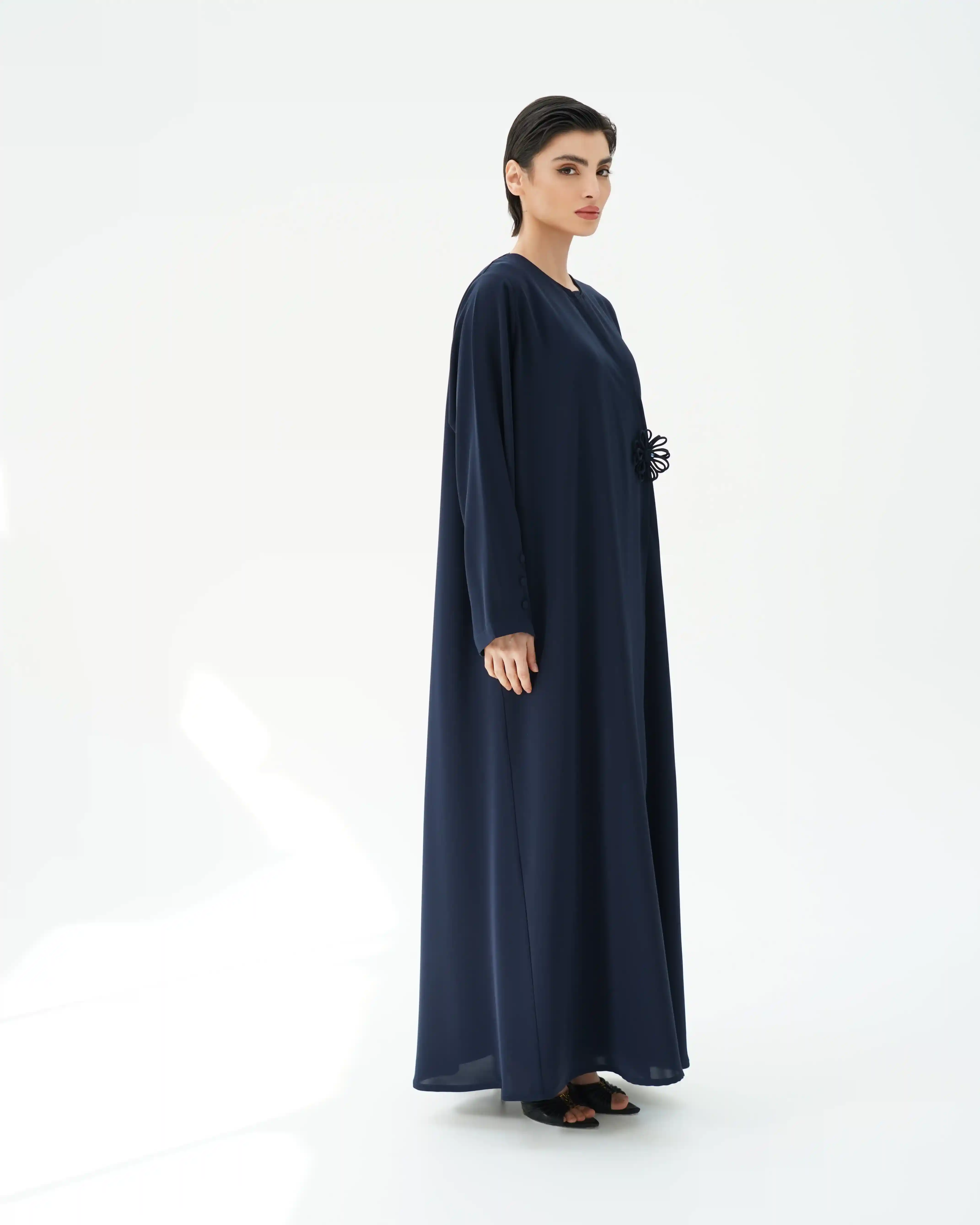 عباية تنبض بالهدوء والفخامة، من قماش البريميوم كريب بانسدال ناعم وحركة متوازنة. تأتي بقصّة اوفرلاب وتنساب بشكل مائل تمنح حضورًا أنيقًا، مع طقطق كامل مخفي يوفّر إغلاقًا متقنًا وساترًا للعباية. يتوسّط التصميم عنصر ملتفّ على هيئة وردة ناعمة، مشغول بتقنية لفّ القماش بعناية دقيقة، تتوسطه خرزة بنفس لون العباية لتضيف لمسة جمالية متناغمة وهادئة. الأكمام بقصّة نظيفة مع ثنية خفيفة تنتهي بثلاثة أزرار دقيقة، فيما تكتمل الإطلالة بطرحة سادة من نفس اللون، تنسدل بانسيابية وتعبّر عن هوية .KHAN&CO الراقية بأسلوب مختزل وواثق.