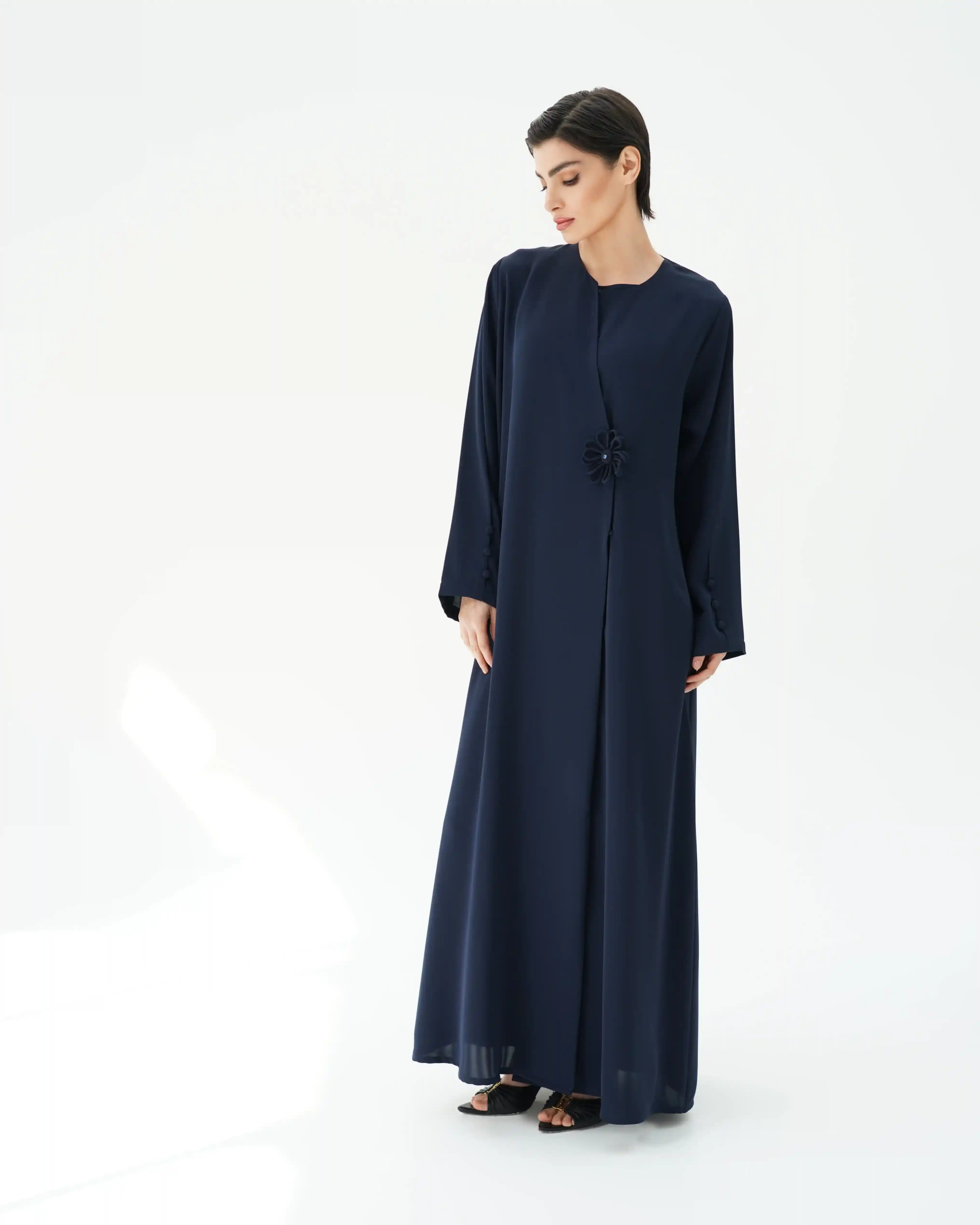 • عنصر ملتف في منتصف العباية على هيئة وردة ناعمة في. متوسطة بخرزة بنفس لون العباية بتناغم بصري هادئ.