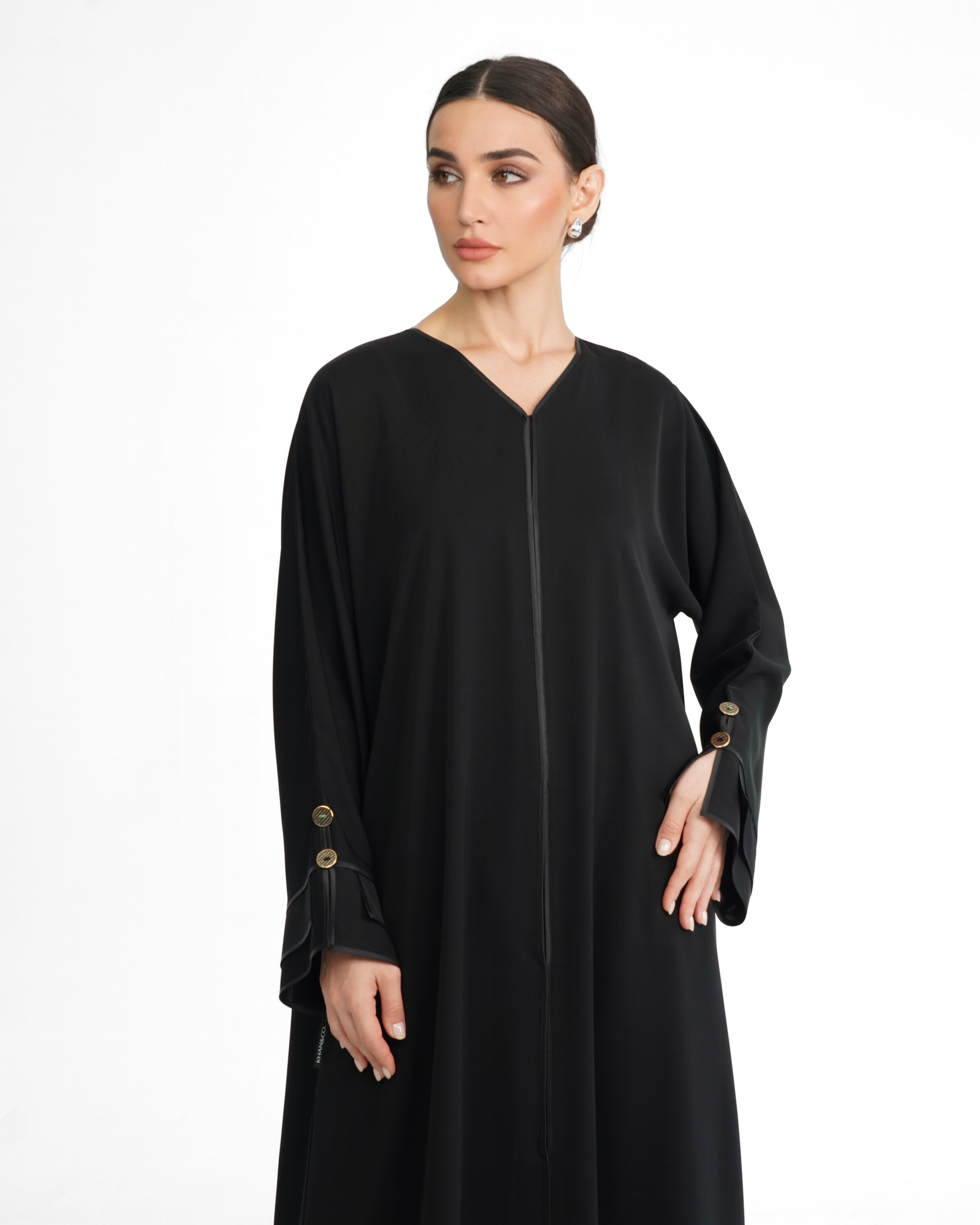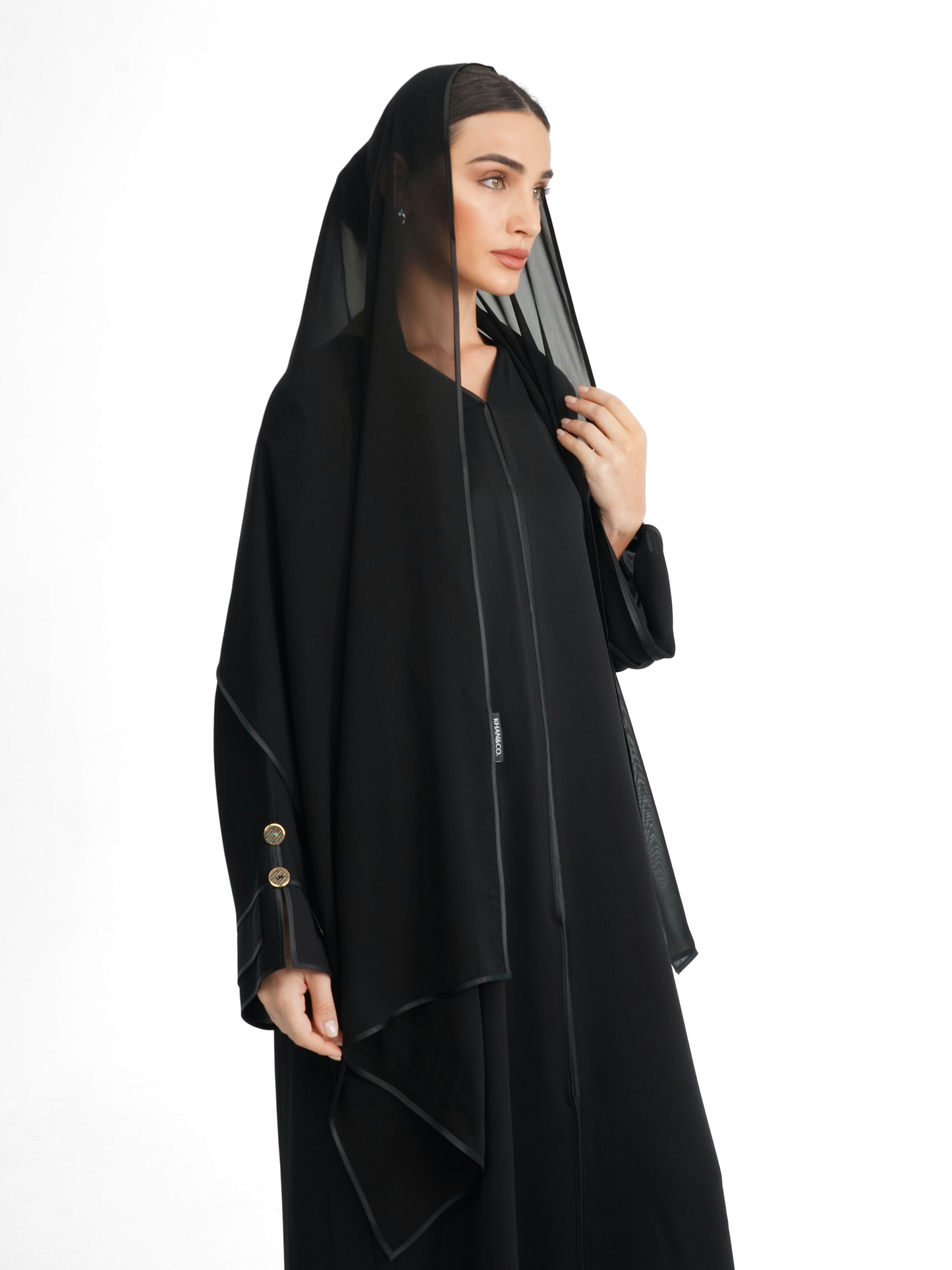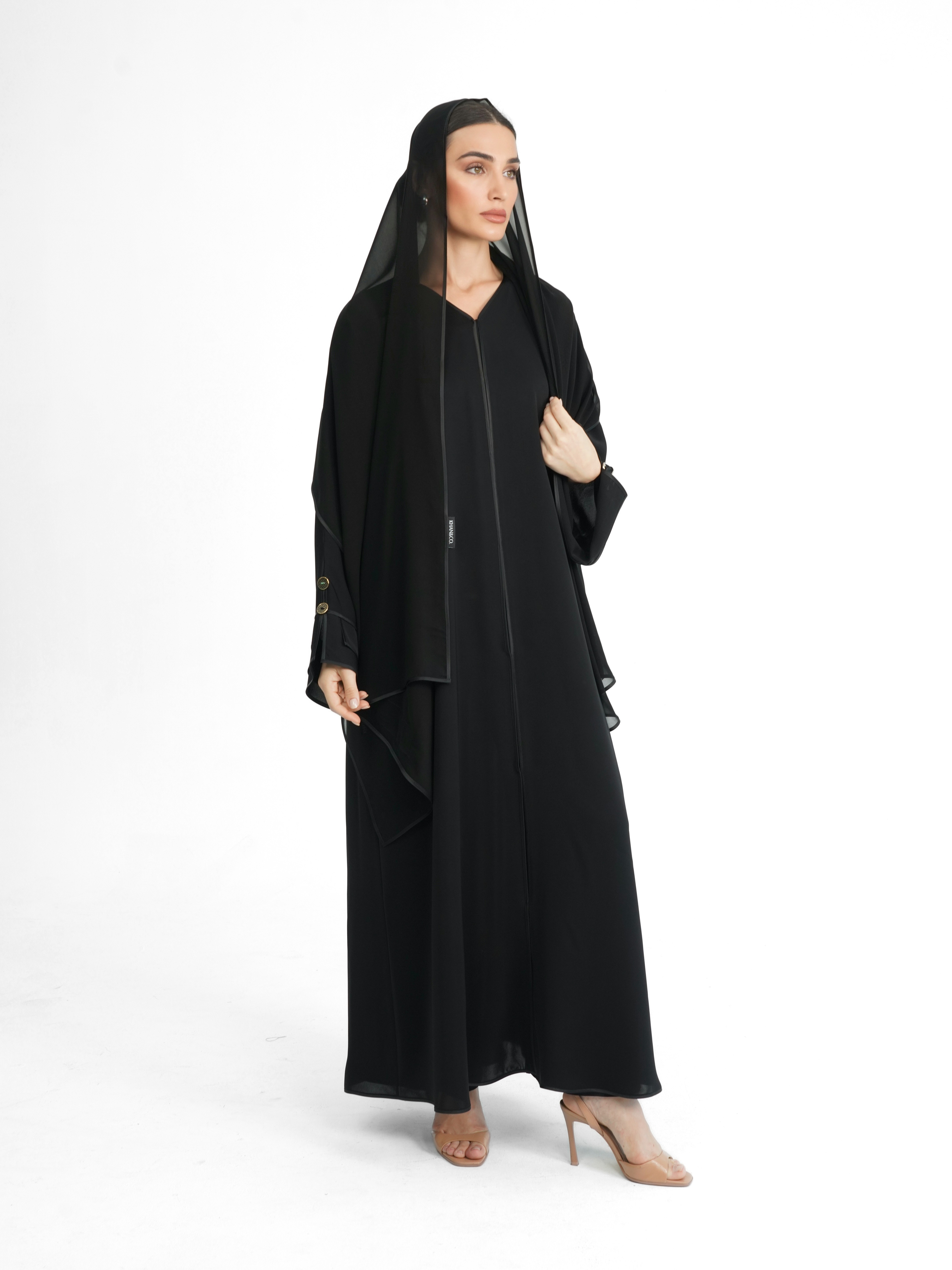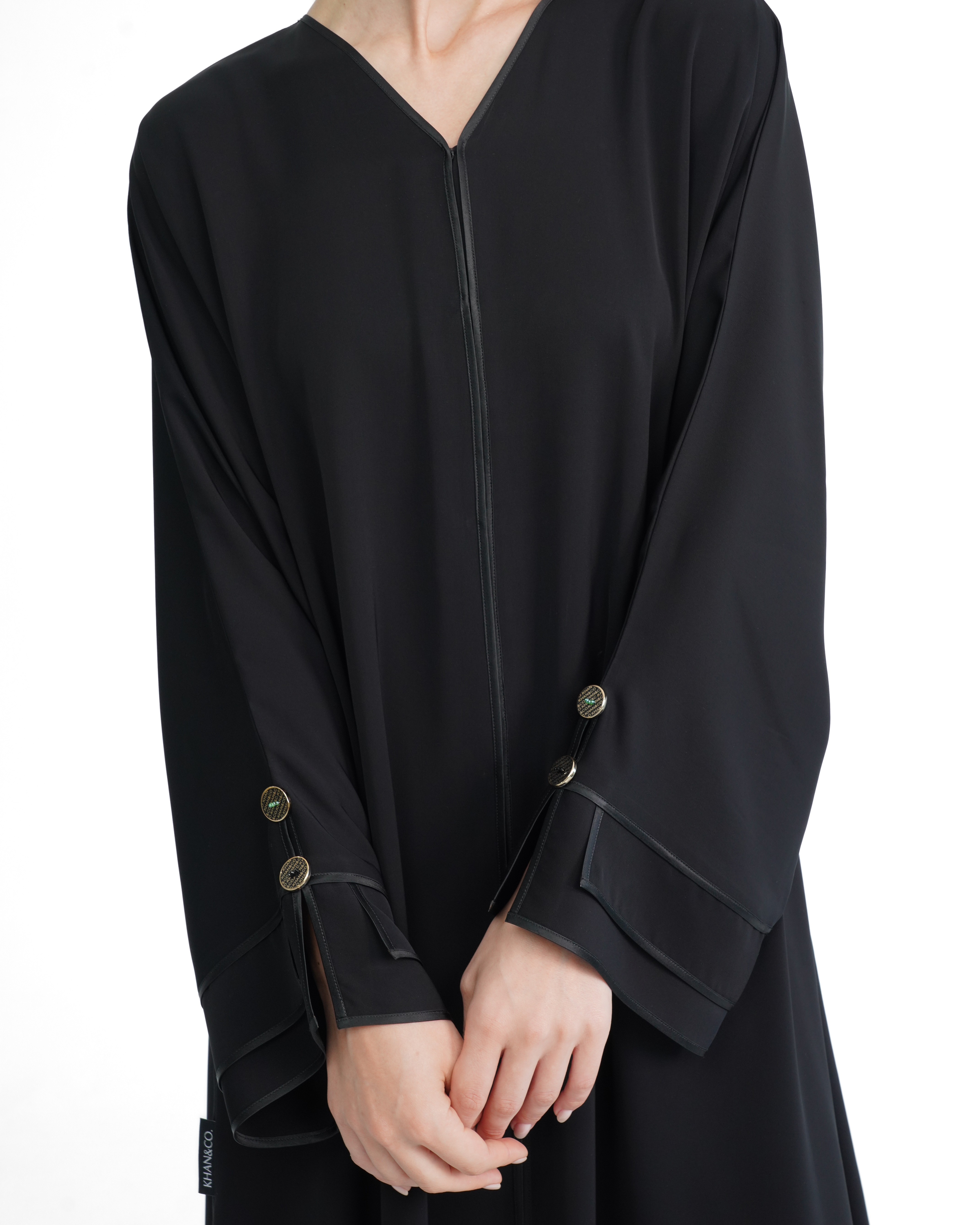 صُنعت هذه العباية بأناقتها وبساطة تصميمها من خلال القصة الكلاسيكية والكم المتصل بباقي العباية بدون خياطة عند الاكتاف مما يضيف لمسة مفعمة بالاناقة لعباية سادة انيقة، ويتألق تصميم العباية بفتحات في نهاية الاكمام بتناسق تام مع قماش العباية المنسدل من نسيج الكريب الناعم والخفيف للحصول على إطلالة بتفاصيل ضخمة. أمّا الخياطة المخفية والمدروزة بالريبون فتعطي ابراز للتلاعب بتدرجات اللون الاسود بشكل متعاكس بين الحرير والكريب وتضيف الازارير التي تحمل توقيع علامة .KHAN&CO لمسات نهائية غرافيكية بديعة في الاكمام