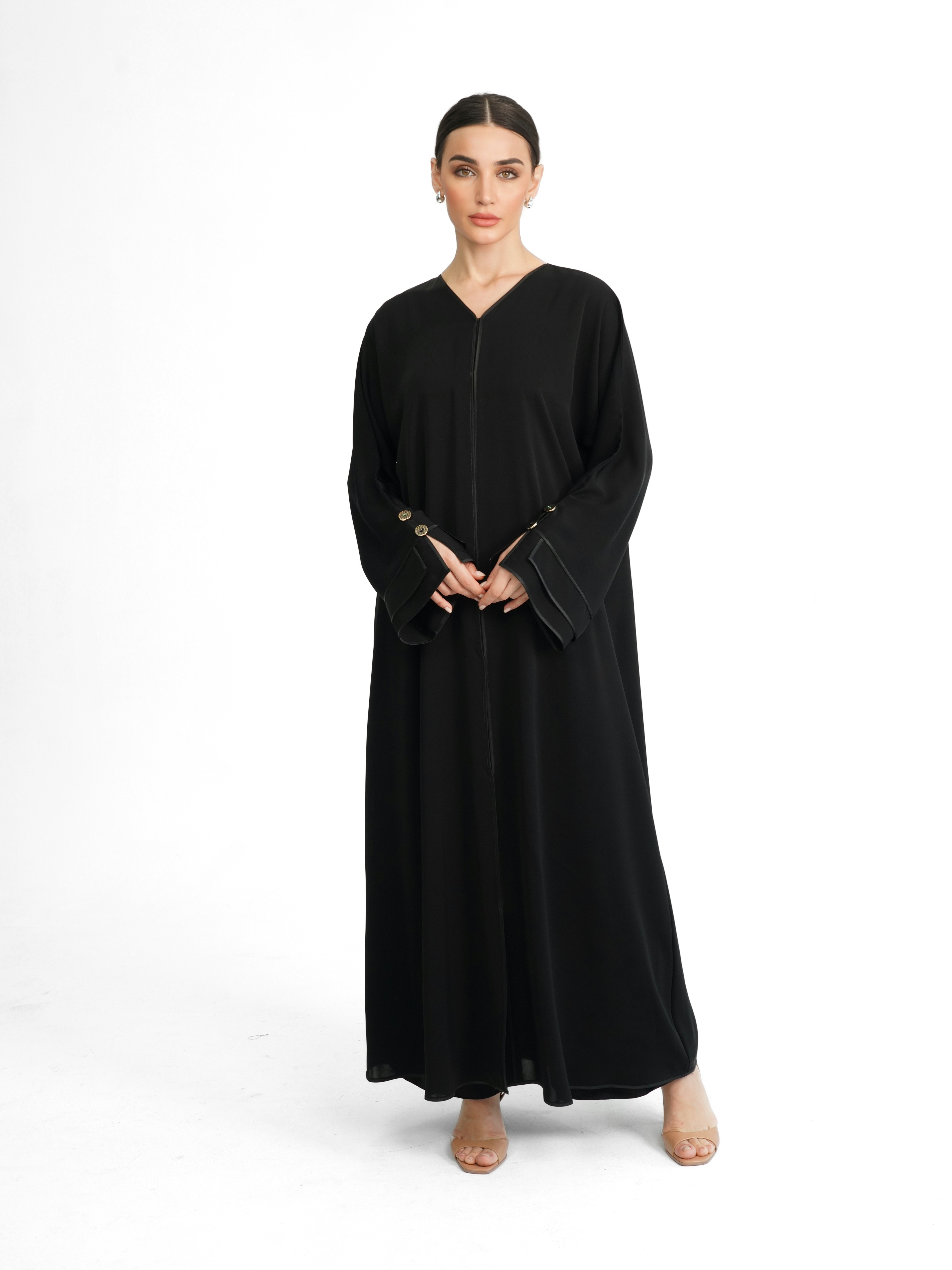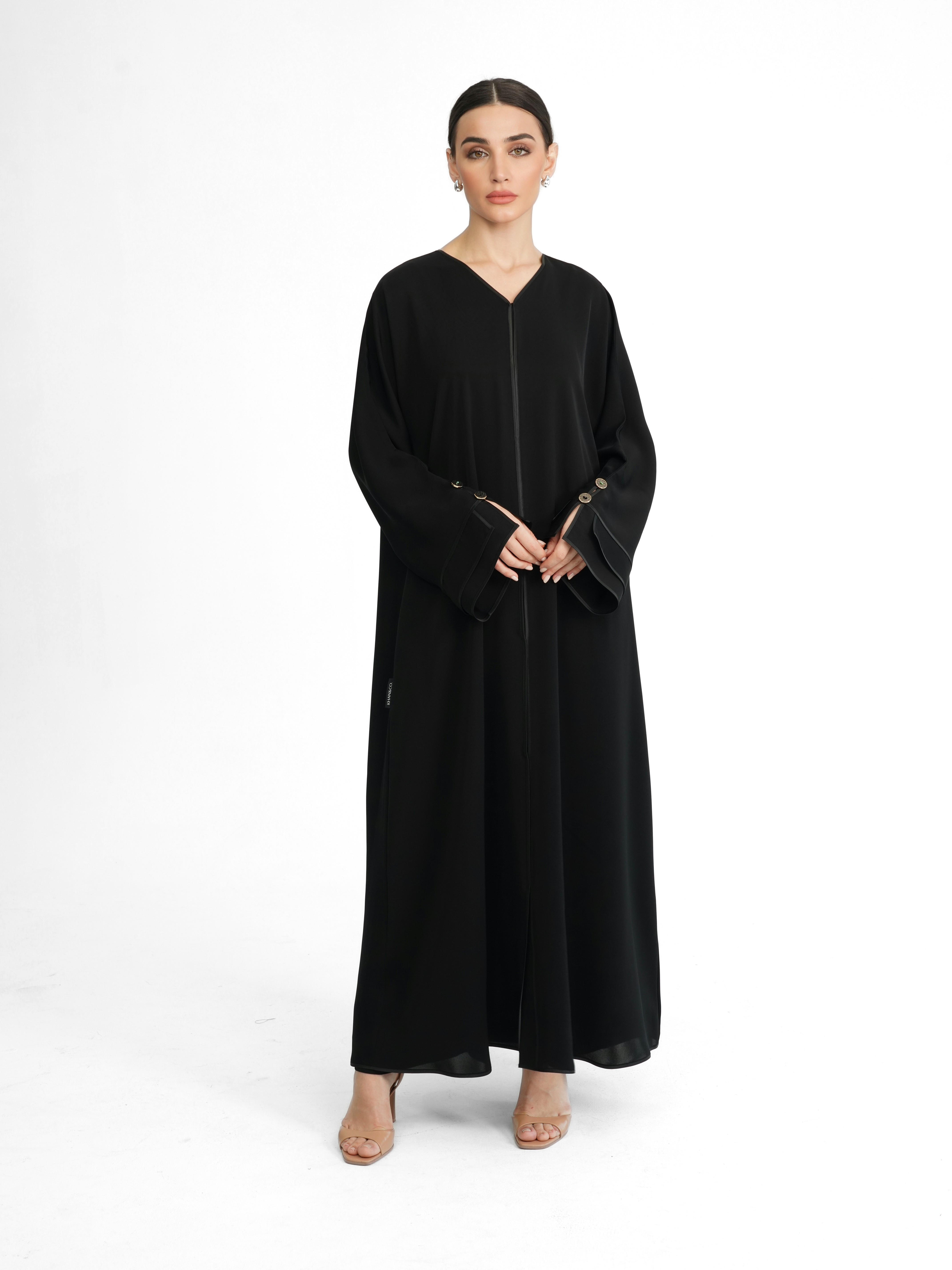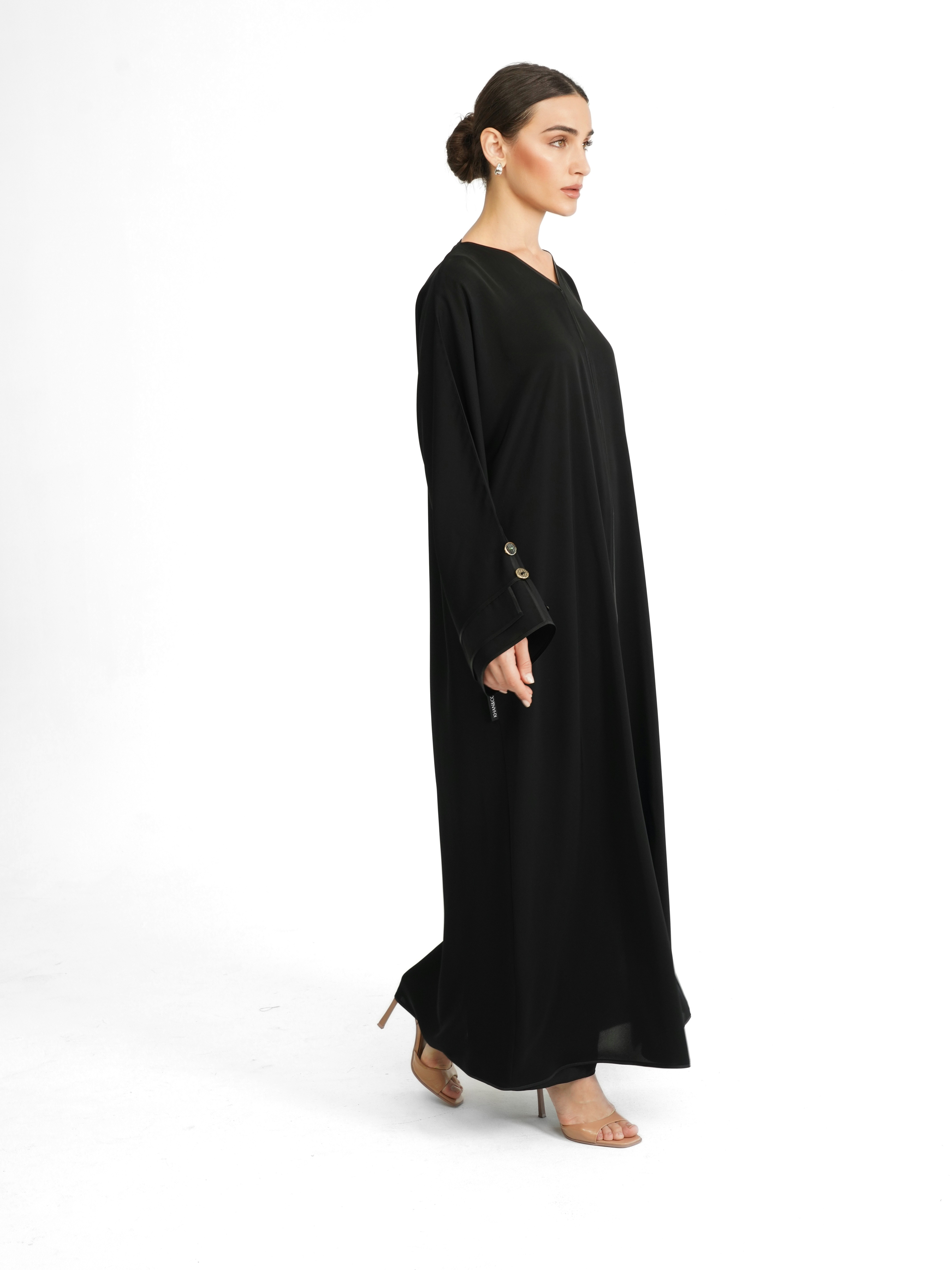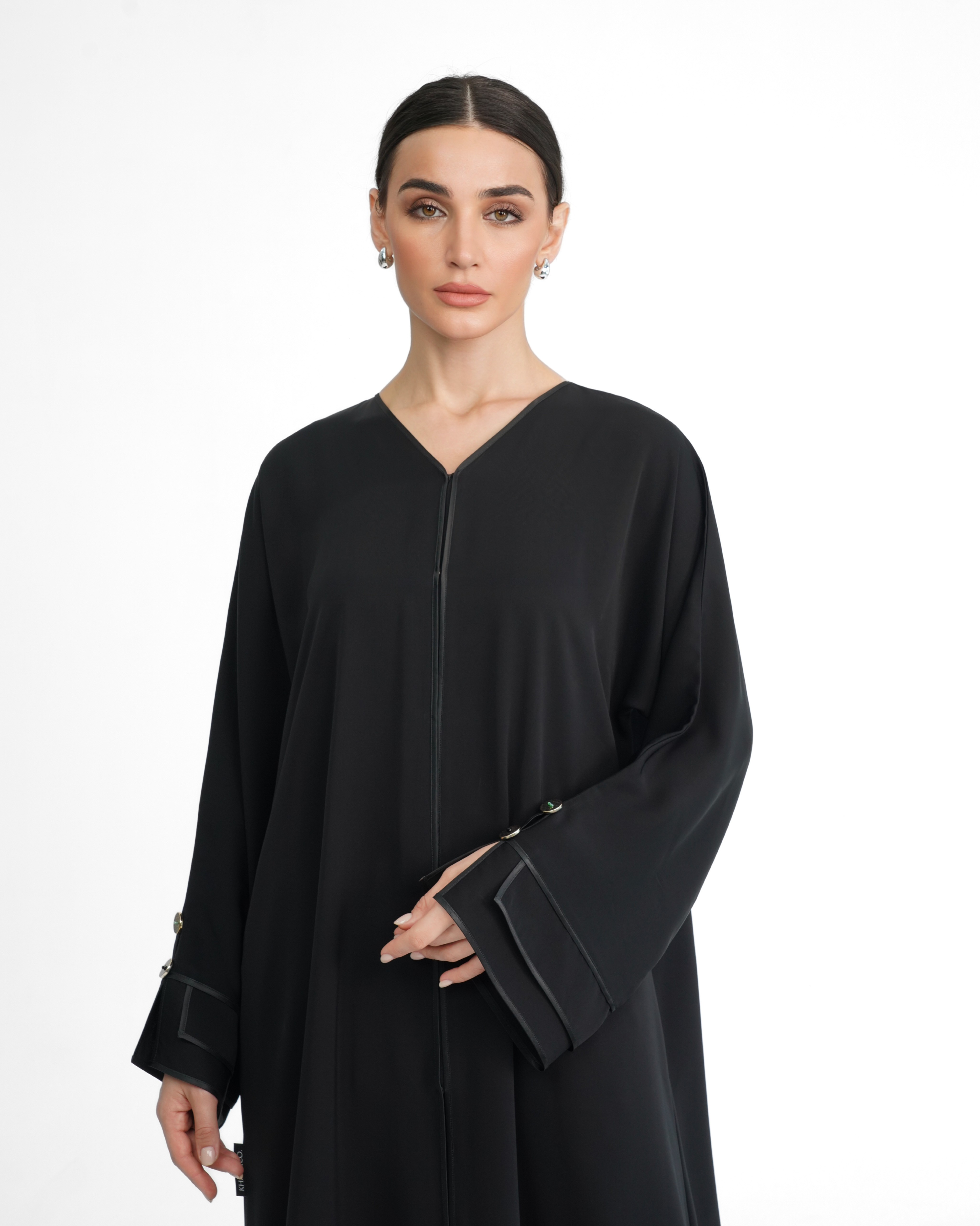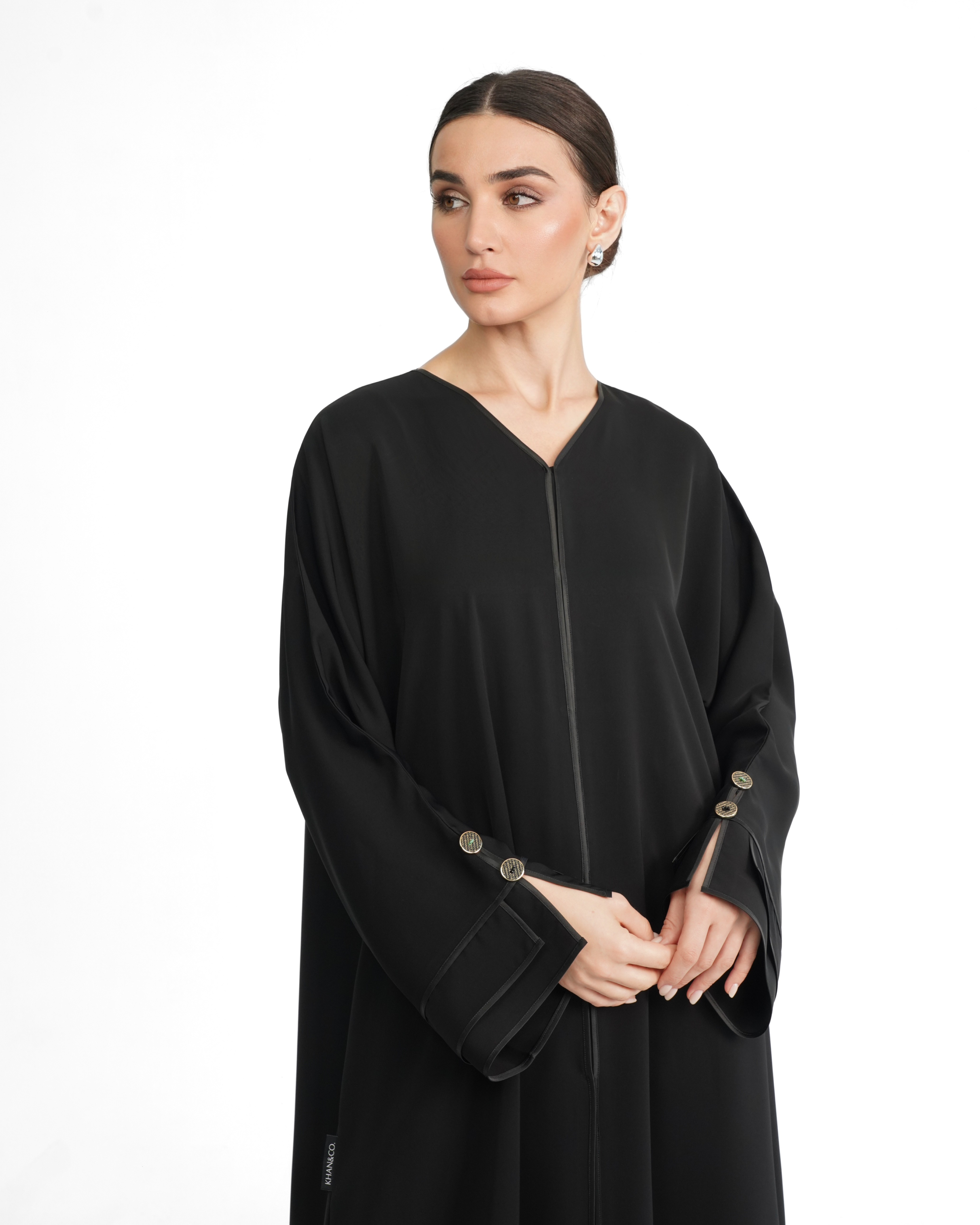 صُنعت هذه العباية بأناقتها وبساطة تصميمها من خلال القصة الكلاسيكية والكم المتصل بباقي العباية بدون خياطة عند الاكتاف مما يضيف لمسة مفعمة بالاناقة لعباية سادة انيقة، ويتألق تصميم العباية بفتحات في نهاية الاكمام بتناسق تام مع قماش العباية المنسدل من نسيج الكريب الناعم والخفيف للحصول على إطلالة بتفاصيل ضخمة. أمّا الخياطة المخفية والمدروزة بالريبون فتعطي ابراز للتلاعب بتدرجات اللون الاسود بشكل متعاكس بين الحرير والكريب وتضيف الازارير التي تحمل توقيع علامة .KHAN&CO لمسات نهائية غرافيكية بديعة في الاكمام