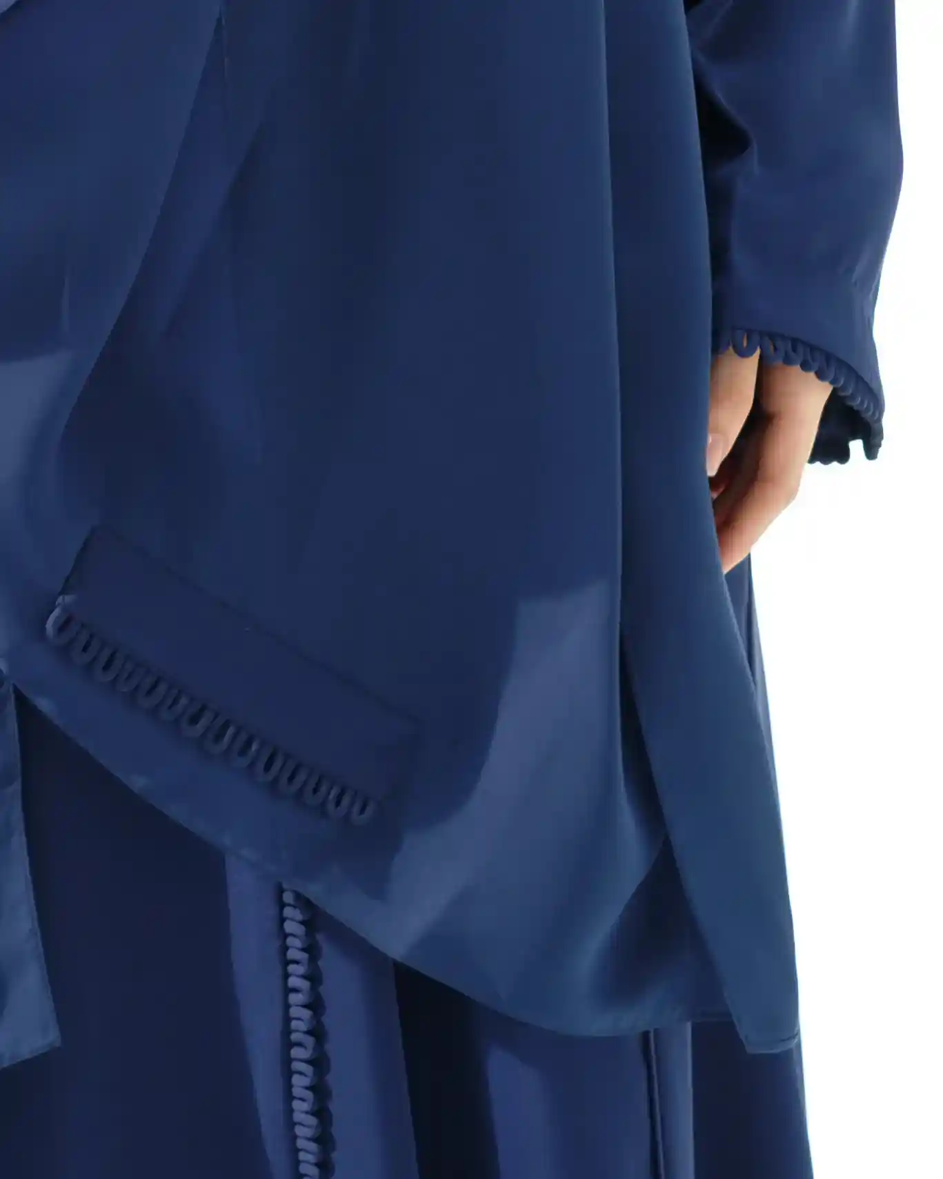 • أكمام سادة بقصة نظيفة، تنتهي بحافة تحمل نفس الإيقاع المنحني بشكل متناغم.