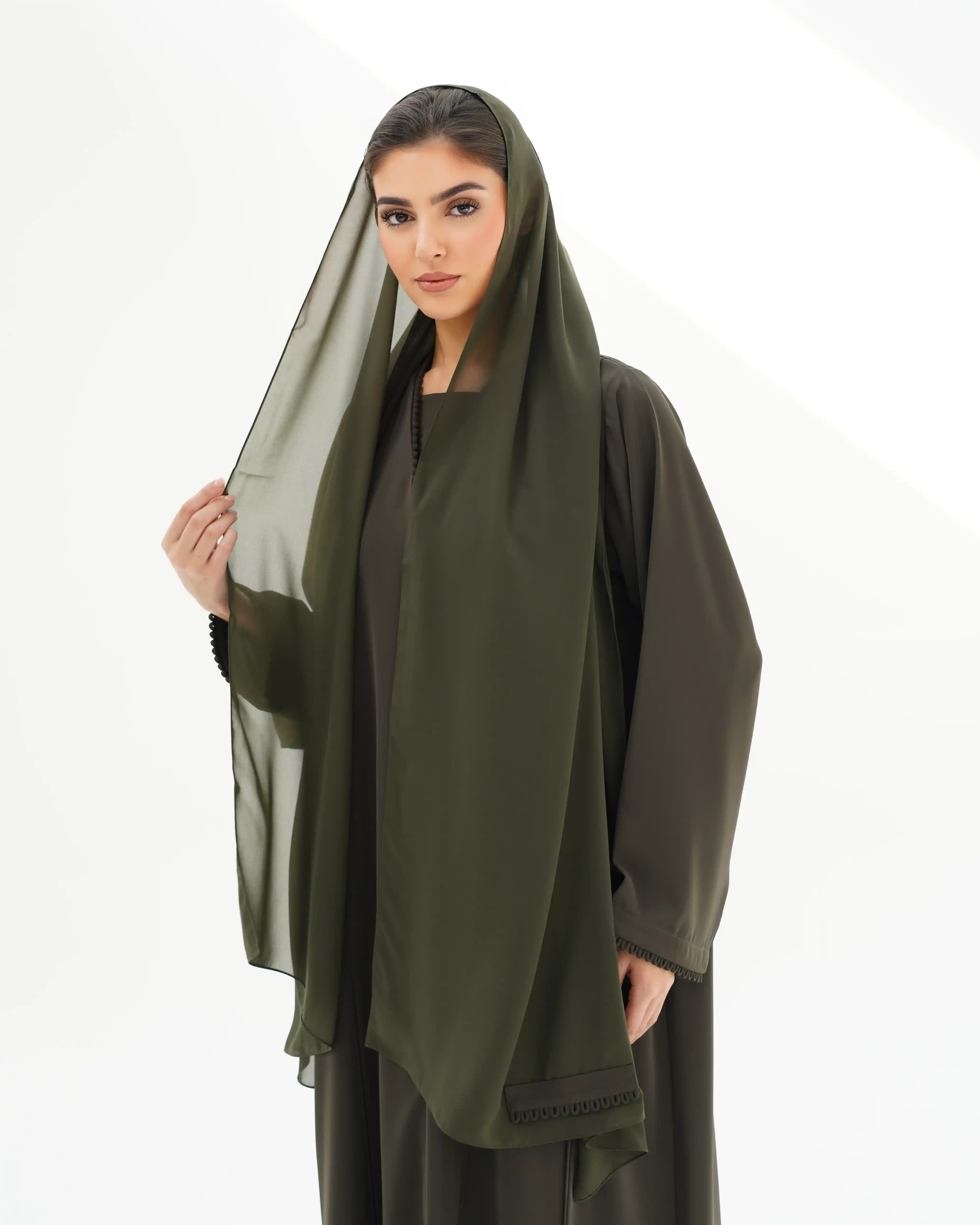 • طرحة سادة متناغمة بنفس لون العباية، تتوسط أطرافها نفس الإيقاع المنحني بشكل متناغم.