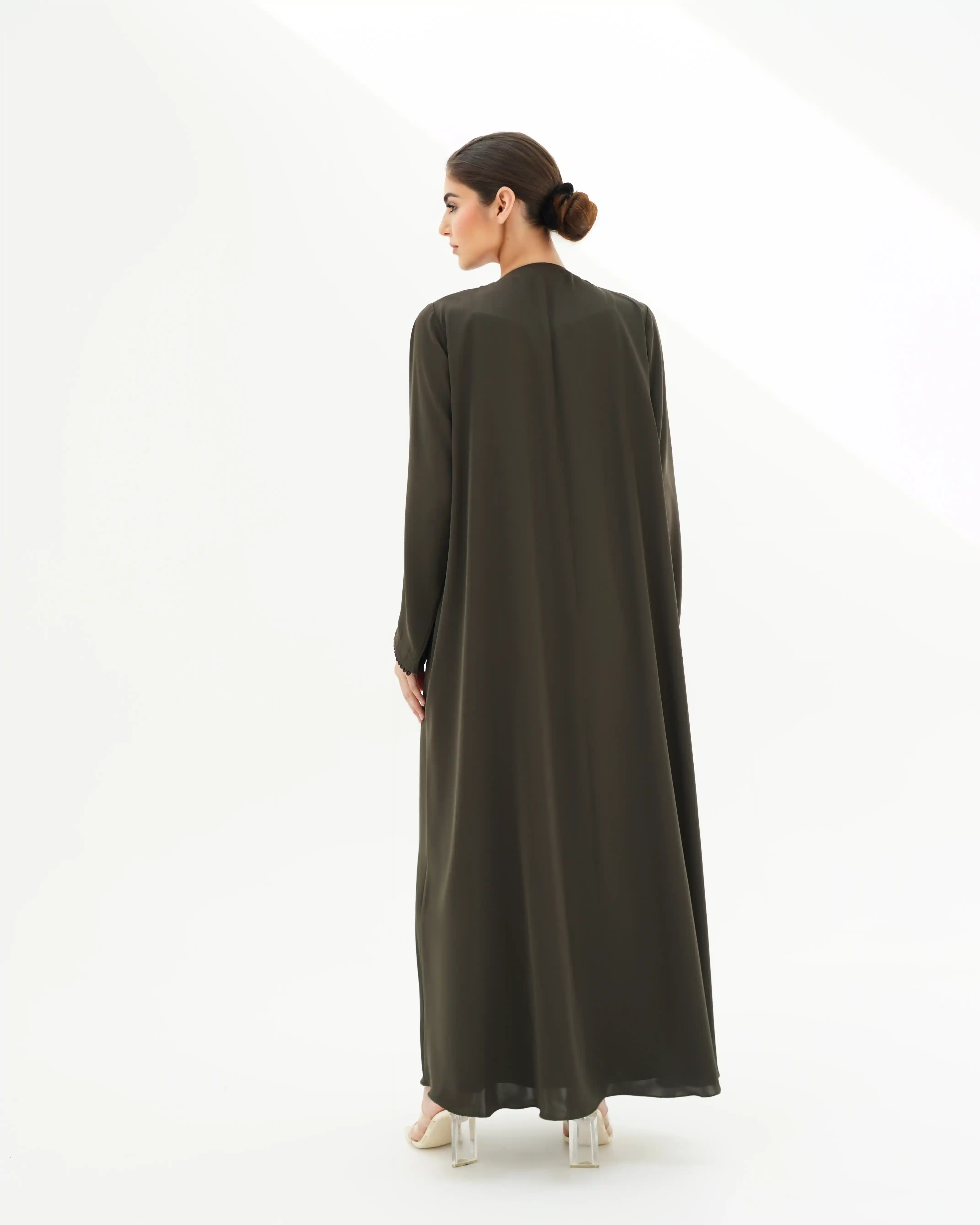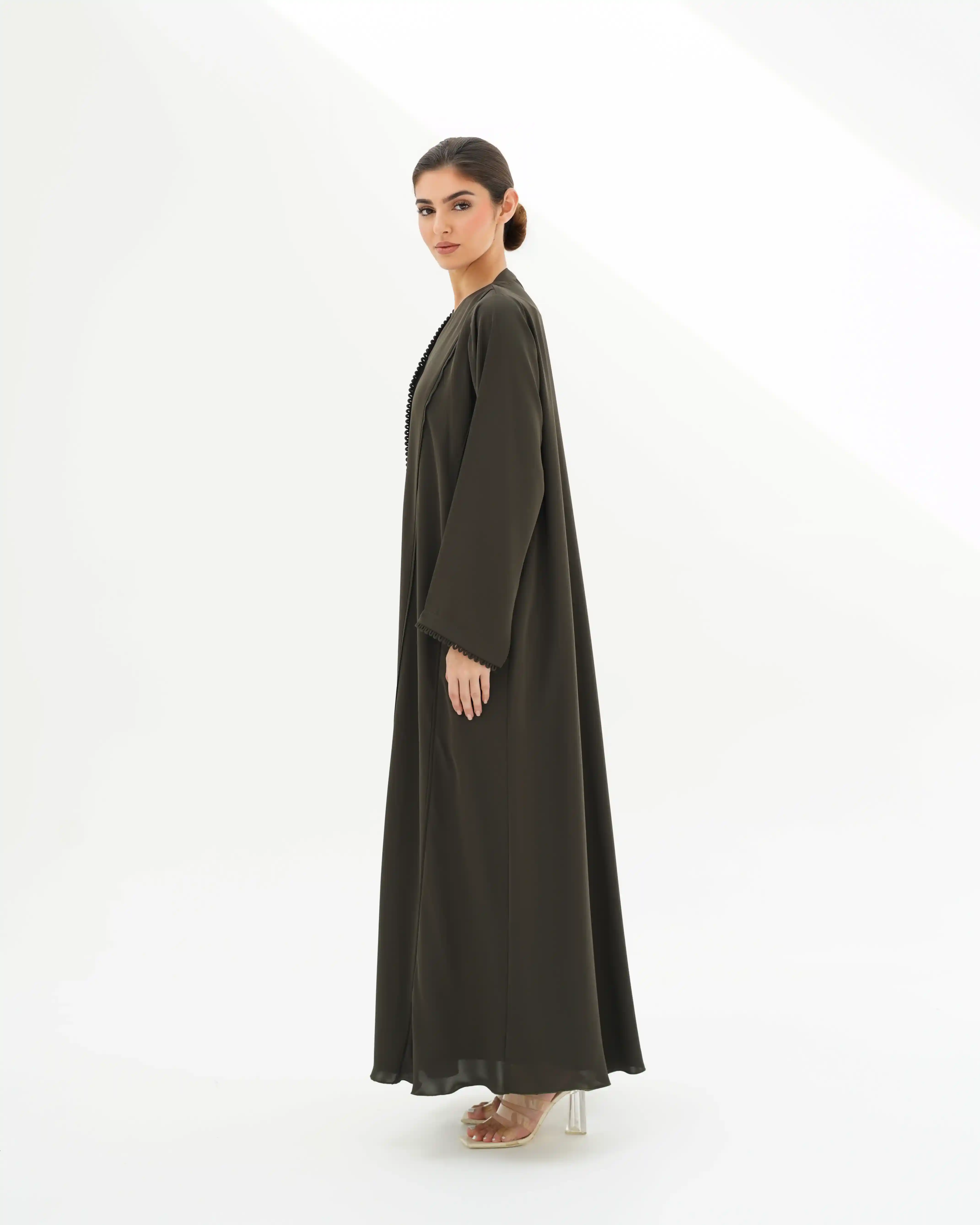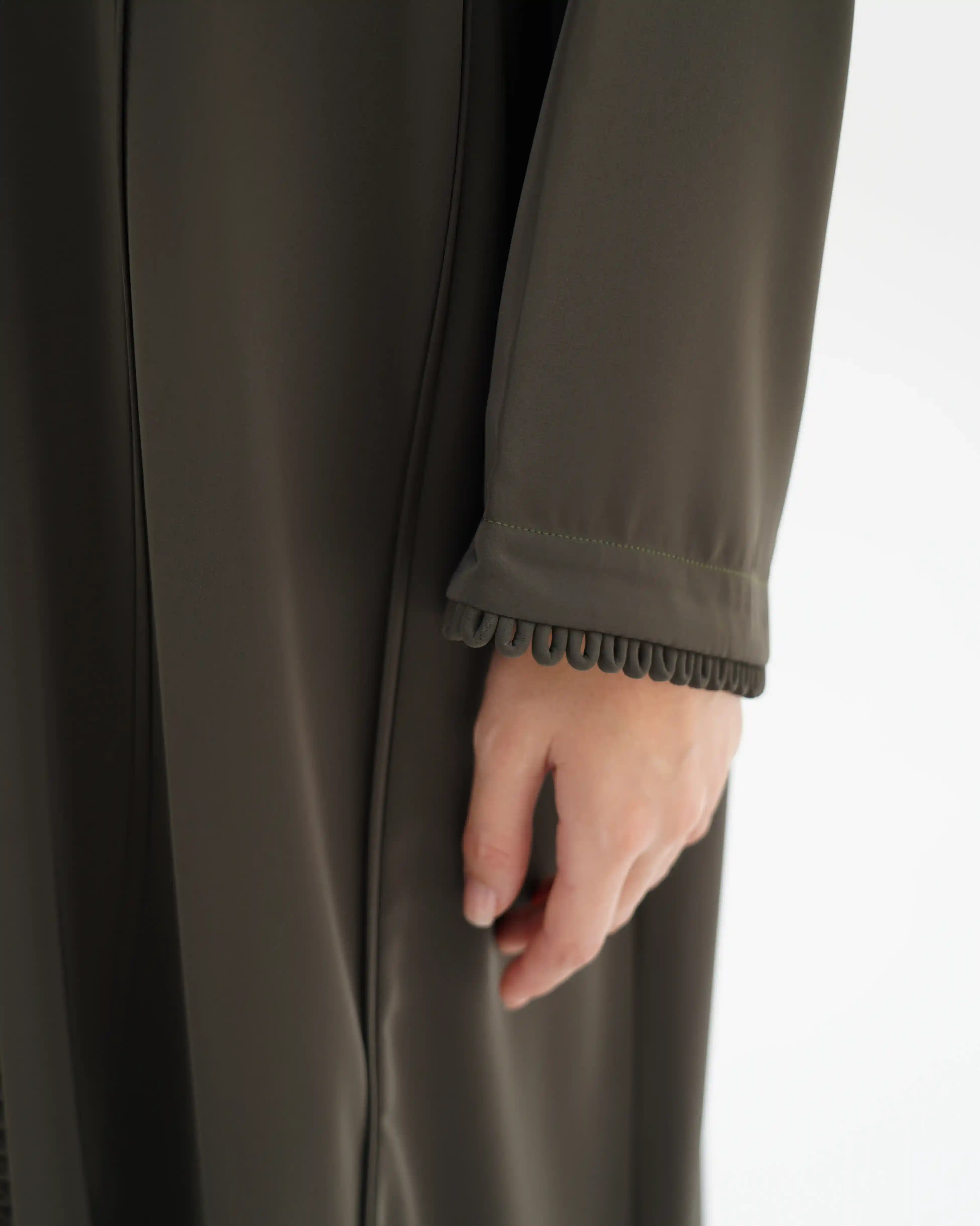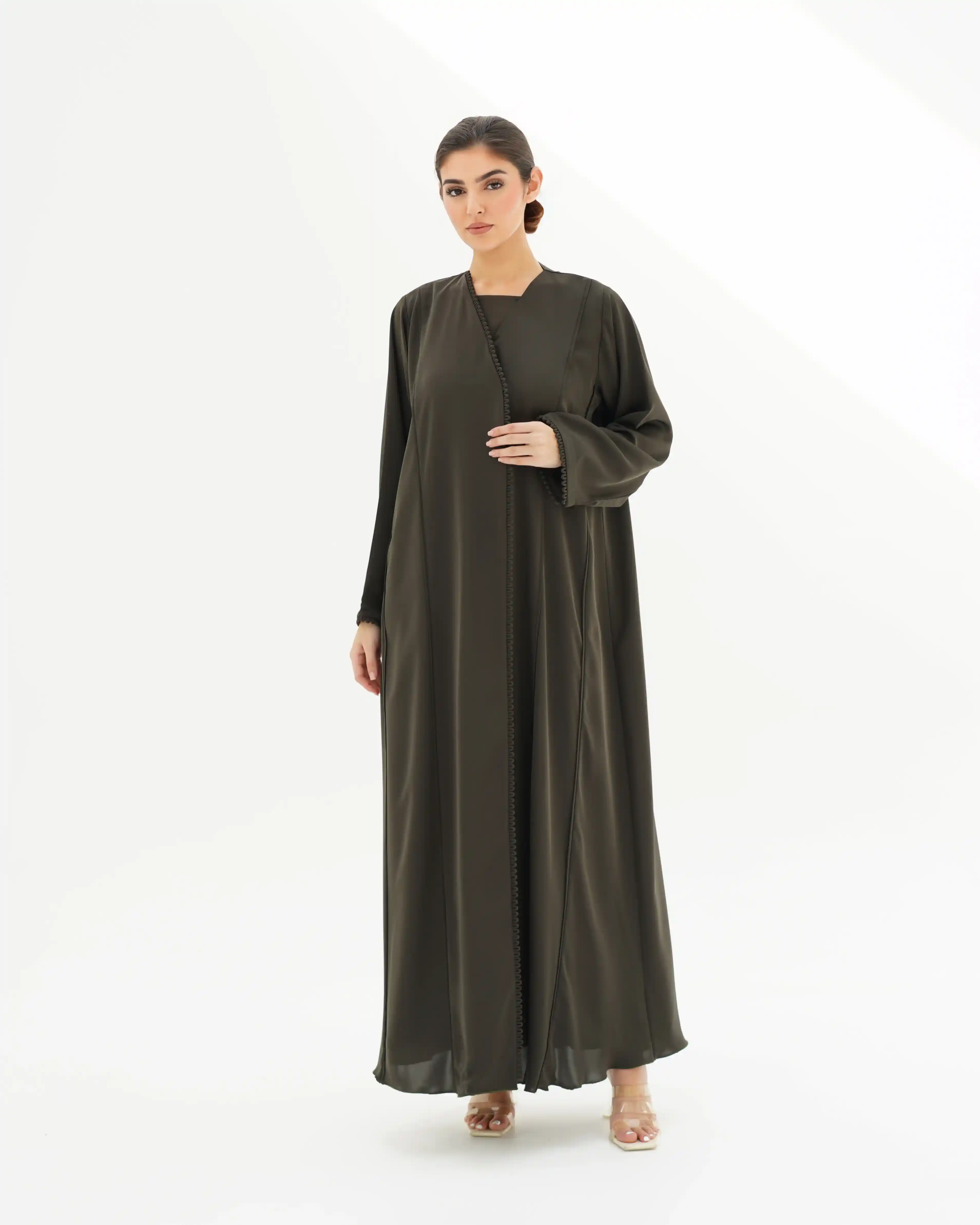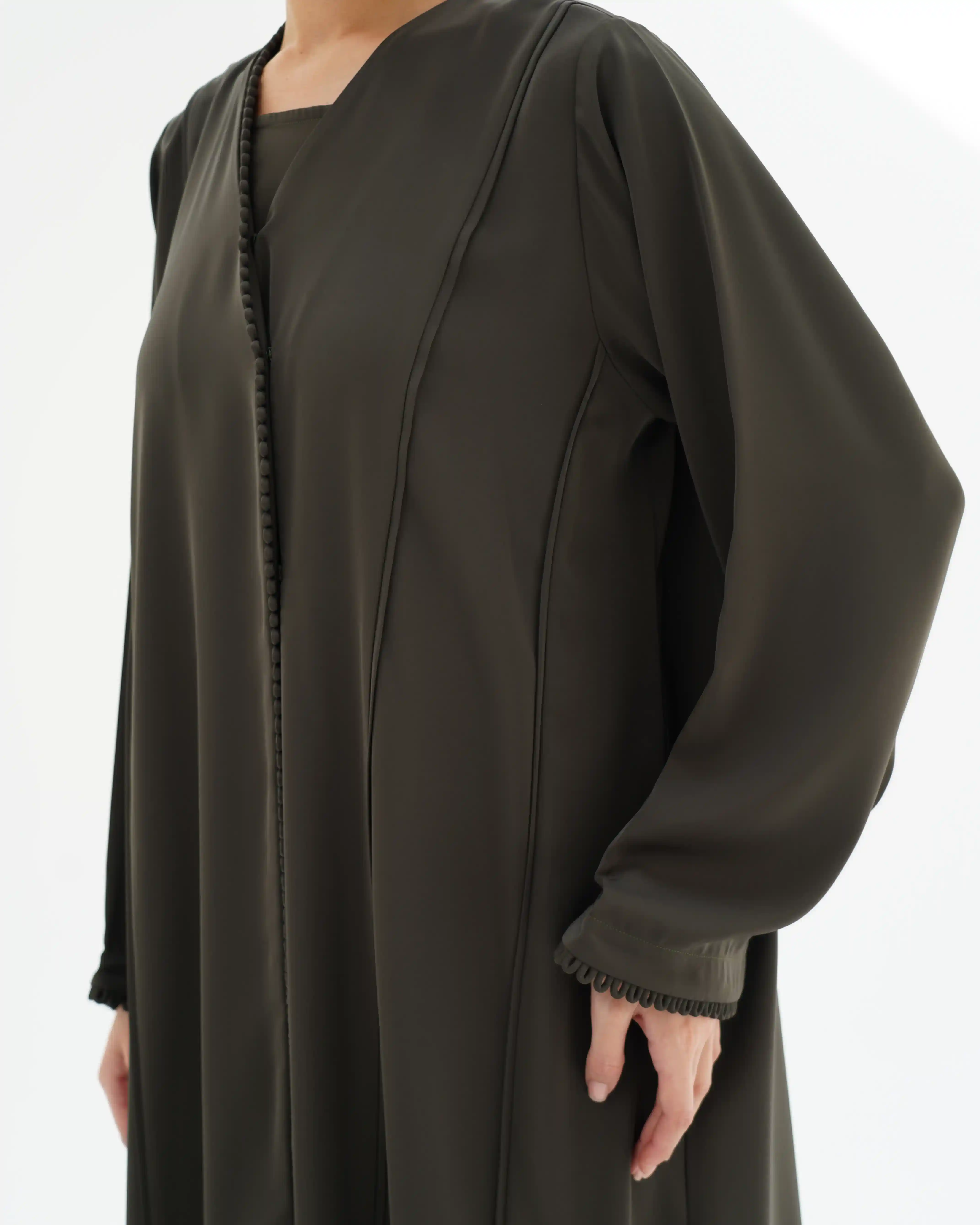 عباية مستقيمة منسدلة بتصميم نقي يعكس أناقة هادئة، تأتي بقصّة مستقيمة تنسدل بخفة لتعزز طول وأناقة الخط العام. من قماش البريميوم كريب بملمس ناعم. تتميّز بياقة على شكل V تنطلق تموّج انسيابي يشبه نصف دائرة منحنية على جانب واحد، تبدأ من أعلى الياقة وتمتد بانسيابية حتى أسفل العباية، كخط ناعم يخلق توازنًا بصريًا غير متماثل بأسلوب مدروس. يرافقها امتداد خطّين طوليين يعززان الانسياب ويبرز استقامة التصميم. تكتمل الإطلالة بطرحة سادة تتوسط أطرافها نفس الحركة المنحنية، لتعيد صدى التفاصيل بذوق هادئ ومتناغم.