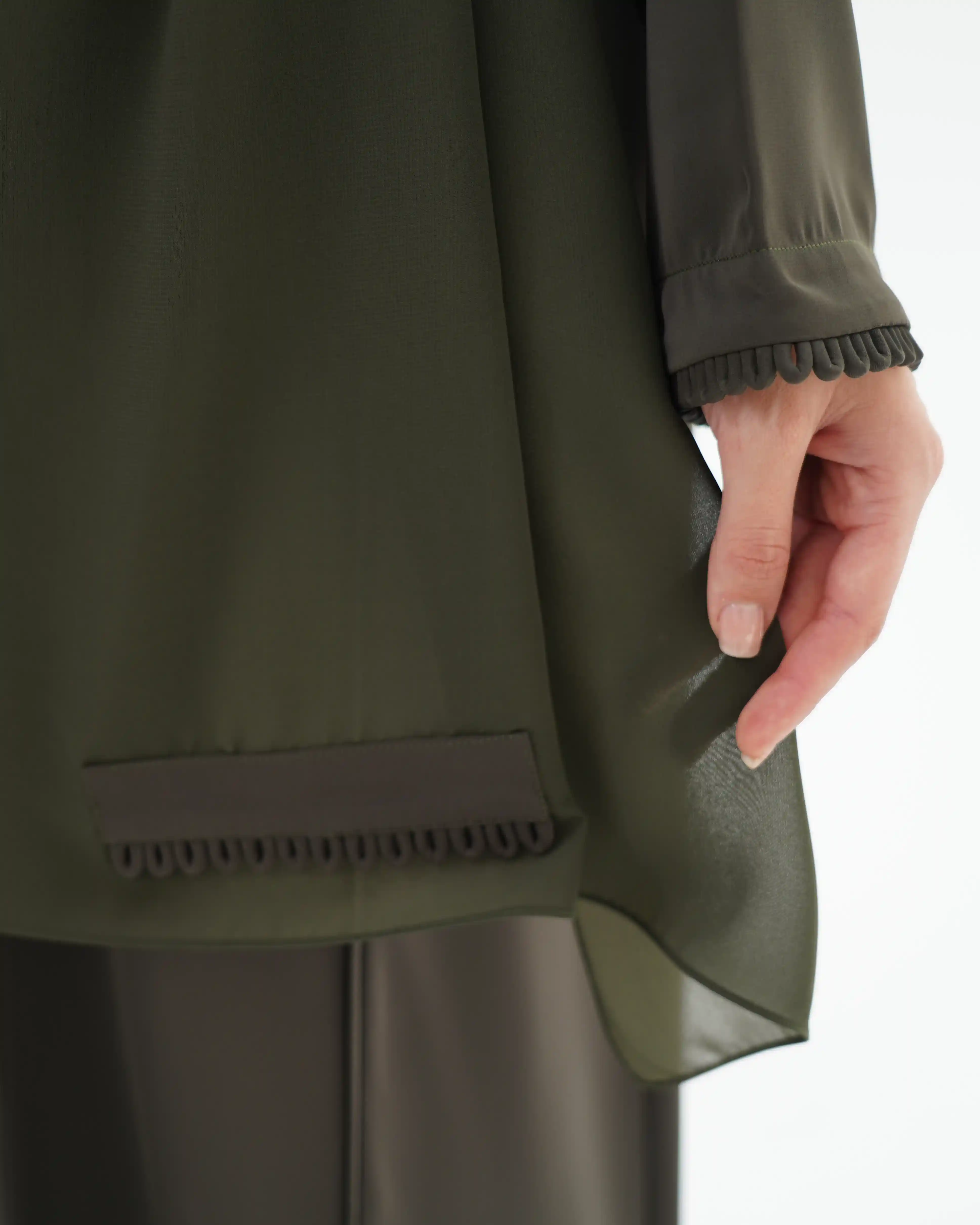 • أكمام سادة بقصة نظيفة، تنتهي بحافة تحمل نفس الإيقاع المنحني بشكل متناغم.
