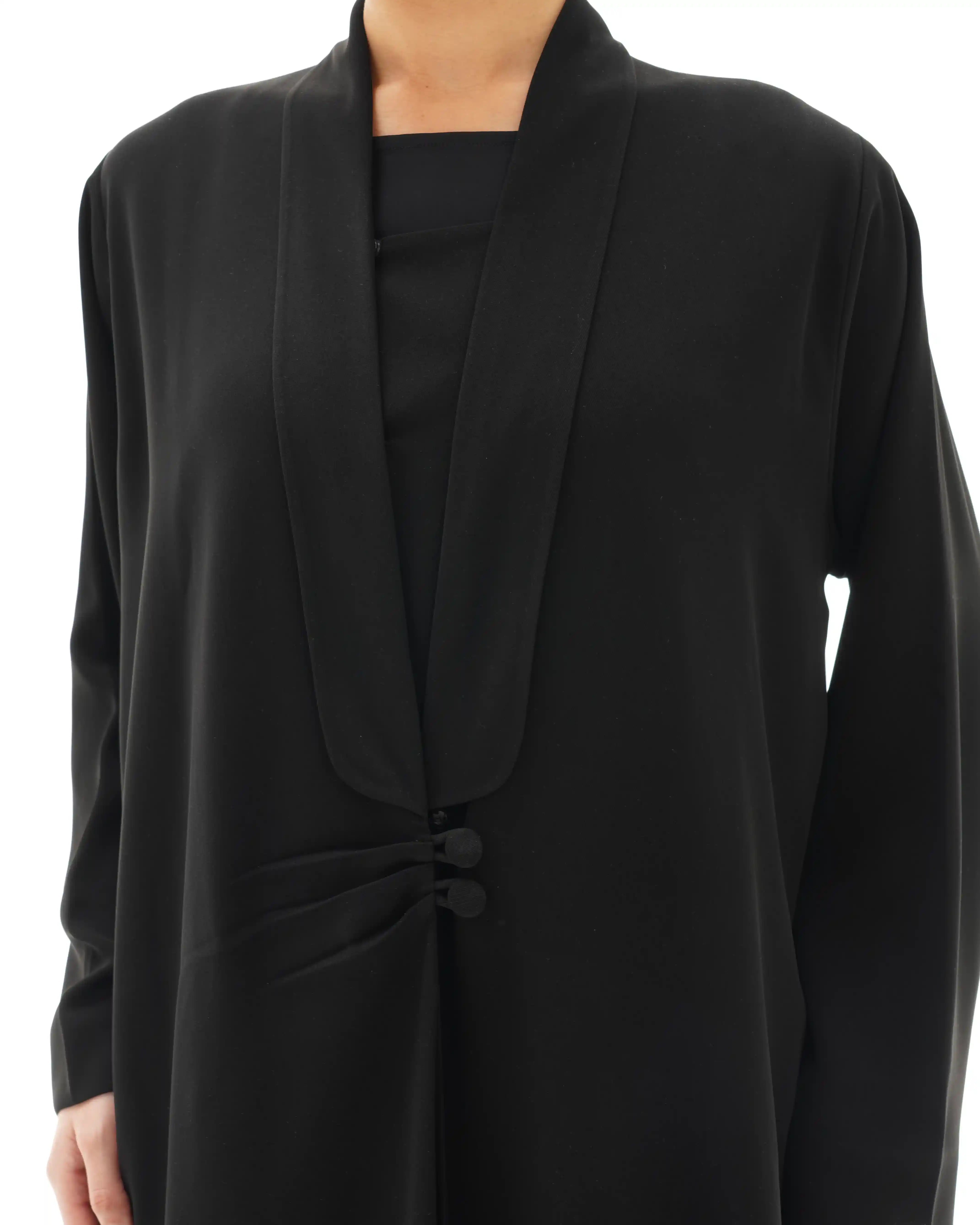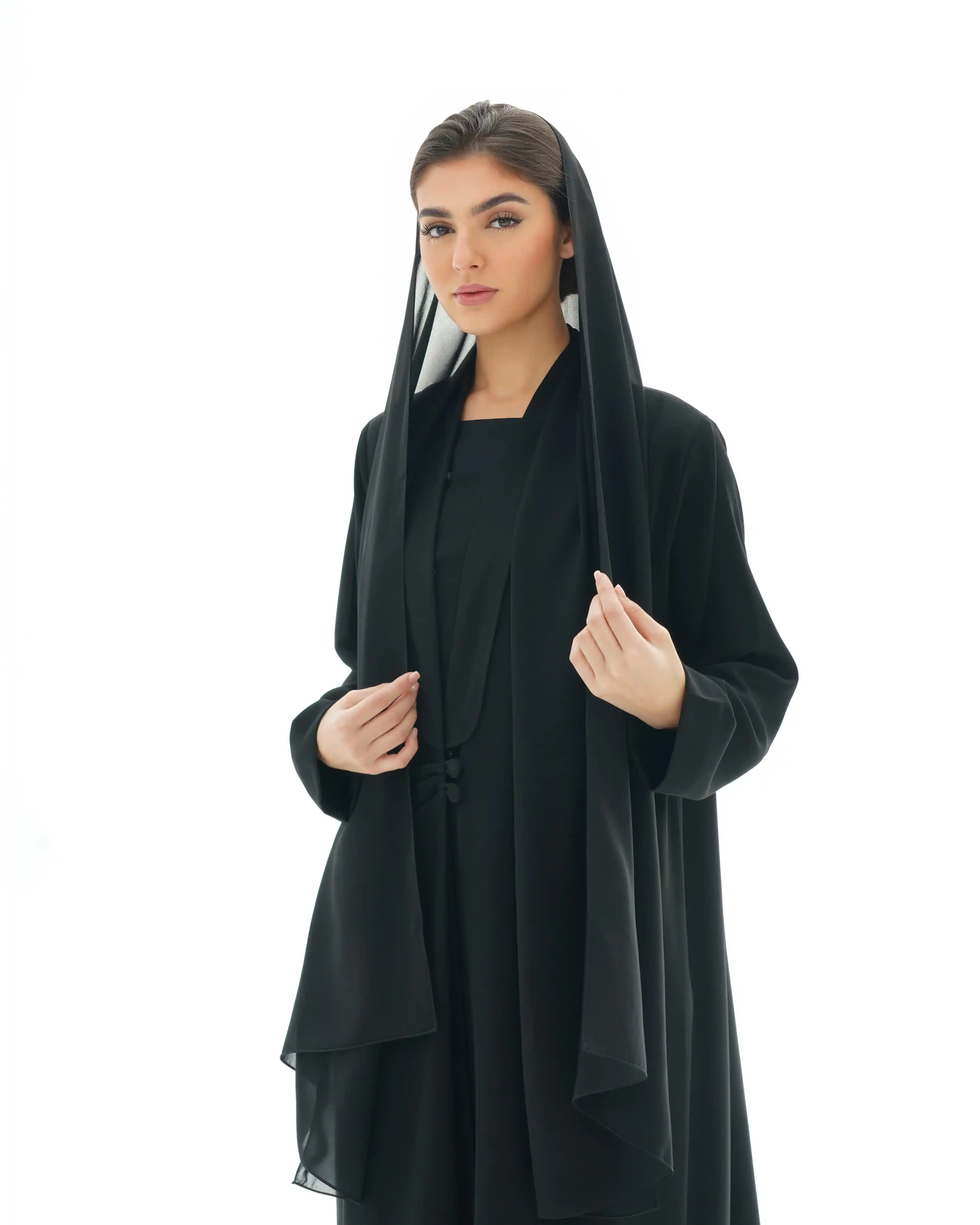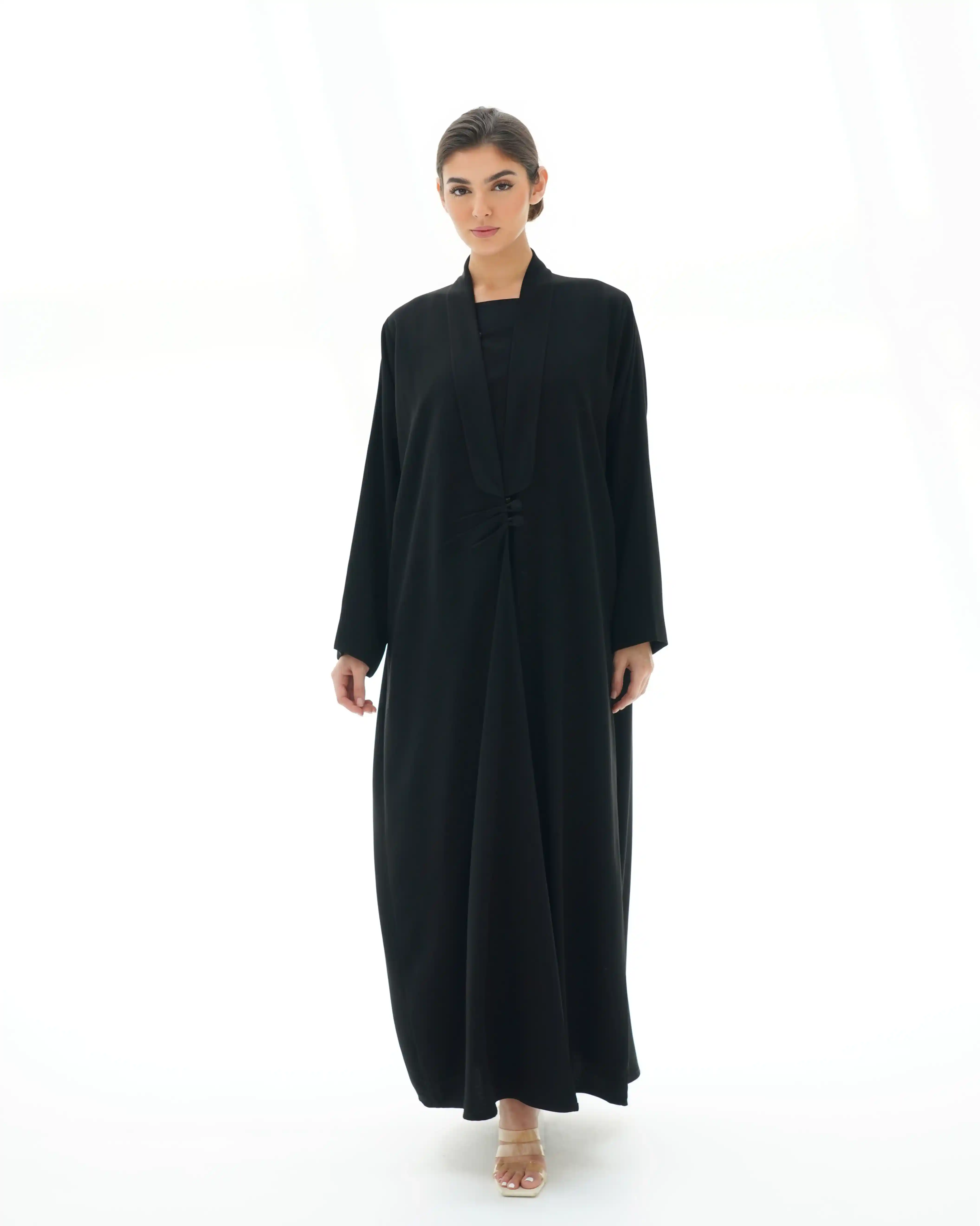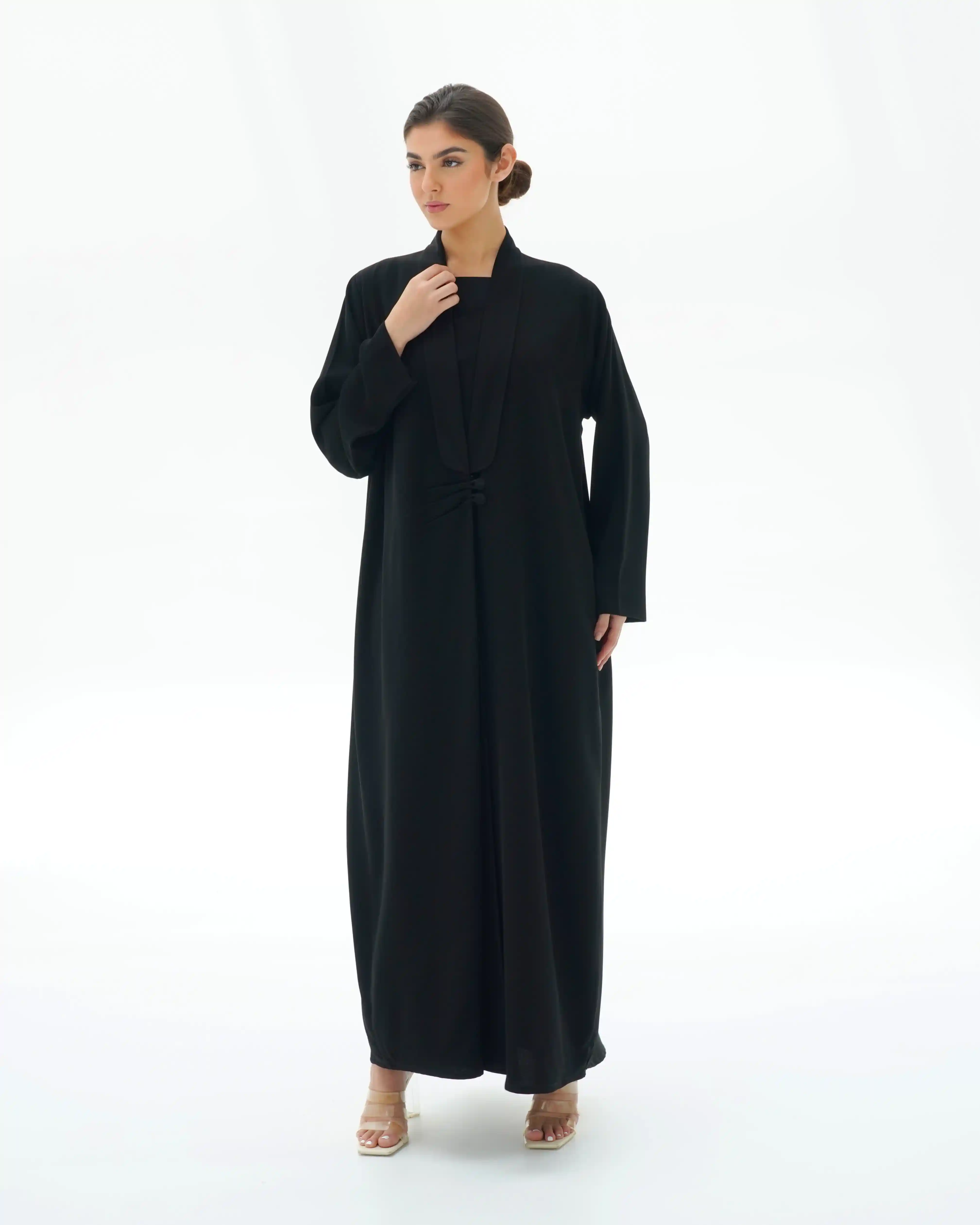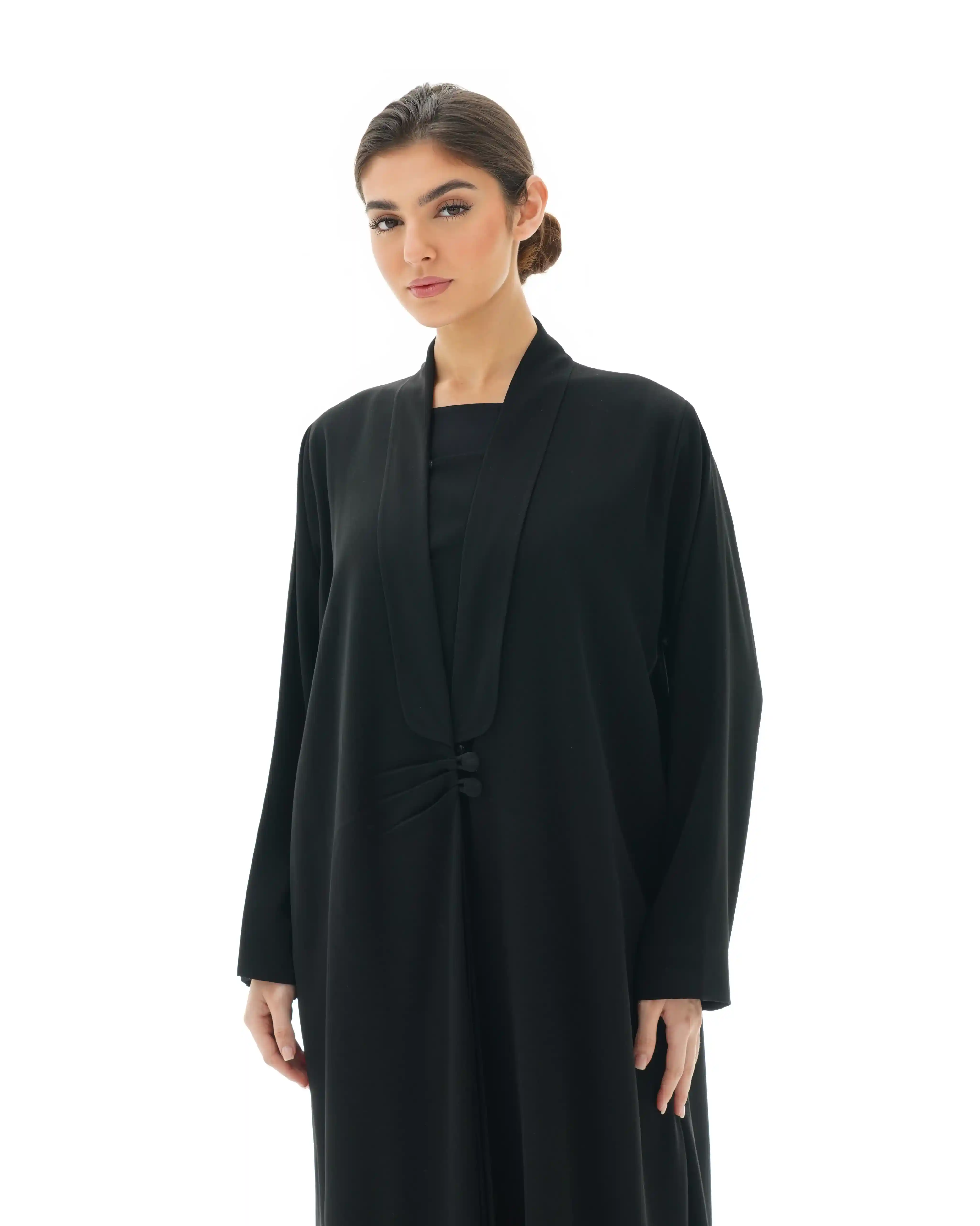 عباية تنسدل بهدوء راقٍ، بقصّة مستقيمة تمنح انسيابية طبيعية وحضورًا متزنًا. من قماش سلكتف كريب بملمس ناعم وانسدال سلس يعكس فخامة هادئة في كل حركة. تتميّز بياقة مبتكرة على شكل V تتكوّن من ثنيات ناعمة تبدأ من أعلى الرقبة وتمتد بانسيابية حتى منتصف الصدر، حيث تلتقي بإغلاق أمامي فني يرتكز على زرين مكسوّين بنفس القماش. تتجمع القماشة حول منطقة الإغلاق بثنيات مدروسة تمنح تدرجًا بصريًا ناعمًا يبرز مركز التصميم بأسلوب أنيق ومتوازن. تكتمل الإطلالة بطرحة سادة تعكس نقاء التصميم وتوازن تفاصيله.
