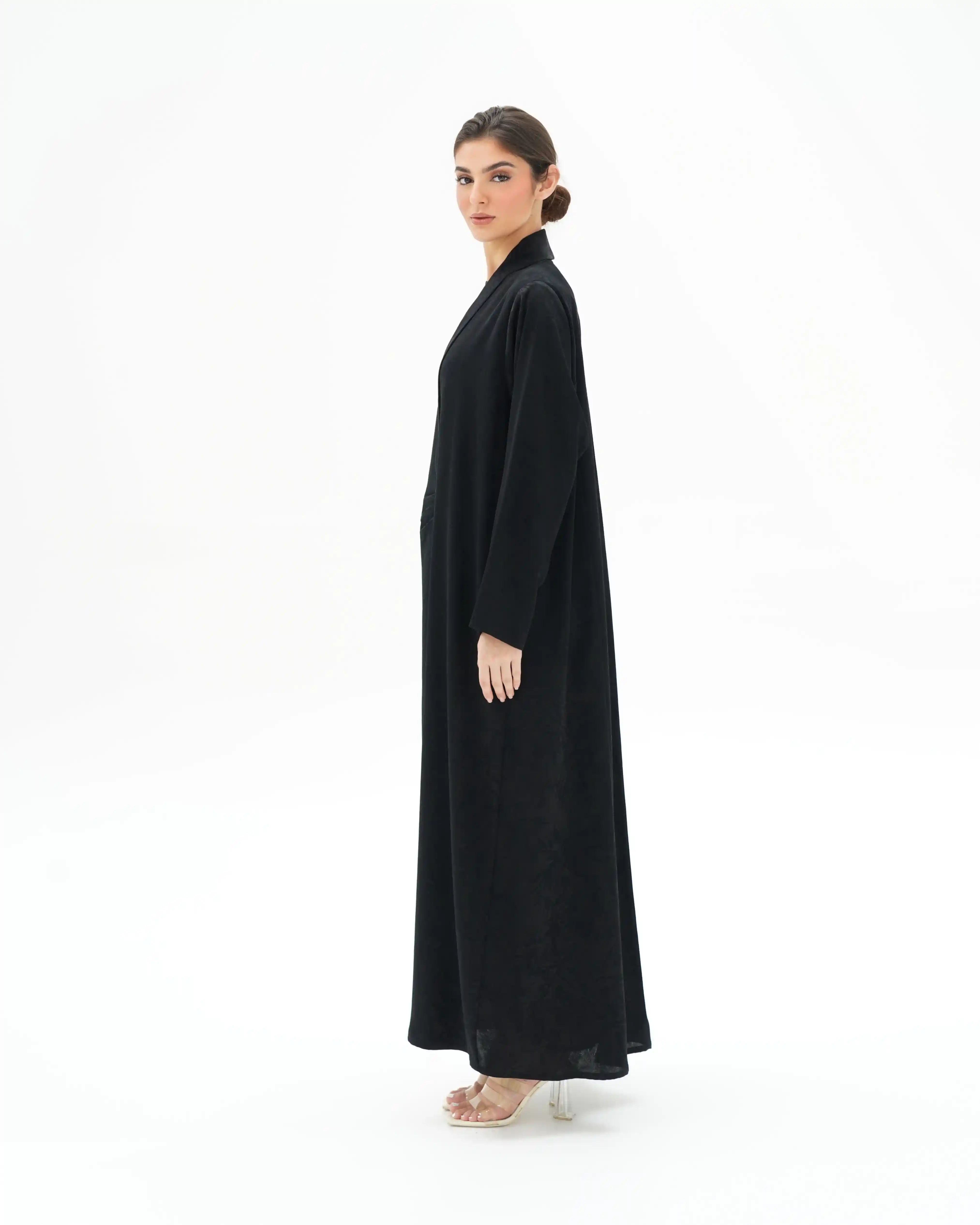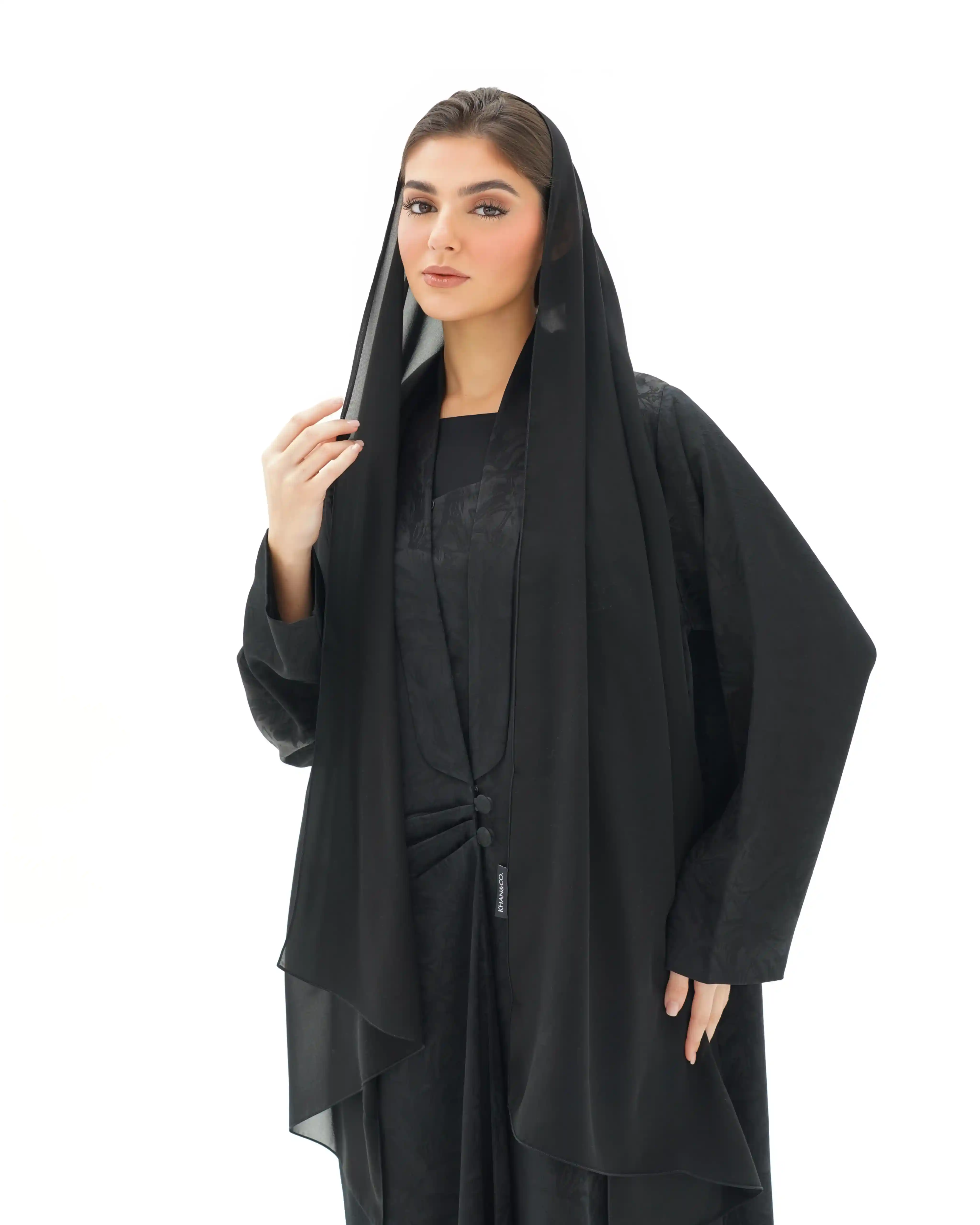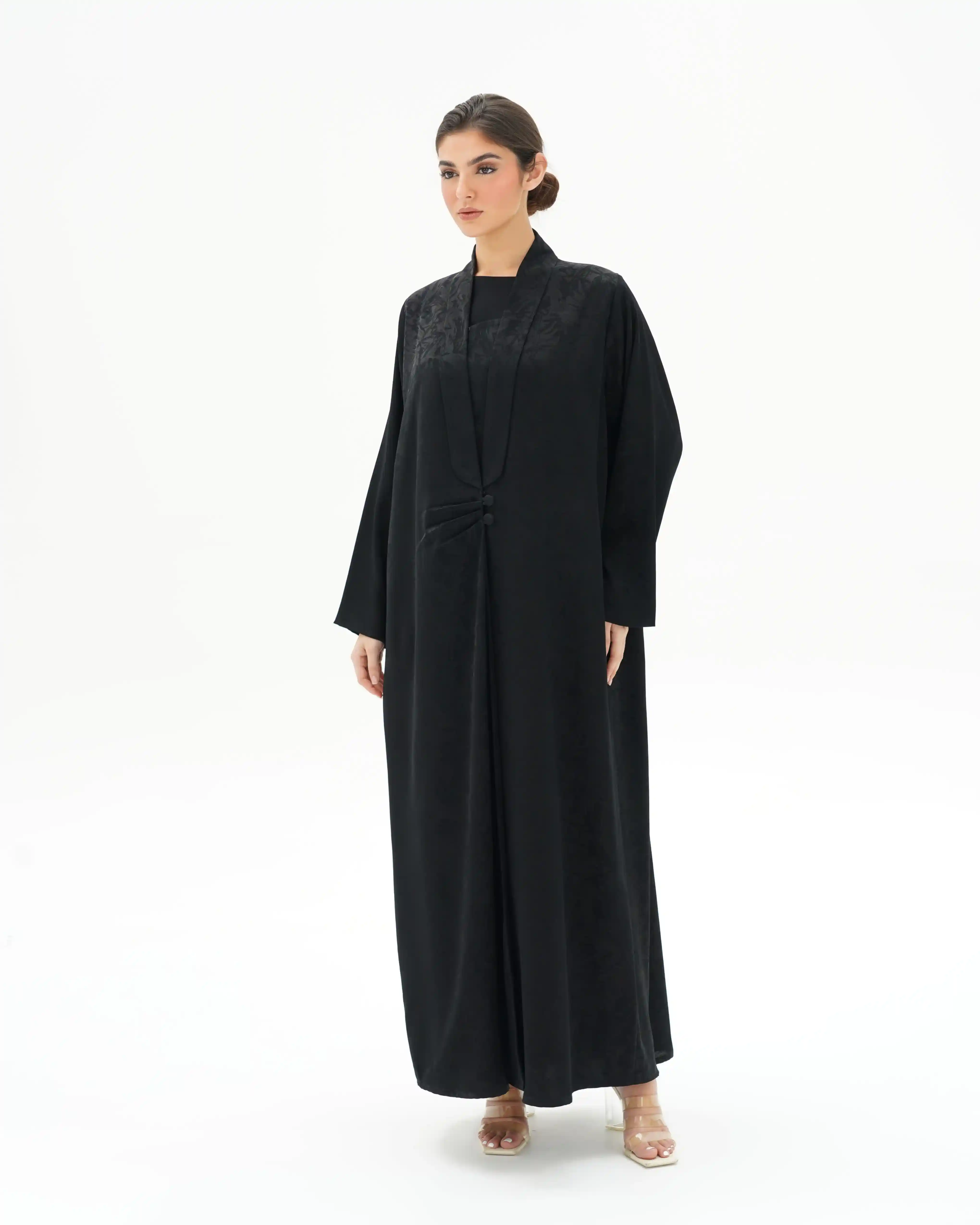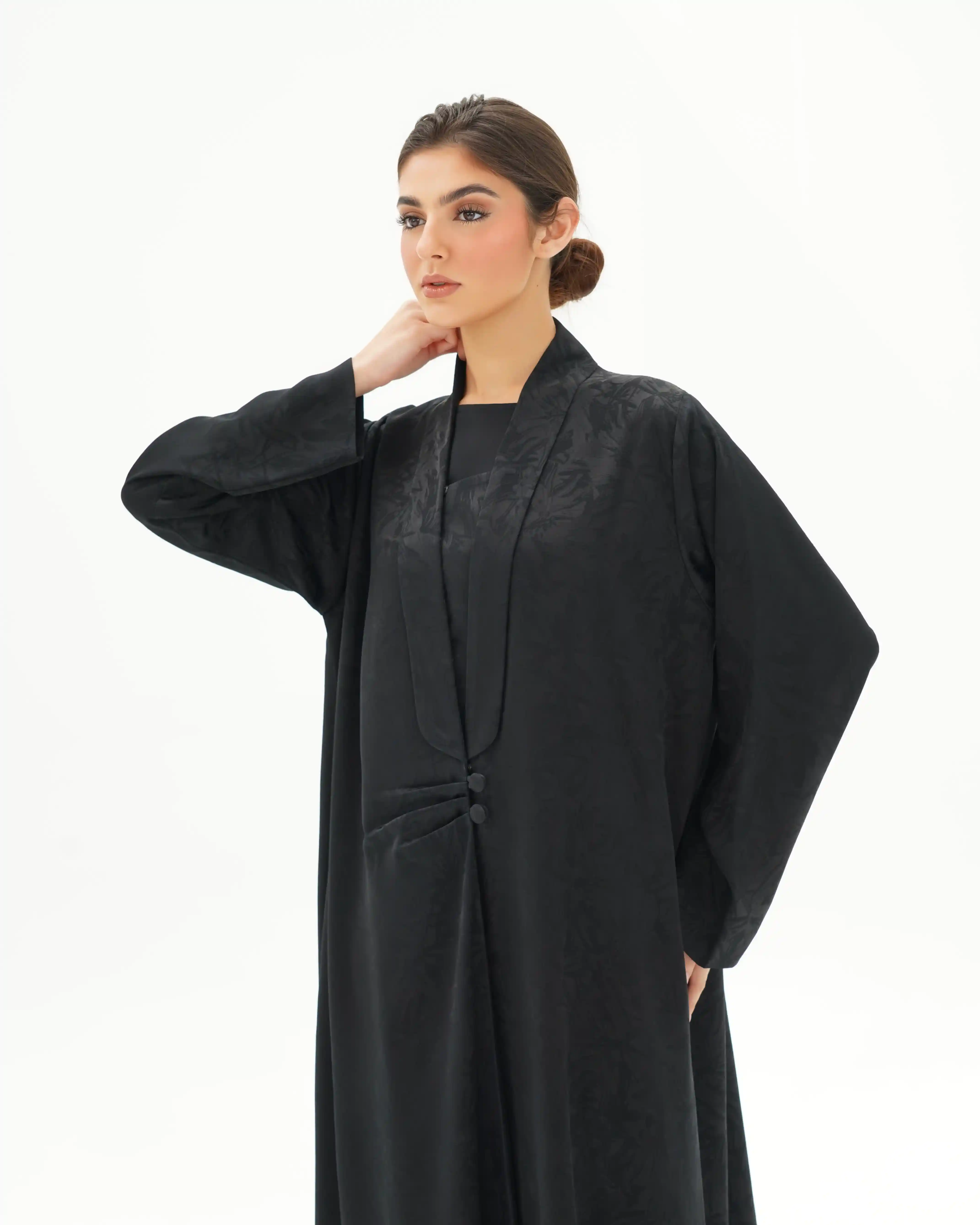 عباية تنسدل بهدوء راقٍ، بقصّة مستقيمة تمنح انسيابية طبيعية وحضورًا متزنًا. من قماش جاكارد فاخر بنقوش بارزة هادئة تمنح عمقًا بصريًا وبريقًا يعكس فخامة صامتة. تتميّز بياقة مبتكرة على شكل V تتكوّن من ثنيات ناعمة تبدأ من أعلى الرقبة وتمتد بانسيابية حتى منتصف الصدر، حيث تلتقي بإغلاق أمامي فني يرتكز على زرين مكسوّين بنفس القماش. تتجمع القماشة حول منطقة الإغلاق بثنيات مدروسة تمنح تدرجًا بصريًا ناعمًا يبرز مركز التصميم بأسلوب أنيق ومتوازن. تكتمل الإطلالة بطرحة سادة تعكس نقاء التصميم وتوازن تفاصيله.