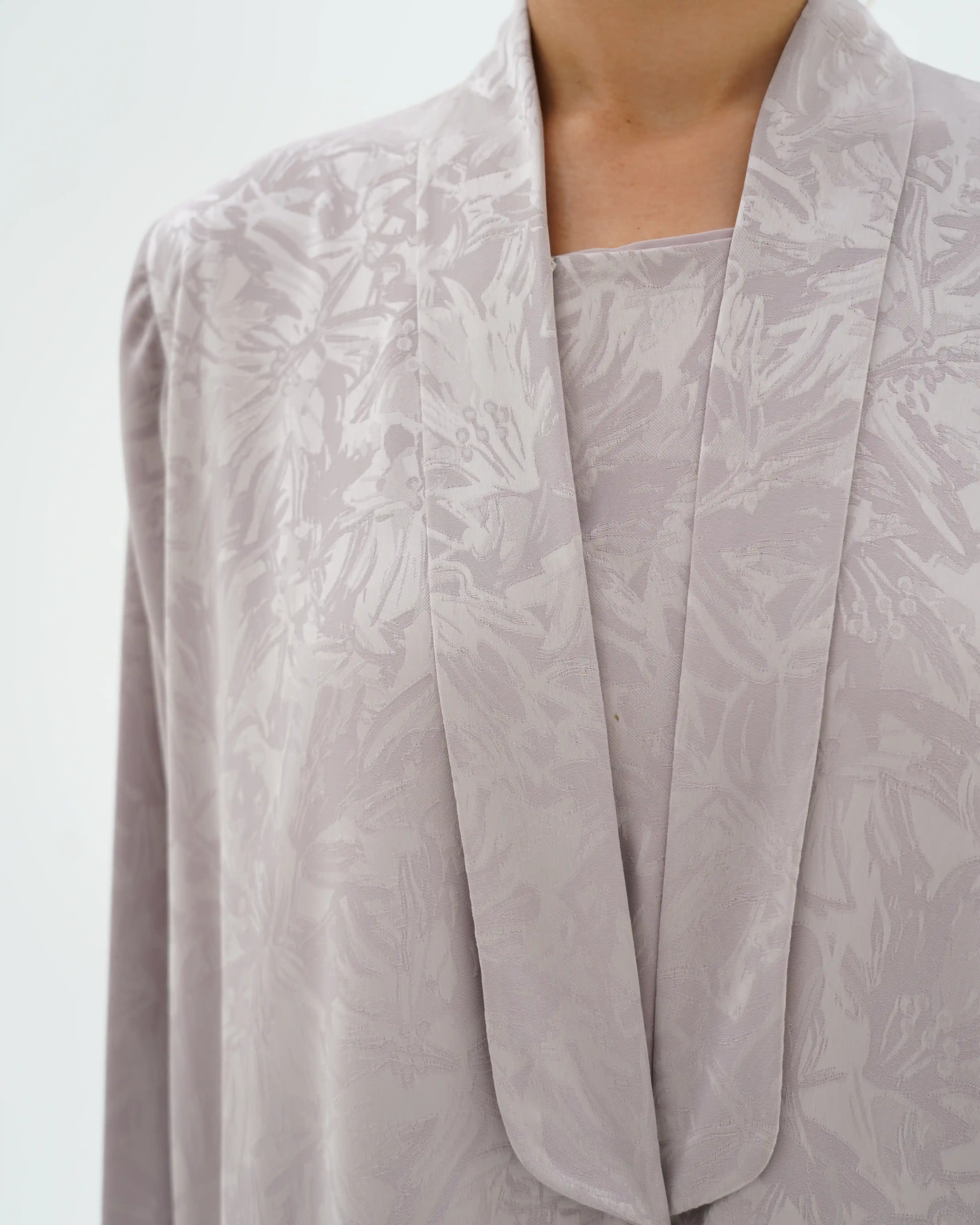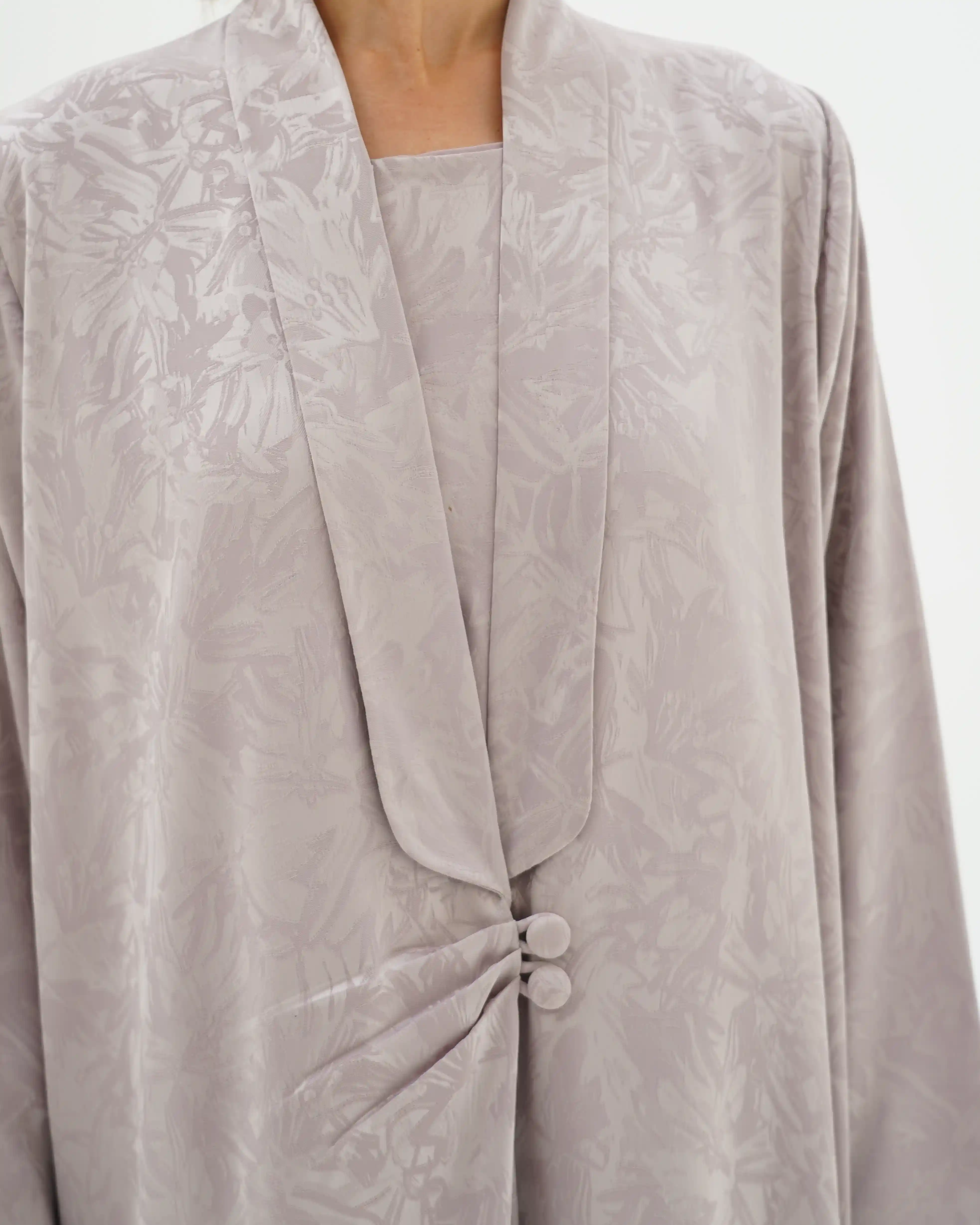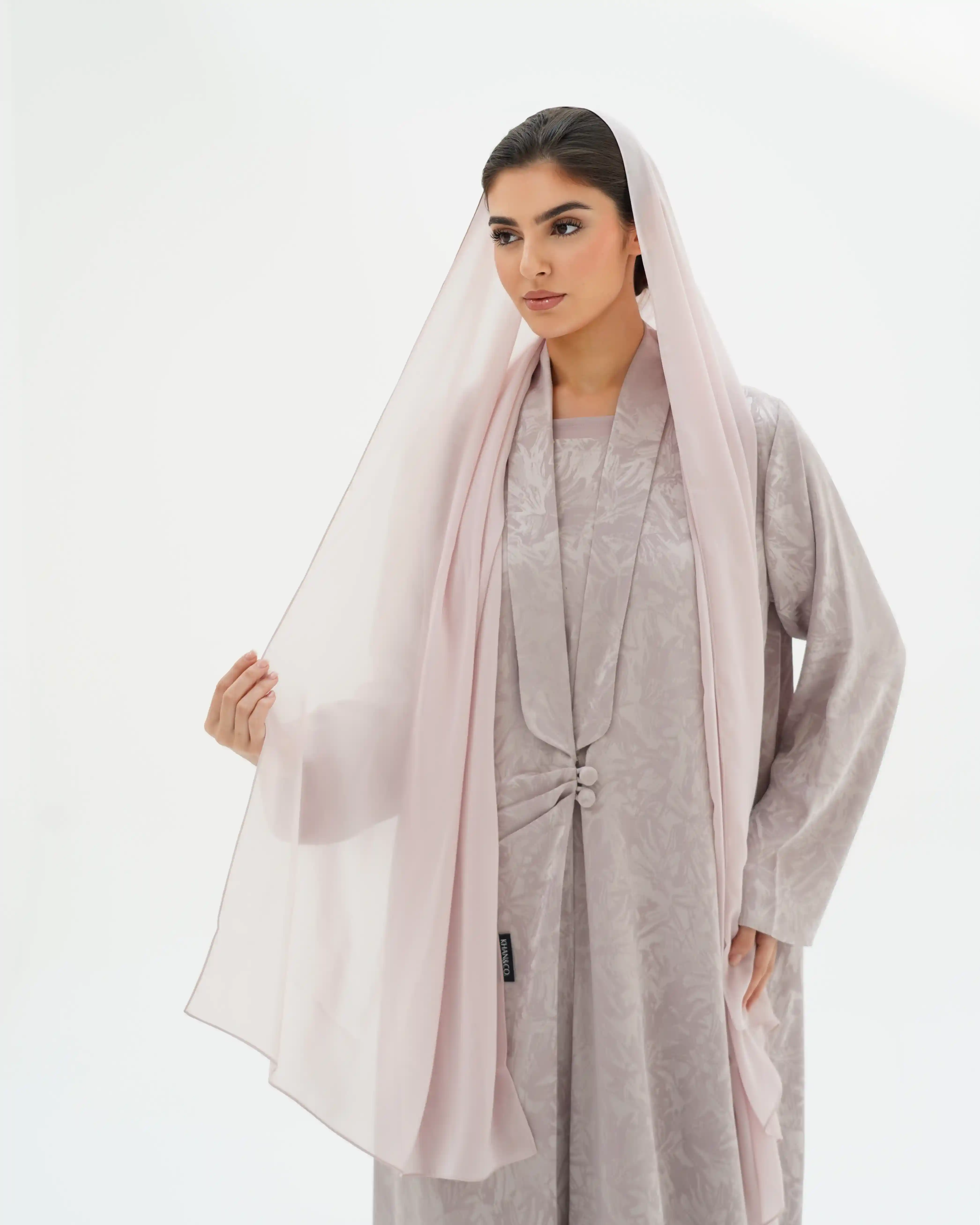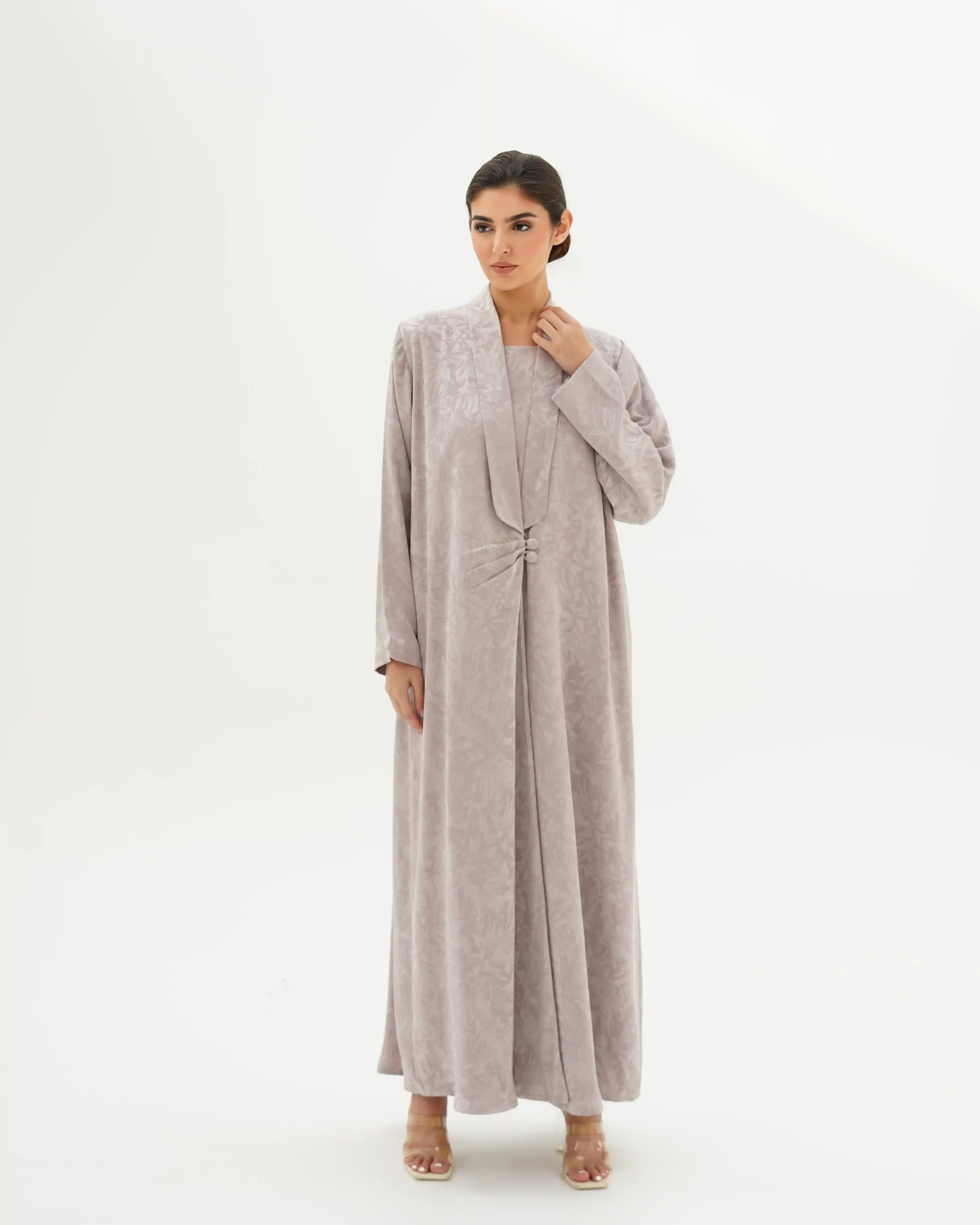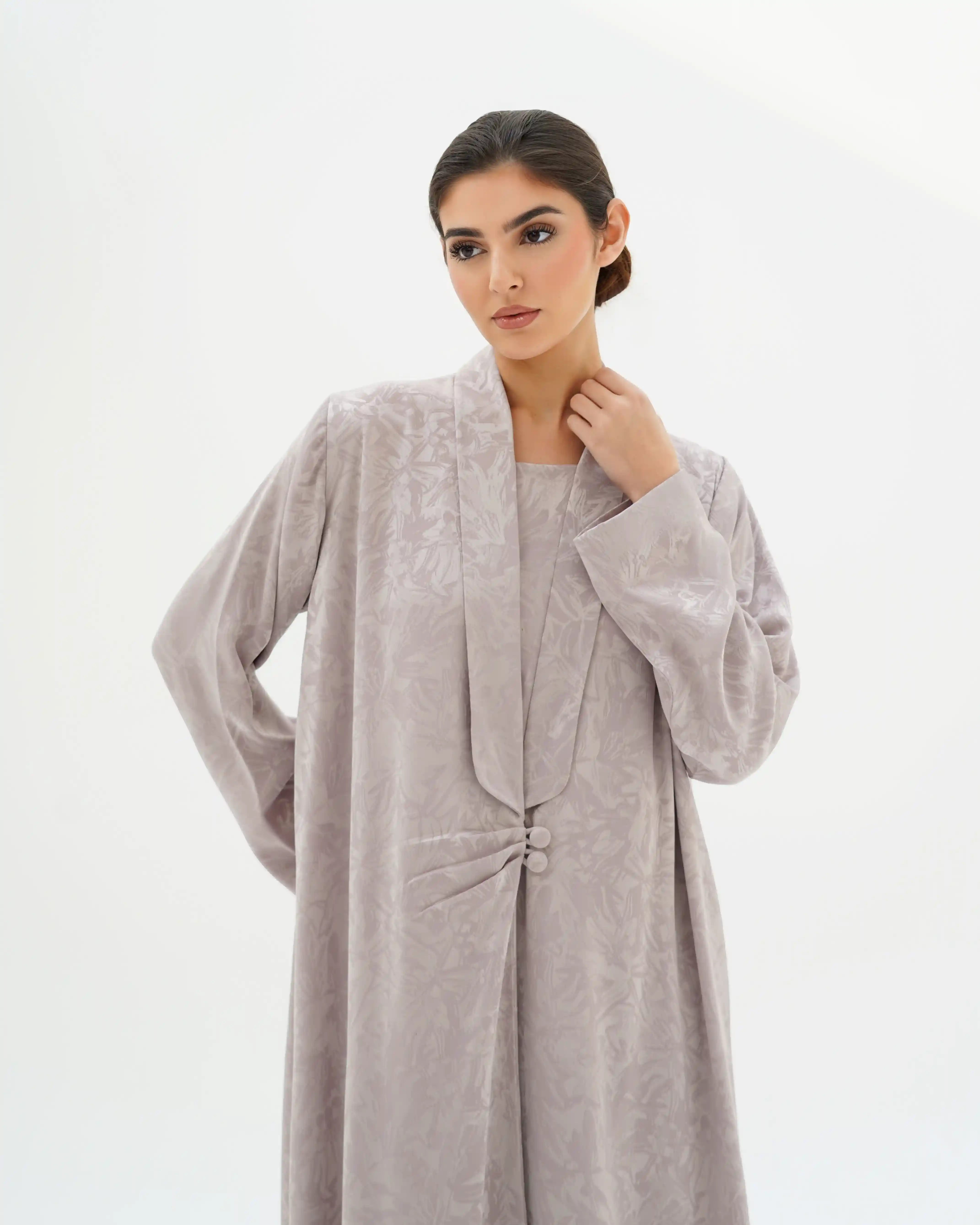 عباية تنسدل بهدوء راقٍ، بقصّة مستقيمة تمنح انسيابية طبيعية وحضورًا متزنًا. من قماش جاكارد فاخر بنقوش بارزة هادئة تمنح عمقًا بصريًا وبريقًا يعكس فخامة صامتة. تتميّز بياقة مبتكرة على شكل V تتكوّن من ثنيات ناعمة تبدأ من أعلى الرقبة وتمتد بانسيابية حتى منتصف الصدر، حيث تلتقي بإغلاق أمامي فني يرتكز على زرين مكسوّين بنفس القماش. تتجمع القماشة حول منطقة الإغلاق بثنيات مدروسة تمنح تدرجًا بصريًا ناعمًا يبرز مركز التصميم بأسلوب أنيق ومتوازن. تكتمل الإطلالة بطرحة سادة تعكس نقاء التصميم وتوازن تفاصيله.