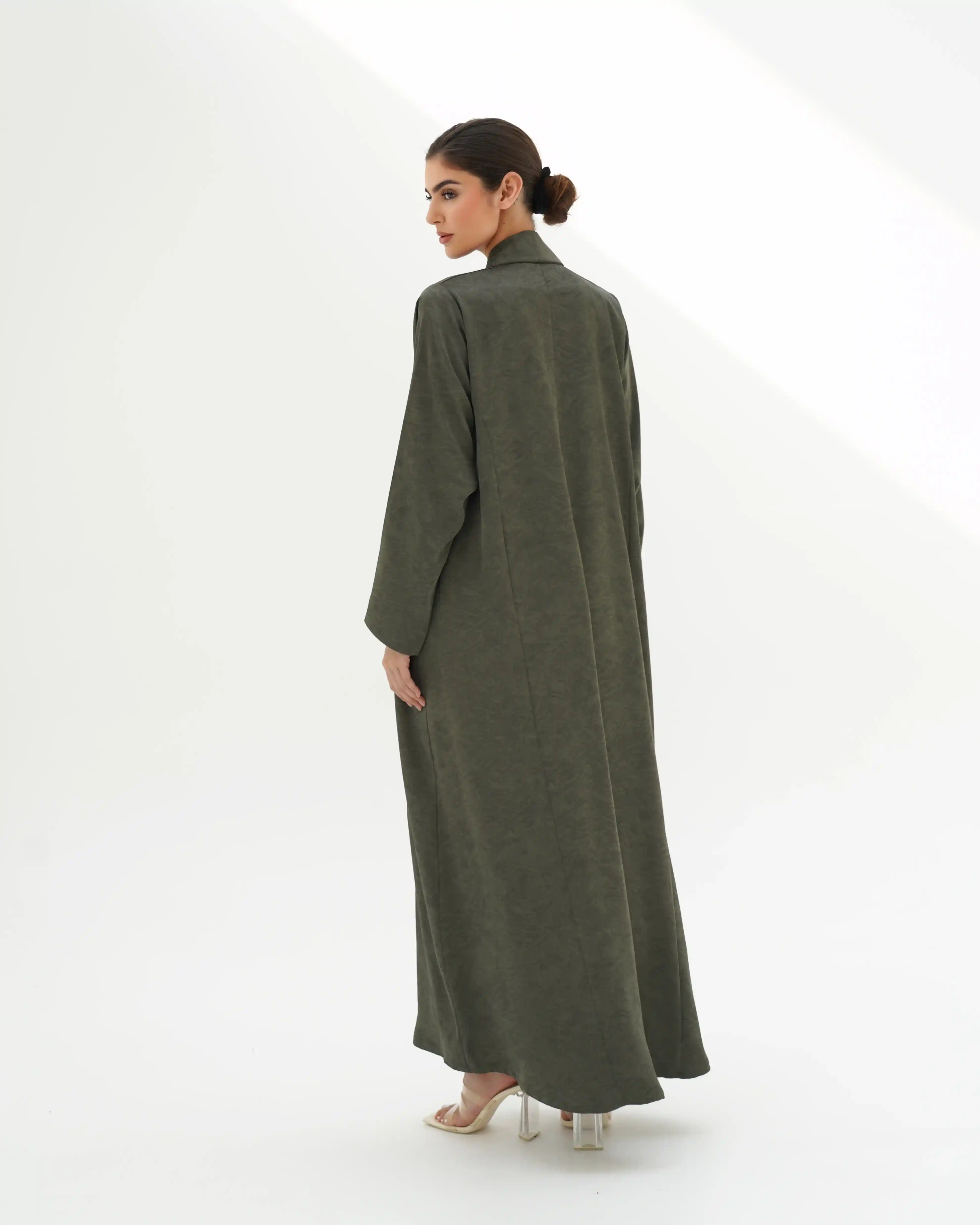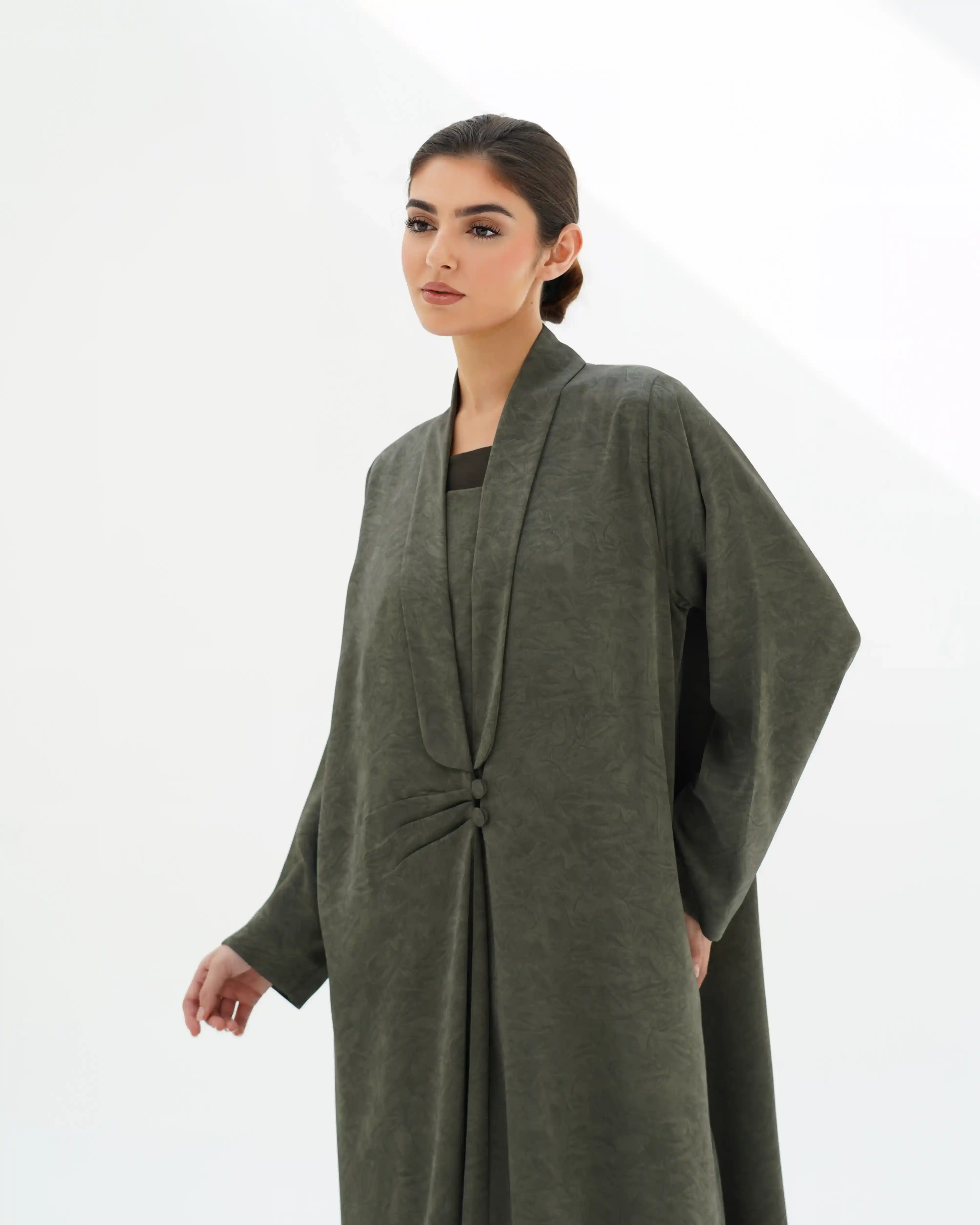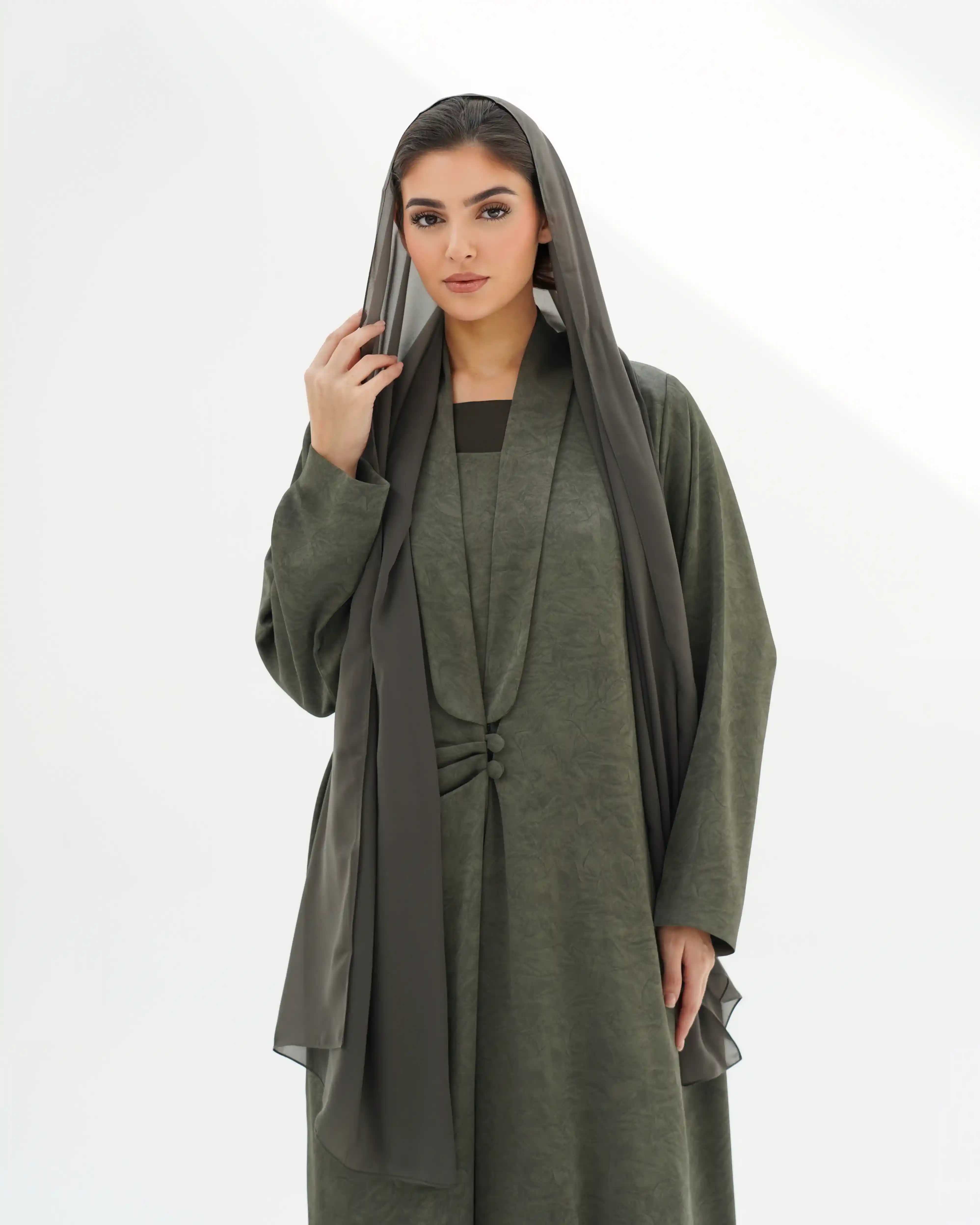 عباية تنسدل بهدوء راقٍ، بقصّة مستقيمة تمنح انسيابية طبيعية وحضورًا متزنًا. من قماش مست فويل بلمسة مطفية تموجات مموهة توحي بفخامة هادئة لا تُعلن نفسها، تتميّز بياقة مبتكرة على شكل V تتكوّن من ثنيات ناعمة تبدأ من أعلى الرقبة وتمتد بانسيابية حتى منتصف الصدر، حيث تلتقي بإغلاق أمامي فني يرتكز على زرين مكسوّين بنفس القماش. تتجمع القماشة حول منطقة الإغلاق بثنيات مدروسة تمنح تدرجًا بصريًا ناعمًا يبرز مركز التصميم بأسلوب أنيق ومتوازن. تكتمل الإطلالة بطرحة سادة تعكس نقاء التصميم وتوازن تفاصيله.