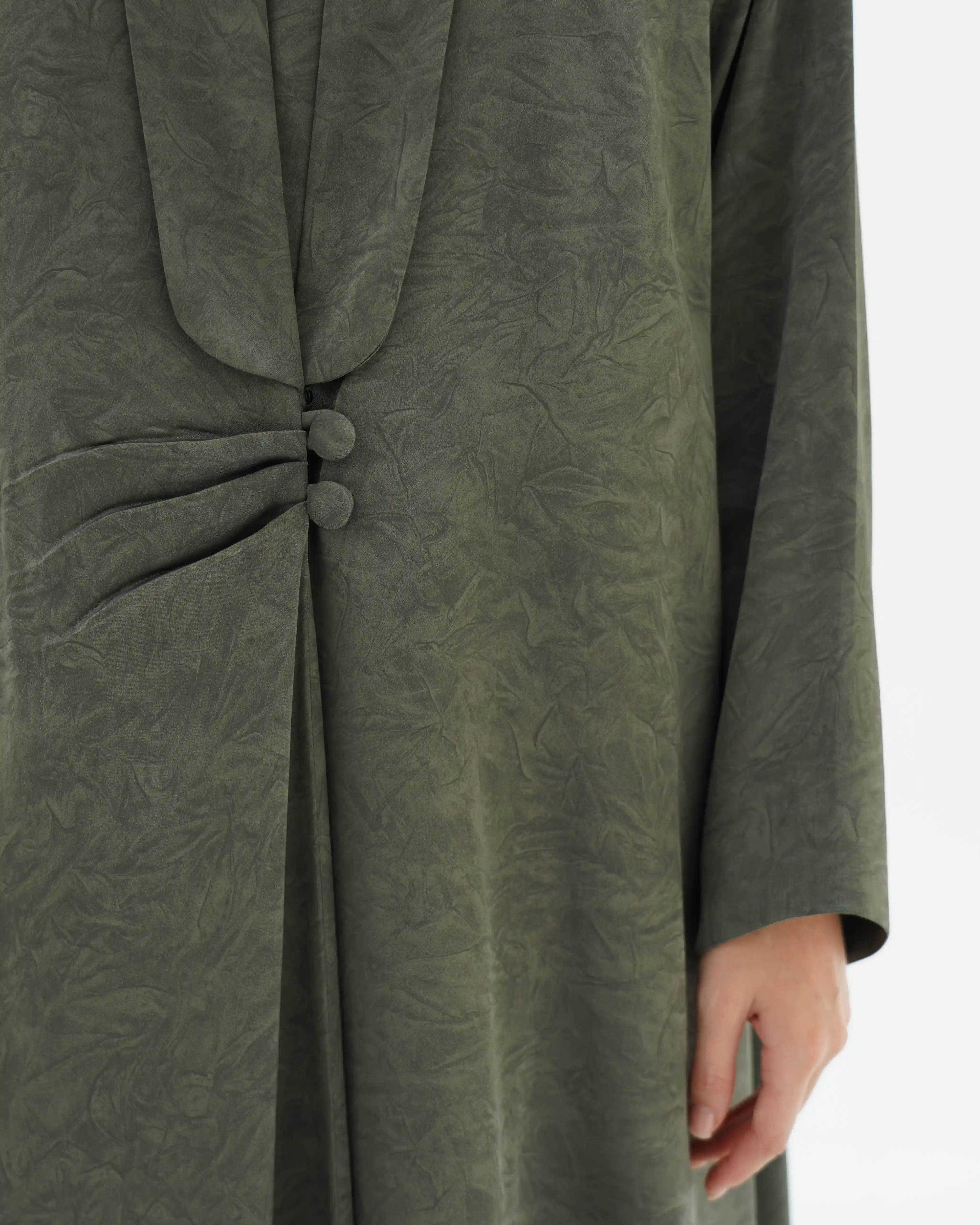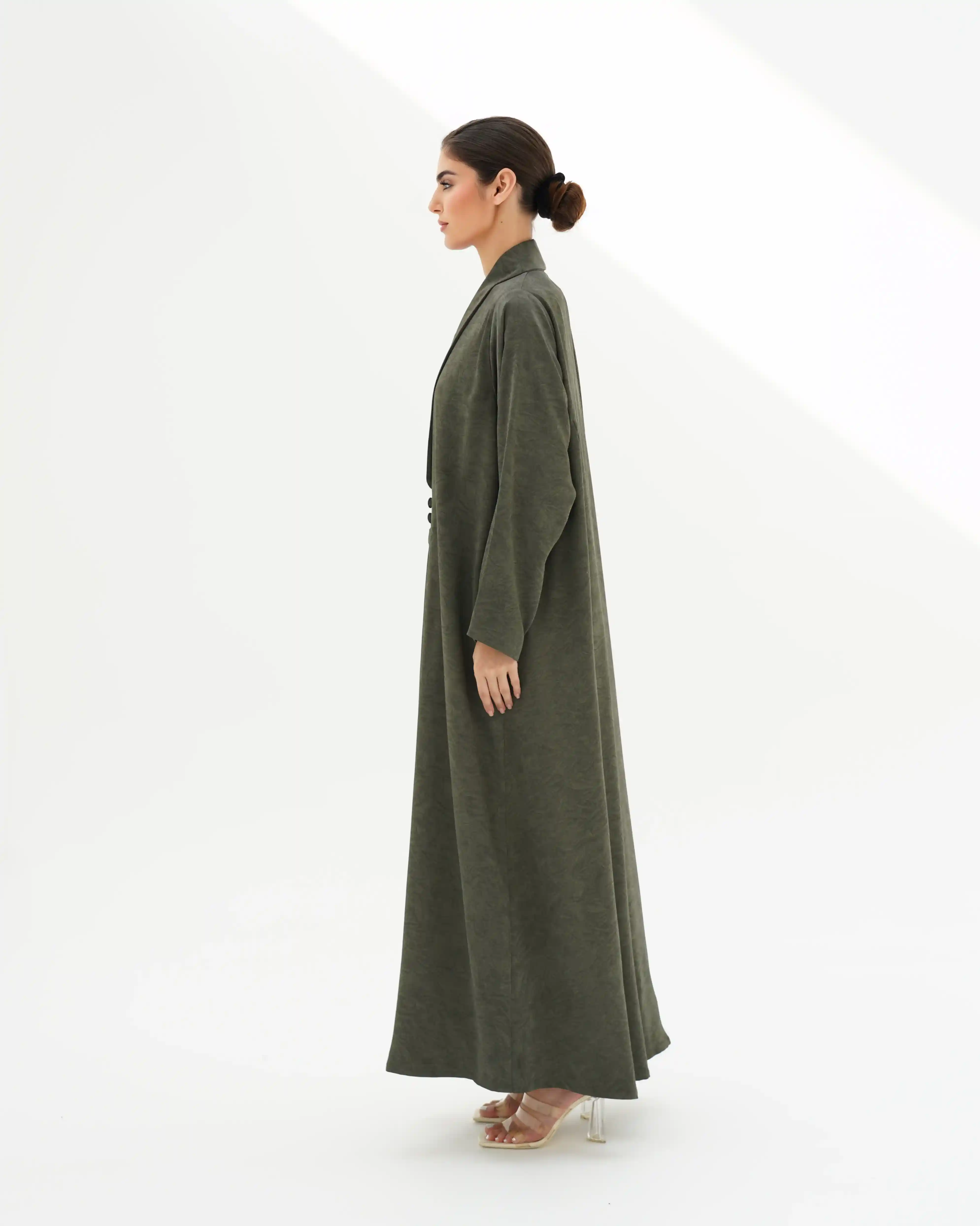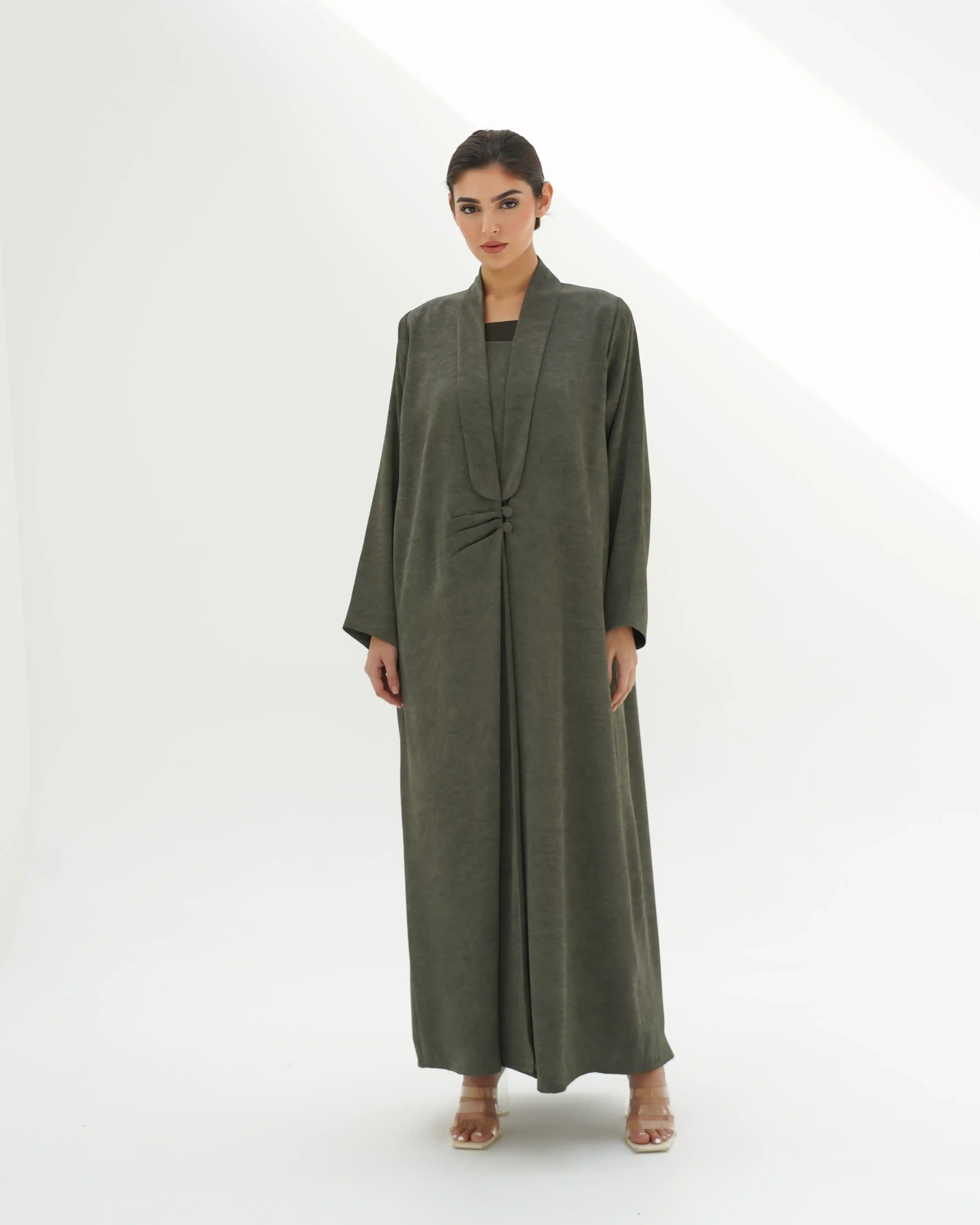 عباية تنسدل بهدوء راقٍ، بقصّة مستقيمة تمنح انسيابية طبيعية وحضورًا متزنًا. من قماش مست فويل بلمسة مطفية تموجات مموهة توحي بفخامة هادئة لا تُعلن نفسها، تتميّز بياقة مبتكرة على شكل V تتكوّن من ثنيات ناعمة تبدأ من أعلى الرقبة وتمتد بانسيابية حتى منتصف الصدر، حيث تلتقي بإغلاق أمامي فني يرتكز على زرين مكسوّين بنفس القماش. تتجمع القماشة حول منطقة الإغلاق بثنيات مدروسة تمنح تدرجًا بصريًا ناعمًا يبرز مركز التصميم بأسلوب أنيق ومتوازن. تكتمل الإطلالة بطرحة سادة تعكس نقاء التصميم وتوازن تفاصيله.