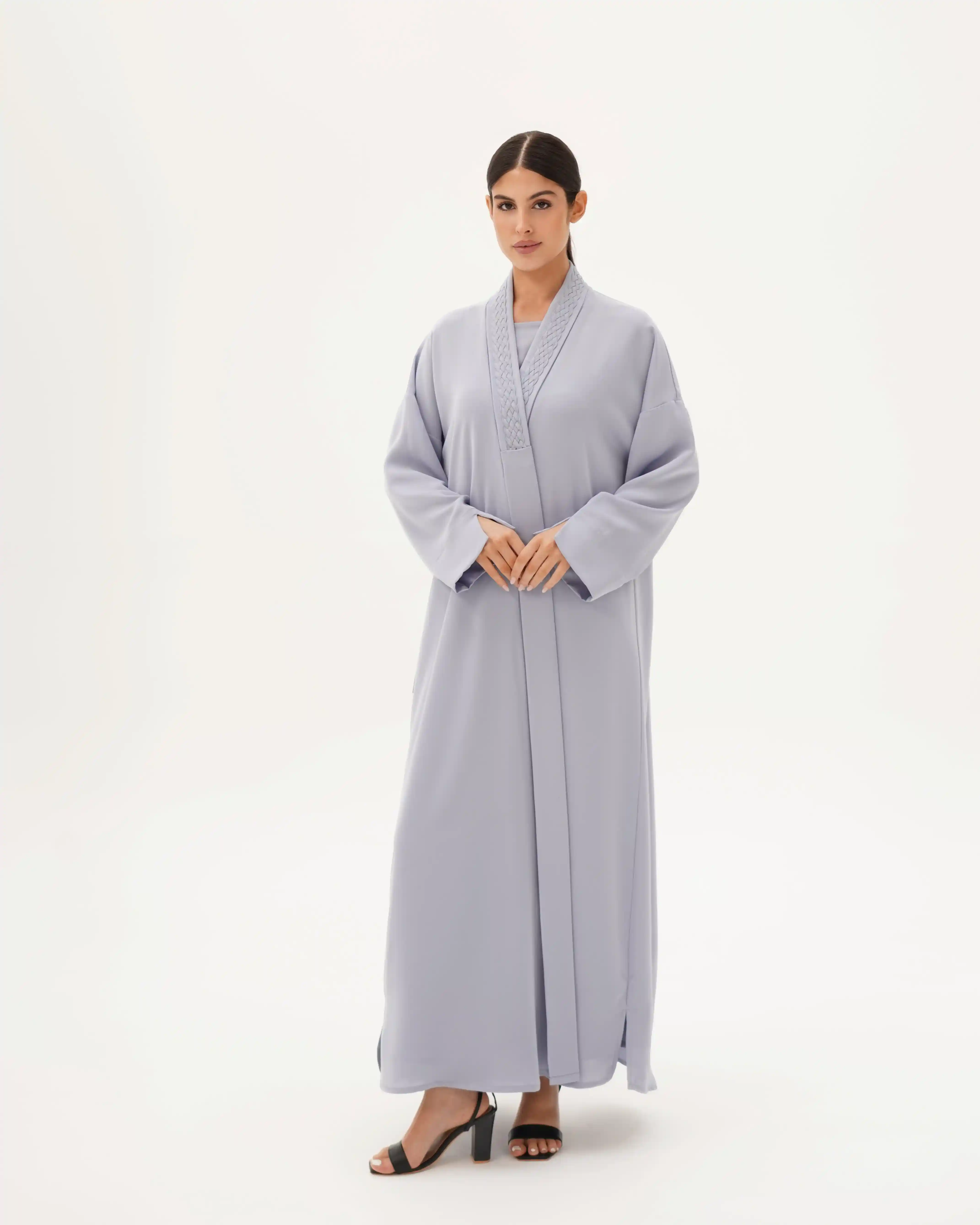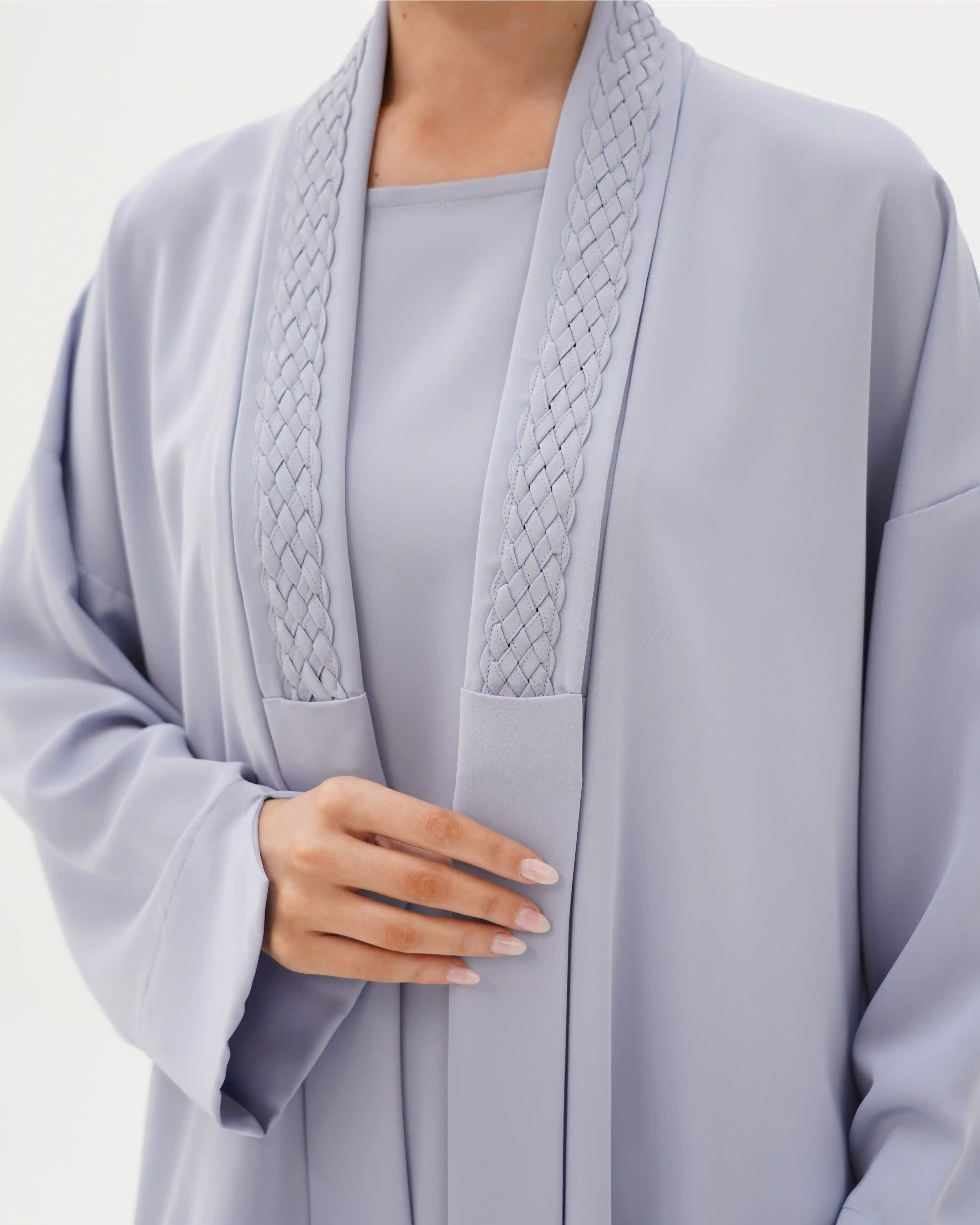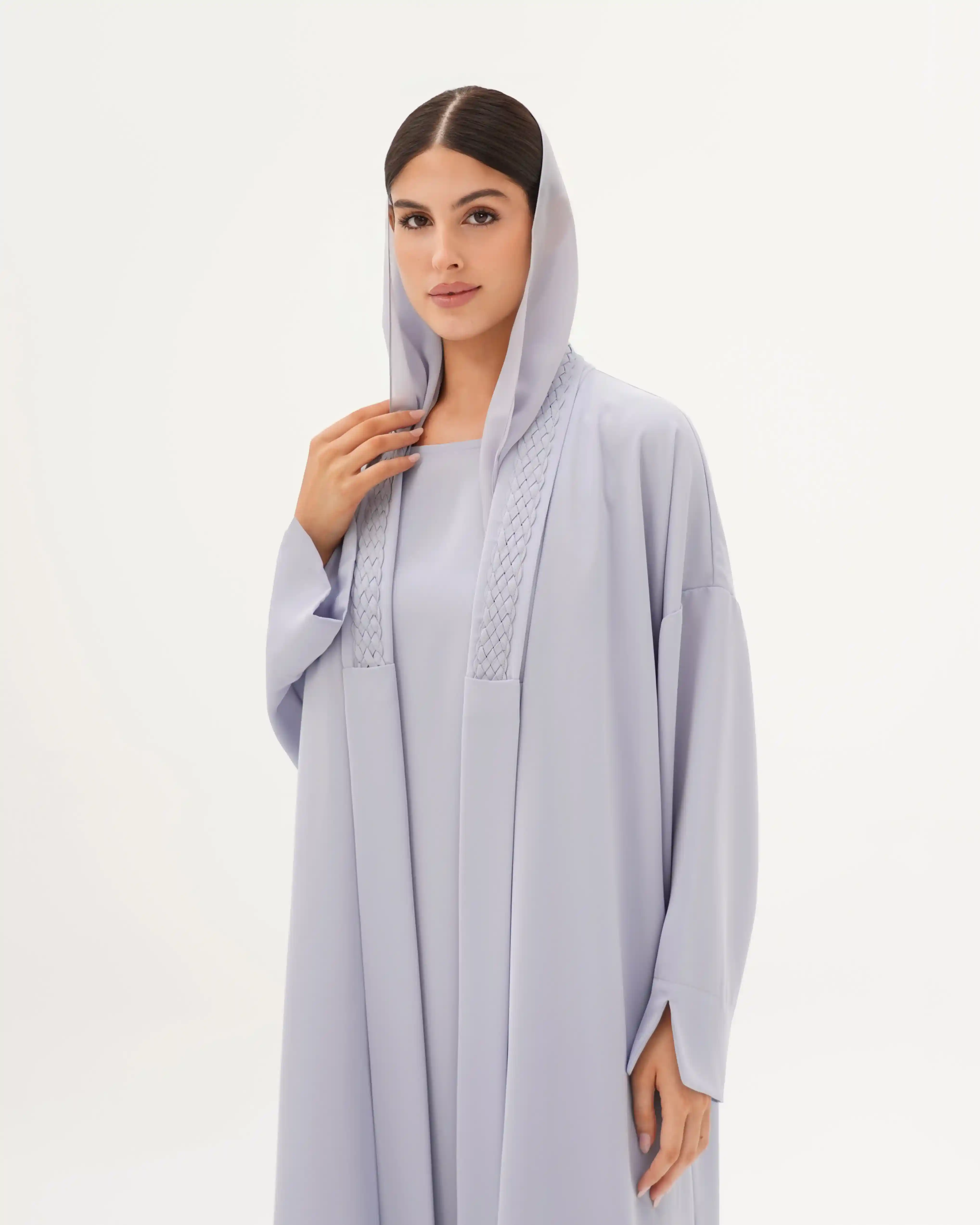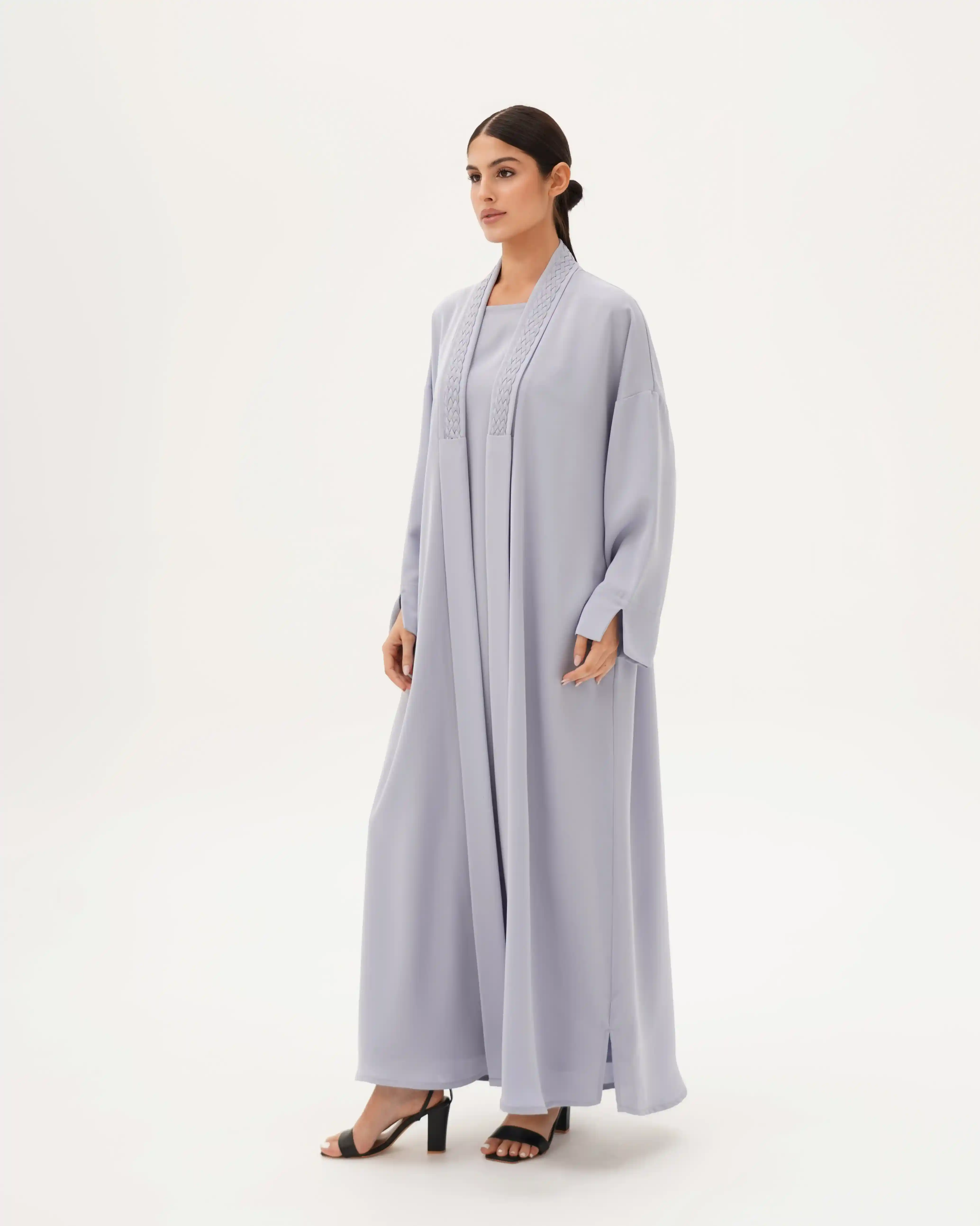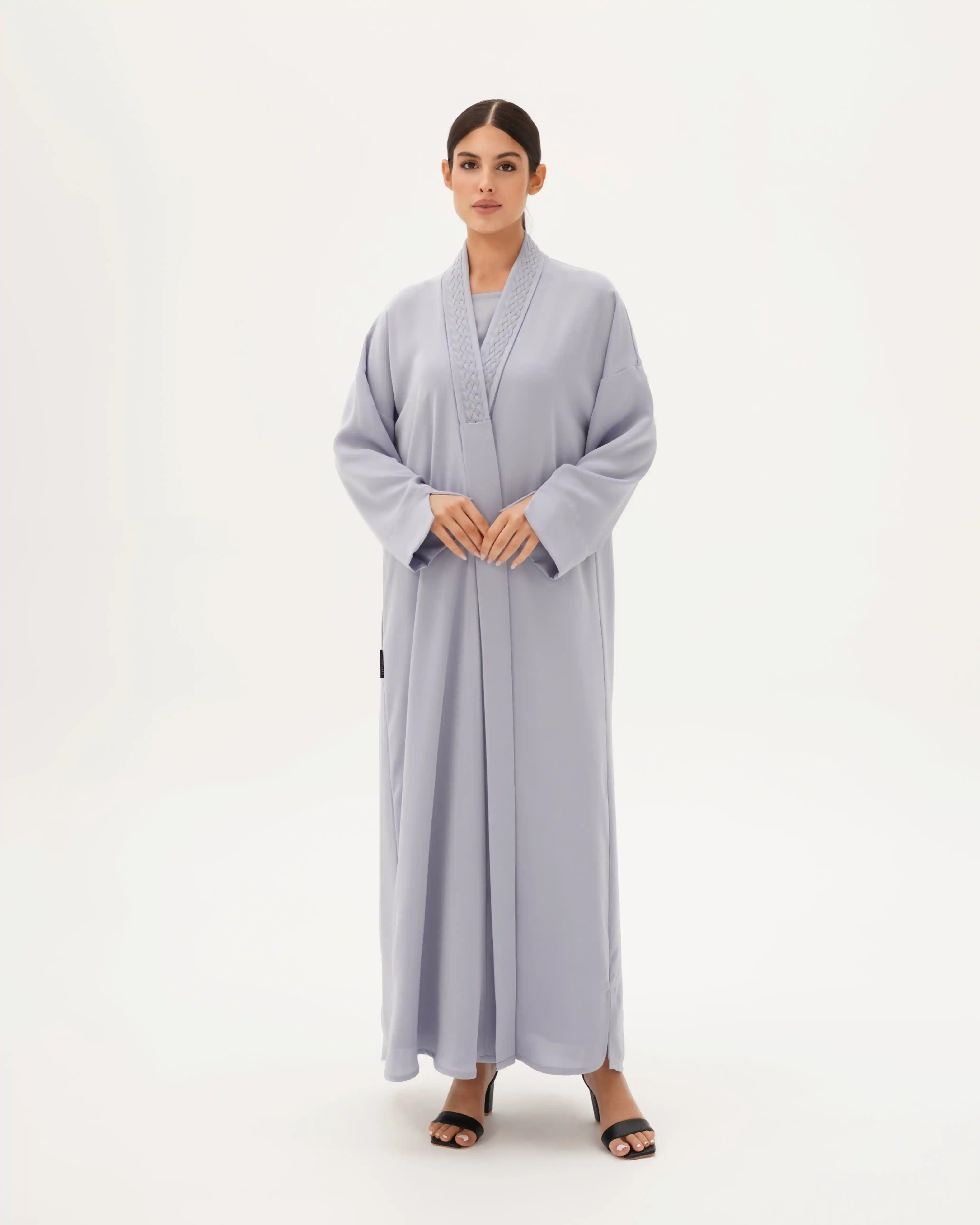 عباية بتصميم هادئ يعكس فخامة التفاصيل الصامتة، تنسدل بقصّة مستقيمة متوازنة تمنح الإطلالة حضورًا أنيقًا دون تكلّف. صُنعت من قماش البريميوم كريب بملمس ناعم وانسدال انسيابي يواكب الحركة برقي. تتميّز بياقة مزدانة بلياقة ذات تشابك متداخل يرسّخ هوية التصميم، مع فتحات ناعمة في بداية الأكمام تعزز خفة التصميم وأناقة الخطوط.