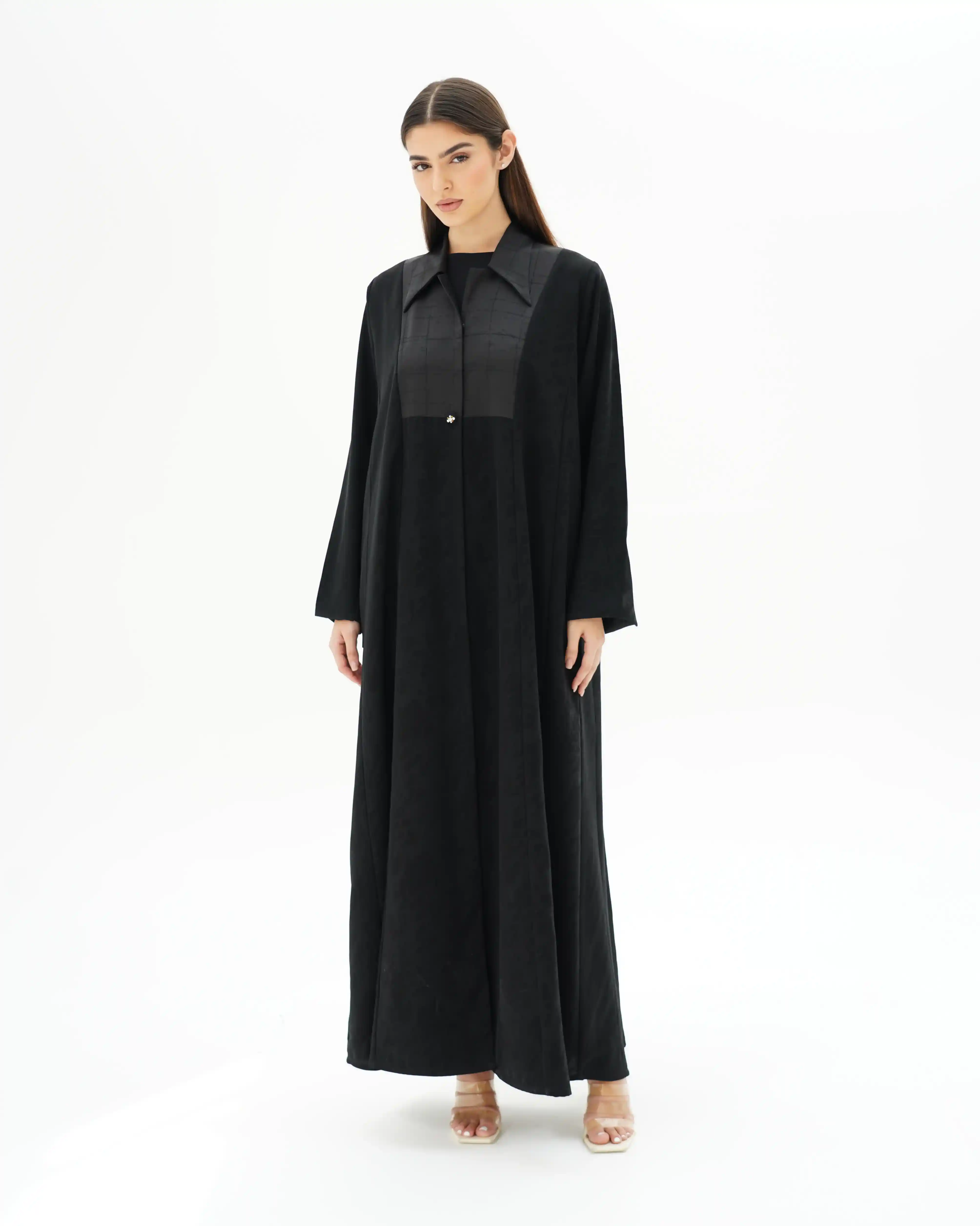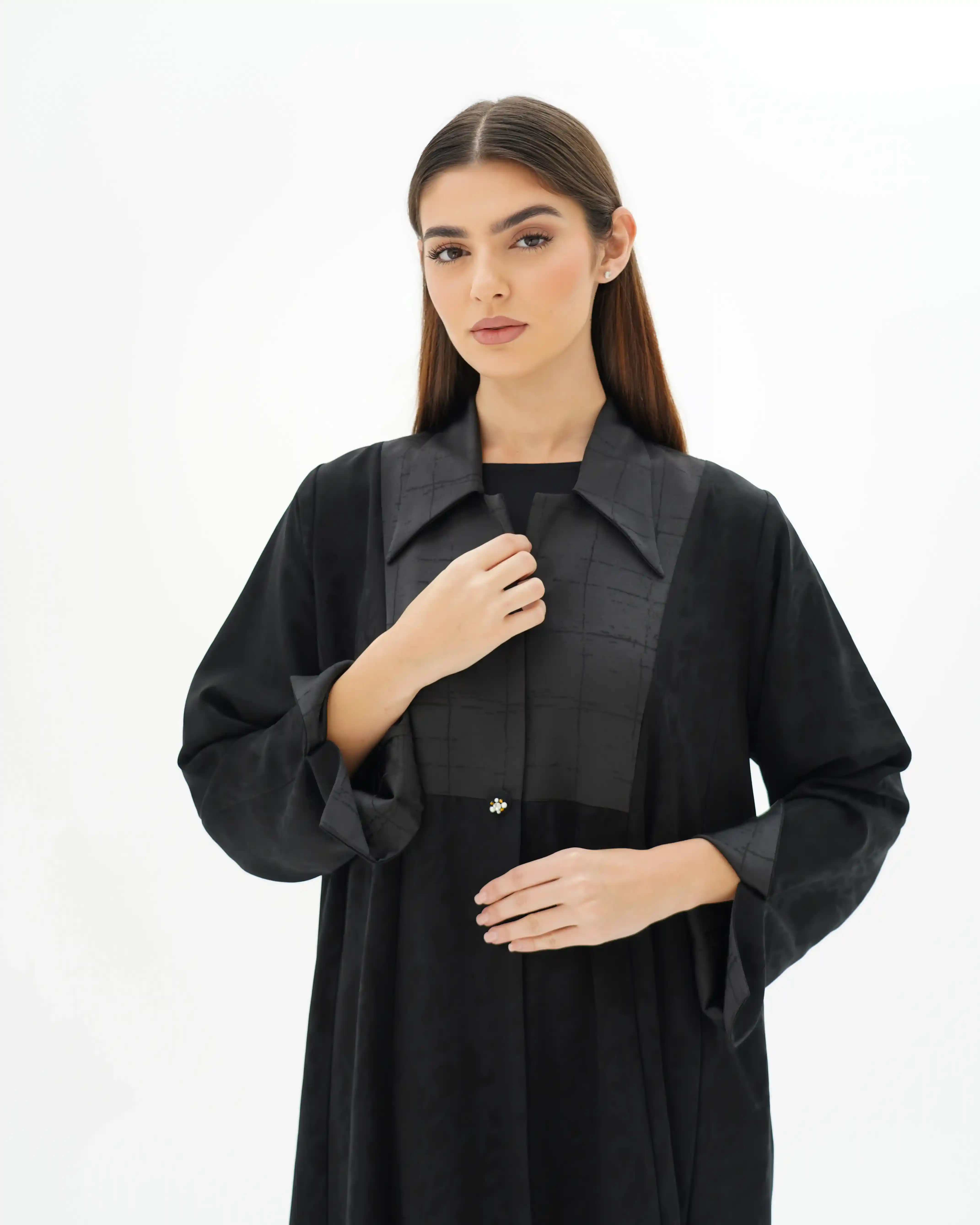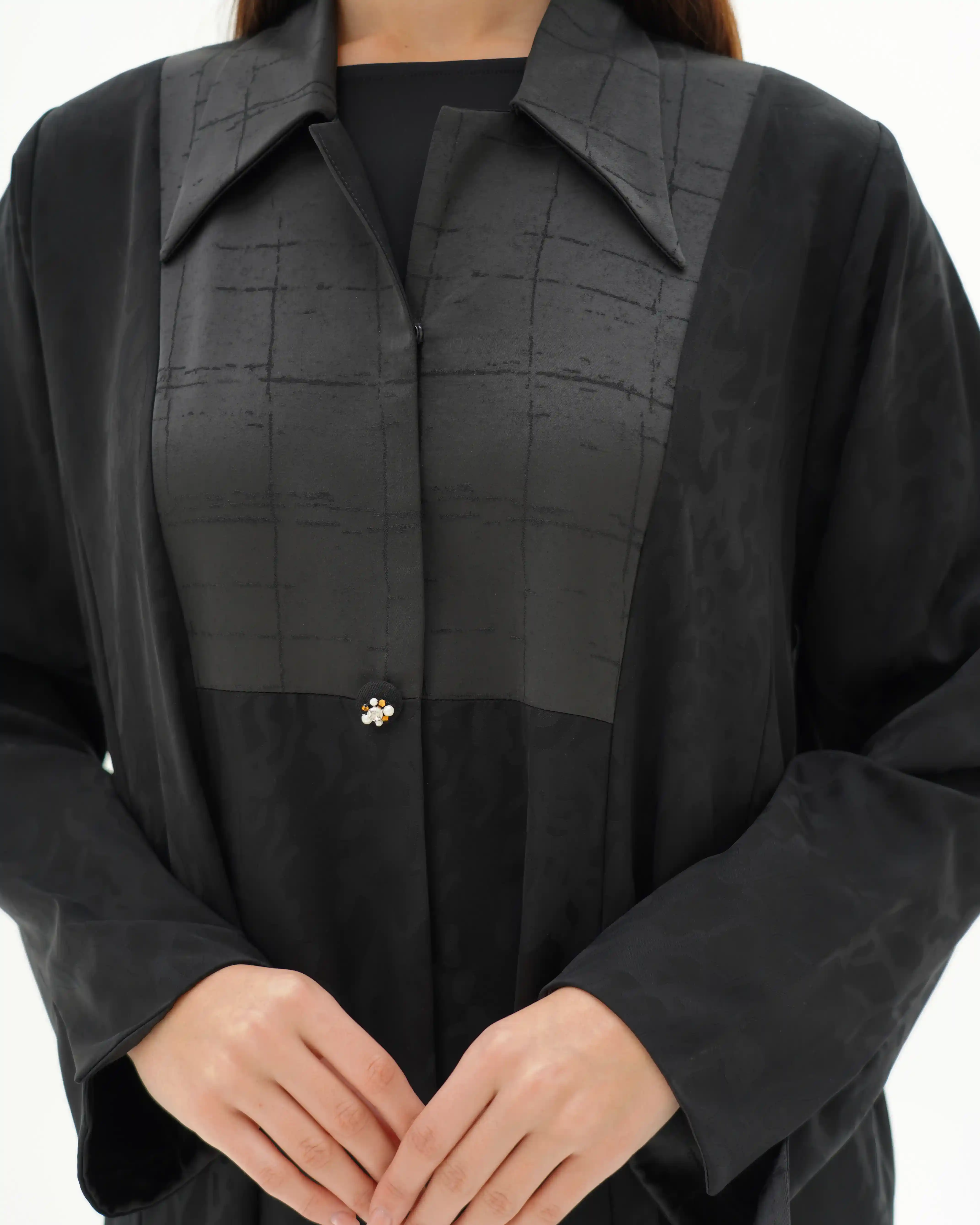 عباية بقصّة مستقيمة تنسدل بانسيابية متزنًة. من قماش ريتش جاكارد بملمس غني ونسيج يمنح التصميم عمقًا بصريًا. يتزيّن الصدر والياقة بقماش جاكارد سترايتد بنقشة طولية ناعمة. تضيف عمقًا بصريًا أنيقًا دون مبالغة، لتشكّل إطارًا راقيًا يبرز أعلى التصميم بأسلوب متزن. تأتي العباية بإغلاق كامل بطقطق مخفي يحافظ على نقاء الخط العام، ويتوسّطها زر مزدان بلآلئ صغيرة وخرز دقيق يشكّل نقطة تركيز فاخرة في المنتصف. تأتي الأكمام بلمسة مدروسة؛ حيث تنكشف بطانة داخلية من قماش جاكارد سترايتد عند فتحة نهاية الكم، تبدأ من فتحة الكم لتعكس تباينًا متوازنًا، وتكتمل الإطلالة بطرحة سادة متناغمة تعكس أناقة معاصرة.