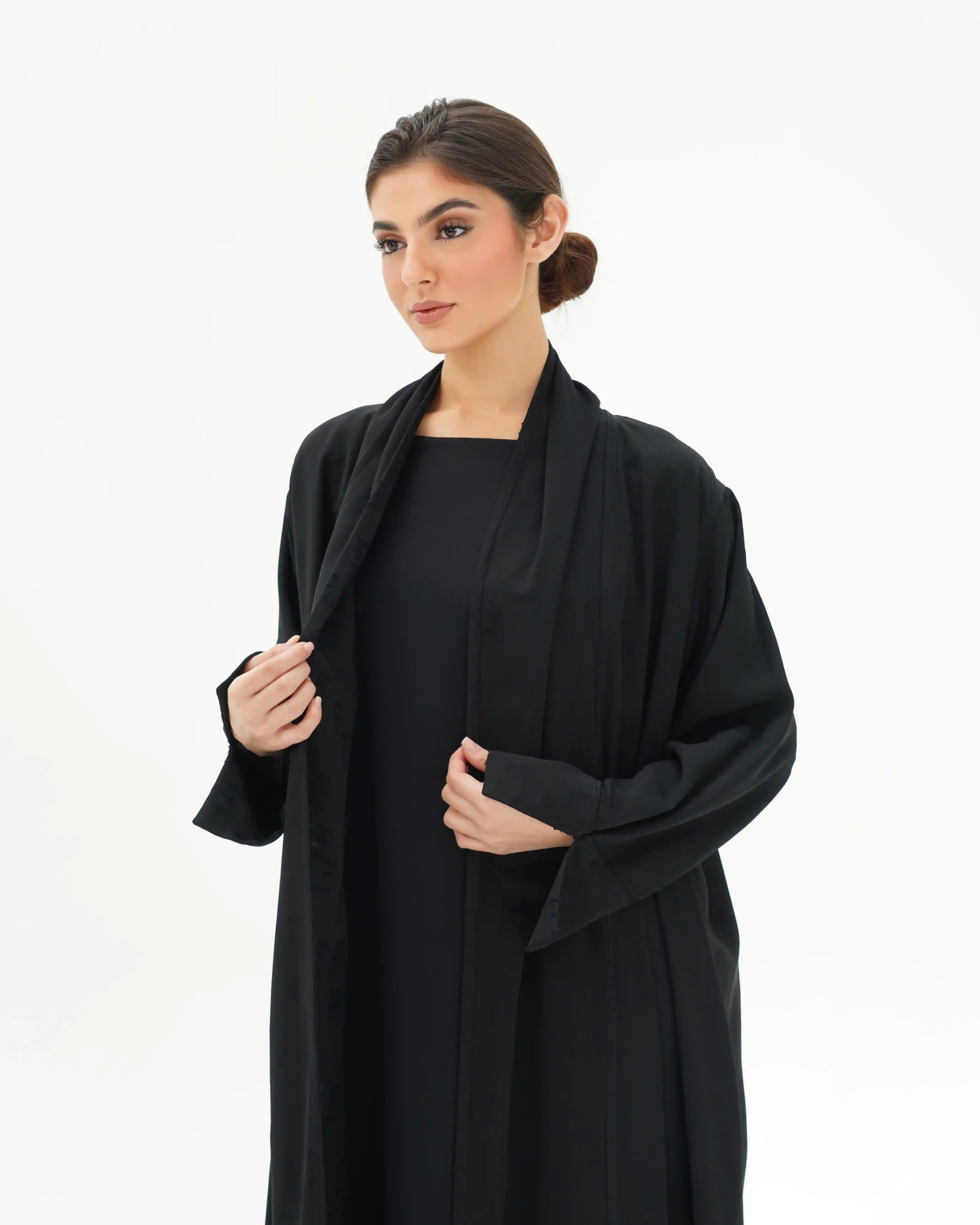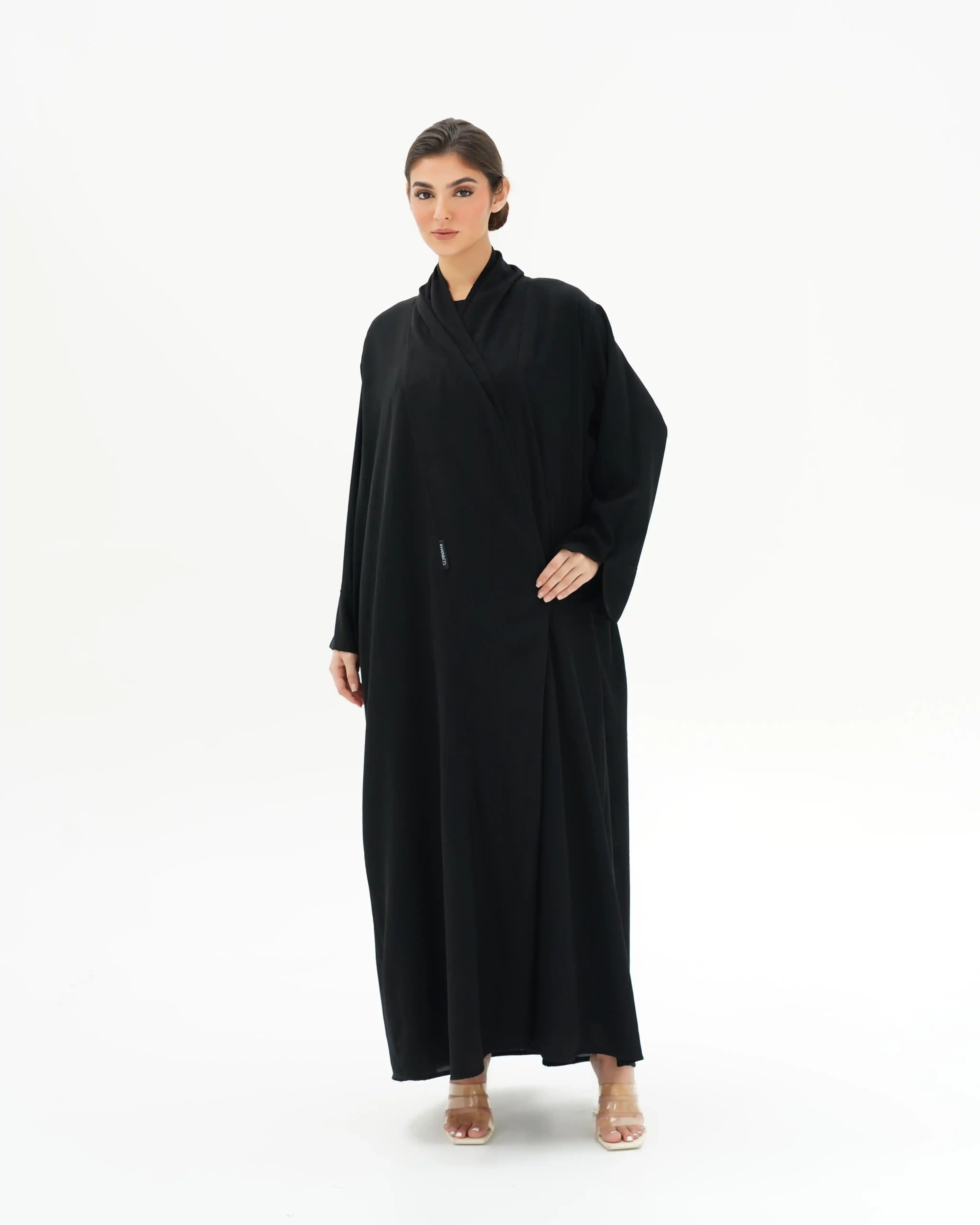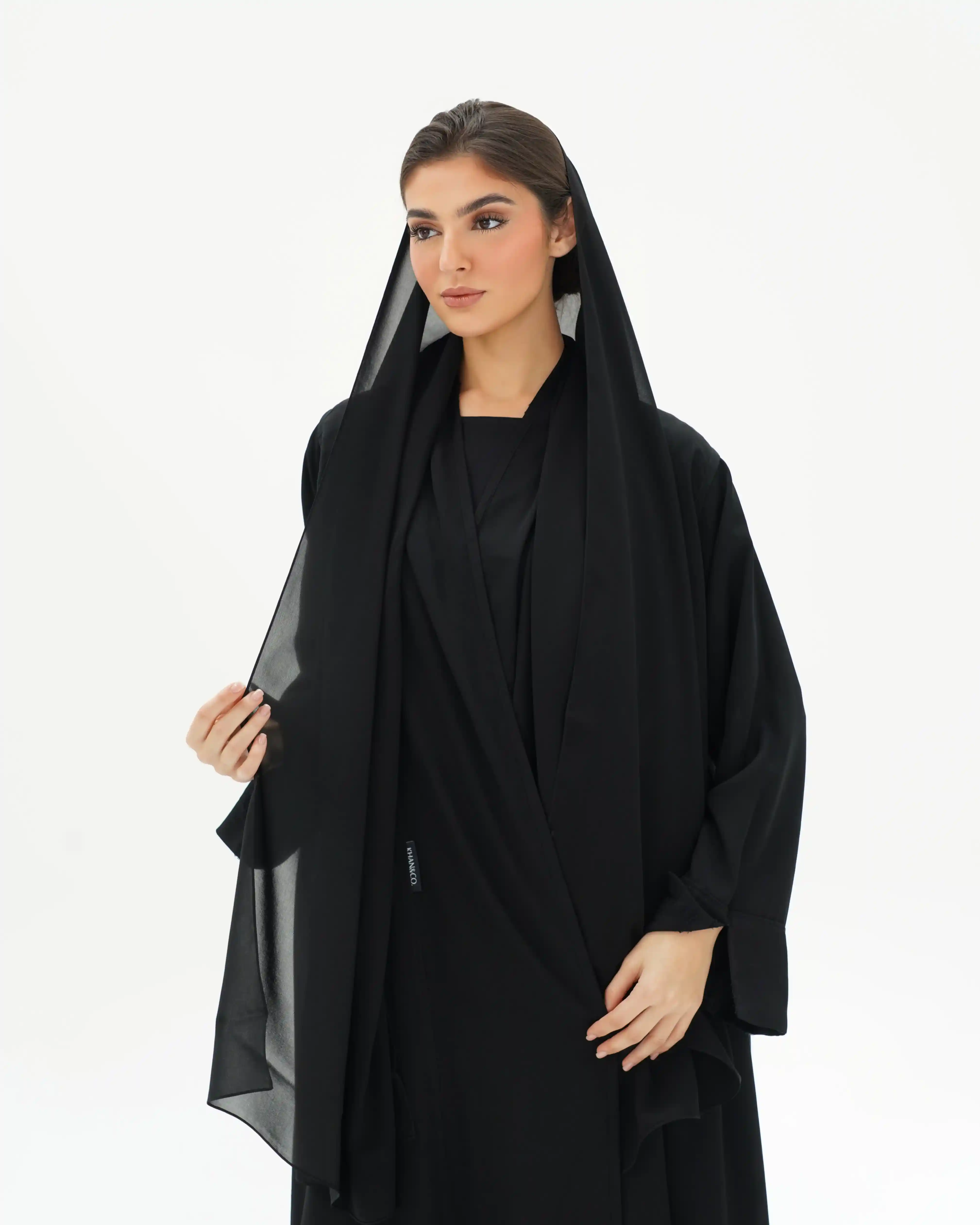 عباية مستقيمة منسدلة تعكس هدوء الفكرة ودقة التنفيذ، بتصميم معاصر يعيد تقديم العباية اللف بأسلوب أكثر سلاسة وذكاء. تأتي من قماش الفيسكوز بملمس غني يجمع بين وجهين؛ أحدهما مزغّب بسطح ملمسي ناعم، والآخر سادة بانسياب هادئ، لتمنحك حرية الارتداء بوجهين مختلفين ضمن قطعة واحدة. يتميّز الجزء العلوي بثنيات دقيقة عند مقدمة الأكتاف تخلق امتدادًا بصريًا راقيًا وتمنح مساحة قماش مدروسة لإغلاق أمامي ساتر، بينما ينساب التفاف القماش من خلف الرقبة ليحاكي حضور الشال بأسلوب ناعم ومترف. تضيف شارة المقاس في الظهر خلف الرقبة المدروز يدويا بخيوط حمراء, تأتي الأكمام بلمسة مدروسة, تبدأ من فتحة الكم لتعكس تباينًا متوازنًا، وتكتمل الإطلالة بطرحة سادة متناغمة تعكس أناقة معاصرة.