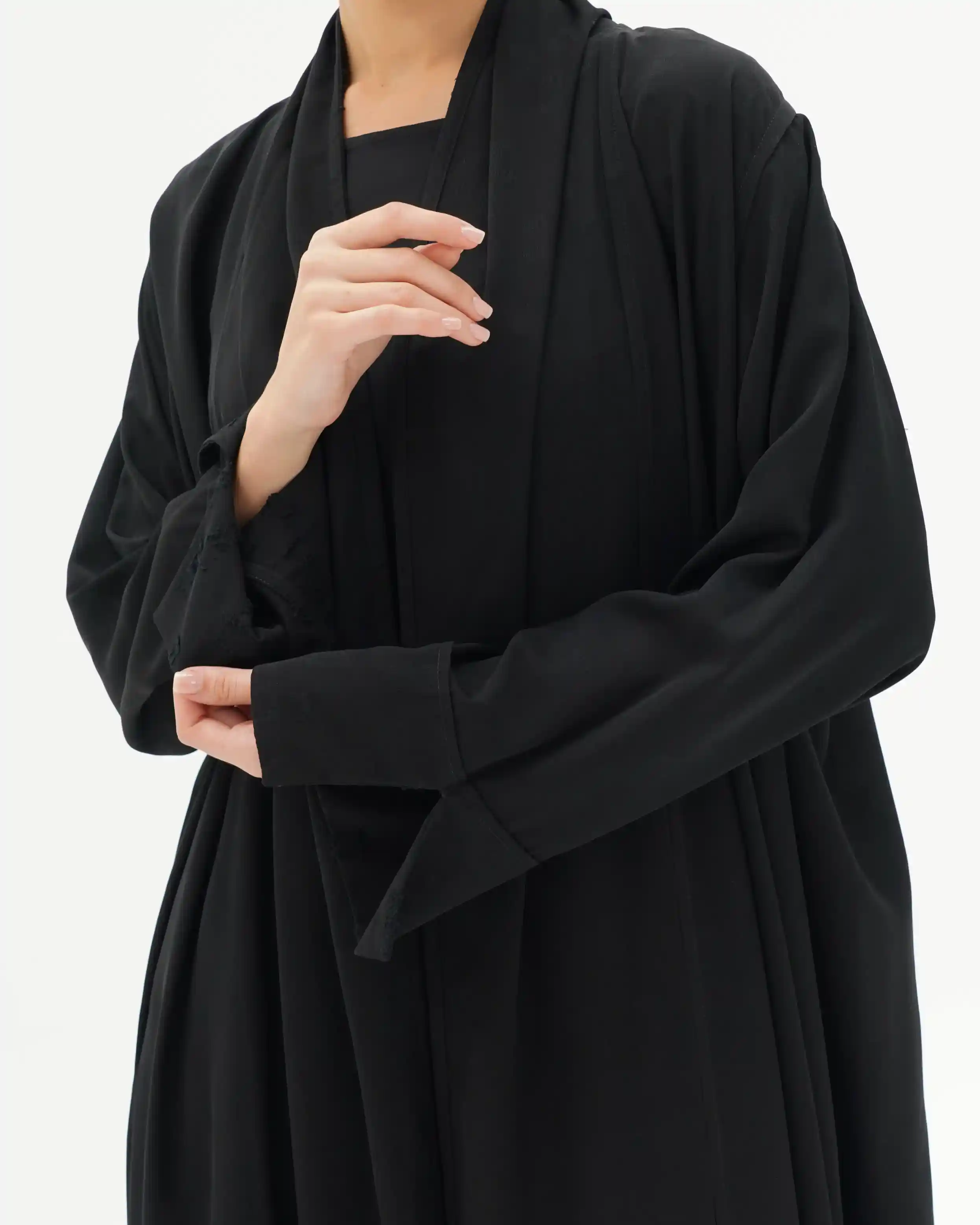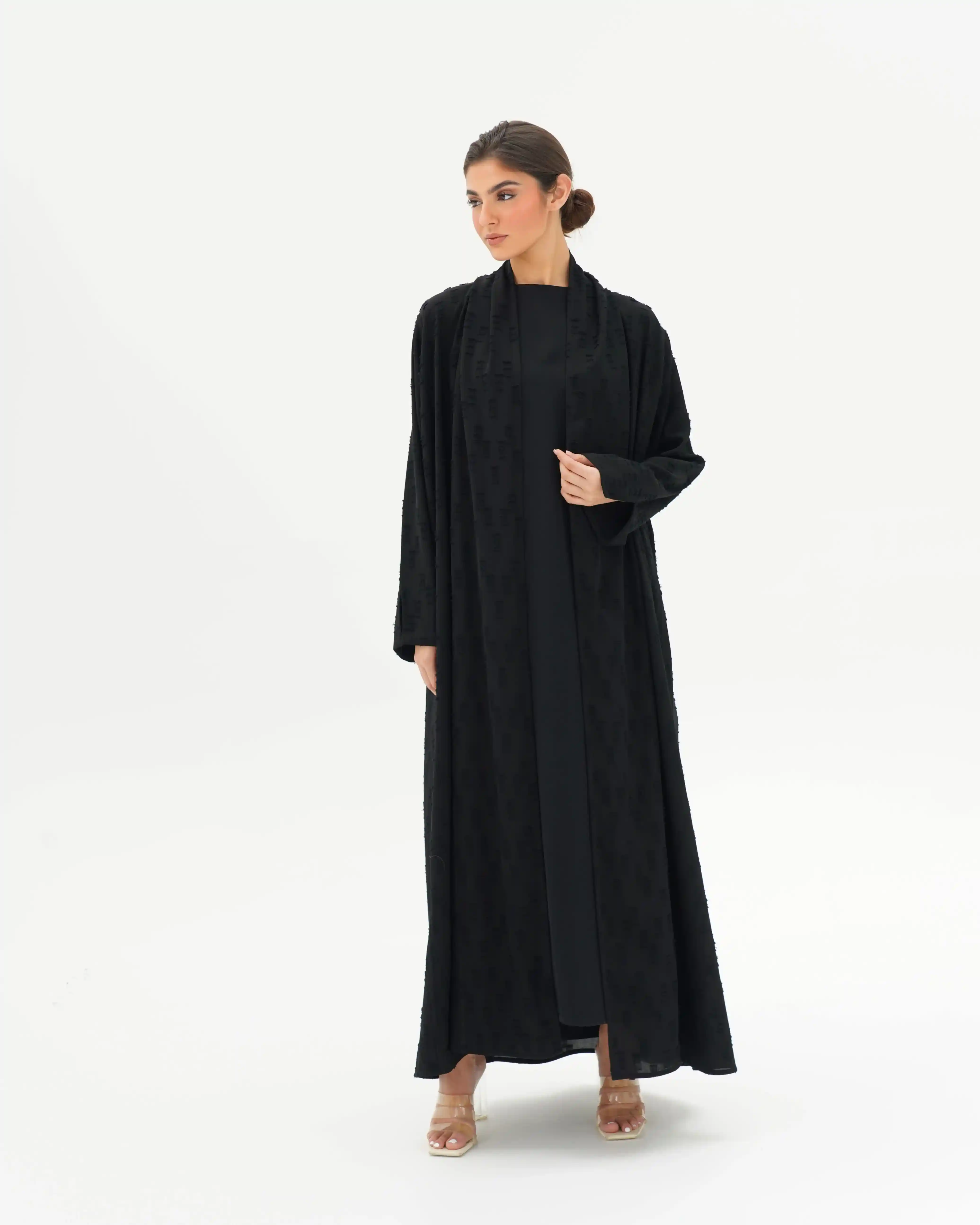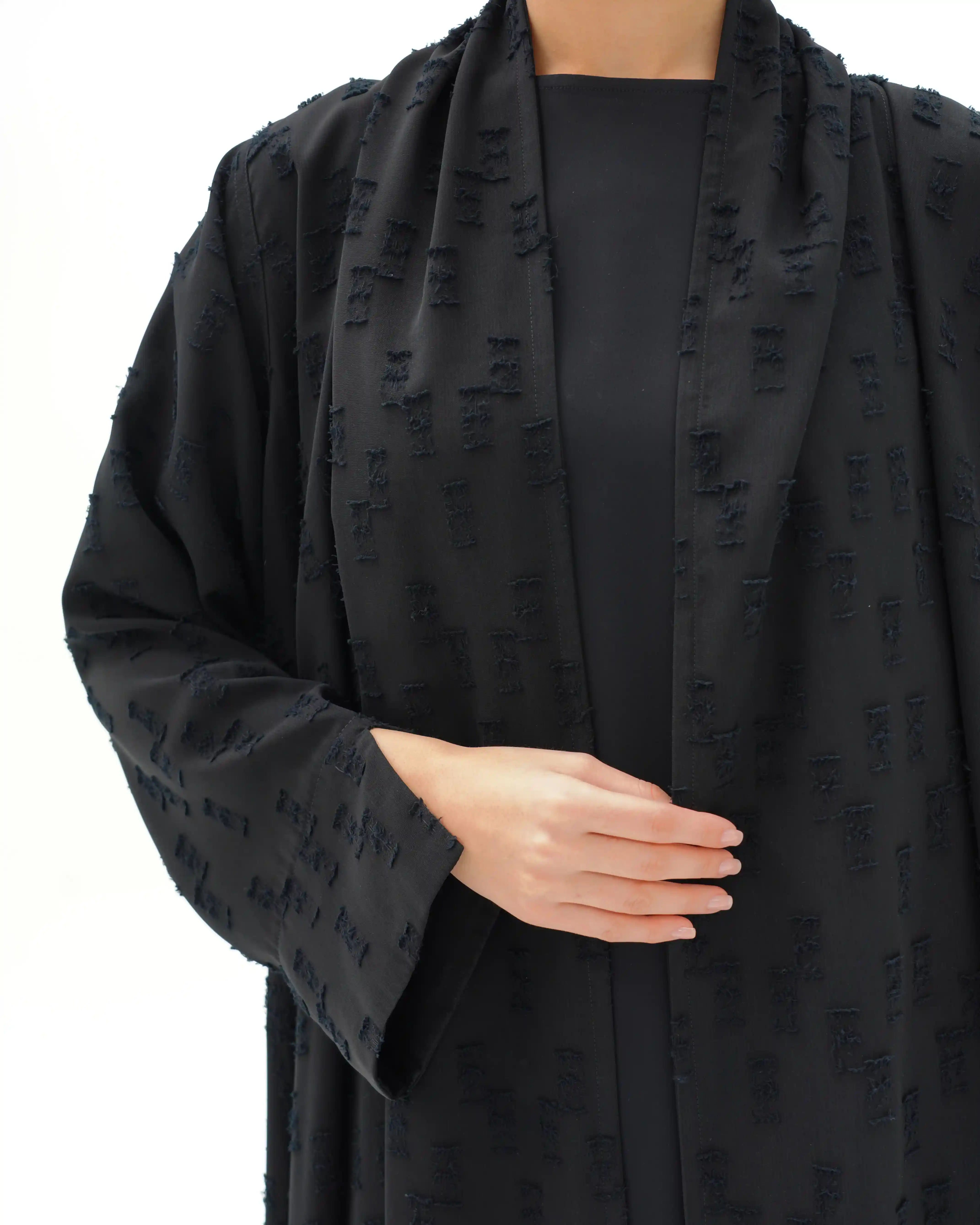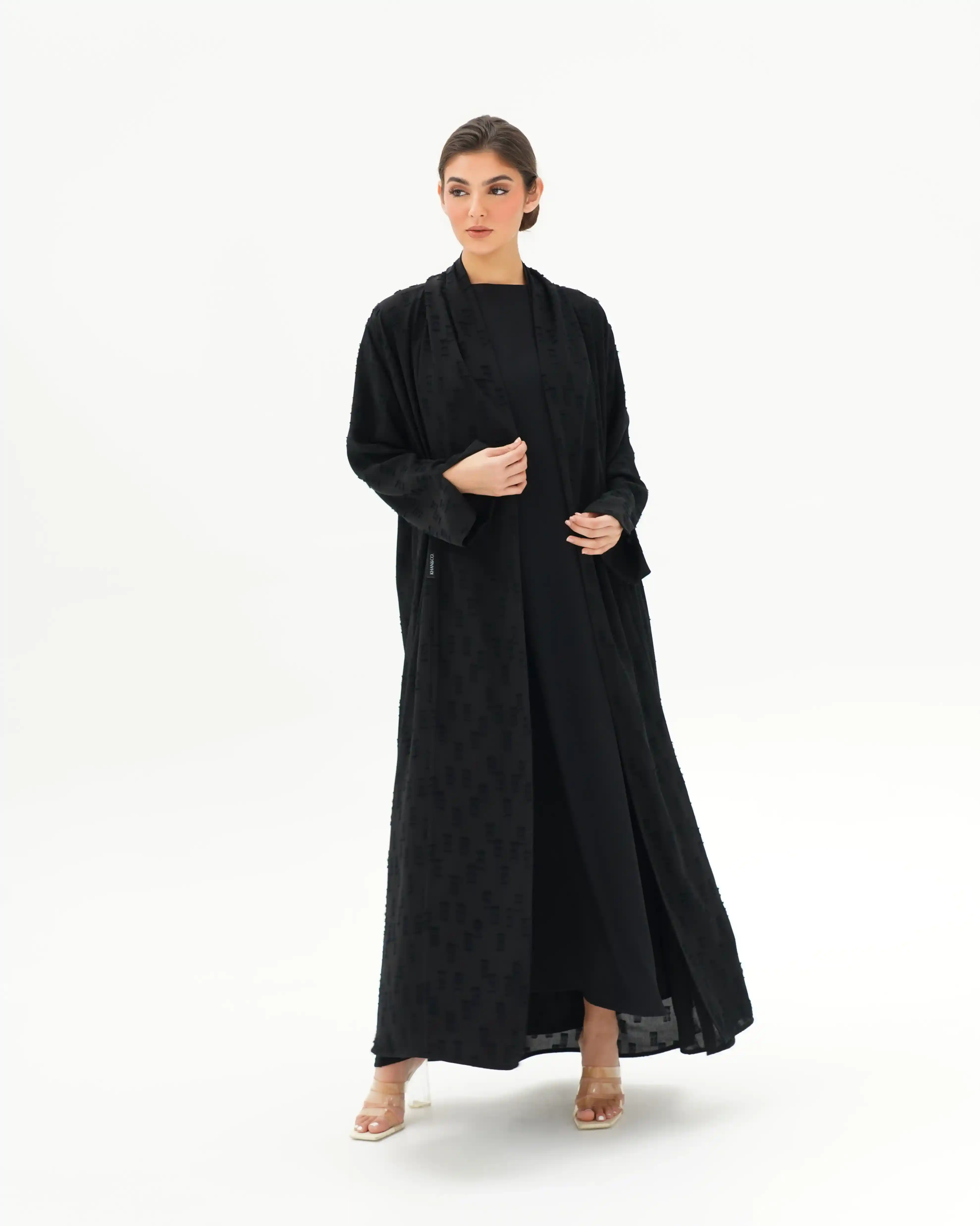 عباية مستقيمة منسدلة تعكس هدوء الفكرة ودقة التنفيذ، بتصميم معاصر يعيد تقديم العباية اللف بأسلوب أكثر سلاسة وذكاء. تأتي من قماش الفيسكوز بملمس غني يجمع بين وجهين؛ أحدهما مزغّب بسطح ملمسي ناعم، والآخر سادة بانسياب هادئ، لتمنحك حرية الارتداء بوجهين مختلفين ضمن قطعة واحدة. يتميّز الجزء العلوي بثنيات دقيقة عند مقدمة الأكتاف تخلق امتدادًا بصريًا راقيًا وتمنح مساحة قماش مدروسة لإغلاق أمامي ساتر، بينما ينساب التفاف القماش من خلف الرقبة ليحاكي حضور الشال بأسلوب ناعم ومترف. تضيف شارة المقاس في الظهر خلف الرقبة المدروز يدويا بخيوط حمراء, تأتي الأكمام بلمسة مدروسة, تبدأ من فتحة الكم لتعكس تباينًا متوازنًا، وتكتمل الإطلالة بطرحة سادة متناغمة تعكس أناقة معاصرة.
