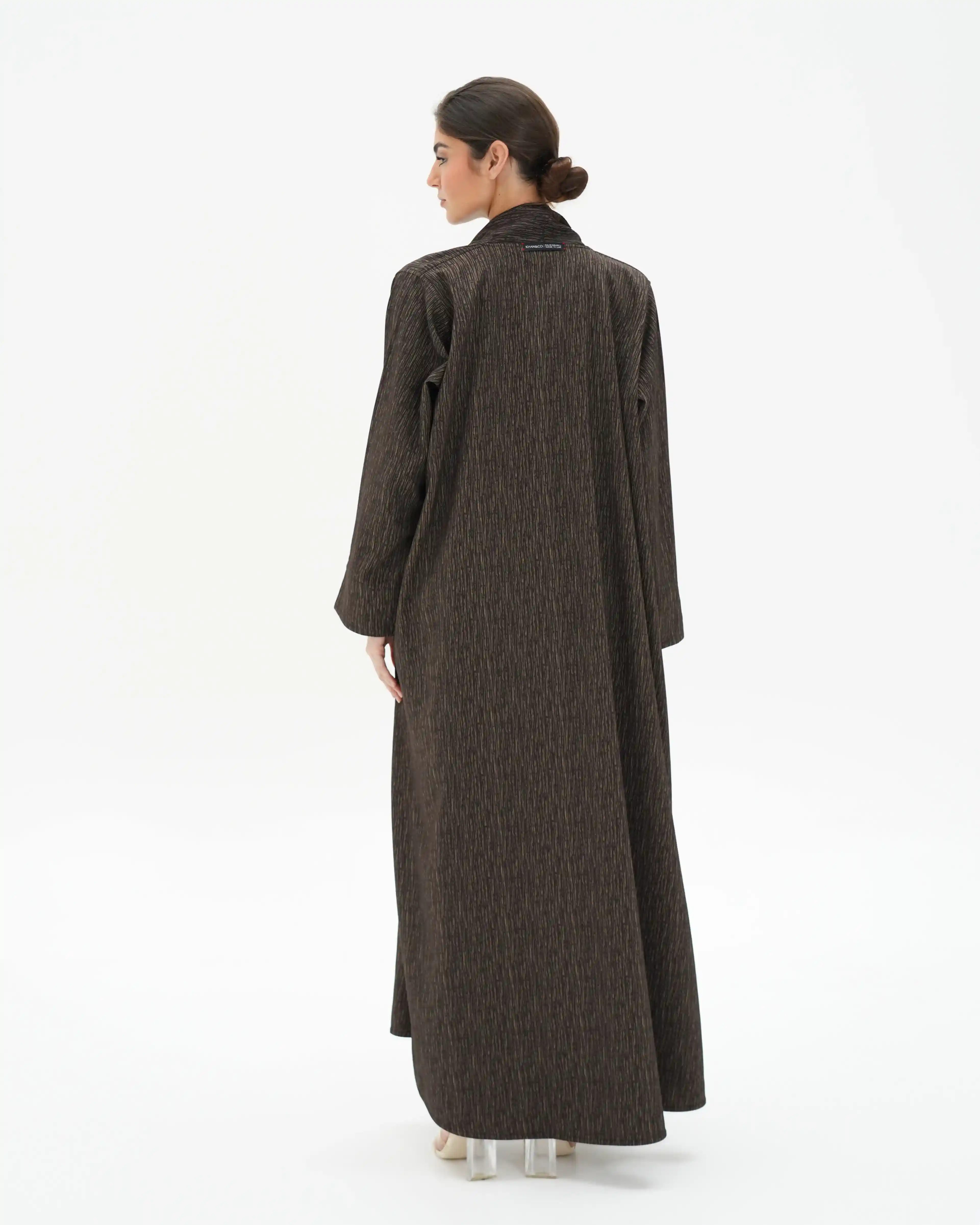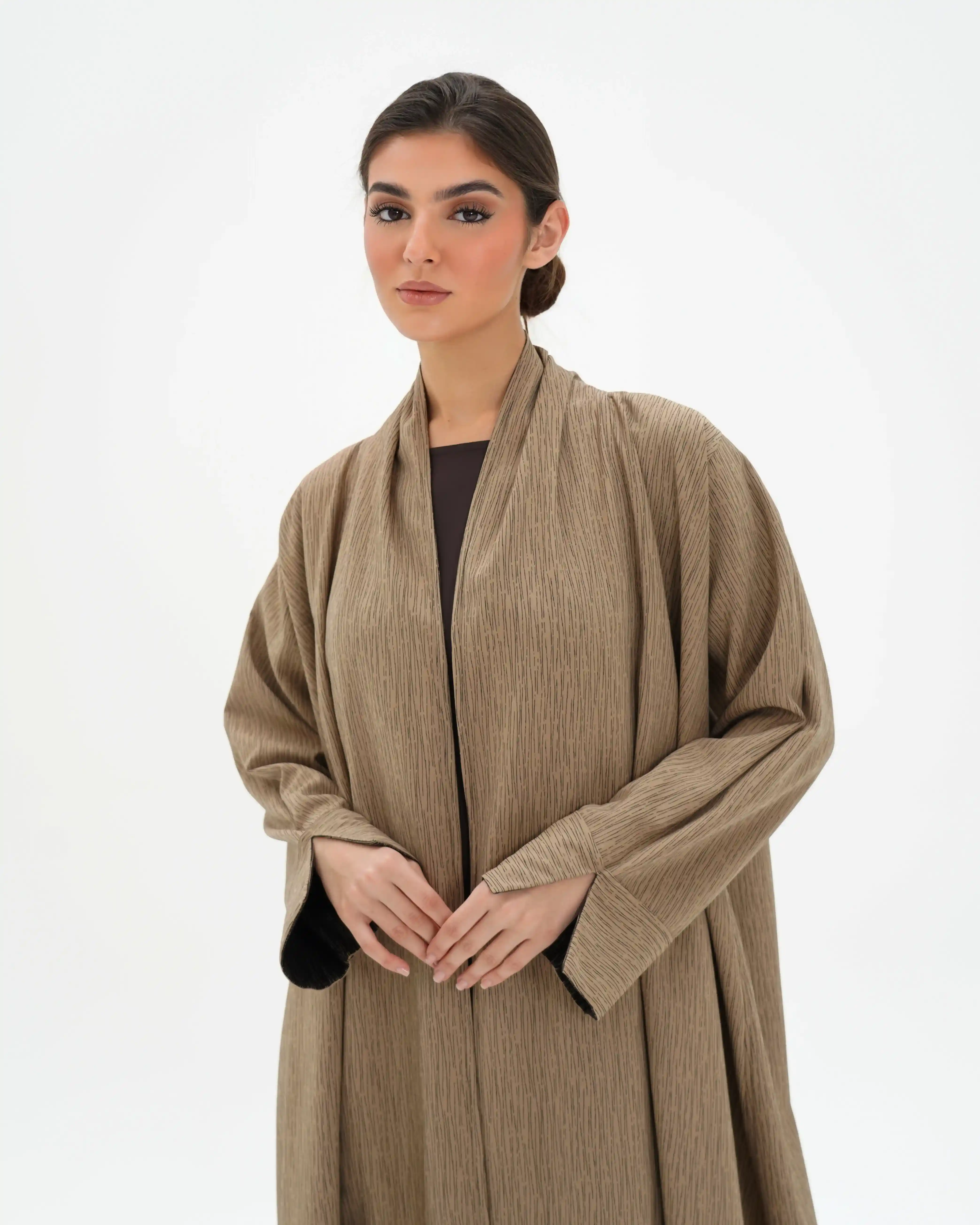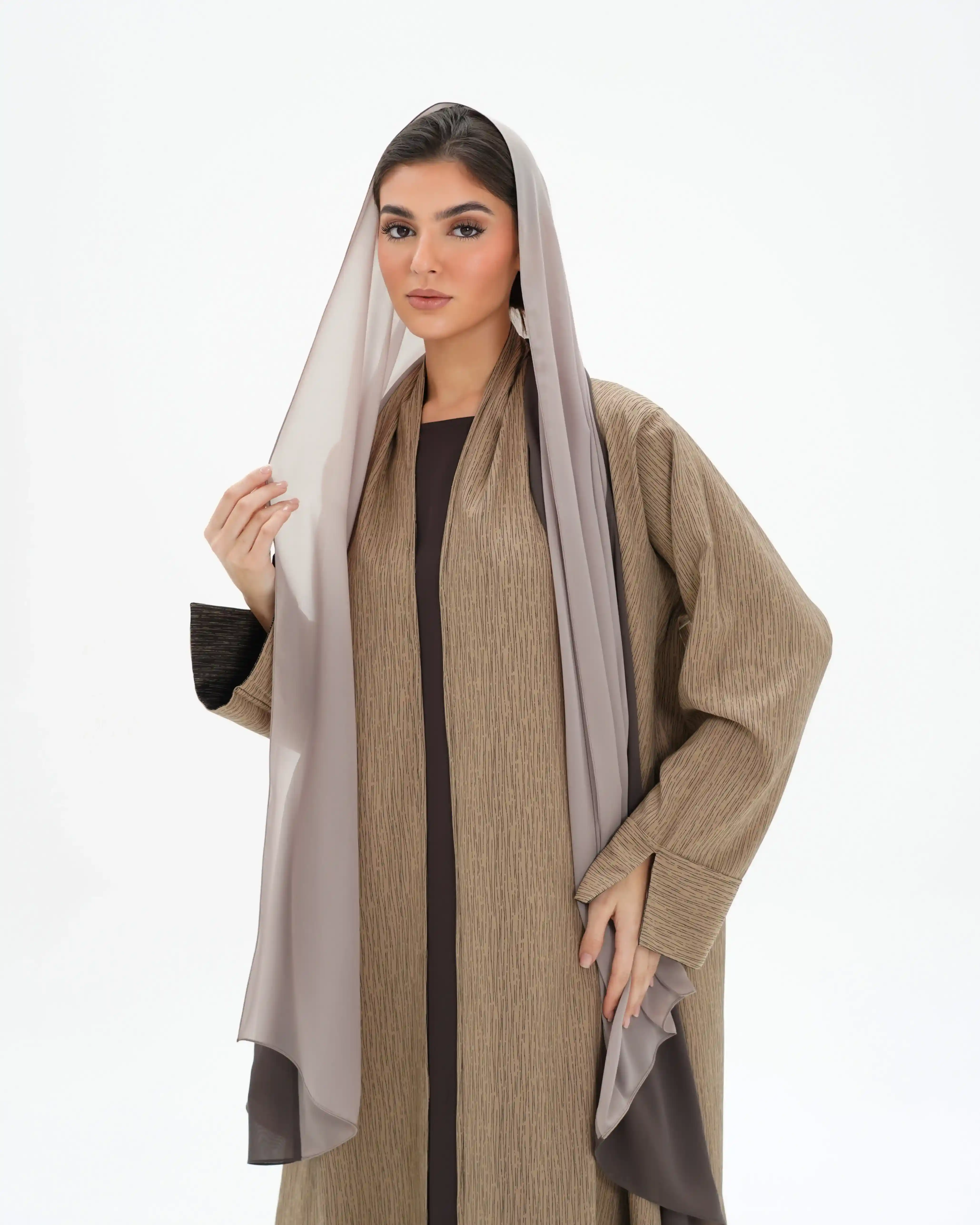 عباية مستقيمة منسدلة تعكس هدوءًا بصريًا دافئًا مستوحى من تدرجات الأرض، بتصميم معاصر يعيد تقديم العباية اللف بأسلوب ناعم وانسيابي. تأتي من قماش الفيسكوز بملمس حريري غني، بتقنية الوجهين حيث يختلف اللون بين بني غامق عميق وكريمي هادئ، مع خطوط دقيقة تظهر بلون معاكس لكل وجه، لتمنح بعدًا بصريًا خفيًا يعكس فخامة التفاصيل. ينساب التصميم من خلف الرقبة بامتداد قماشي يحاكي الشال بانسيابية راقية، مع مساحة قماش مدروسة تتيح إغلاقًا أماميًا ساترًا. يبرز التباين اللوني عند حركة القماش ونهايات الأكمام ليخلق تناغمًا دافئًا بين اللونين. تكتمل الإطلالة بطرحة ثنائية اللون بتصميم مبتكر.