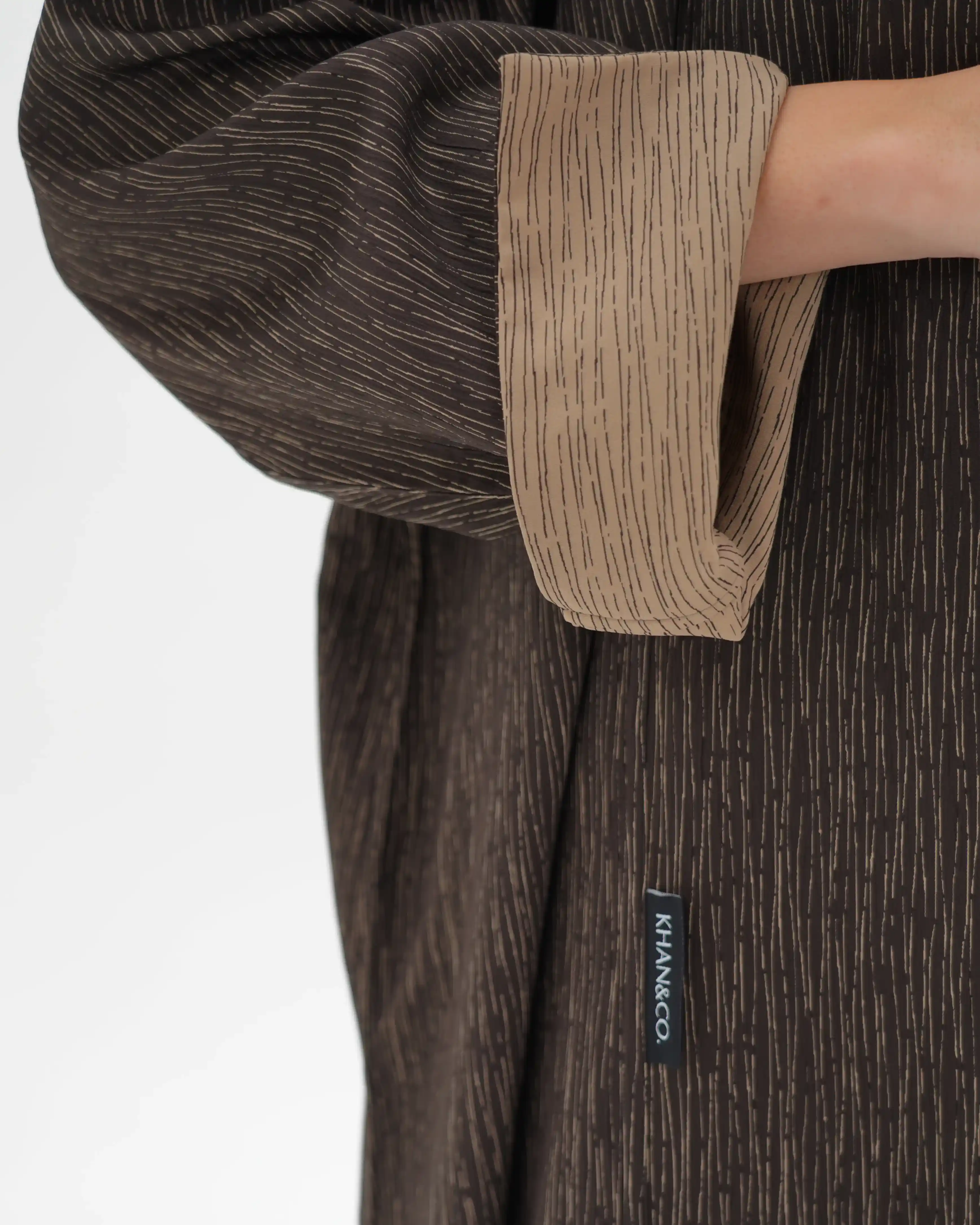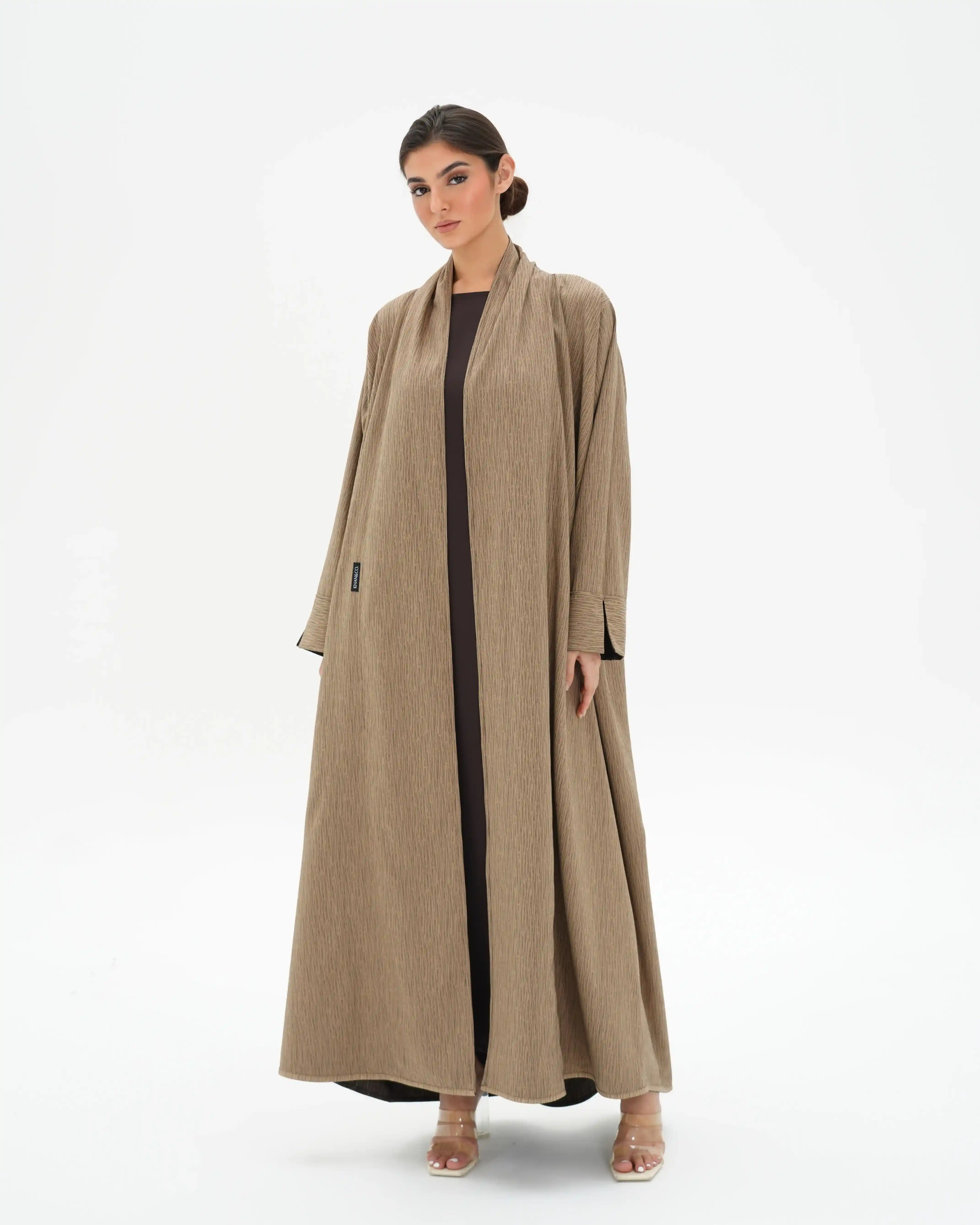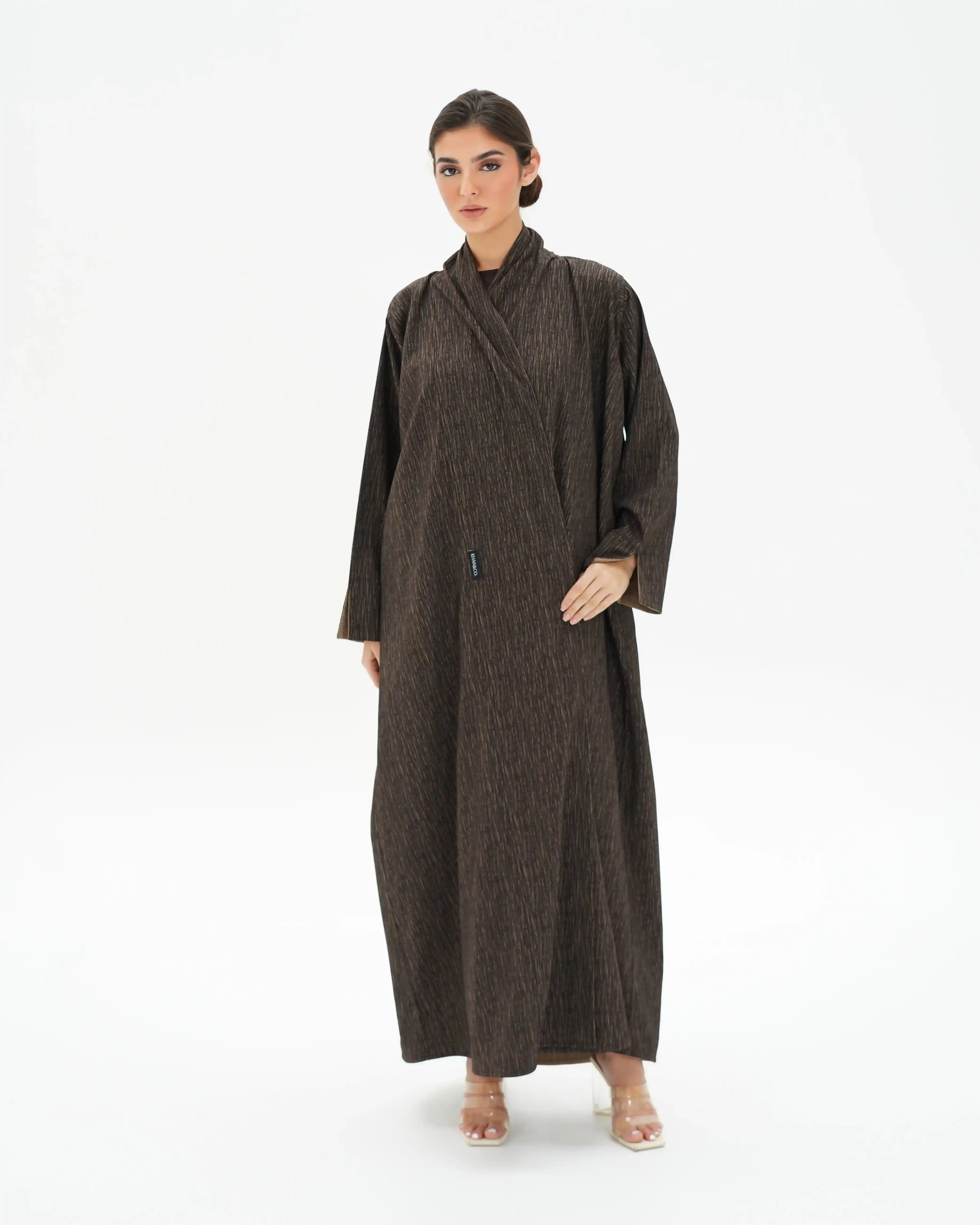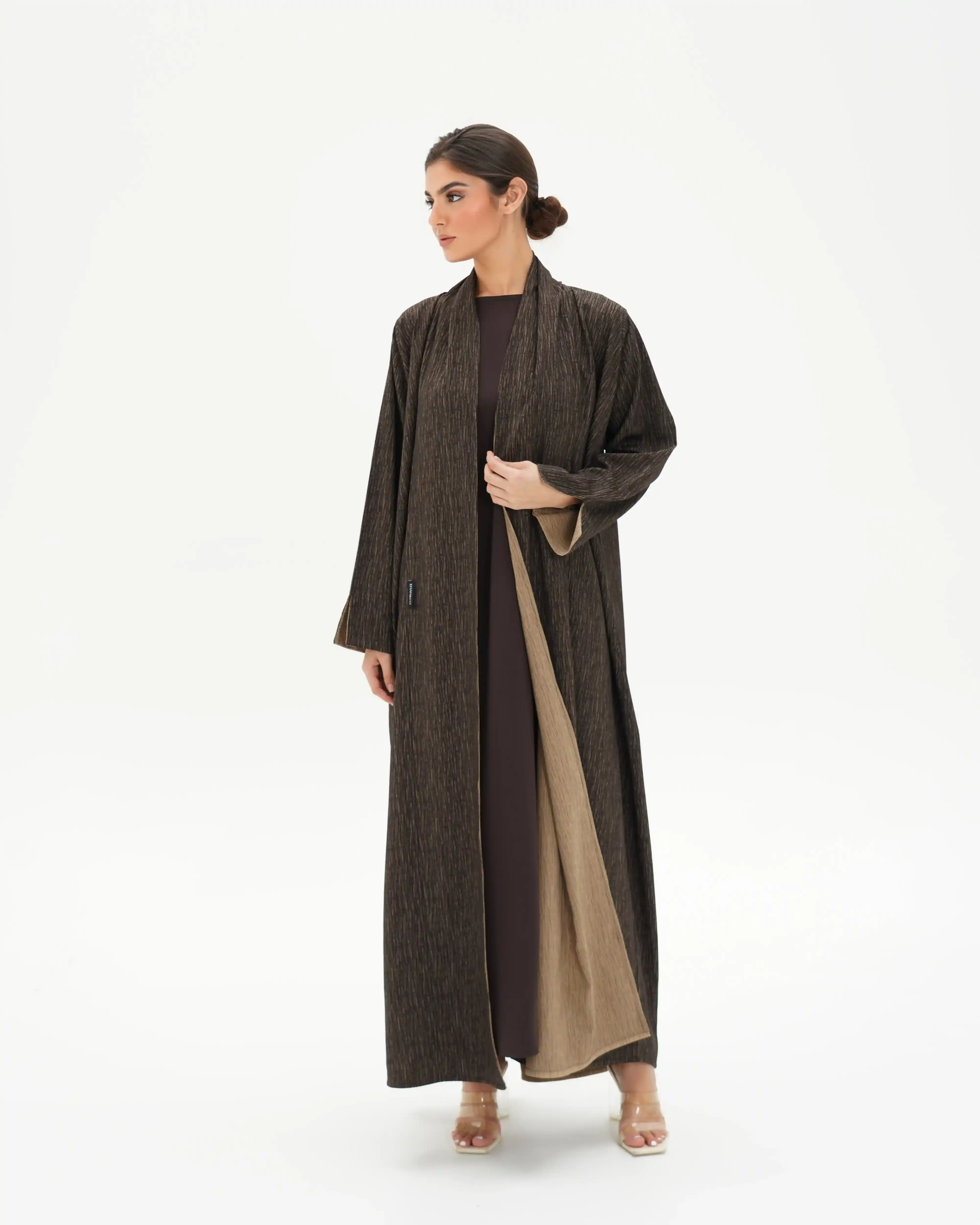 عباية مستقيمة منسدلة تعكس هدوءًا بصريًا دافئًا مستوحى من تدرجات الأرض، بتصميم معاصر يعيد تقديم العباية اللف بأسلوب ناعم وانسيابي. تأتي من قماش الفيسكوز بملمس حريري غني، بتقنية الوجهين حيث يختلف اللون بين بني غامق عميق وكريمي هادئ، مع خطوط دقيقة تظهر بلون معاكس لكل وجه، لتمنح بعدًا بصريًا خفيًا يعكس فخامة التفاصيل. ينساب التصميم من خلف الرقبة بامتداد قماشي يحاكي الشال بانسيابية راقية، مع مساحة قماش مدروسة تتيح إغلاقًا أماميًا ساترًا. يبرز التباين اللوني عند حركة القماش ونهايات الأكمام ليخلق تناغمًا دافئًا بين اللونين. تكتمل الإطلالة بطرحة ثنائية اللون بتصميم مبتكر.