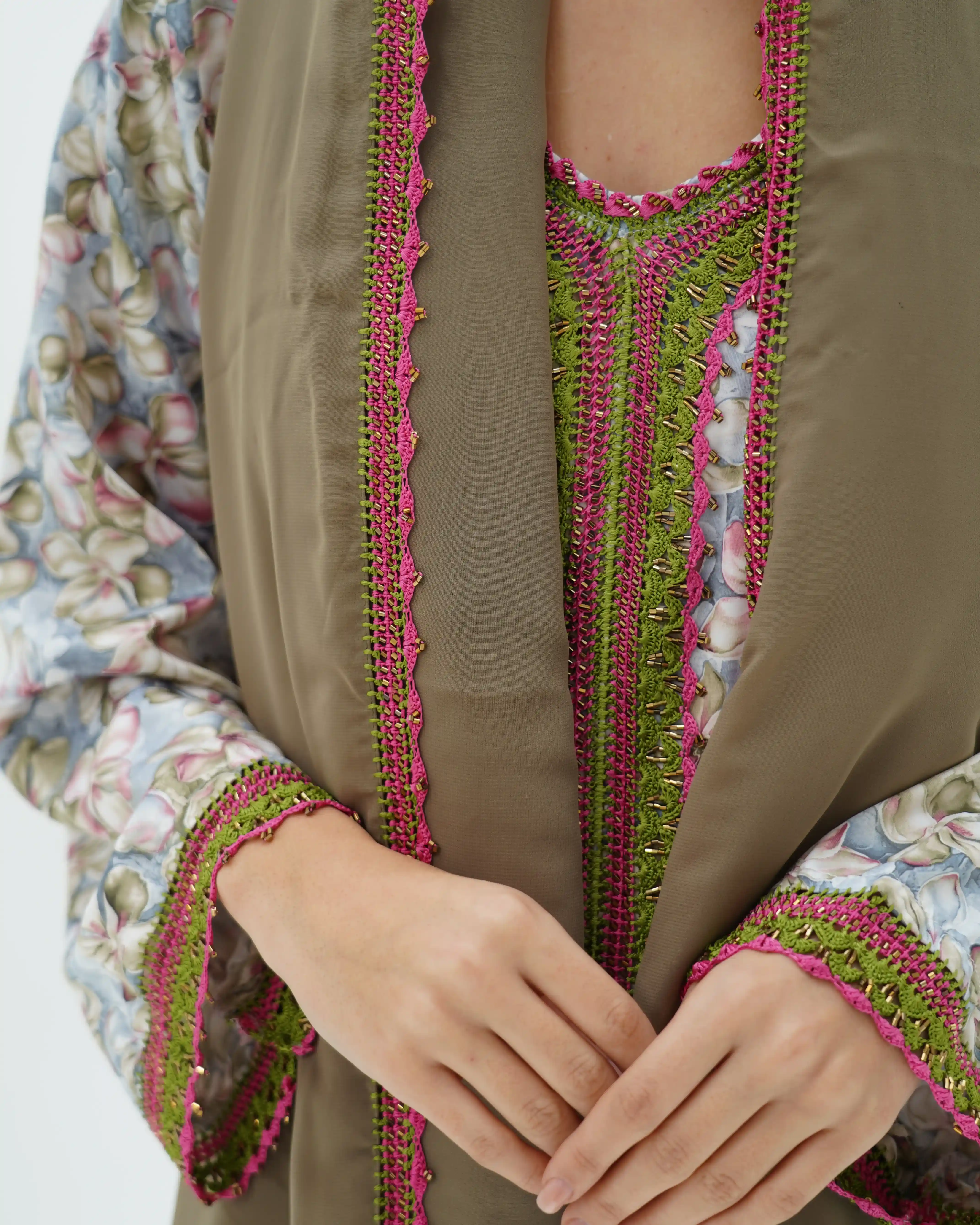 • إطار تطريزي ممتد من الياقة حتى أسفل الجلابية بخيوط أخضر زيتي وفوشيا.