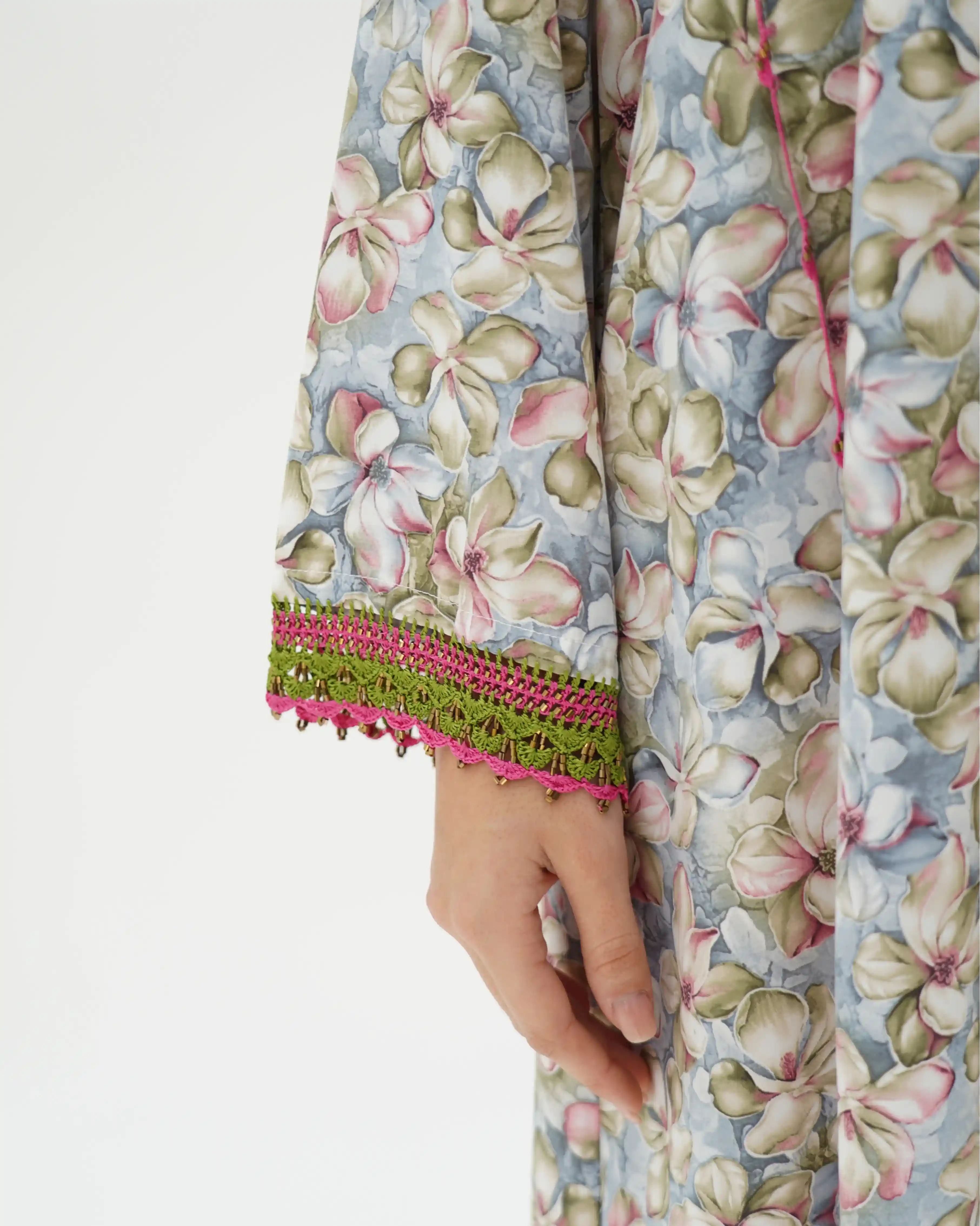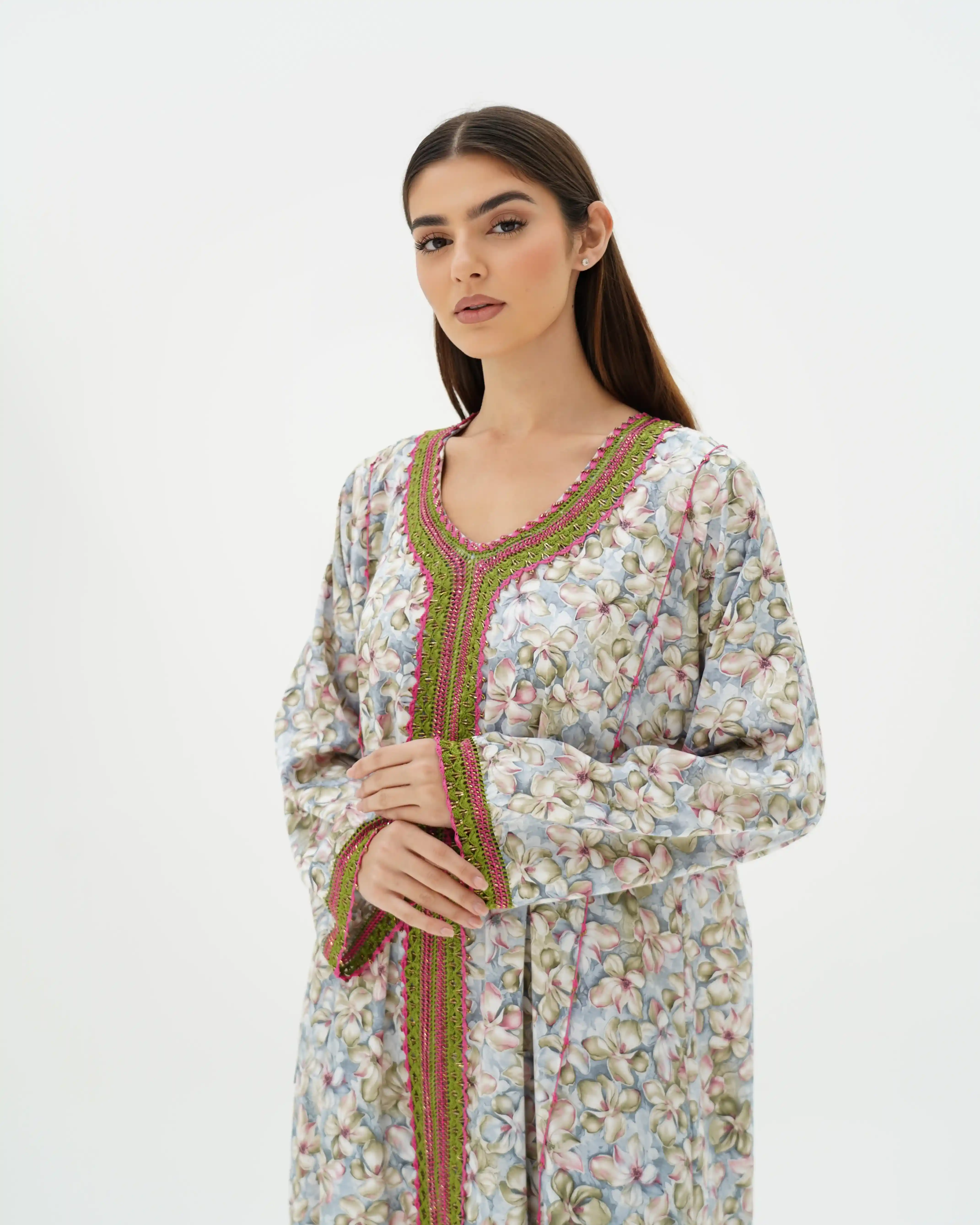 • طباعة زهرية تغطي كامل الجلابية بدرجات وردي وعاجي وأخضر على أرضية فاتحة.