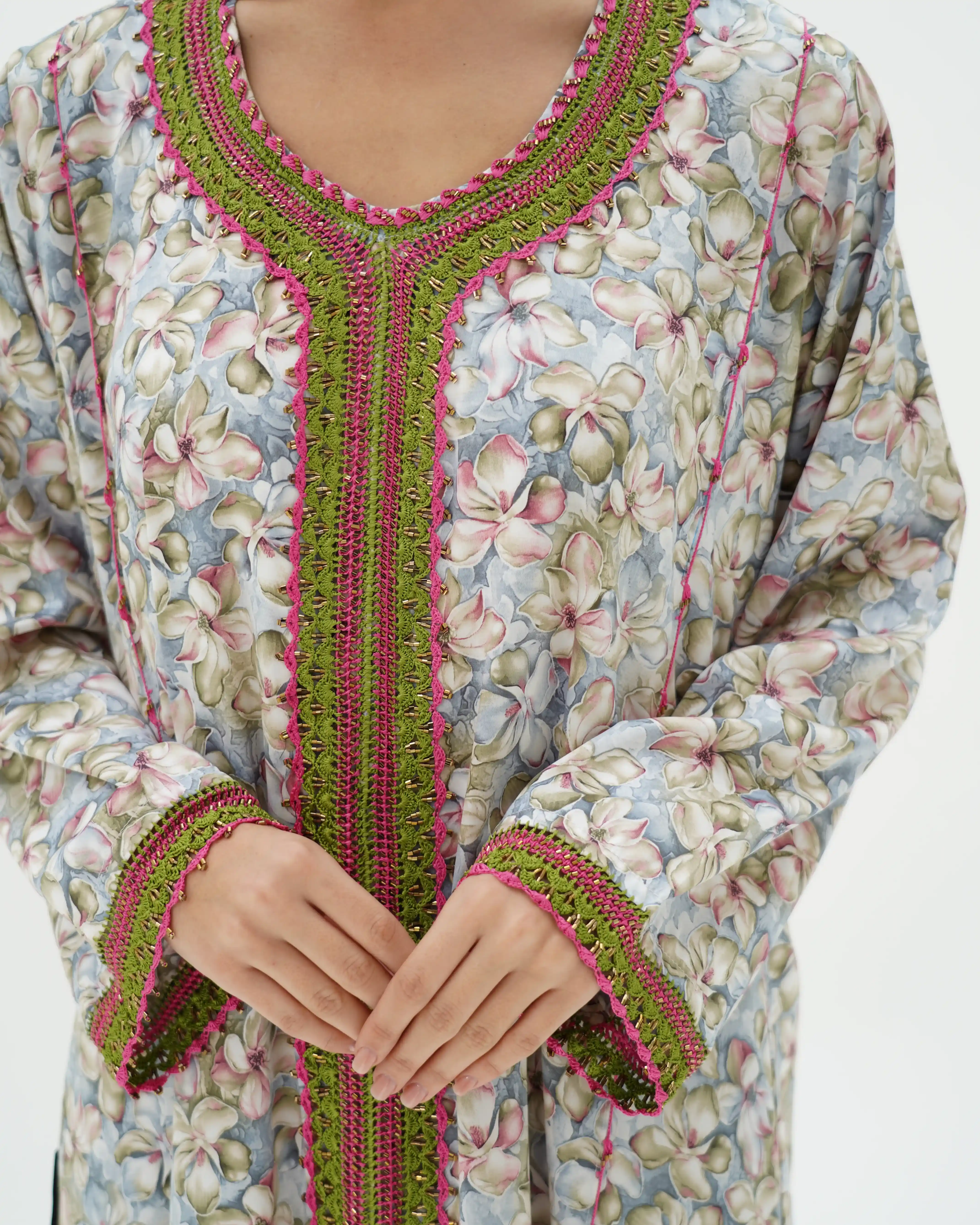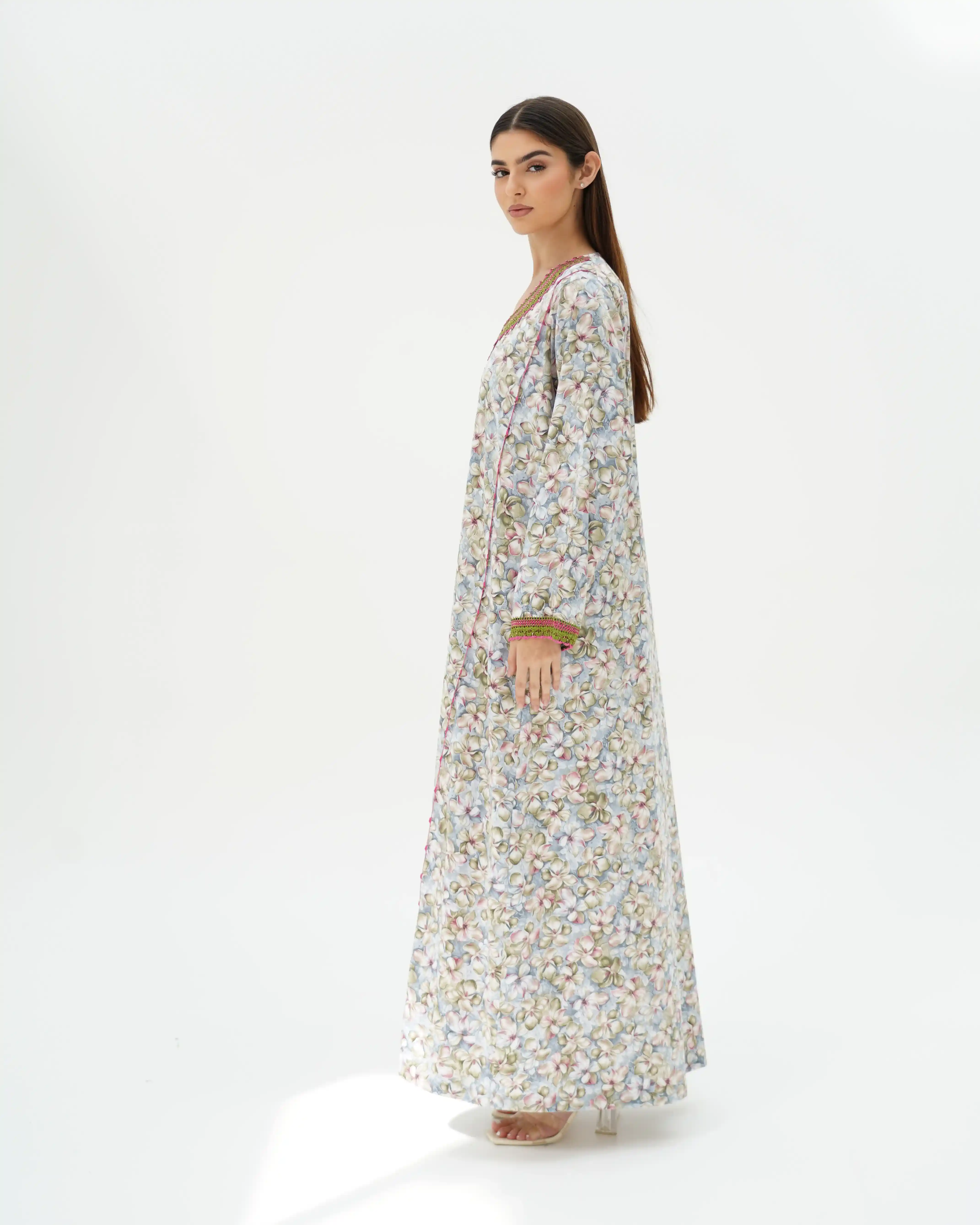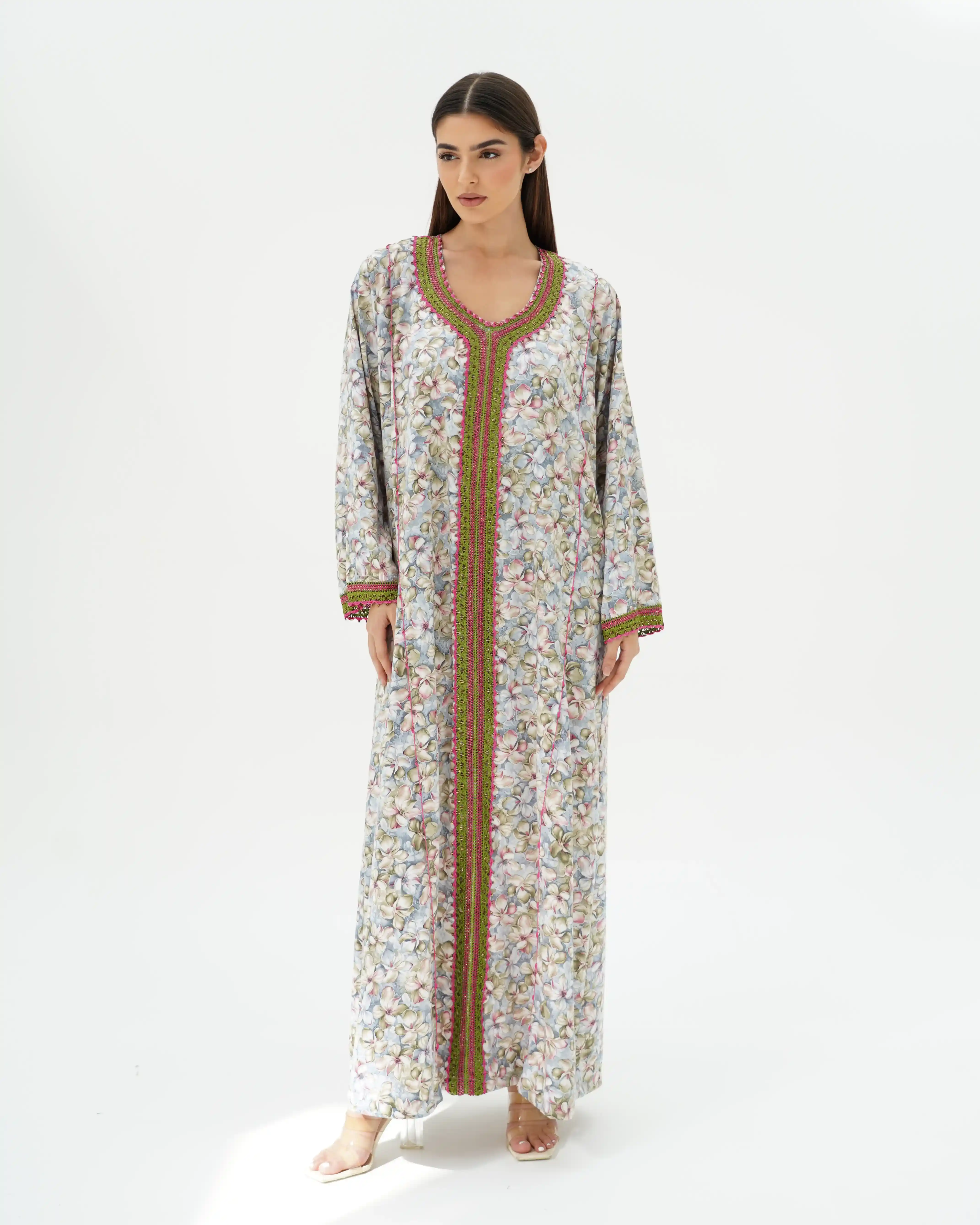 جلابية تنبض بروح شرقية عصرية، حيث يلتقي الانسياب الطبيعي مع لوحة زهرية غنية بالتفاصيل. تأتي بقصّة مستقيمة واسعة تنسدل بخفة، من قماش حرير بملمس ناعم ولمعان راقٍ يمنح الحركة سلاسة واضحة. تتزين الجلابية بطباعة زهرية تغمر كامل القطعة بدرجات هادئة. يمتد إطار تطريزي بارز من محيط الياقة نزولًا حتى أسفل التصميم، بخيوط متداخلة تتخللها خرزات دقيقة تمنح بريقًا محسوبًا دون مبالغة. الأكمام مستقيمة ومزينة بإطار تطريزي مطابق عند الأطراف، وتكتمل الإطلالة بطرحة سادة متناغمة مزخرفة بنفس التطريز على الحواف،