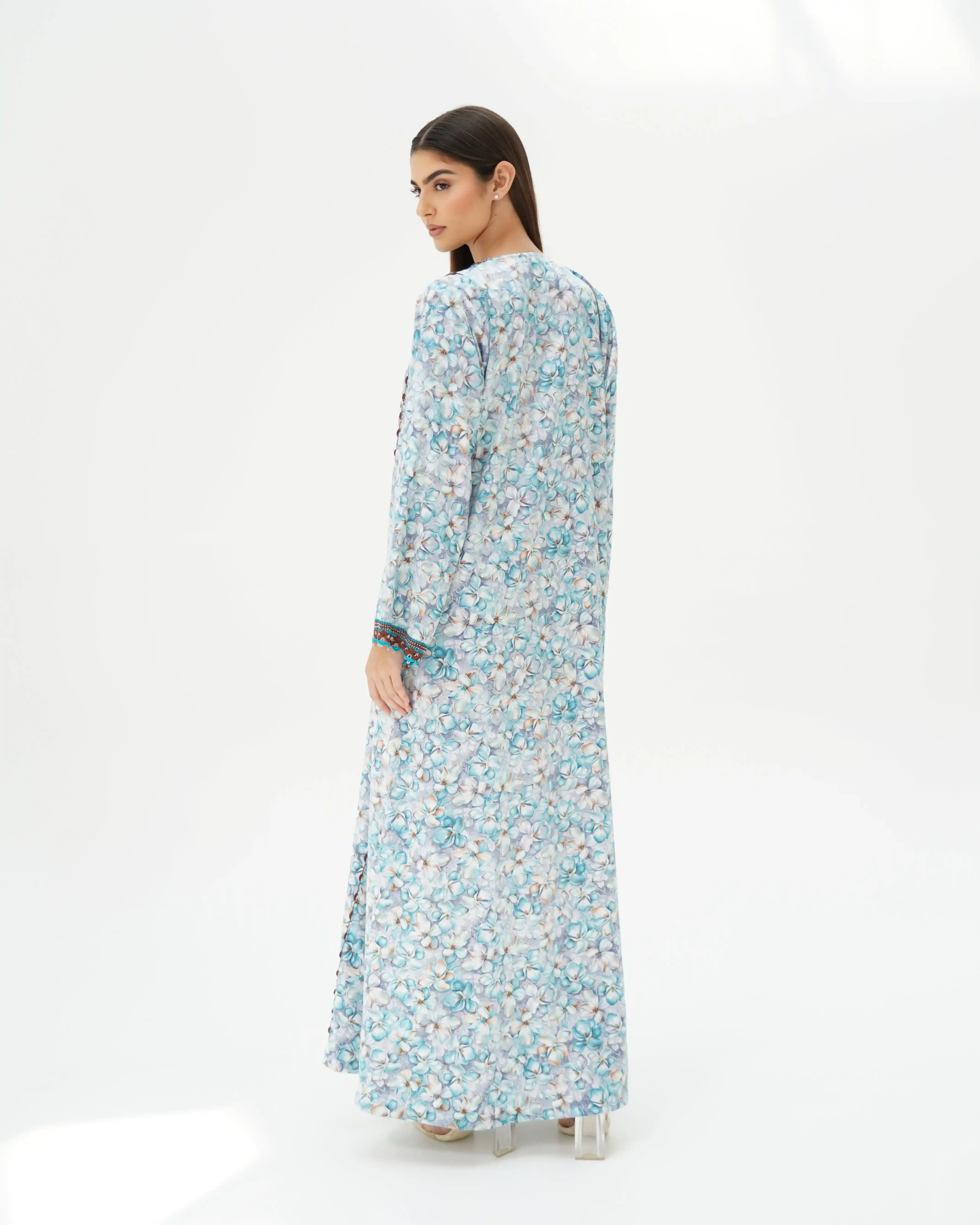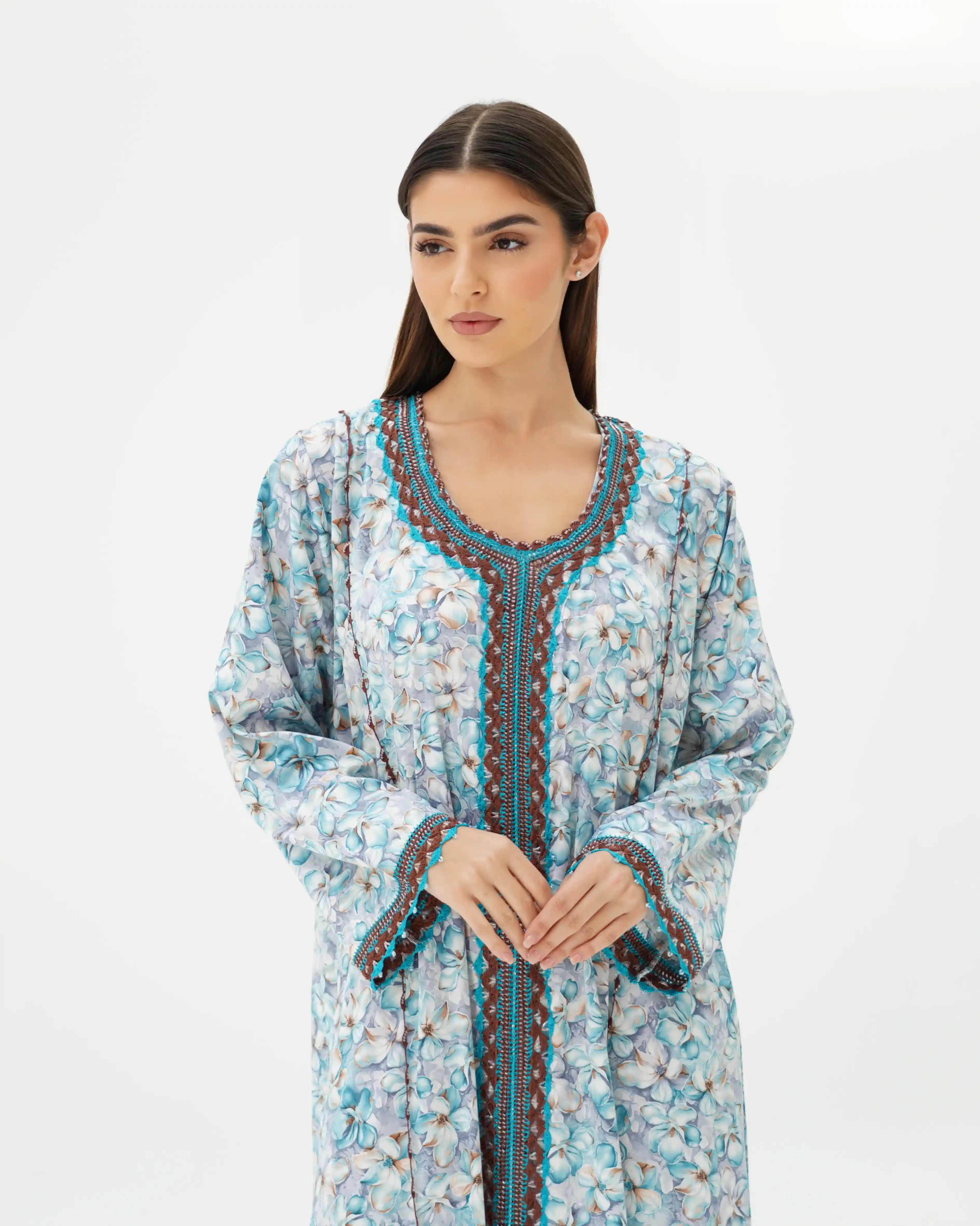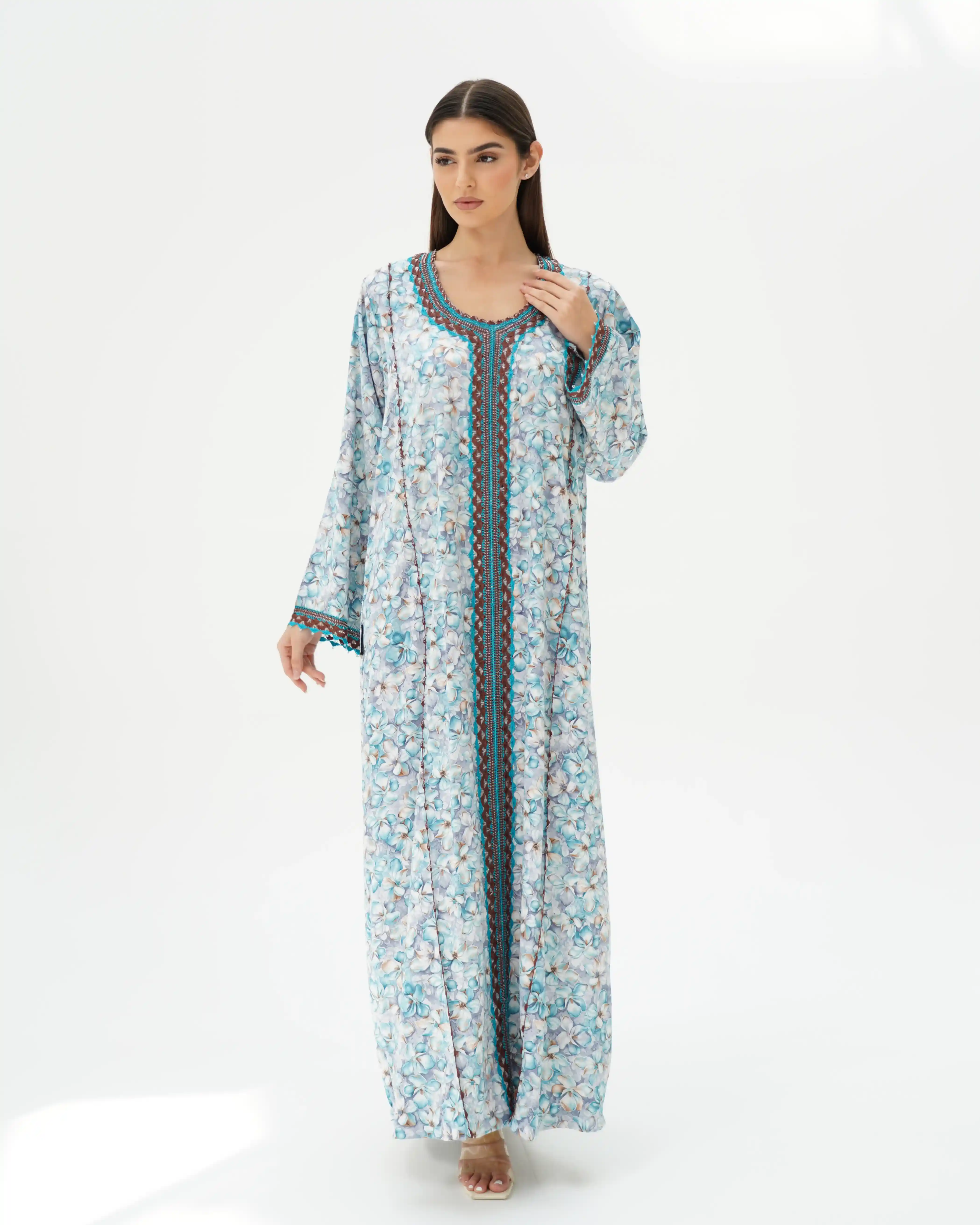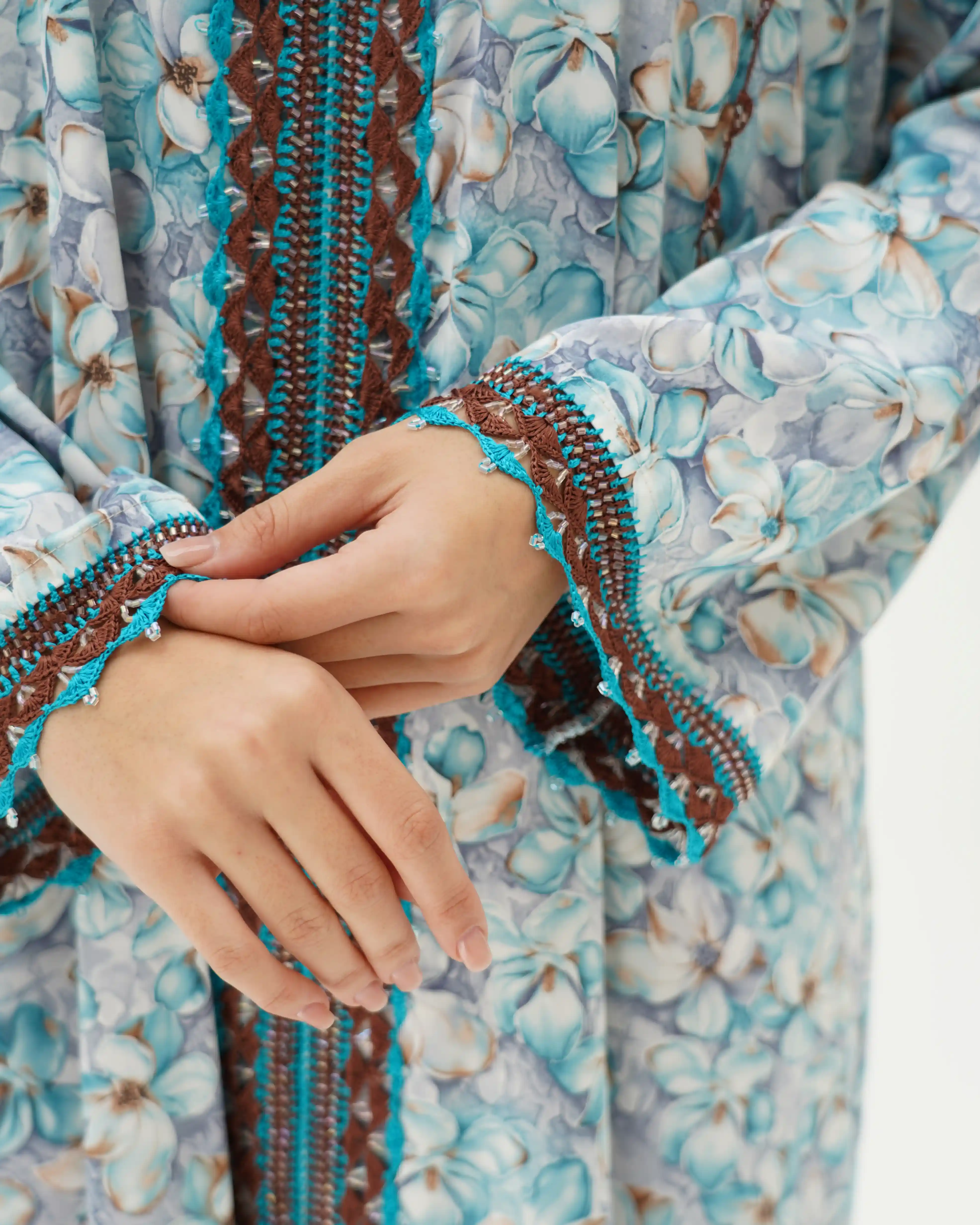 • طباعة زهرية تغطي كامل الجلابية بدرجات تركواز وأزرق سماوي على أرضية رمادي فاتح مائل للأزرق.