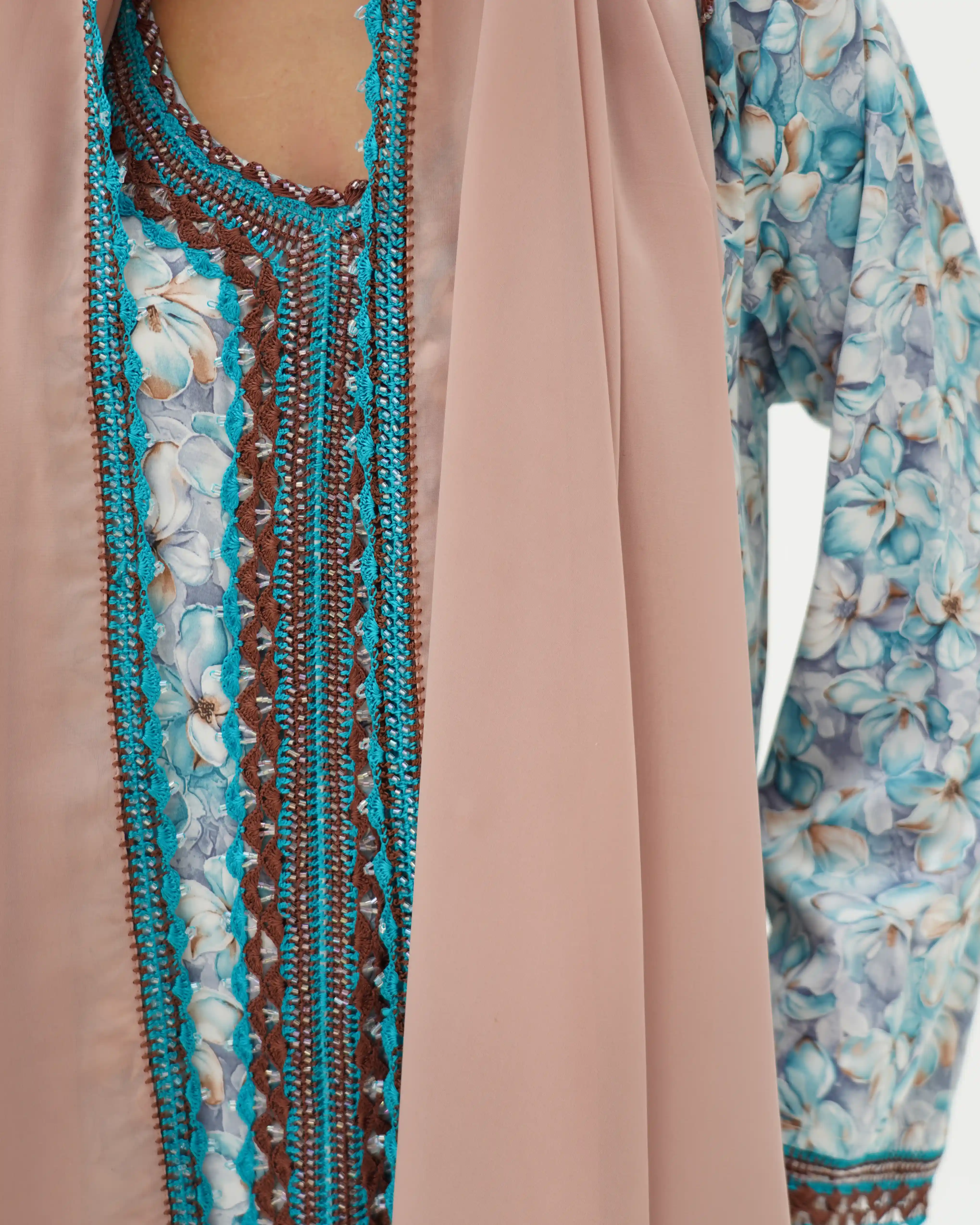 جلابية تنبض بروح شرقية عصرية، حيث يلتقي الانسياب الطبيعي مع لوحة زهرية غنية بالتفاصيل. تأتي بقصّة مستقيمة واسعة تنسدل بخفة، من قماش حرير بملمس ناعم ولمعان راقٍ يمنح الحركة سلاسة واضحة. تتزين الجلابية بطباعة زهرية تغمر كامل القطعة بدرجات هادئة. يمتد إطار تطريزي بارز من محيط الياقة نزولًا حتى أسفل التصميم، بخيوط متداخلة تتخللها خرزات دقيقة تمنح بريقًا محسوبًا دون مبالغة. الأكمام مستقيمة ومزينة بإطار تطريزي مطابق عند الأطراف، وتكتمل الإطلالة بطرحة سادة متناغمة مزخرفة بنفس التطريز على الحواف،