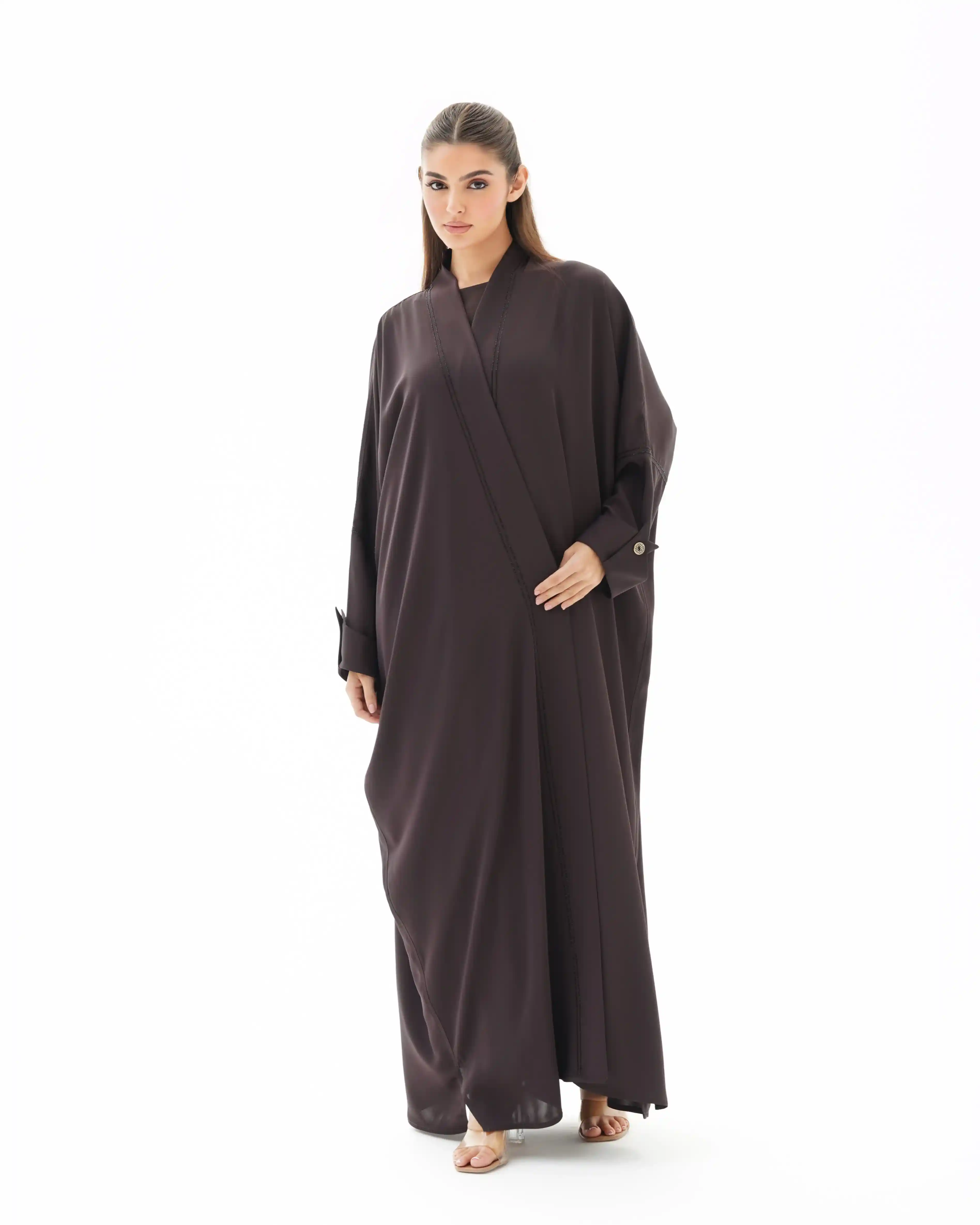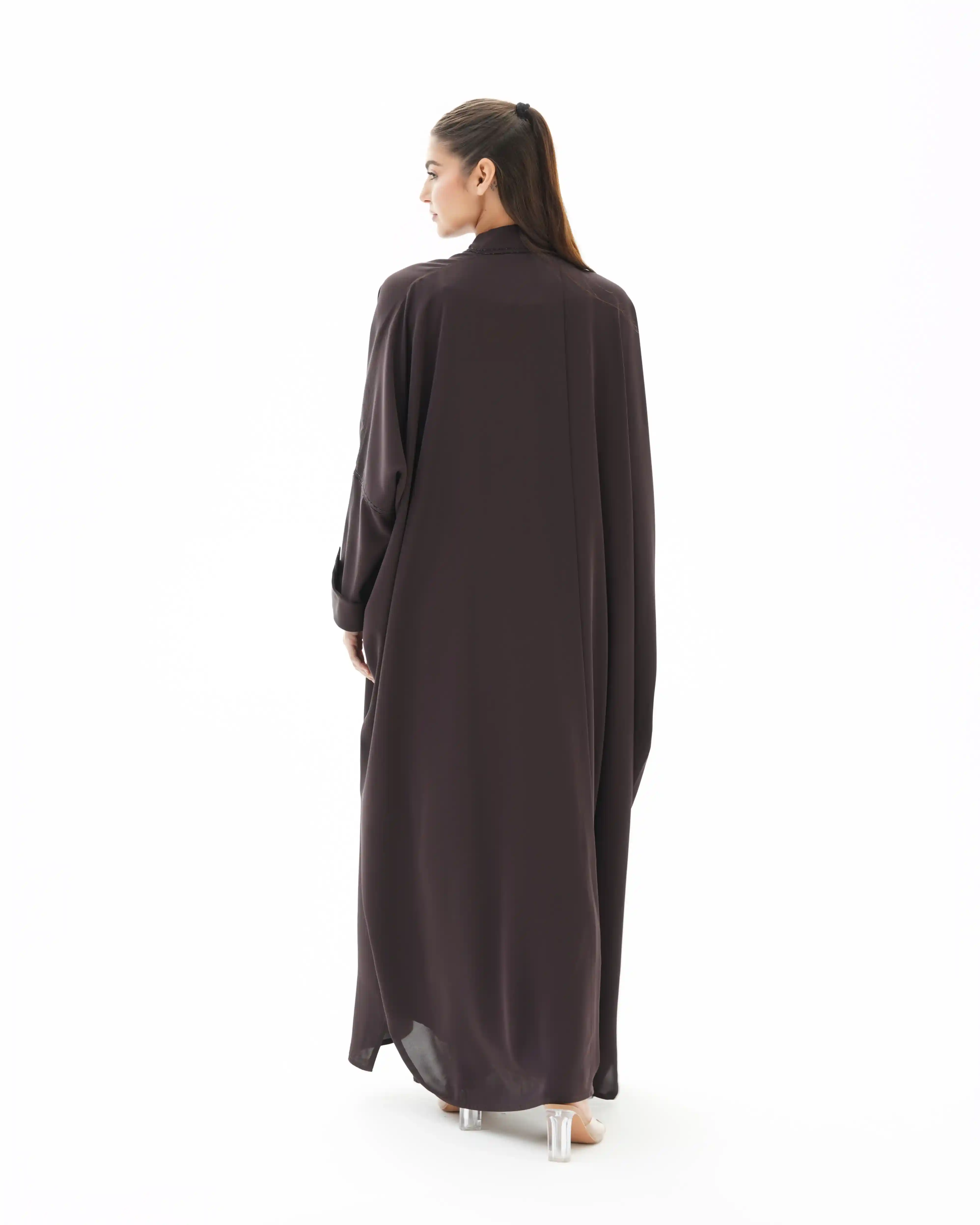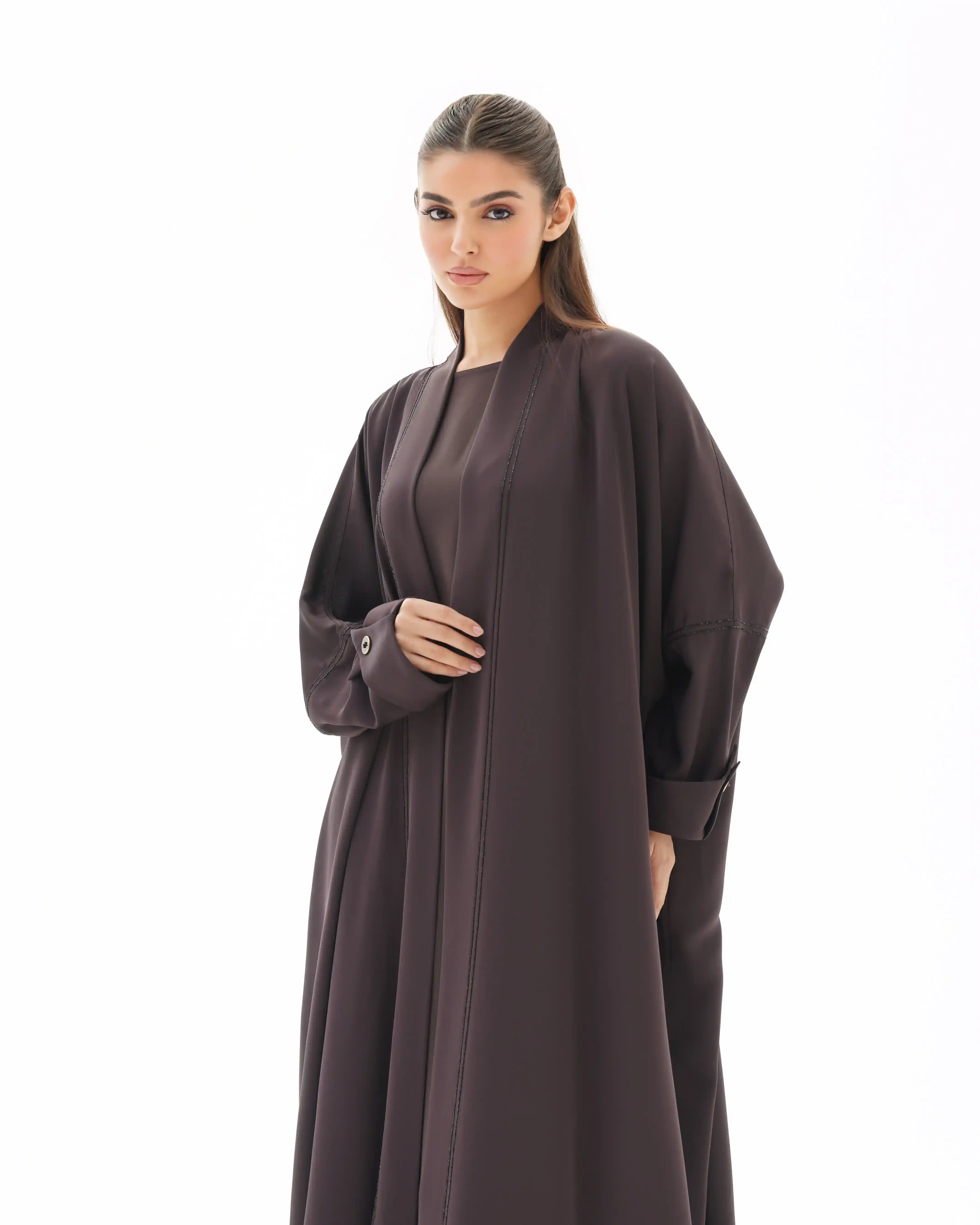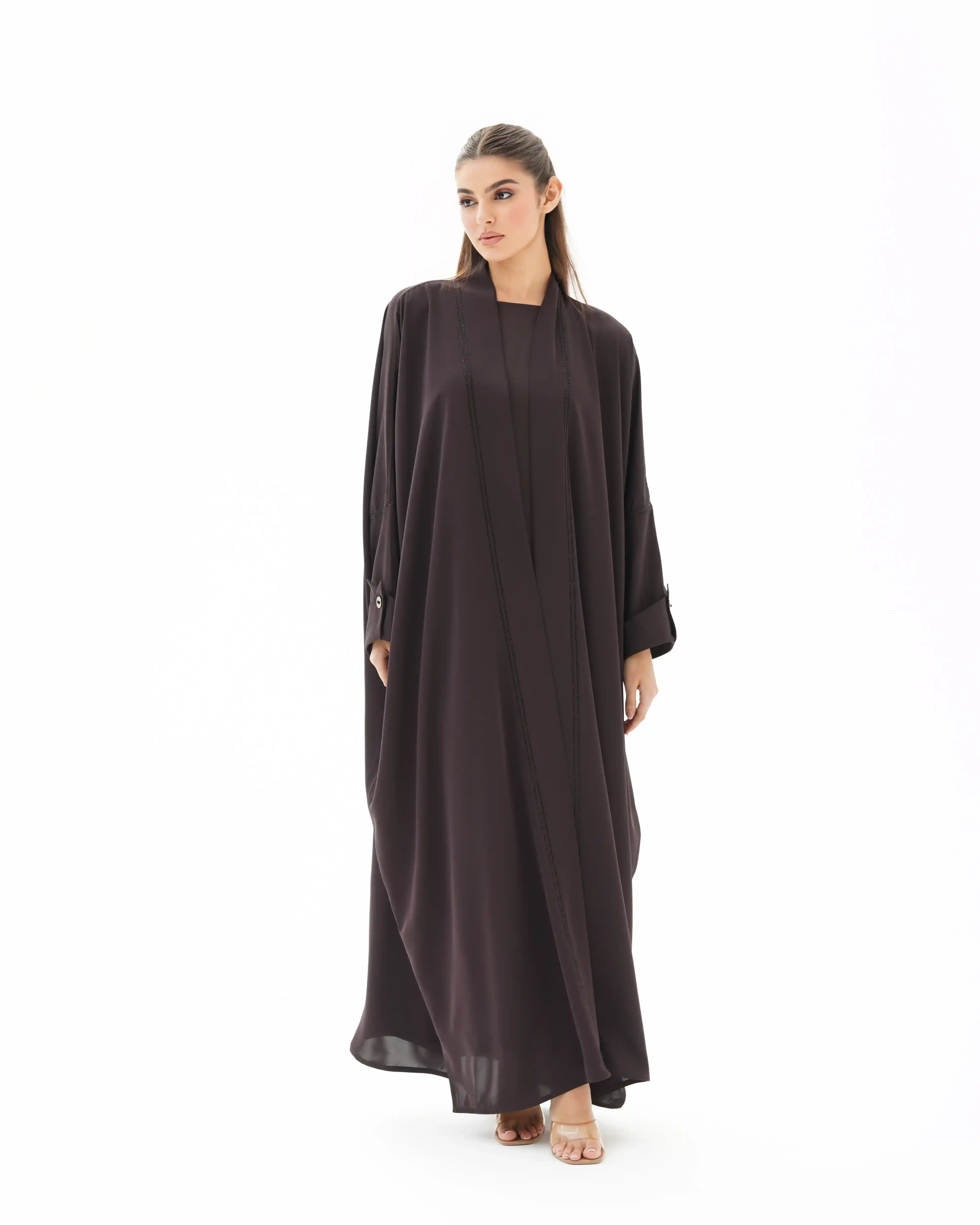 تضيف التفاصيل الأنيقة لمسة عصرية جذابة إلى هذه العباية المصنوعة من قماش الكريب الخفيف والمنسدل مما يمنحها إطلالة مفضلة كلاسيكية ،اكتملت بخطوط دقيقة وناعمة من الخرز الاسود اللامع تبدأ من خلف شريط الرقبة إلى اسفل ذيل العباية وتزدان الأكمام بقلبة قماش وقصة مستوحاة من كلاسيكيات الازياء الفرنسية وبإزرار بعلامة .KHAN&CO الايقونية مثبته بحبات من الخرز الاسود.